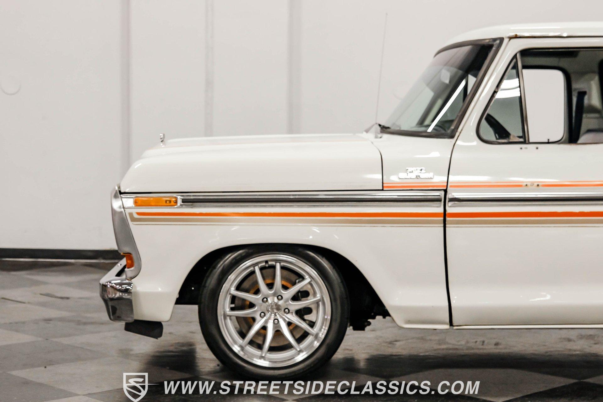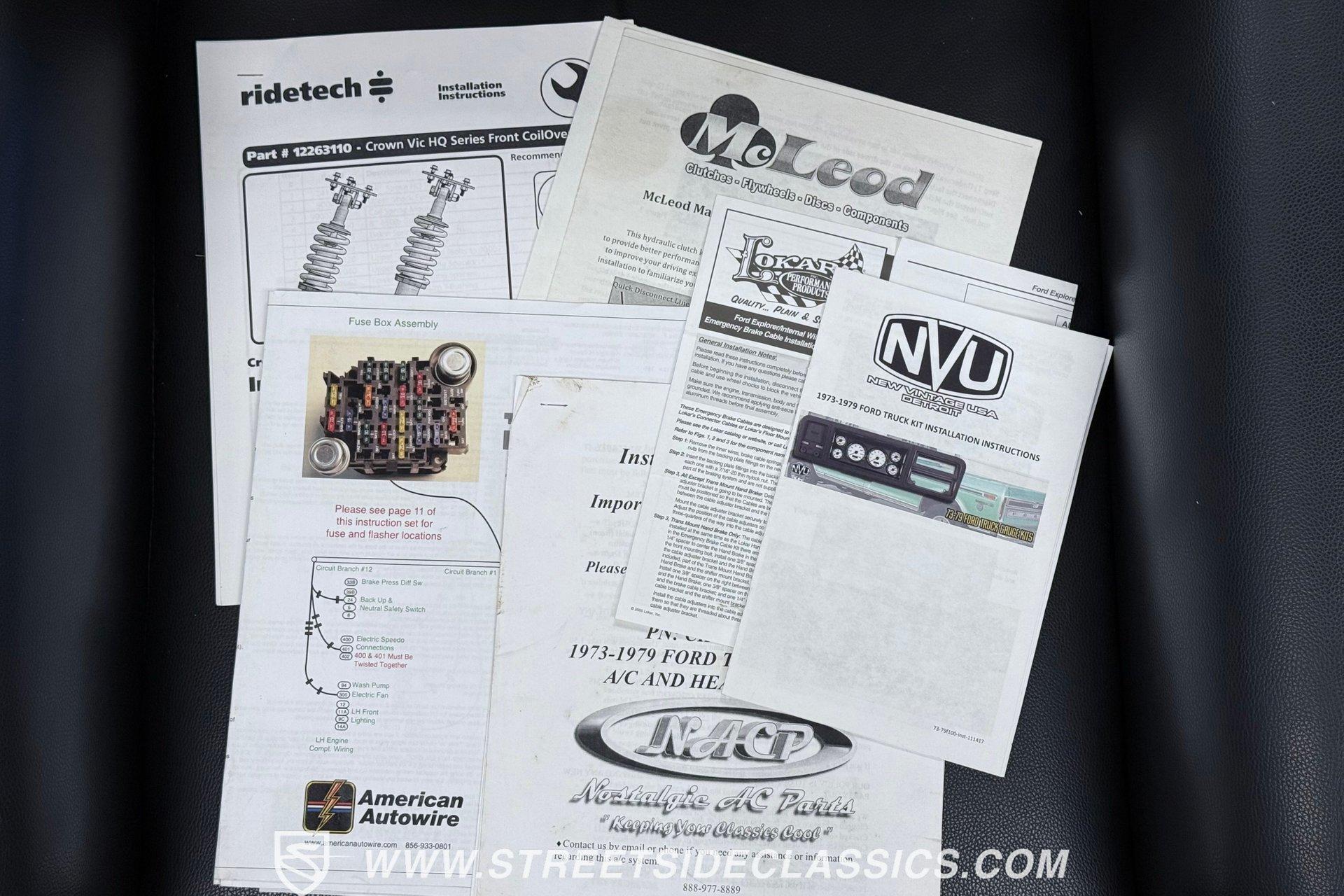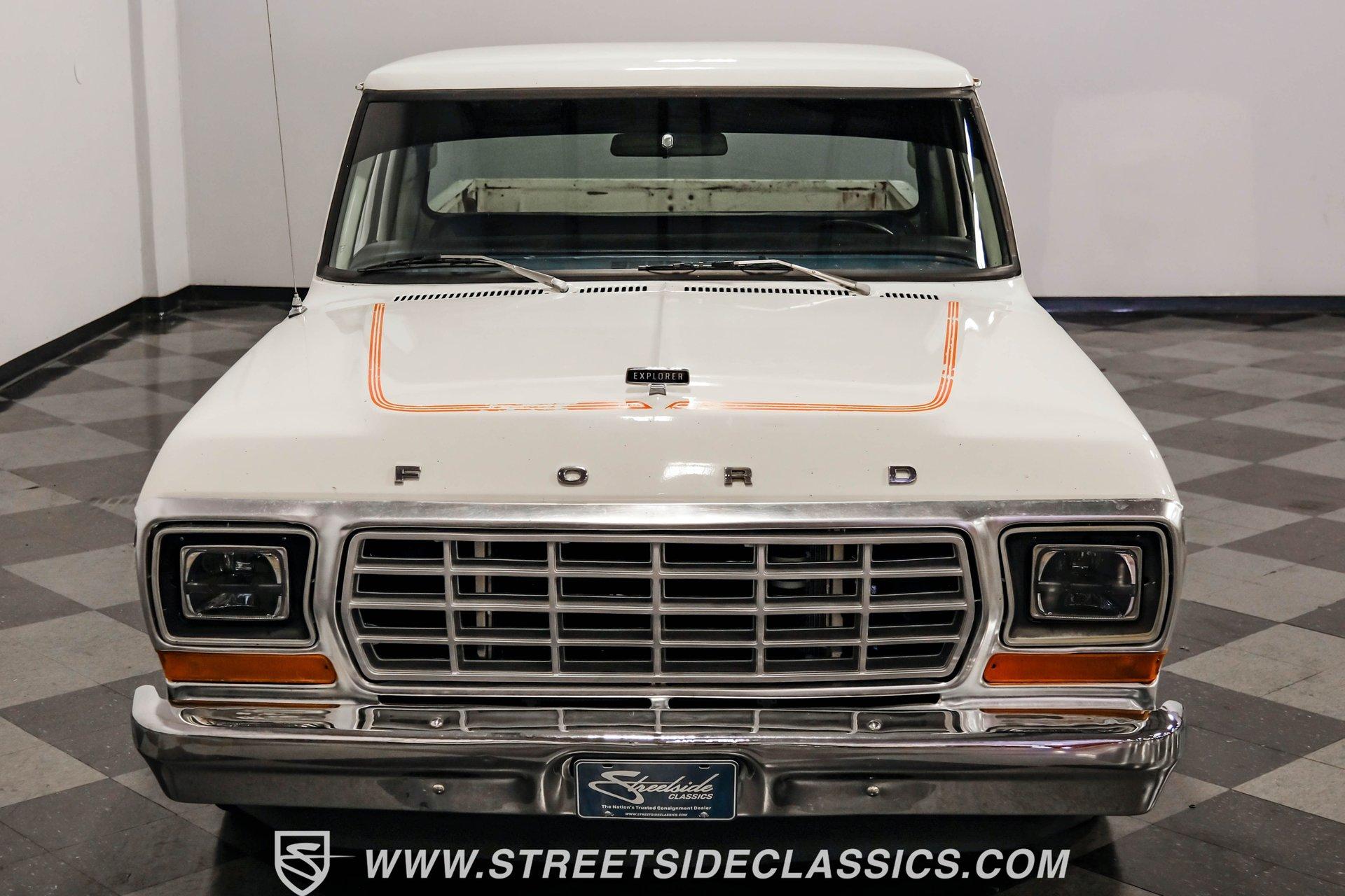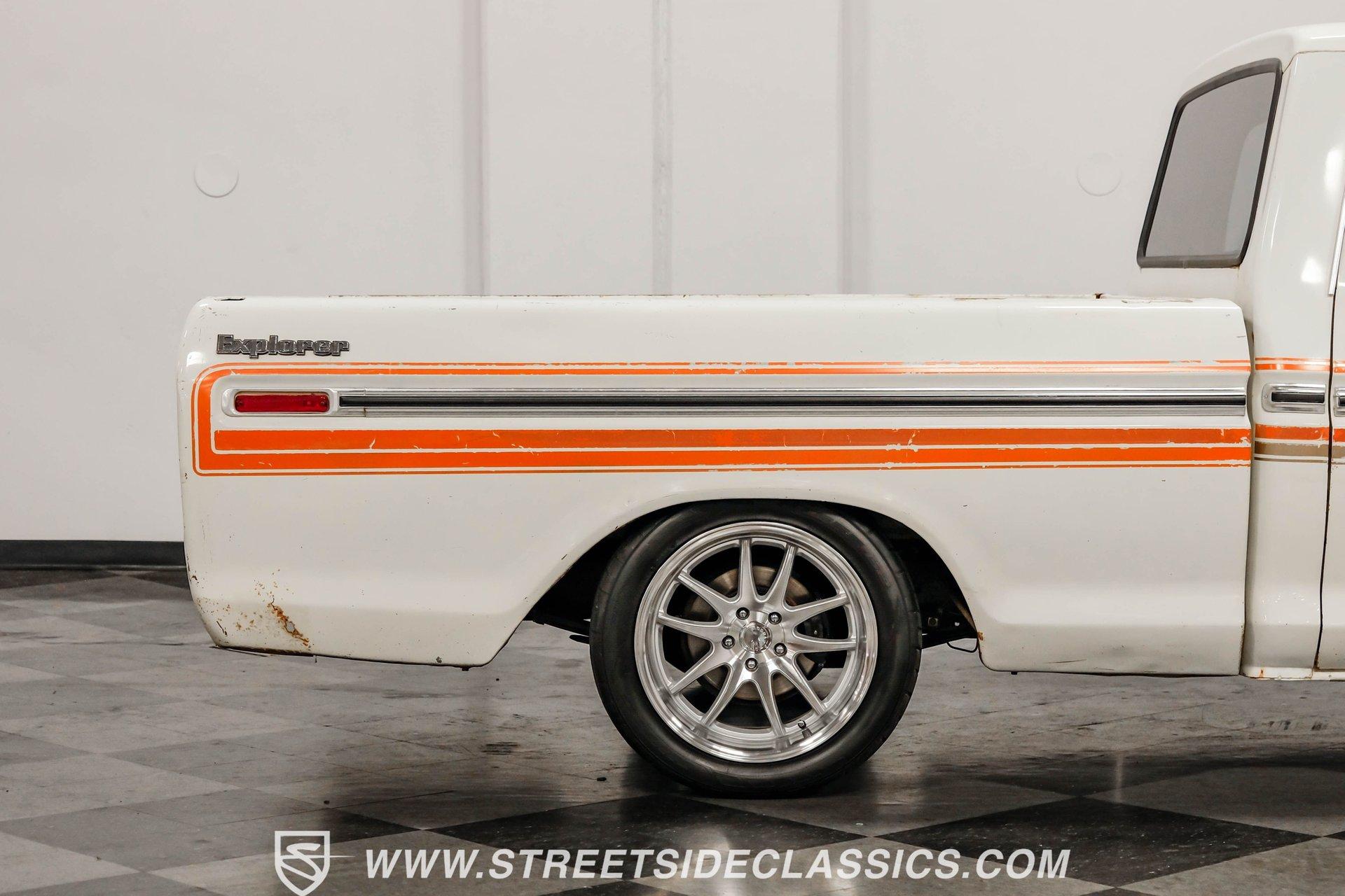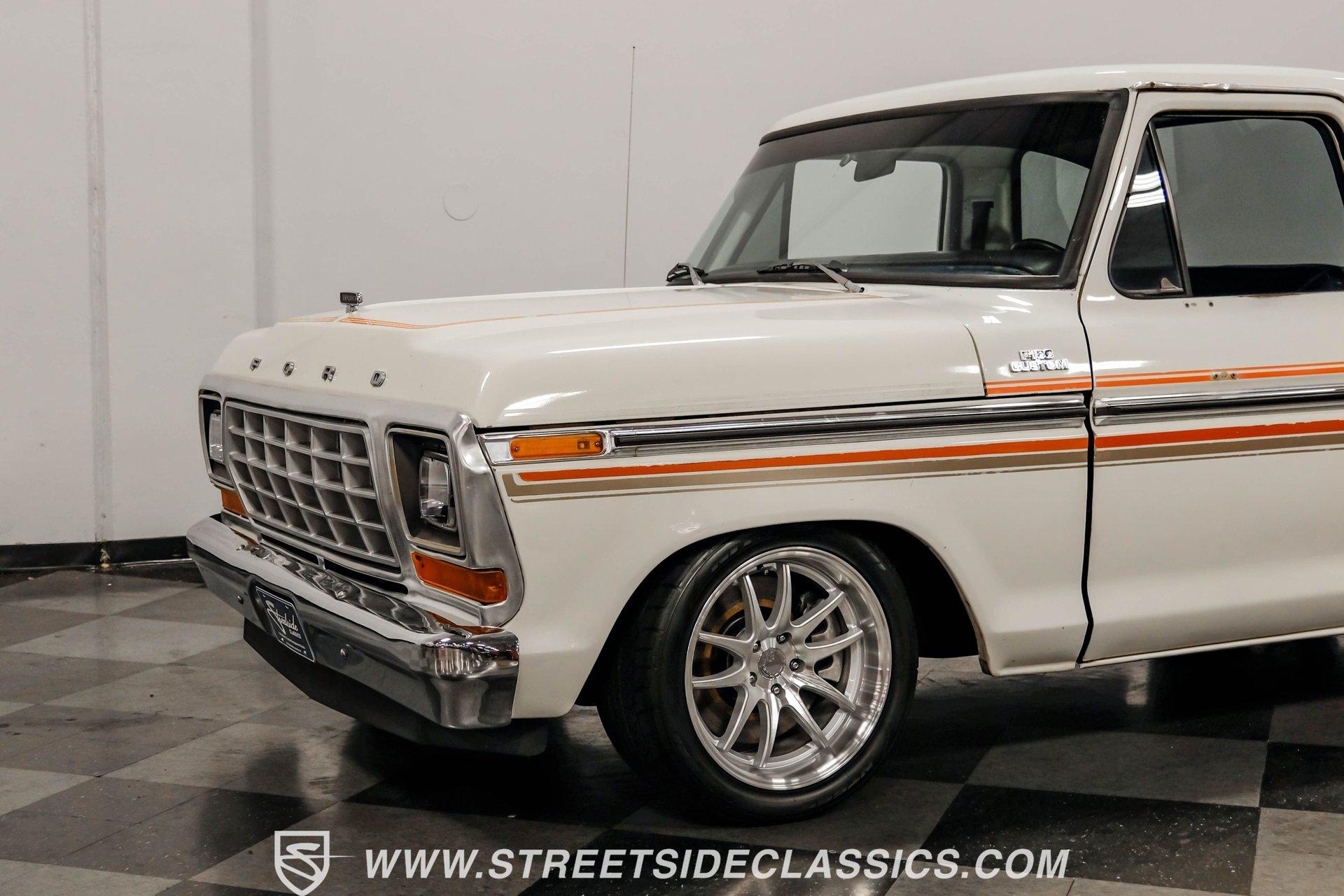 Street-tough and road-ready, this 1979 Ford F-100 Ranger Explorer Restomod is still covered in its original white exterior slashed with orange decal stripes that amp up its attitude. Dropped on a Final-Gen Crown Vic-style front end, this pickup sits low and mean on the pavement. Muscular 18" Aodhan wheels fill the wheel wells, wrapped in fat 275/40ZR18 Nitto rubber up front and even meatier 295/40ZR18 Nittos out back. The short bed layout keeps proportions tight while the patina finish tells stories of miles traveled. Slide across the blue vinyl and plaid bench seat and grip the aftermarket sport wheel mounted on a tilt column. The blue-on-black color scheme throughout the cabin creates a performance vibe with painted blue dash, door panels, and headliner contrasting against fresh black carpets. Custom black-faced gauges light up with blue illumination, giving off a street-machine glow after dark. The aftermarket A/C blows cold while the Hurst shifter stands ready for action between the gears. The fuel-injected 5.0L V8 is mated to a 5-speed manual transmission. The Trick Flow intake manifold gulps air while long tube headers dump exhaust through an H-pipe and MagnaFlow mufflers for a proper muscle truck soundtrack. An aluminum radiator with electric fans keeps things cool under pressure. The suspension setup includes a Crown Vic front end with coilovers and sway bar and rear solid axle with leaf springs and air shocks which plants this truck firmly on the asphalt during aggressive driving. 5.0L V8 Engine With Electronic Fuel Injection 5-Speed Manual Transmission With Hurst Shifter Trick Flow Intake Manifold Long Tube Headers MSD Box Aluminum Radiator With Electric Fans Dual Exhaust With H-Pipe And MagnaFlow Mufflers CPP Hydroboost Power Disc Brakes Crown Vic Front End w/ Coilovers With Sway Bar Solid Axle Rear w/ Leaf Springs and Air Shocks Strange Engineering Rear Shocks American Auto Wire Harness Original White Paint Exterior With Orange Decal Stripes Natural Patina Finish 18" Aodhan Wheels 275/40ZR18 Front, 295/40ZR18 Rear Nitto Tires Short Bed Configuration Blue And Plaid Bench Seat With Armrest Console Aftermarket Sport Steering Wheel On Tilt Column Aftermarket Black Face Gauges With Blue Illumination Blue Painted Dash, Door Panels, And Headliner Fresh Black Carpets Aftermarket Air Conditioning Muscle truck style with hot rod attitude, this 1979 Ford F-100 Ranger Explorer Restomod brings power and performance in equal measure. Call today!