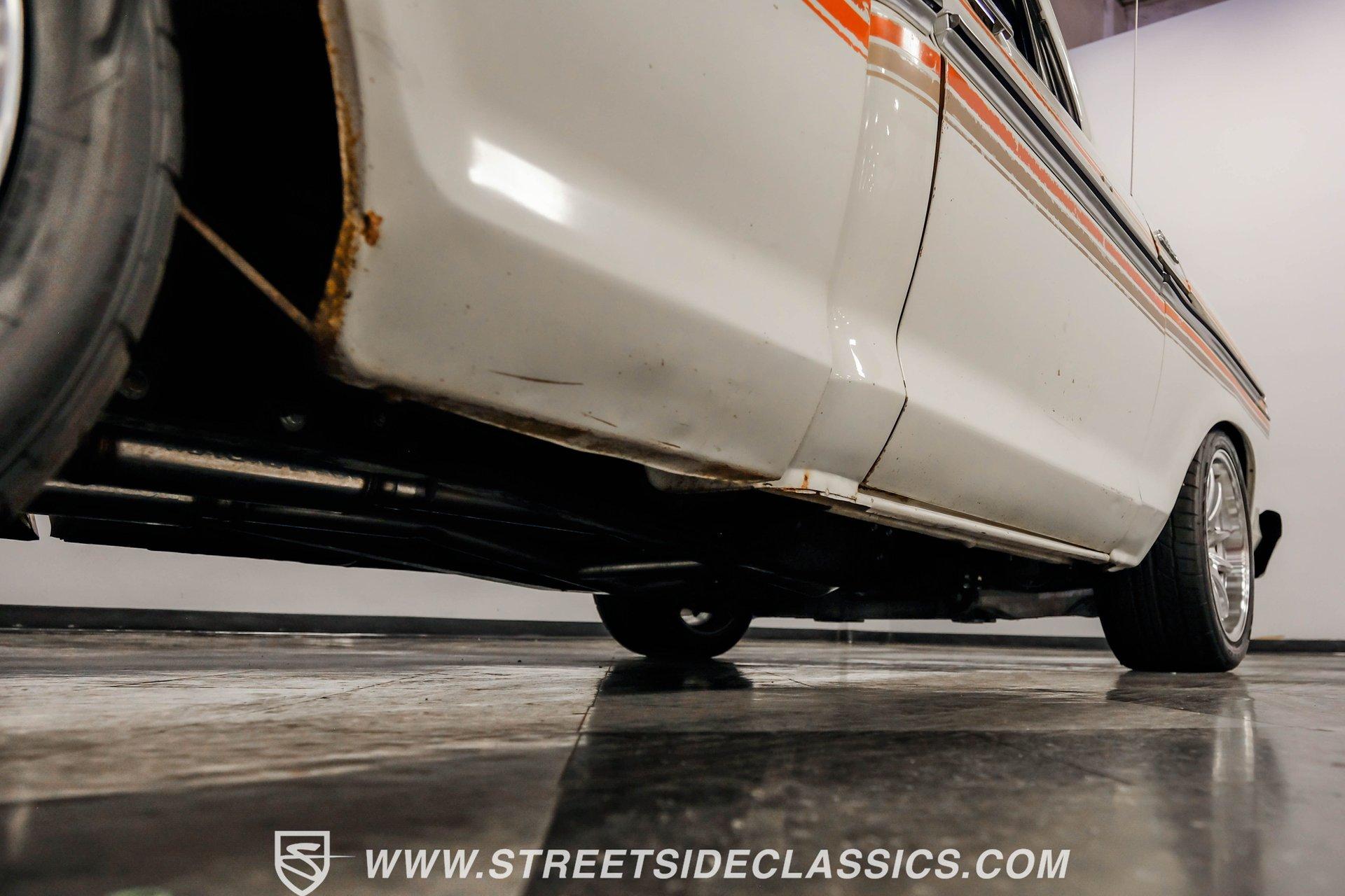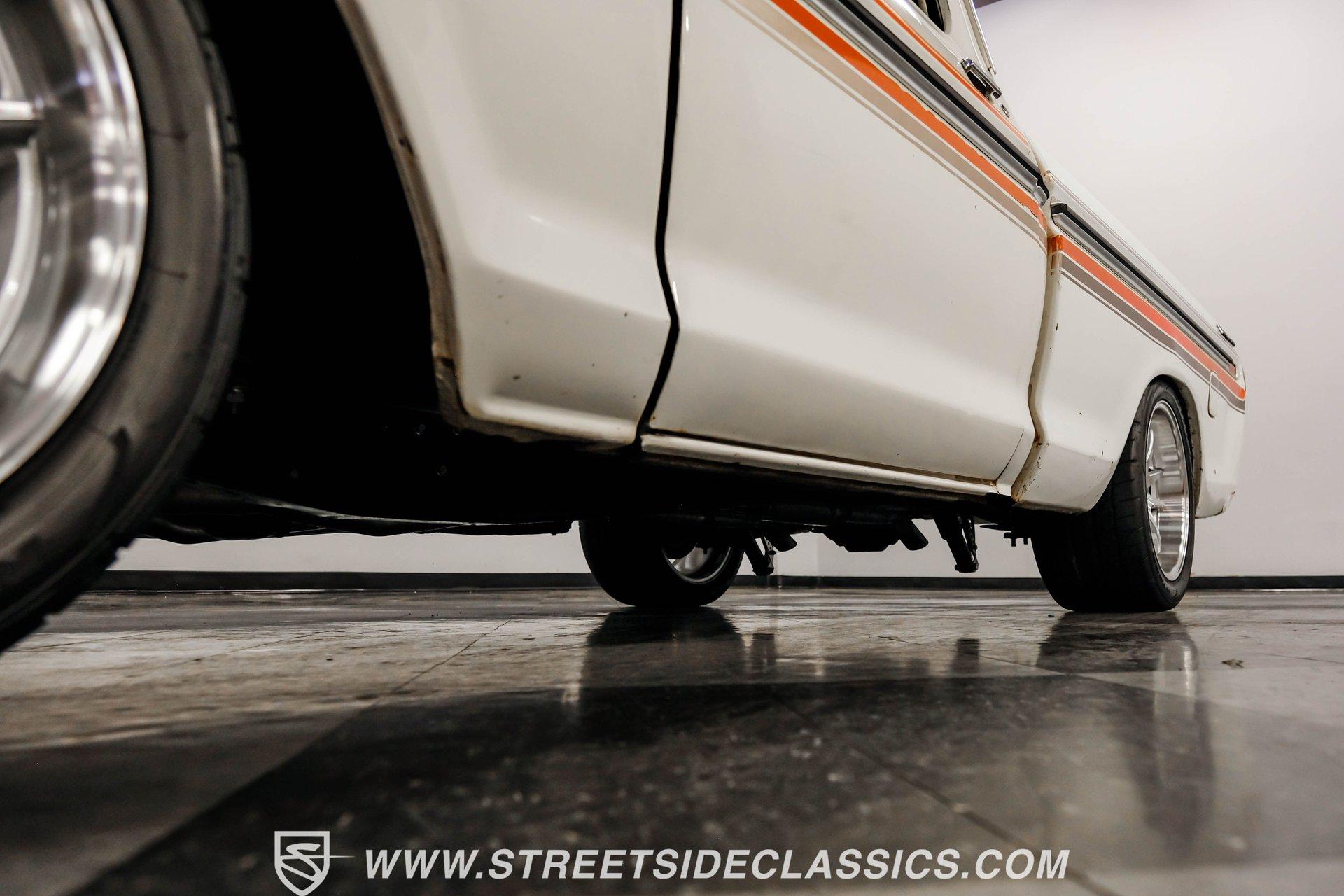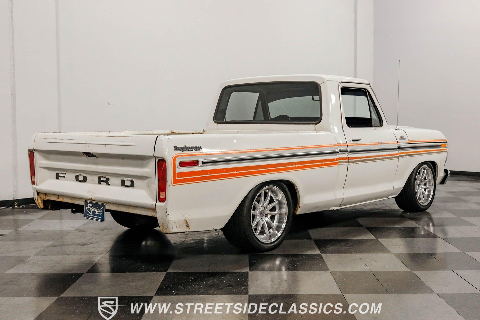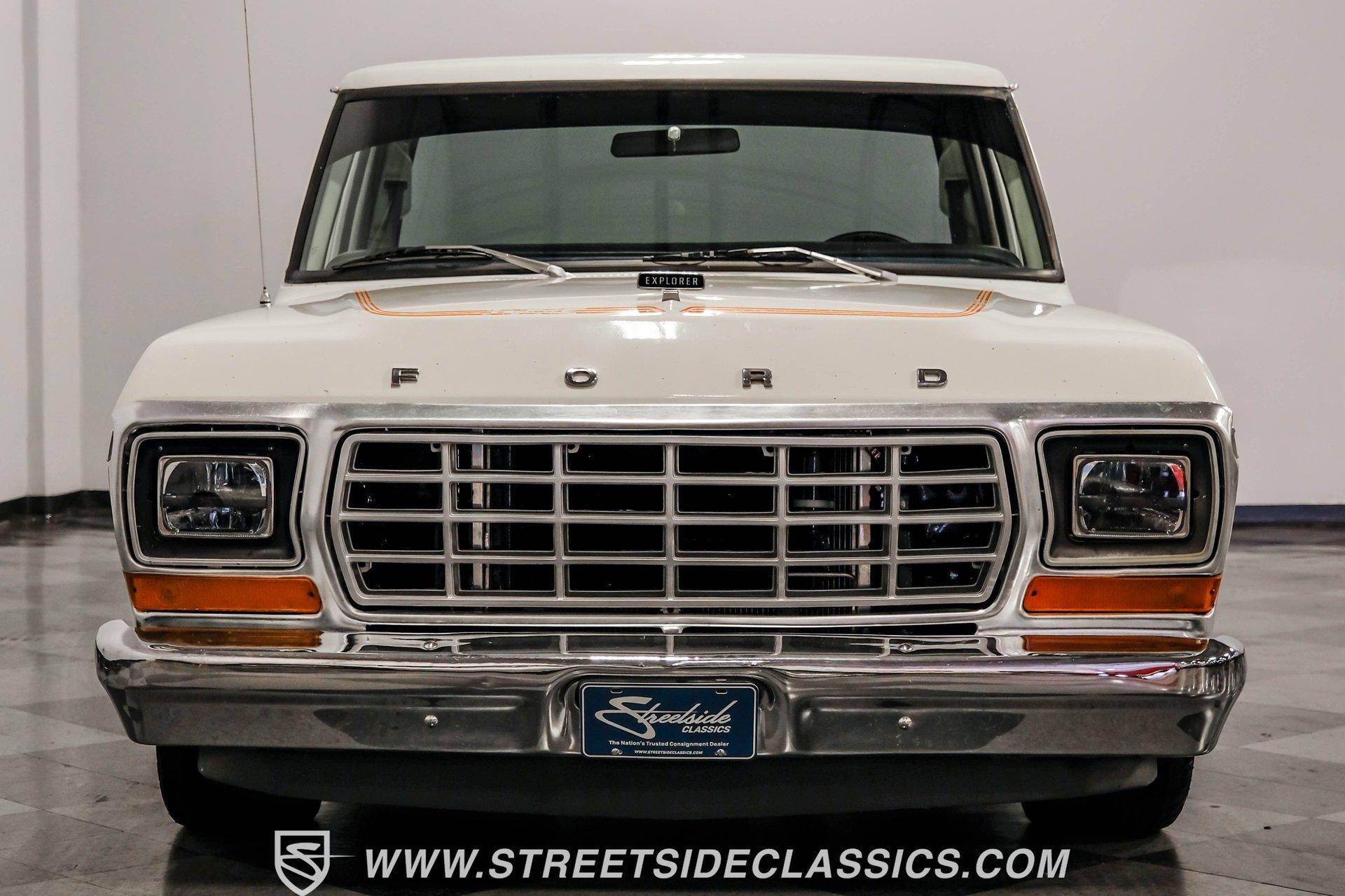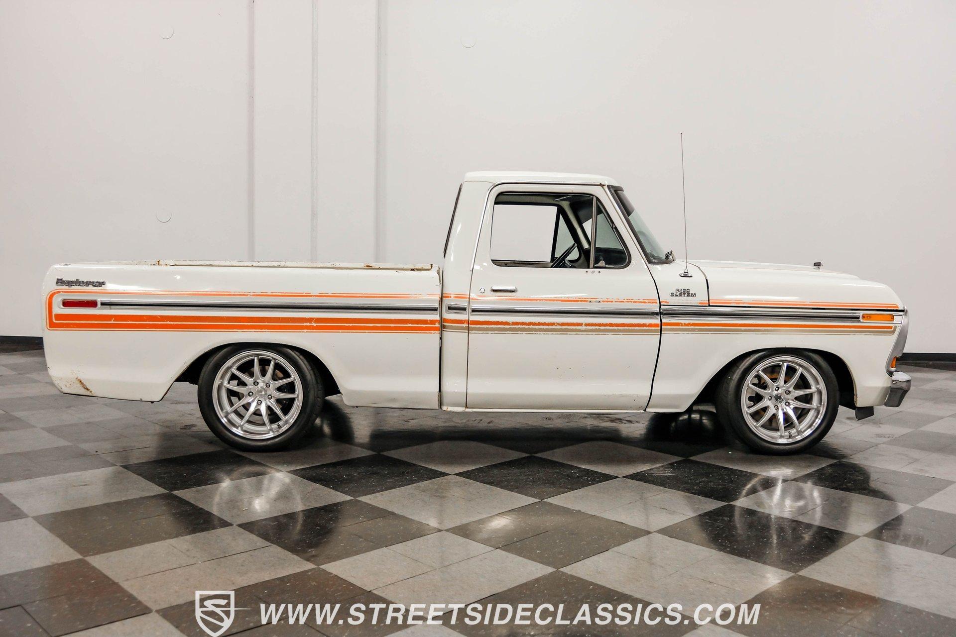 Street-tough and road-ready, this 1979 Ford F-100 Ranger Explorer Restomod is still covered in its original white exterior slashed with orange decal stripes that amp up its attitude. Dropped on a Final-Gen Crown Vic-style front end, this pickup sits low and mean on the pavement. Muscular 18" Aodhan wheels fill the wheel wells, wrapped in fat 275/40ZR18 Nitto rubber up front and even meatier 295/40ZR18 Nittos out back. The short bed layout keeps proportions tight while the patina finish tells stories of miles traveled. Slide across the blue vinyl and plaid bench seat and grip the aftermarket sport wheel mounted on a tilt column. The blue-on-black color scheme throughout the cabin creates a performance vibe with painted blue dash, door panels, and headliner contrasting against fresh black carpets. Custom black-faced gauges light up with blue illumination, giving off a street-machine glow after dark. The aftermarket A/C blows cold while the Hurst shifter stands ready for action between the gears. The fuel-injected 5.0L V8 is mated to a 5-speed manual transmission. The Trick Flow intake manifold gulps air while long tube headers dump exhaust through an H-pipe and MagnaFlow mufflers for a proper muscle truck soundtrack. An aluminum radiator with electric fans keeps things cool under pressure. The suspension setup includes a Crown Vic front end with coilovers and sway bar and rear solid axle with leaf springs and air shocks which plants this truck firmly on the asphalt during aggressive driving. 5.0L V8 Engine With Electronic Fuel Injection 5-Speed Manual Transmission With Hurst Shifter Trick Flow Intake Manifold Long Tube Headers MSD Box Aluminum Radiator With Electric Fans Dual Exhaust With H-Pipe And MagnaFlow Mufflers CPP Hydroboost Power Disc Brakes Crown Vic Front End w/ Coilovers With Sway Bar Solid Axle Rear w/ Leaf Springs and Air Shocks Strange Engineering Rear Shocks American Auto Wire Harness Original White Paint Exterior With Orange Decal Stripes Natural Patina Finish 18" Aodhan Wheels 275/40ZR18 Front, 295/40ZR18 Rear Nitto Tires Short Bed Configuration Blue And Plaid Bench Seat With Armrest Console Aftermarket Sport Steering Wheel On Tilt Column Aftermarket Black Face Gauges With Blue Illumination Blue Painted Dash, Door Panels, And Headliner Fresh Black Carpets Aftermarket Air Conditioning Muscle truck style with hot rod attitude, this 1979 Ford F-100 Ranger Explorer Restomod brings power and performance in equal measure. Call today!