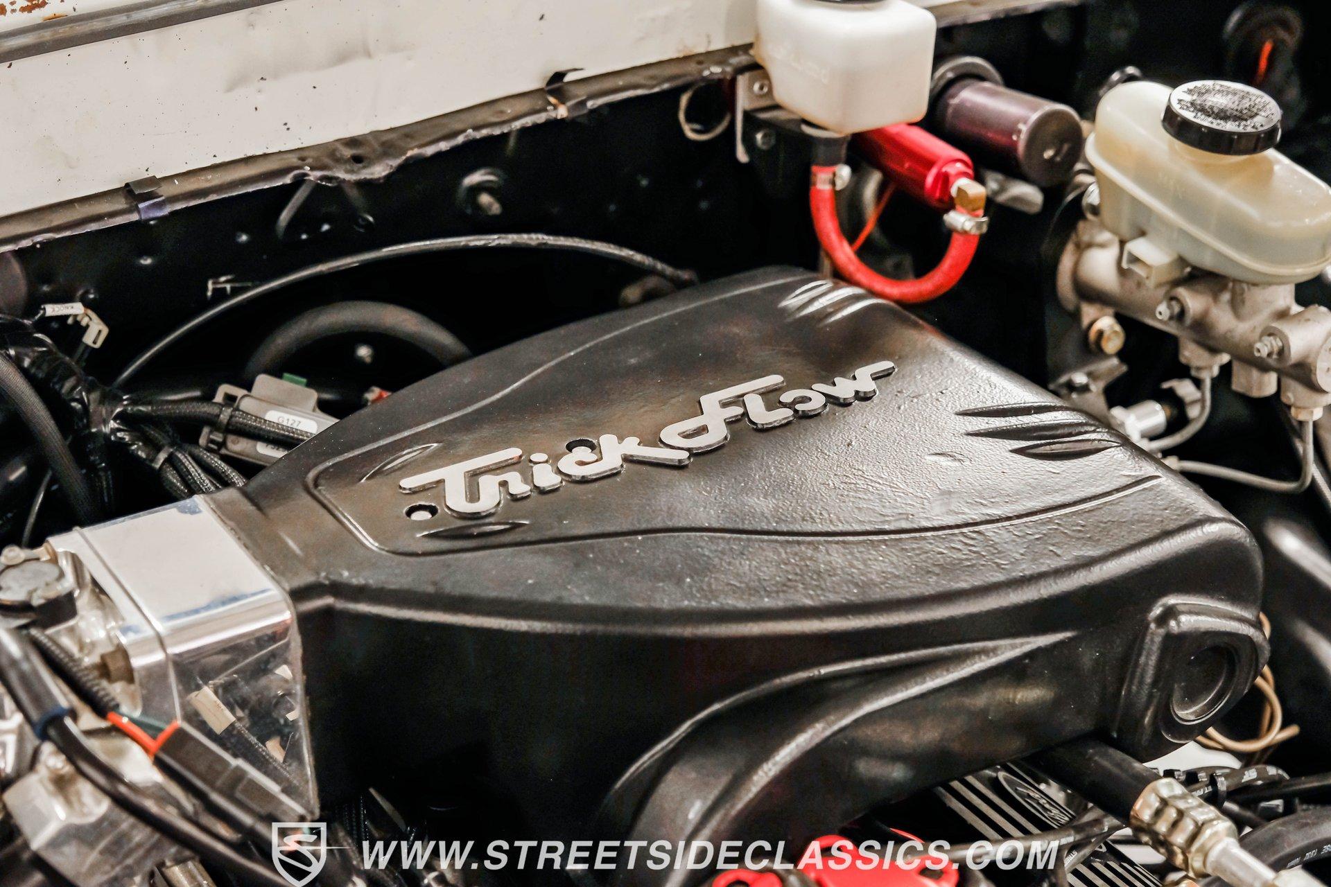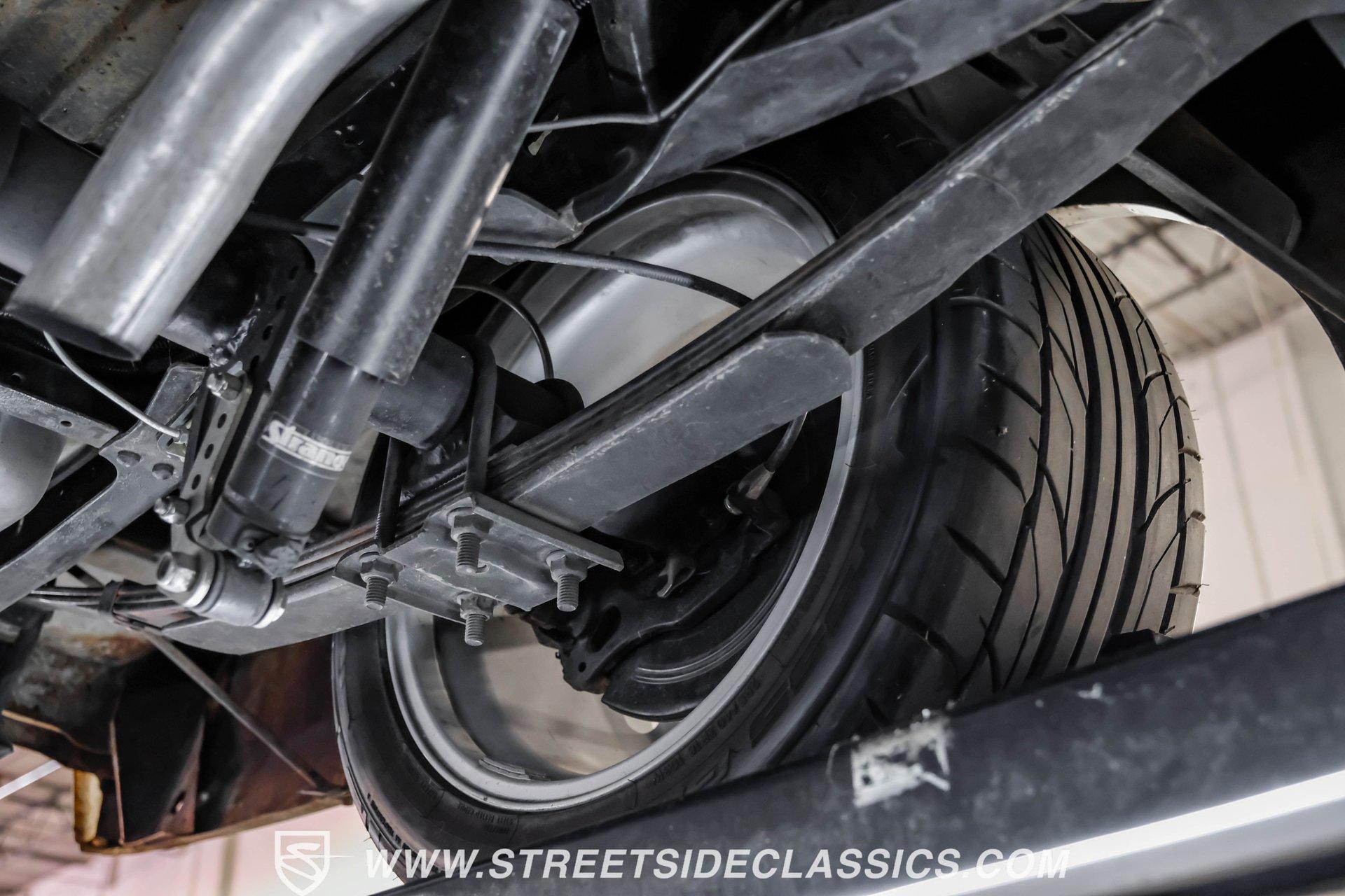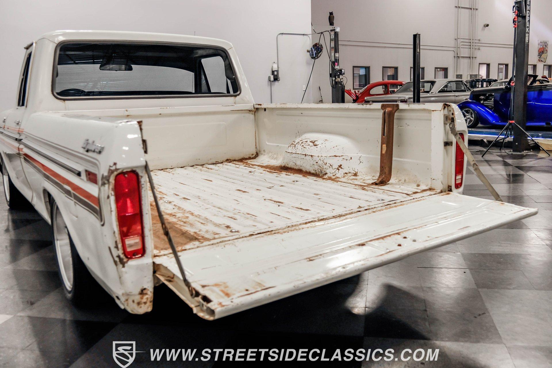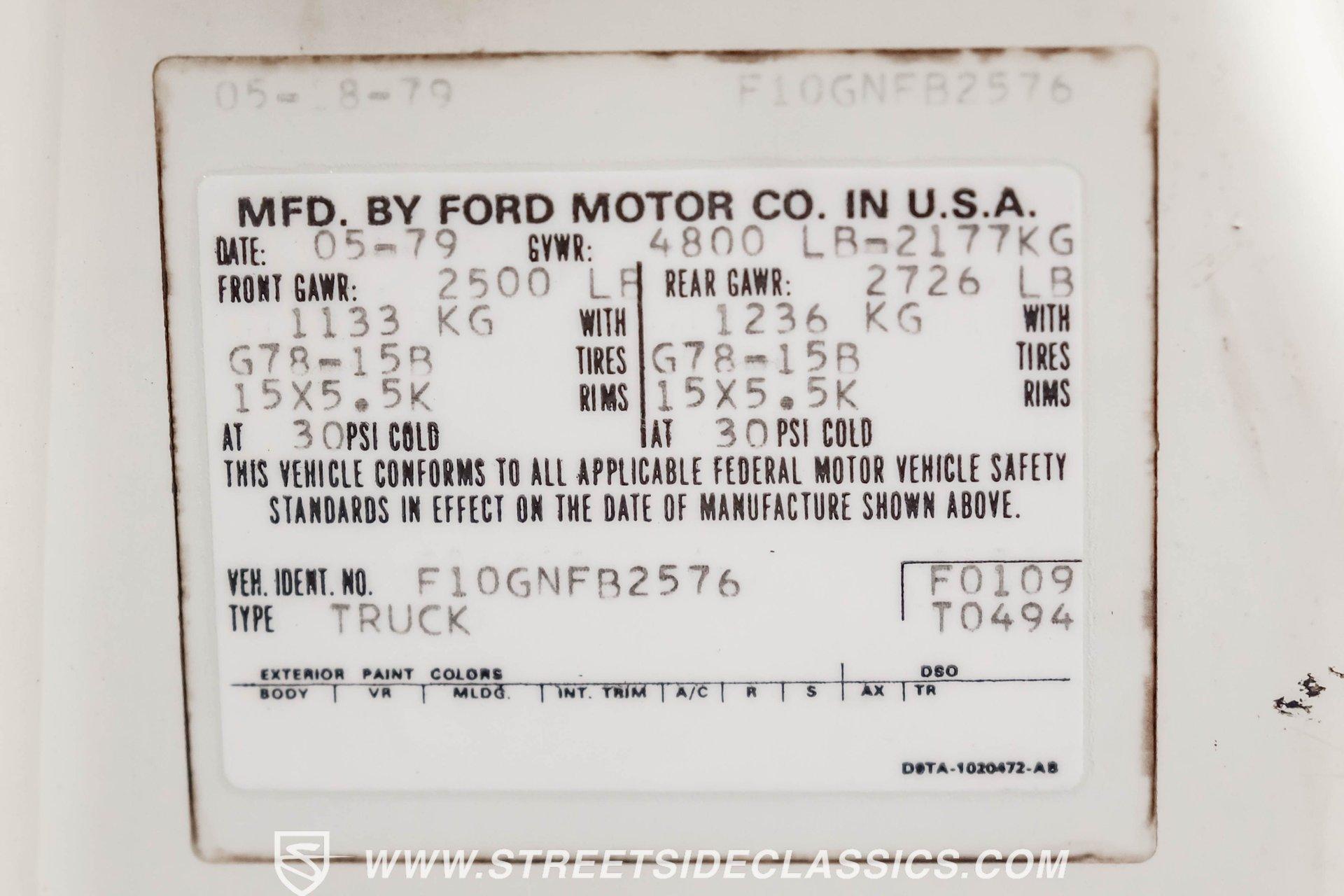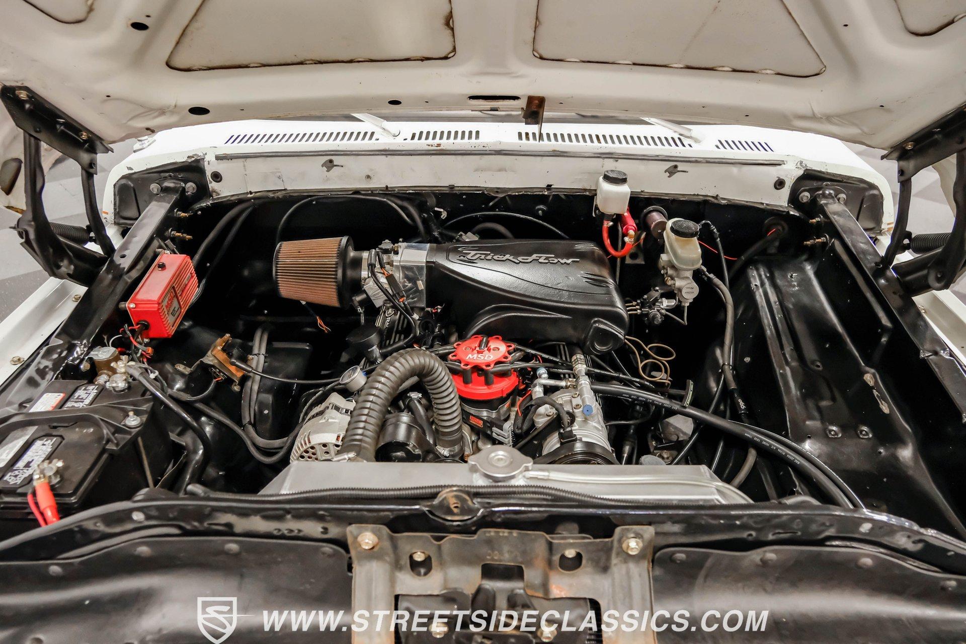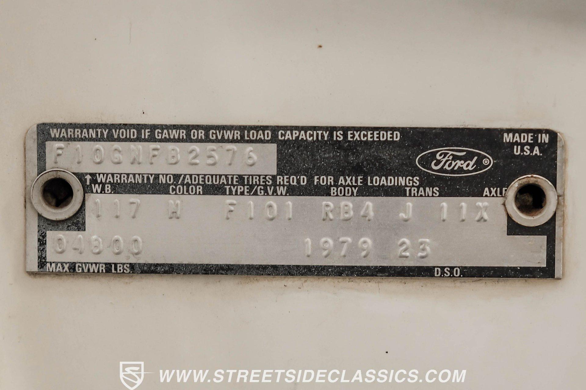 Street-tough and road-ready, this 1979 Ford F-100 Ranger Explorer Restomod is still covered in its original white exterior slashed with orange decal stripes that amp up its attitude. Dropped on a Final-Gen Crown Vic-style front end, this pickup sits low and mean on the pavement. Muscular 18" Aodhan wheels fill the wheel wells, wrapped in fat 275/40ZR18 Nitto rubber up front and even meatier 295/40ZR18 Nittos out back. The short bed layout keeps proportions tight while the patina finish tells stories of miles traveled. Slide across the blue vinyl and plaid bench seat and grip the aftermarket sport wheel mounted on a tilt column. The blue-on-black color scheme throughout the cabin creates a performance vibe with painted blue dash, door panels, and headliner contrasting against fresh black carpets. Custom black-faced gauges light up with blue illumination, giving off a street-machine glow after dark. The aftermarket A/C blows cold while the Hurst shifter stands ready for action between the gears. The fuel-injected 5.0L V8 is mated to a 5-speed manual transmission. The Trick Flow intake manifold gulps air while long tube headers dump exhaust through an H-pipe and MagnaFlow mufflers for a proper muscle truck soundtrack. An aluminum radiator with electric fans keeps things cool under pressure. The suspension setup includes a Crown Vic front end with coilovers and sway bar and rear solid axle with leaf springs and air shocks which plants this truck firmly on the asphalt during aggressive driving. 5.0L V8 Engine With Electronic Fuel Injection 5-Speed Manual Transmission With Hurst Shifter Trick Flow Intake Manifold Long Tube Headers MSD Box Aluminum Radiator With Electric Fans Dual Exhaust With H-Pipe And MagnaFlow Mufflers CPP Hydroboost Power Disc Brakes Crown Vic Front End w/ Coilovers With Sway Bar Solid Axle Rear w/ Leaf Springs and Air Shocks Strange Engineering Rear Shocks American Auto Wire Harness Original White Paint Exterior With Orange Decal Stripes Natural Patina Finish 18" Aodhan Wheels 275/40ZR18 Front, 295/40ZR18 Rear Nitto Tires Short Bed Configuration Blue And Plaid Bench Seat With Armrest Console Aftermarket Sport Steering Wheel On Tilt Column Aftermarket Black Face Gauges With Blue Illumination Blue Painted Dash, Door Panels, And Headliner Fresh Black Carpets Aftermarket Air Conditioning Muscle truck style with hot rod attitude, this 1979 Ford F-100 Ranger Explorer Restomod brings power and performance in equal measure. Call today!