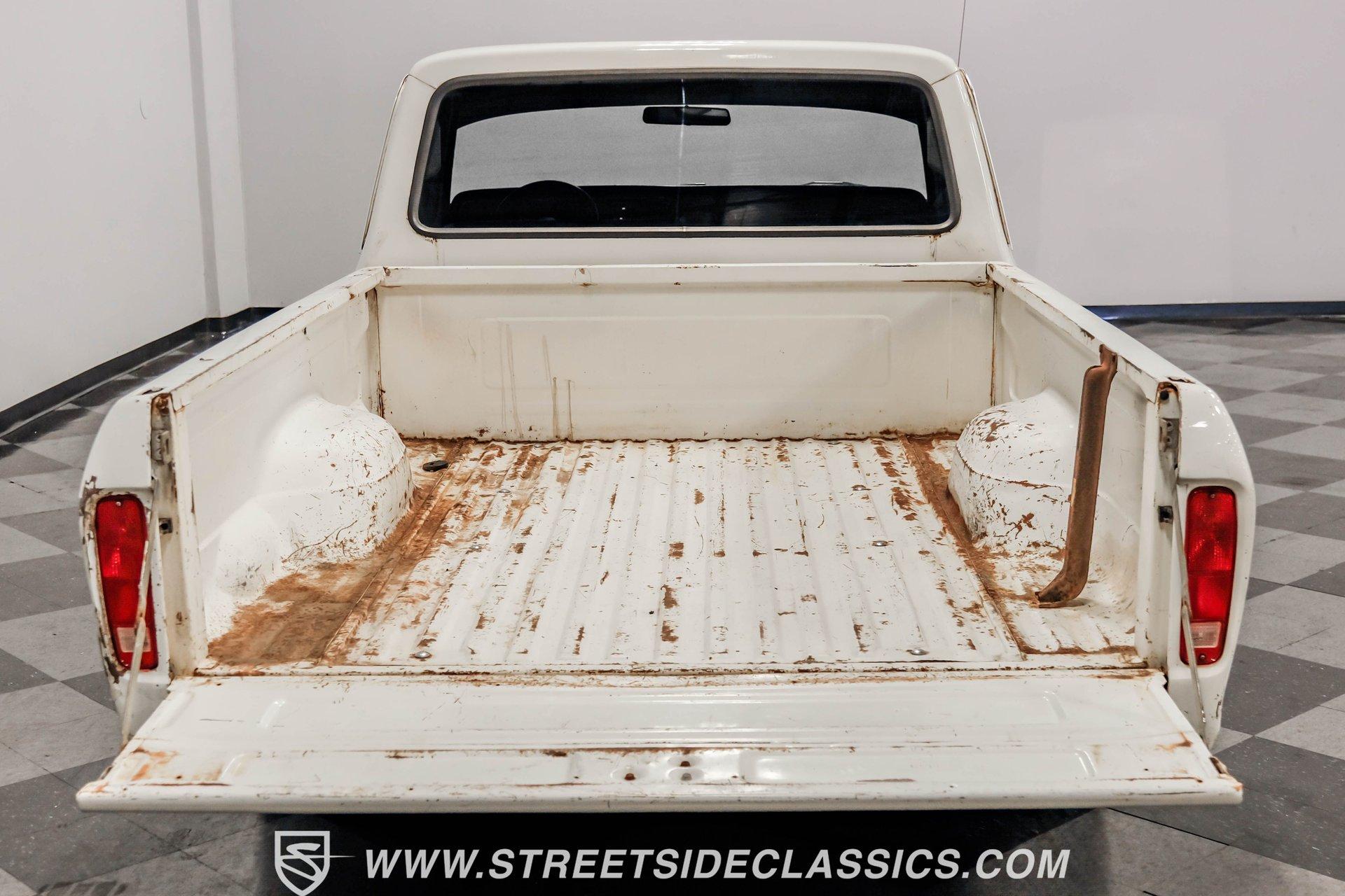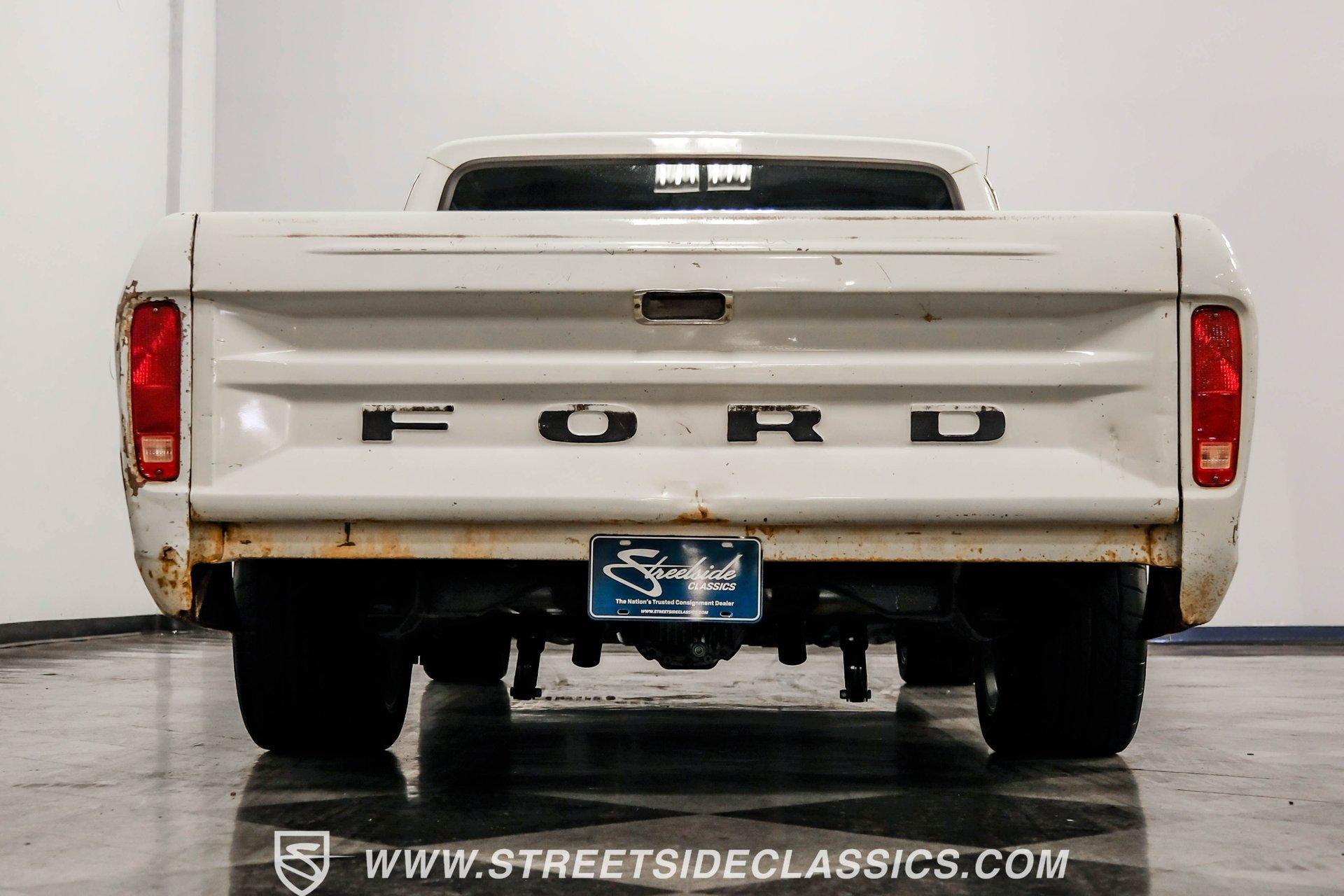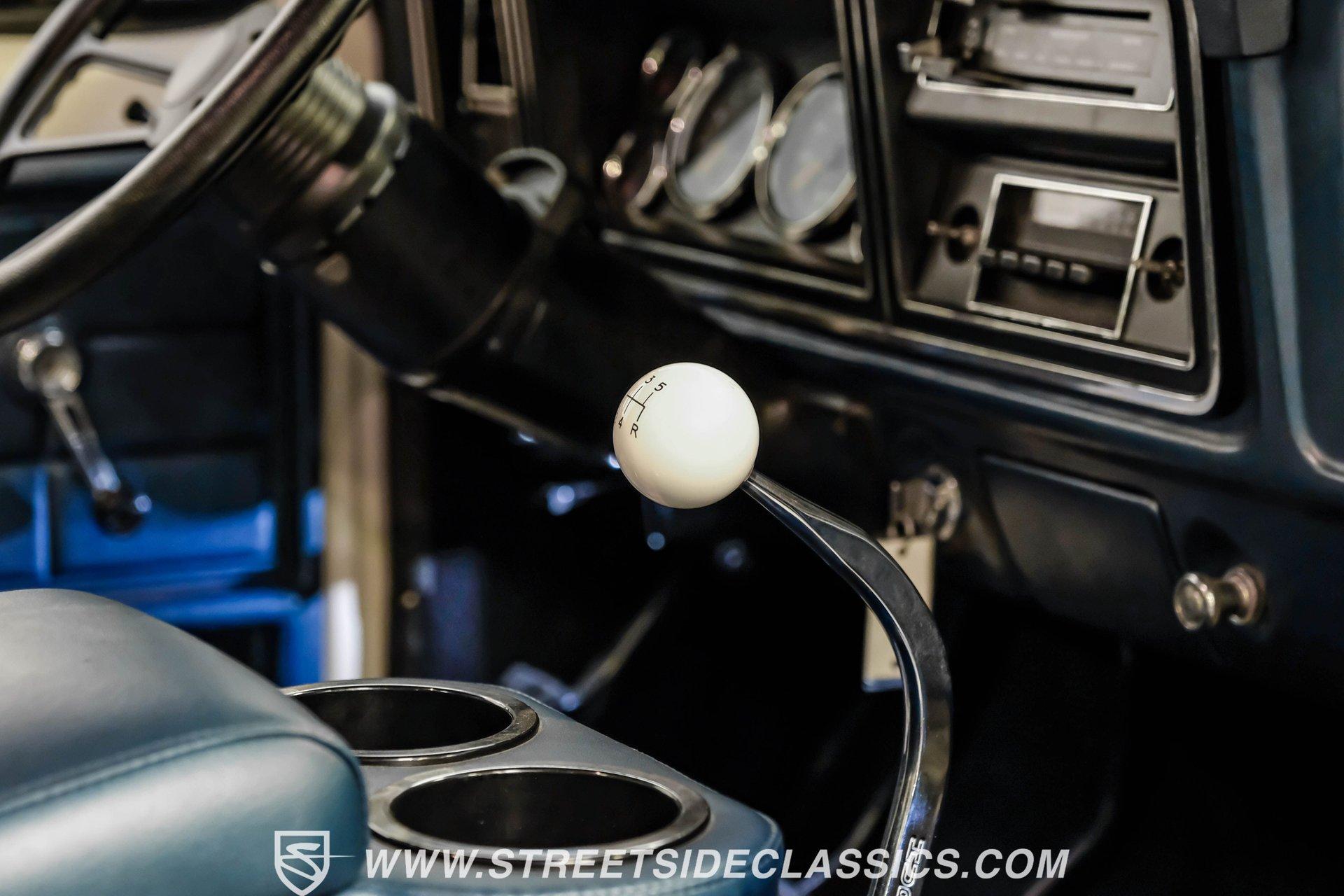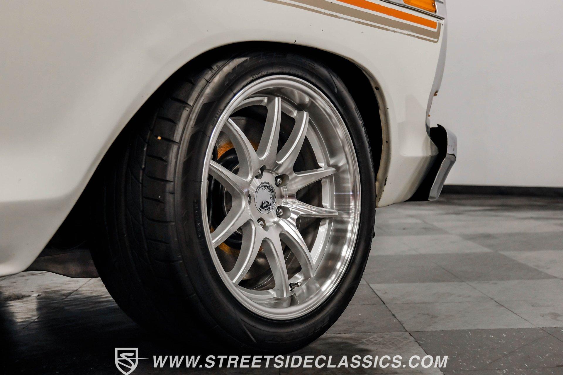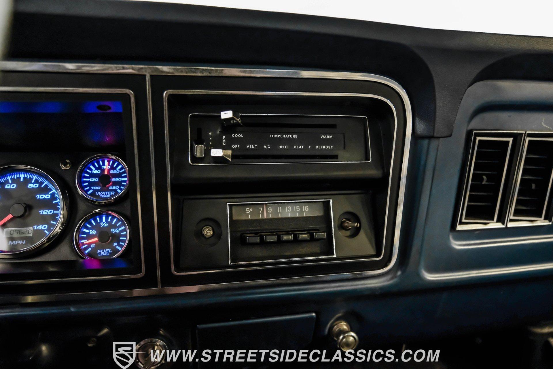 Street-tough and road-ready, this 1979 Ford F-100 Ranger Explorer Restomod is still covered in its original white exterior slashed with orange decal stripes that amp up its attitude. Dropped on a Final-Gen Crown Vic-style front end, this pickup sits low and mean on the pavement. Muscular 18" Aodhan wheels fill the wheel wells, wrapped in fat 275/40ZR18 Nitto rubber up front and even meatier 295/40ZR18 Nittos out back. The short bed layout keeps proportions tight while the patina finish tells stories of miles traveled. Slide across the blue vinyl and plaid bench seat and grip the aftermarket sport wheel mounted on a tilt column. The blue-on-black color scheme throughout the cabin creates a performance vibe with painted blue dash, door panels, and headliner contrasting against fresh black carpets. Custom black-faced gauges light up with blue illumination, giving off a street-machine glow after dark. The aftermarket A/C blows cold while the Hurst shifter stands ready for action between the gears. The fuel-injected 5.0L V8 is mated to a 5-speed manual transmission. The Trick Flow intake manifold gulps air while long tube headers dump exhaust through an H-pipe and MagnaFlow mufflers for a proper muscle truck soundtrack. An aluminum radiator with electric fans keeps things cool under pressure. The suspension setup includes a Crown Vic front end with coilovers and sway bar and rear solid axle with leaf springs and air shocks which plants this truck firmly on the asphalt during aggressive driving. 5.0L V8 Engine With Electronic Fuel Injection 5-Speed Manual Transmission With Hurst Shifter Trick Flow Intake Manifold Long Tube Headers MSD Box Aluminum Radiator With Electric Fans Dual Exhaust With H-Pipe And MagnaFlow Mufflers CPP Hydroboost Power Disc Brakes Crown Vic Front End w/ Coilovers With Sway Bar Solid Axle Rear w/ Leaf Springs and Air Shocks Strange Engineering Rear Shocks American Auto Wire Harness Original White Paint Exterior With Orange Decal Stripes Natural Patina Finish 18" Aodhan Wheels 275/40ZR18 Front, 295/40ZR18 Rear Nitto Tires Short Bed Configuration Blue And Plaid Bench Seat With Armrest Console Aftermarket Sport Steering Wheel On Tilt Column Aftermarket Black Face Gauges With Blue Illumination Blue Painted Dash, Door Panels, And Headliner Fresh Black Carpets Aftermarket Air Conditioning Muscle truck style with hot rod attitude, this 1979 Ford F-100 Ranger Explorer Restomod brings power and performance in equal measure. Call today!