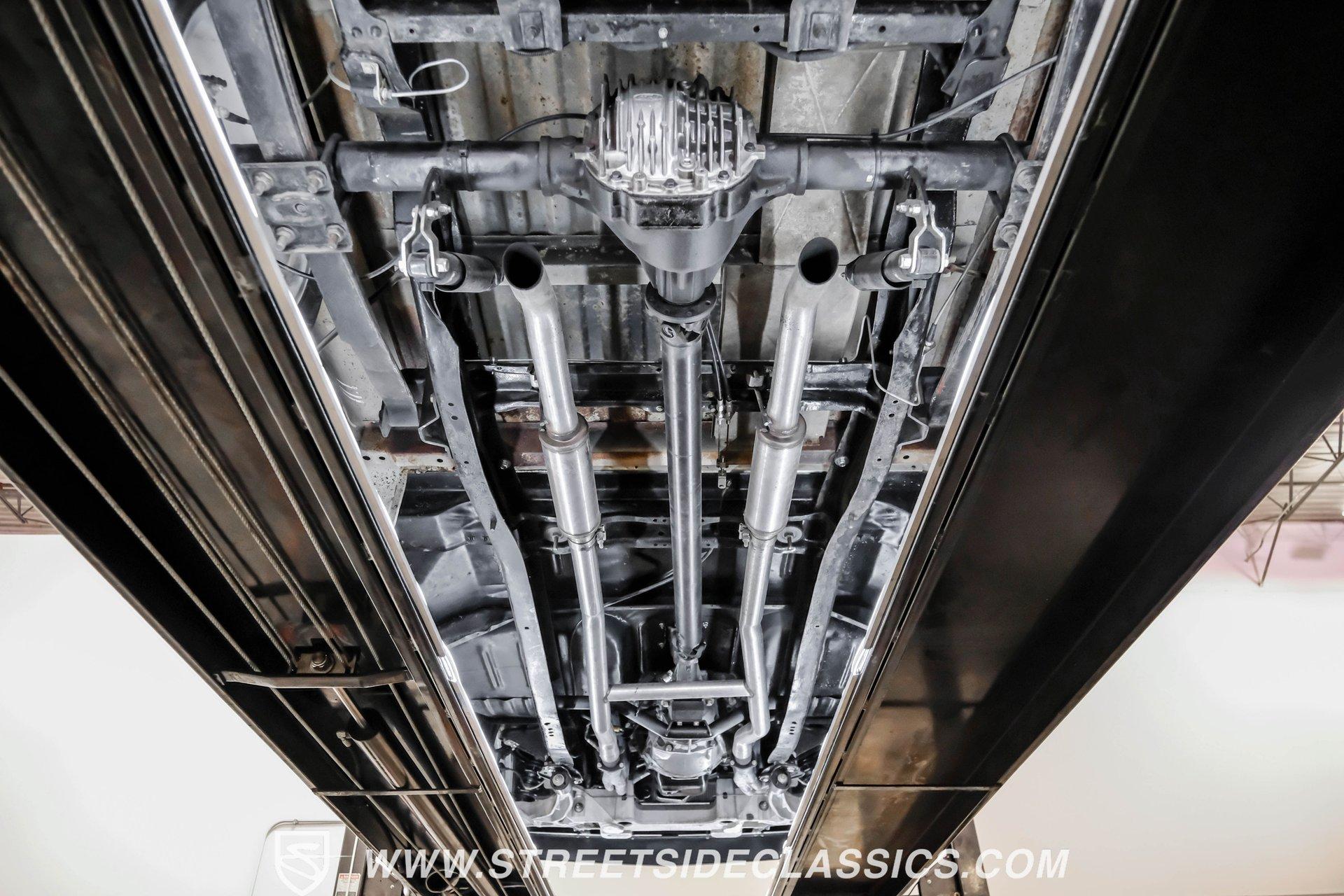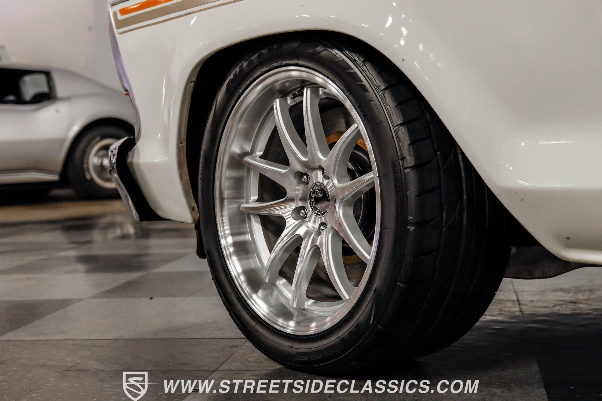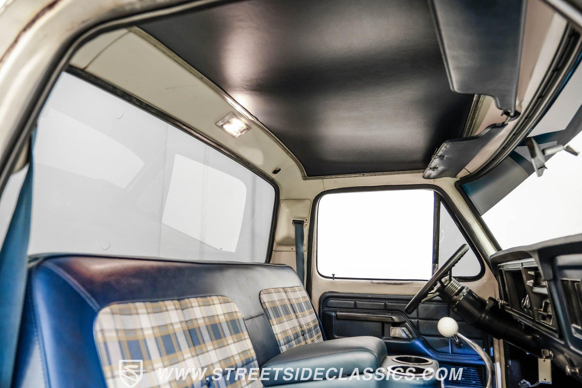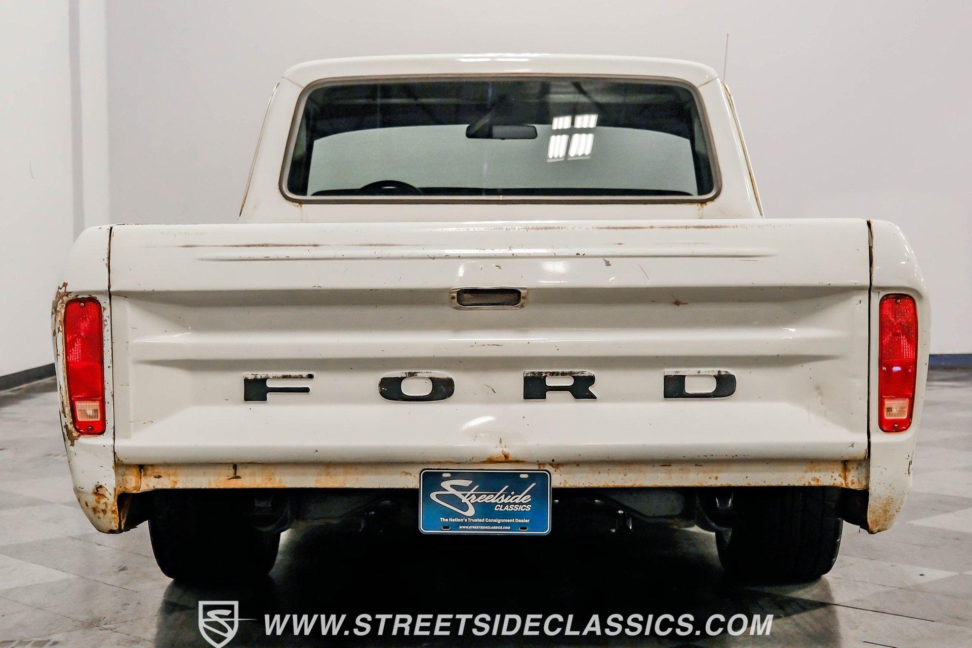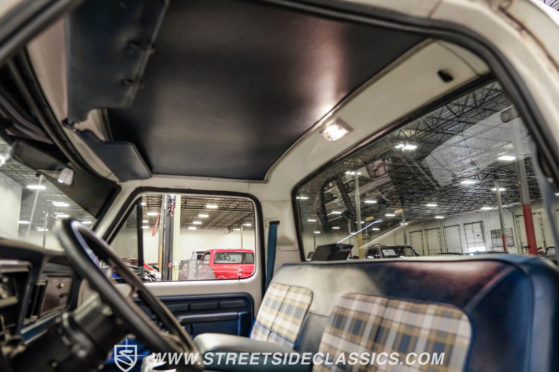 Street-tough and road-ready, this 1979 Ford F-100 Ranger Explorer Restomod is still covered in its original white exterior slashed with orange decal stripes that amp up its attitude. Dropped on a Final-Gen Crown Vic-style front end, this pickup sits low and mean on the pavement. Muscular 18" Aodhan wheels fill the wheel wells, wrapped in fat 275/40ZR18 Nitto rubber up front and even meatier 295/40ZR18 Nittos out back. The short bed layout keeps proportions tight while the patina finish tells stories of miles traveled. Slide across the blue vinyl and plaid bench seat and grip the aftermarket sport wheel mounted on a tilt column. The blue-on-black color scheme throughout the cabin creates a performance vibe with painted blue dash, door panels, and headliner contrasting against fresh black carpets. Custom black-faced gauges light up with blue illumination, giving off a street-machine glow after dark. The aftermarket A/C blows cold while the Hurst shifter stands ready for action between the gears. The fuel-injected 5.0L V8 is mated to a 5-speed manual transmission. The Trick Flow intake manifold gulps air while long tube headers dump exhaust through an H-pipe and MagnaFlow mufflers for a proper muscle truck soundtrack. An aluminum radiator with electric fans keeps things cool under pressure. The suspension setup includes a Crown Vic front end with coilovers and sway bar and rear solid axle with leaf springs and air shocks which plants this truck firmly on the asphalt during aggressive driving. 5.0L V8 Engine With Electronic Fuel Injection 5-Speed Manual Transmission With Hurst Shifter Trick Flow Intake Manifold Long Tube Headers MSD Box Aluminum Radiator With Electric Fans Dual Exhaust With H-Pipe And MagnaFlow Mufflers CPP Hydroboost Power Disc Brakes Crown Vic Front End w/ Coilovers With Sway Bar Solid Axle Rear w/ Leaf Springs and Air Shocks Strange Engineering Rear Shocks American Auto Wire Harness Original White Paint Exterior With Orange Decal Stripes Natural Patina Finish 18" Aodhan Wheels 275/40ZR18 Front, 295/40ZR18 Rear Nitto Tires Short Bed Configuration Blue And Plaid Bench Seat With Armrest Console Aftermarket Sport Steering Wheel On Tilt Column Aftermarket Black Face Gauges With Blue Illumination Blue Painted Dash, Door Panels, And Headliner Fresh Black Carpets Aftermarket Air Conditioning Muscle truck style with hot rod attitude, this 1979 Ford F-100 Ranger Explorer Restomod brings power and performance in equal measure. Call today!