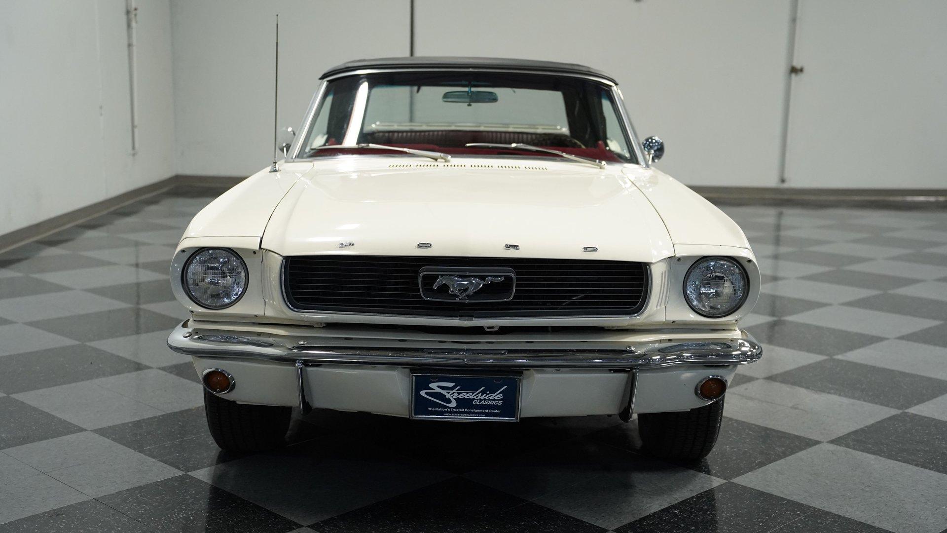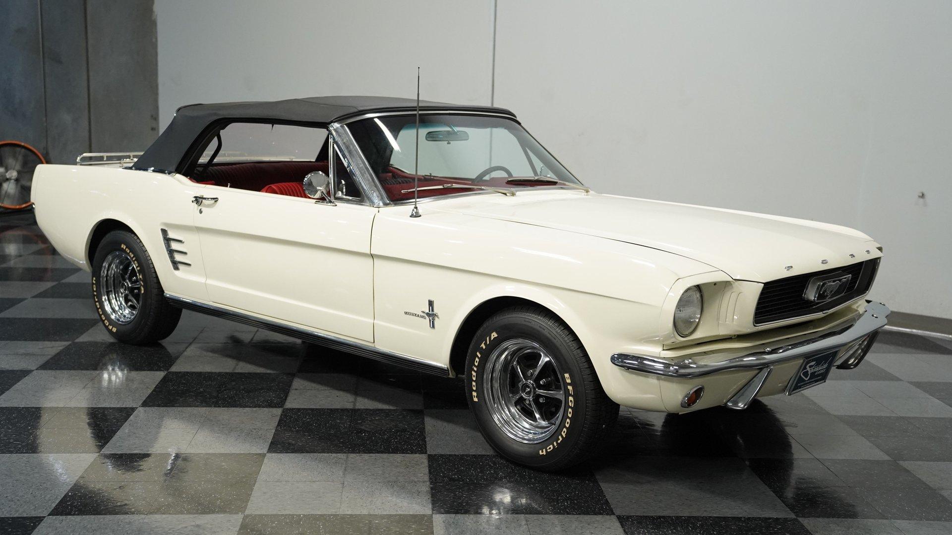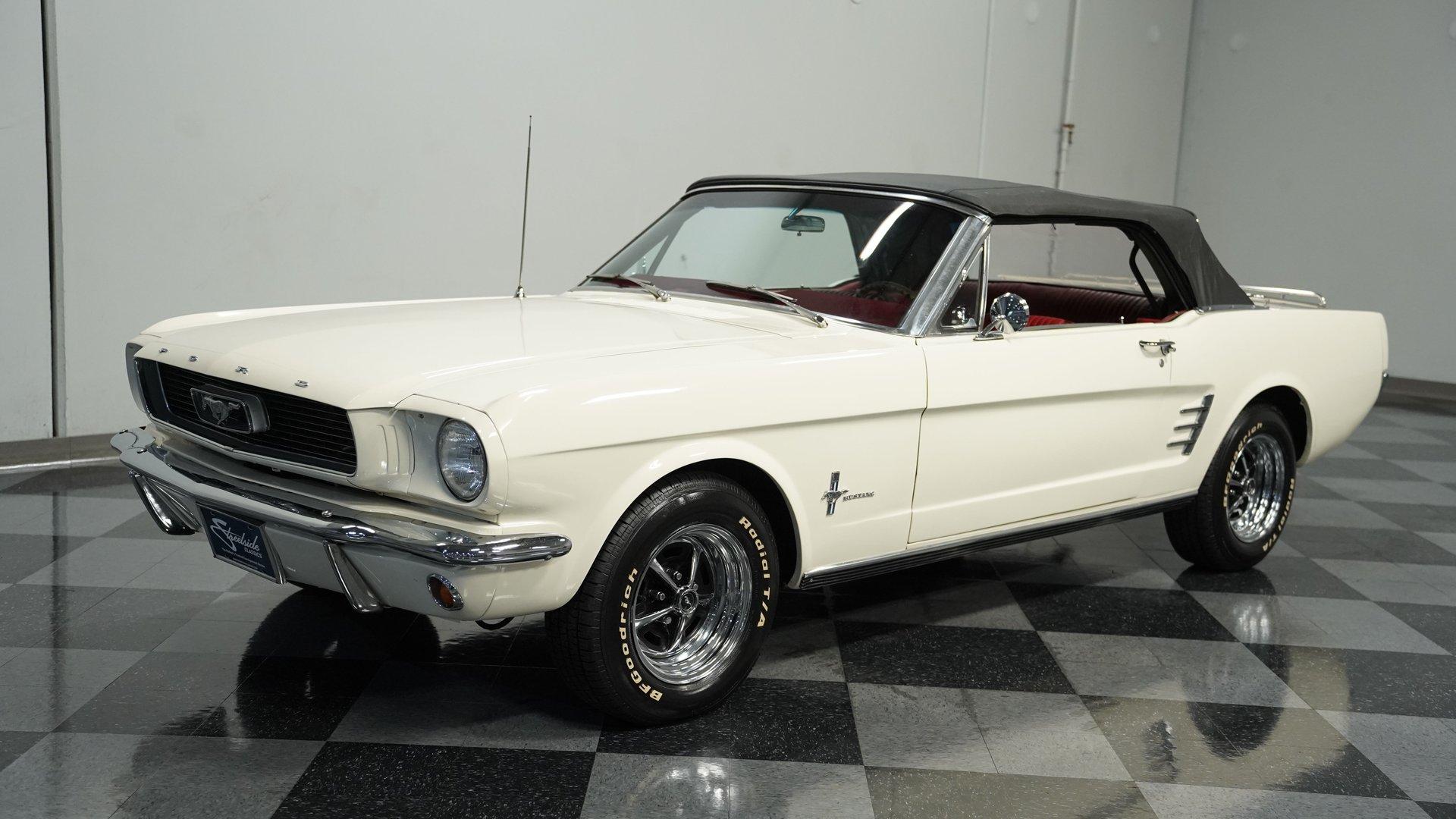 A build decades in the making, this 1966 Ford Mustang Convertible Restomod stands in Wimbledon White with a black canvas top, its proportions sharpened by a purposeful stance on 14" wheels wrapped in 205/70R14 tires. The full repaint delivers a uniform tone across the sheet metal, complemented by clean chrome trim and brightwork. The black convertible top features a clear plastic rear window, giving this pony car the open-air attitude of a true summer cruiser or the closed-in look of a tight, weather-ready roof when buttoned up. Inside, the Emberglo and white pony interior adds visual depth, pairing deluxe vinyl bucket seats with matching door panels and a center console. A full dash mat spans the width, protecting the clean instrument panel and framing clear gauges. Comfort and convenience come from factory-style air conditioning, power steering, and an AM/FM cassette stereo, blending classic Mustang cues with upgrades that make long drives more enjoyable. Underneath that long hood sits a 5.0-liter V8 swap from a Foxbody Mustang, mated to a C4 3-speed automatic transmission. Electronic fuel injection modernizes the delivery, while power steering and front disc brakes enhance drivability. Suspension duties are handled by MacPherson struts up front and leaf springs with shocks out back. A dual exhaust with Golden Turbo mufflers adds the right note, and an 8" rear axle keeps the power planted. HIGHLIGHTS 5.0 Liter V8 Engine Swap C4 3-Speed Automatic Transmission Electronic Fuel Injection Power Steering Front Disc Brakes MacPherson Strut Front Suspension Leaf Spring Rear Suspension With Shocks 8" Rear Axle Dual Exhaust With Golden Turbo Mufflers Wimbledon White Paint Black Canvas Convertible Top 14" Wheels In 205/70R14 Tires Chrome Trim And Brightwork Emberglo And White Pony Interior Deluxe Bucket Seats Center Console Full Dash Mat Clear Gauges AM/FM Cassette Stereo Air Conditioning With a trusted drivetrain, classic convertible lines, and thoughtful updates, this 1966 Ford Mustang Convertible Restomod is a versatile blend of vintage style and modern usability. A true driver's pony car that's ready to be enjoyed immediately. Call today!