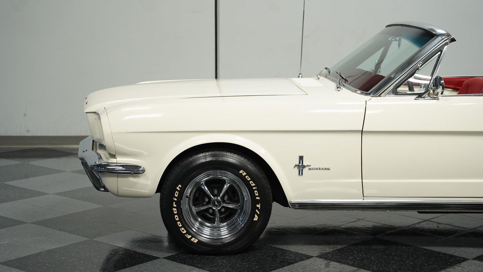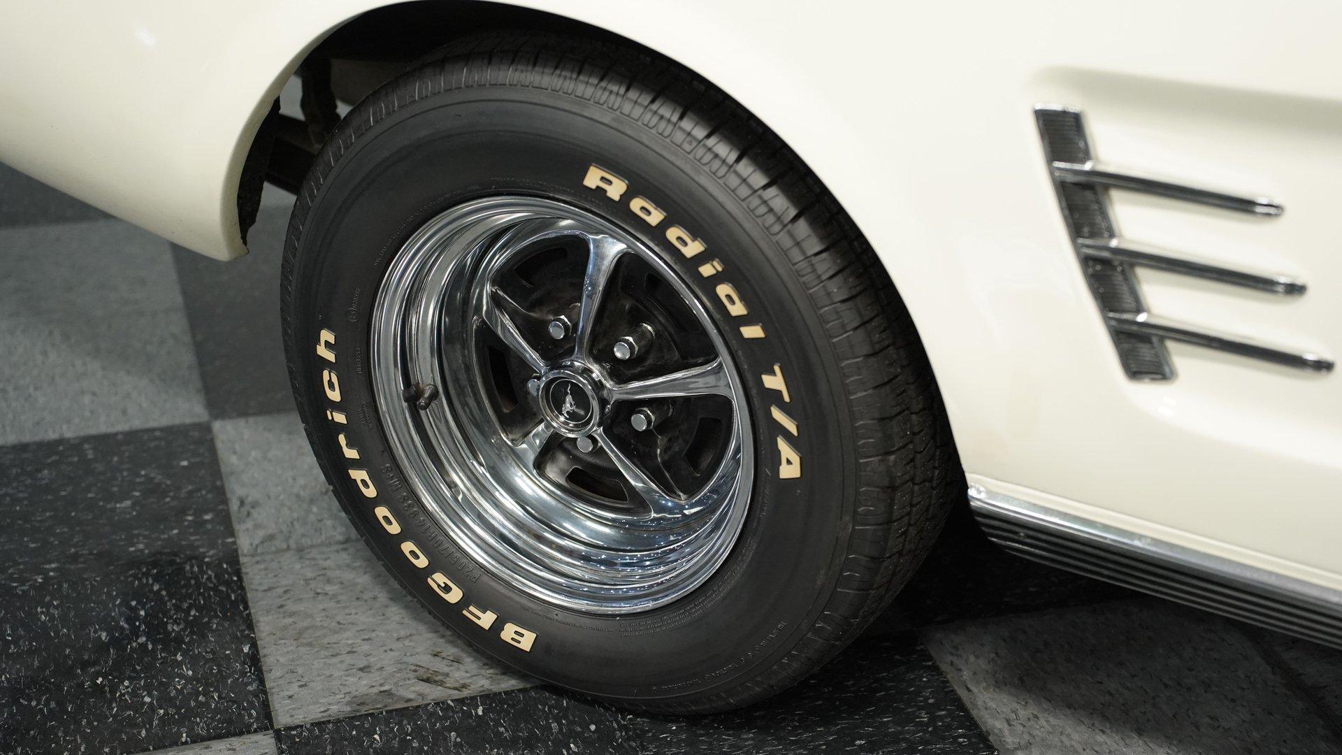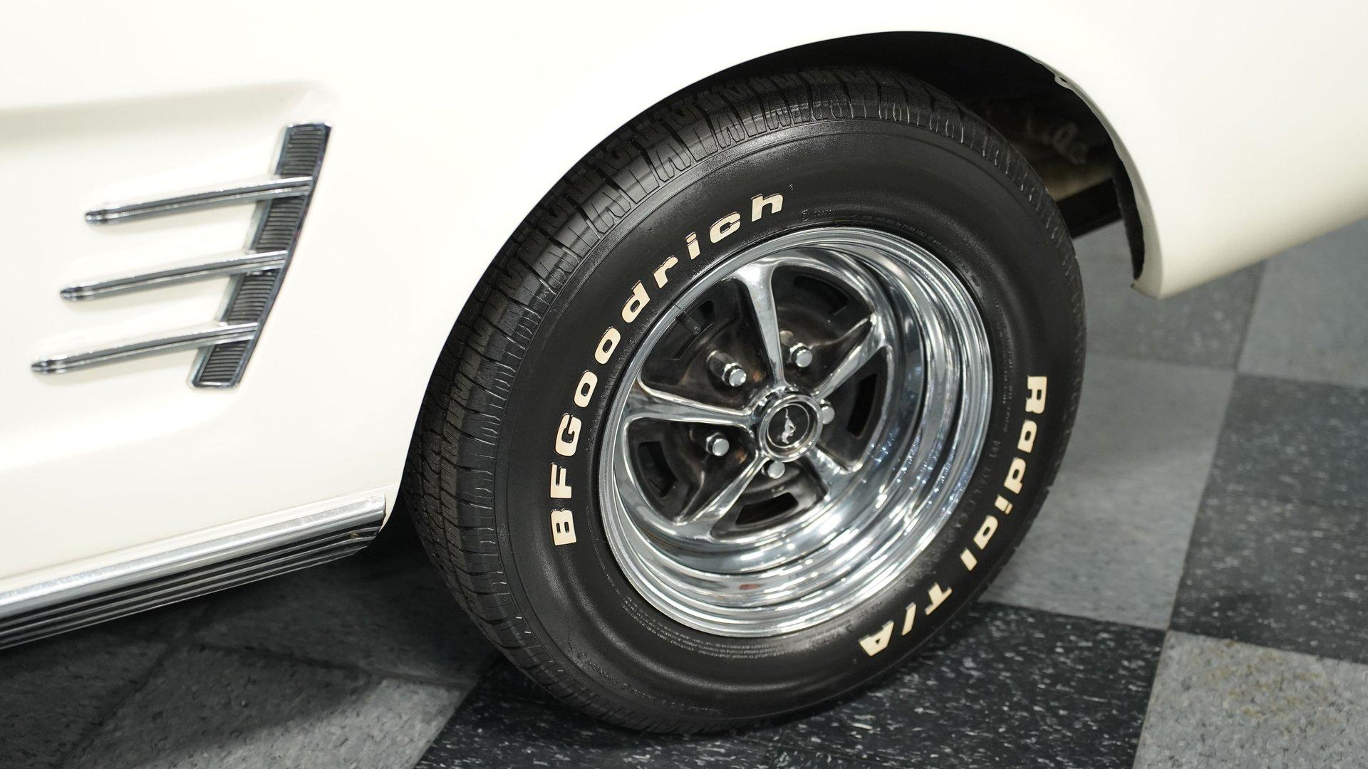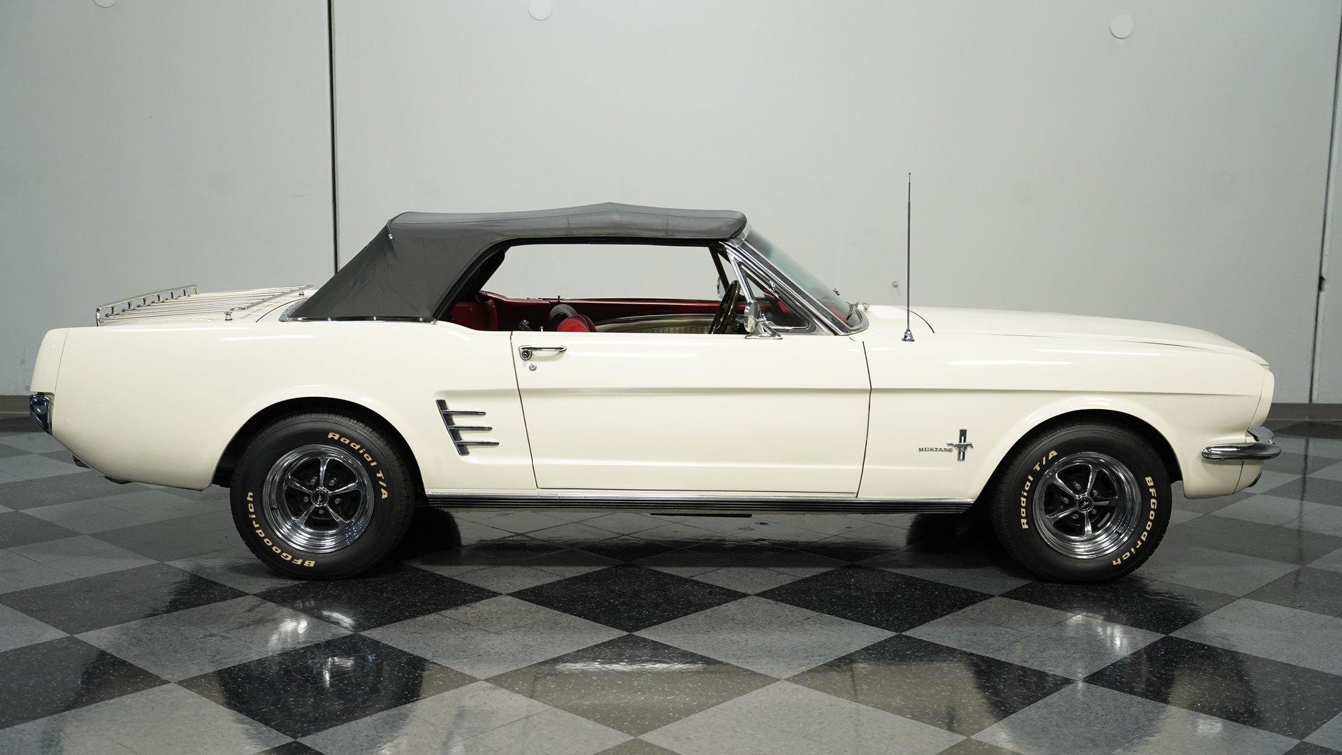A build decades in the making, this 1966 Ford Mustang Convertible Restomod stands in Wimbledon White with a black canvas top, its proportions sharpened by a purposeful stance on 14" wheels wrapped in 205/70R14 tires. The full repaint delivers a uniform tone across the sheet metal, complemented by clean chrome trim and brightwork. The black convertible top features a clear plastic rear window, giving this pony car the open-air attitude of a true summer cruiser or the closed-in look of a tight, weather-ready roof when buttoned up. Inside, the Emberglo and white pony interior adds visual depth, pairing deluxe vinyl bucket seats with matching door panels and a center console. A full dash mat spans the width, protecting the clean instrument panel and framing clear gauges. Comfort and convenience come from factory-style air conditioning, power steering, and an AM/FM cassette stereo, blending classic Mustang cues with upgrades that make long drives more enjoyable. Underneath that long hood sits a 5.0-liter V8 swap from a Foxbody Mustang, mated to a C4 3-speed automatic transmission. Electronic fuel injection modernizes the delivery, while power steering and front disc brakes enhance drivability. Suspension duties are handled by MacPherson struts up front and leaf springs with shocks out back. A dual exhaust with Golden Turbo mufflers adds the right note, and an 8" rear axle keeps the power planted. HIGHLIGHTS 5.0 Liter V8 Engine Swap C4 3-Speed Automatic Transmission Electronic Fuel Injection Power Steering Front Disc Brakes MacPherson Strut Front Suspension Leaf Spring Rear Suspension With Shocks 8" Rear Axle Dual Exhaust With Golden Turbo Mufflers Wimbledon White Paint Black Canvas Convertible Top 14" Wheels In 205/70R14 Tires Chrome Trim And Brightwork Emberglo And White Pony Interior Deluxe Bucket Seats Center Console Full Dash Mat Clear Gauges AM/FM Cassette Stereo Air Conditioning With a trusted drivetrain, classic convertible lines, and thoughtful updates, this 1966 Ford Mustang Convertible Restomod is a versatile blend of vintage style and modern usability. A true driver's pony car that's ready to be enjoyed immediately. Call today!