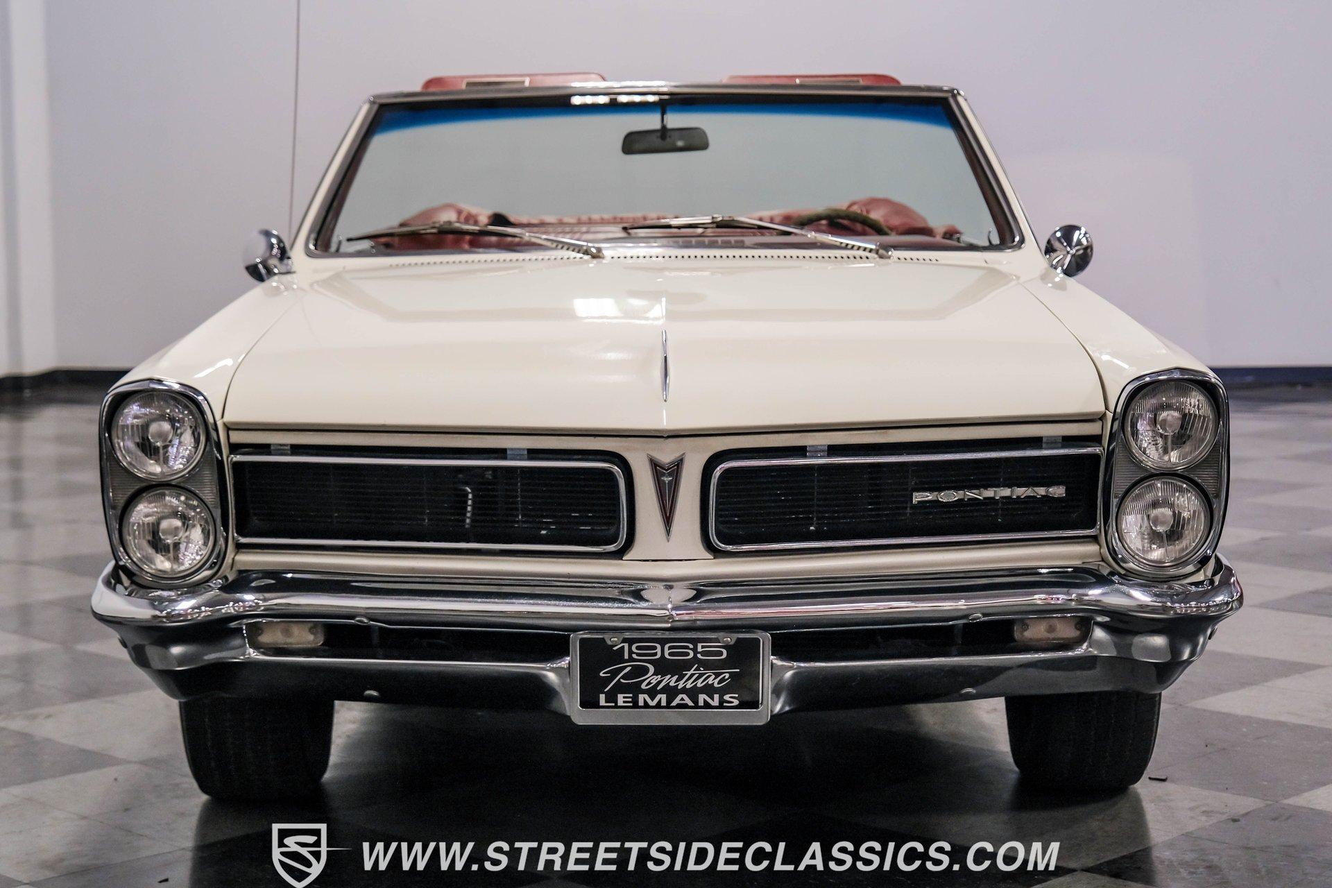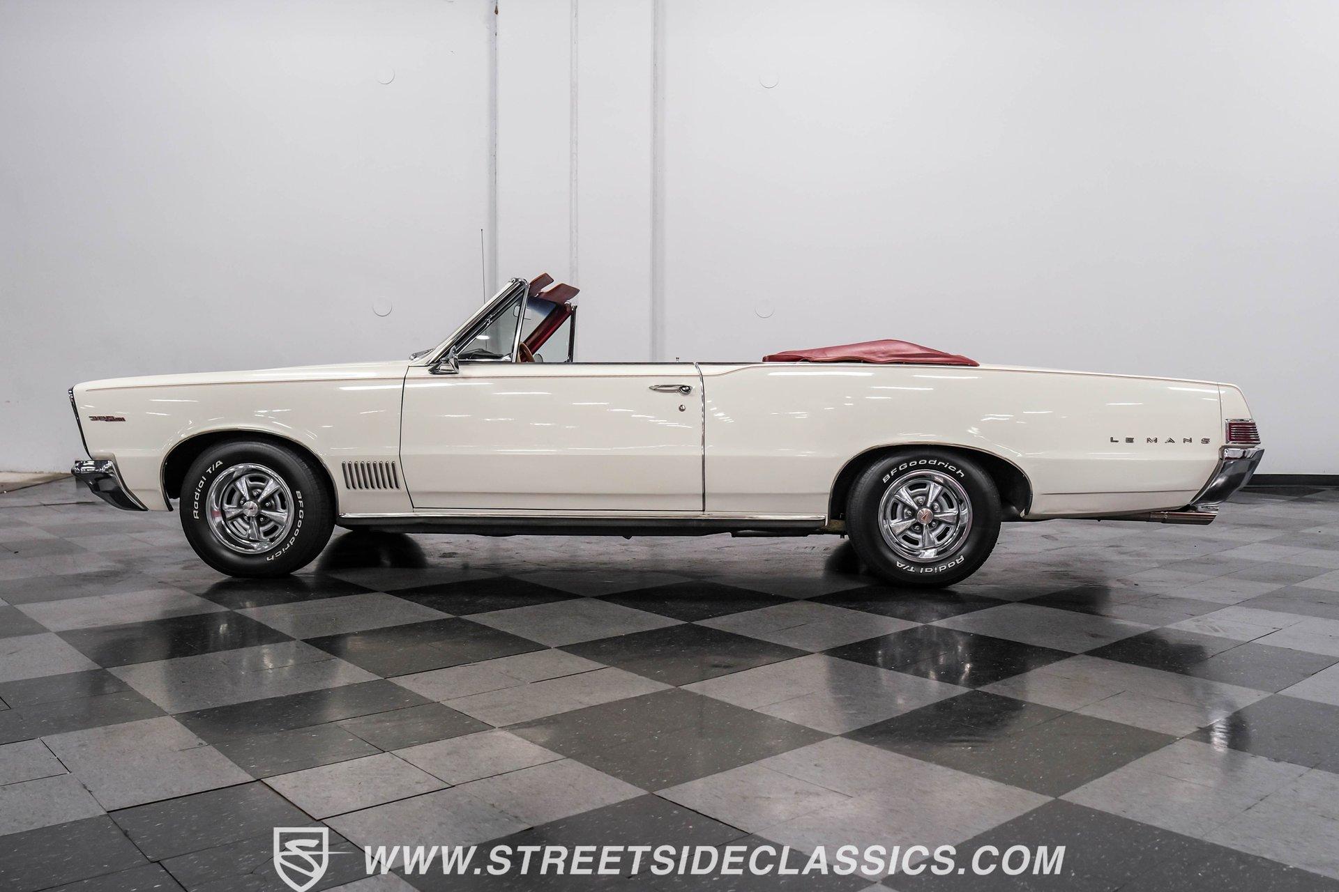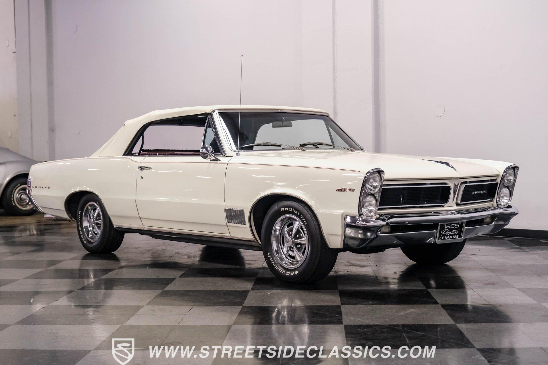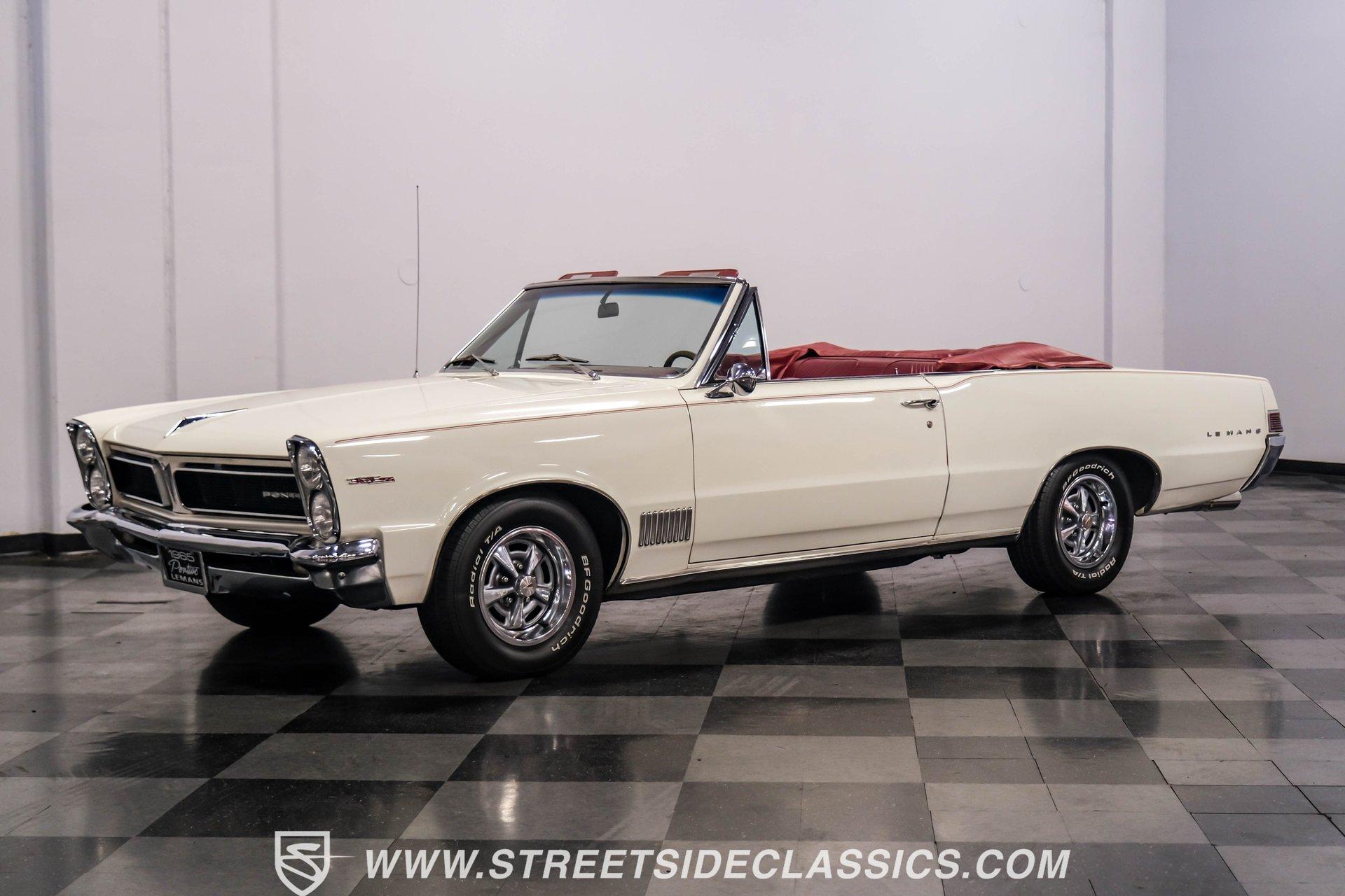 California drop-tops like the mid-sixties Pontiac have always drawn attention. Finished in factory Cameo Ivory, this 1965 Pontiac LeMans Convertible presents classic muscle car styling with clean proportions. The white vinyl convertible top operates with power assistance and includes a matching boot cover. Chrome accents frame the distinctive split grille and taillight housings while 14-inch wheels wrapped in 225/70R14 BFG tires give a proper stance. Dual exhaust with cutouts adds an aggressive look from the rear view. Red vinyl covers the interior of this LeMans, giving a strong visual against the ivory exterior. Bucket seats sit on either side of a factory center console with floor shifter for a muscle car layout. Instrumentation includes the stock gauge cluster plus additional Auto-Gage units mounted under the dash displaying oil pressure, voltage, and temperature readings. The cabin features a RetroSound radio, air conditioning, power convertible top, and an anti-theft system. Every component maintains the period-correct appearance while adding modern function to this classic Pontiac. A 326 cubic inch V8 engine powers this LeMans convertible. The motor features an Edelbrock intake manifold topped with a four-barrel carburetor. Long tube headers lead to a dual exhaust system with X-pipe and cutouts. A two-speed Powerglide automatic transmission pairs with this V8 setup. The front disc brakes, power steering, and suspension with coil springs, shocks, and sway bars create a solid mechanical foundation. Spring-assisted rear shocks improve the ride quality. An electric cooling fan and MSD ignition round out the mechanical upgrades on this classic Pontiac. HIGHLIGHTS: 326 V8 Engine Two-Speed Powerglide Automatic Transmission Edelbrock Intake Manifold Edelbrock Four-Barrel Carburetor Long Tube Headers Dual Exhaust With X-Pipe And Cutouts Electric Cooling Fan MSD Ignition Box Power Brakes with Front Disc Sway Bars Front And Rear 10-Bolt Rear Axle Cameo Ivory Paint White Vinyl Power Convertible Top Convertible Boot Cover 14-Inch Wheels In 225/70R14 BFG Tires Red Interior With Bucket Seats And Console Floor Shifter Power Steering RetroSound Radio Air Conditioning Auto-Gage Under-Dash Gauges Anti-Theft System California Car V8 power and open-air cruising, this 1965 Pontiac LeMans Convertible offers both with its ivory-over-red color scheme, strong mechanical setup, and comfortable interior. A perfect classic for sunny weekend drives and the top down. Call today!