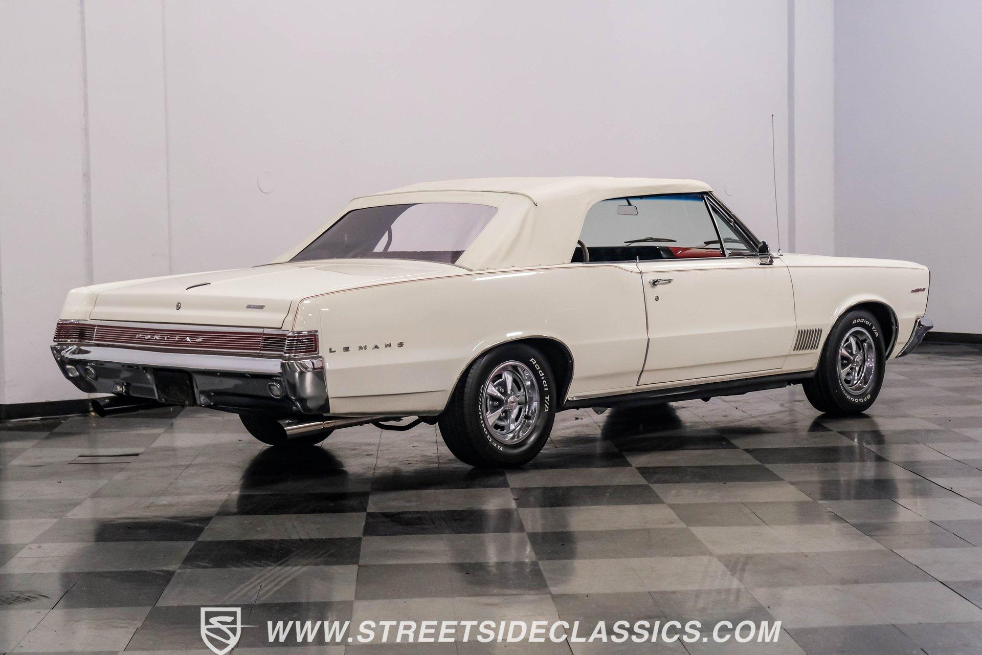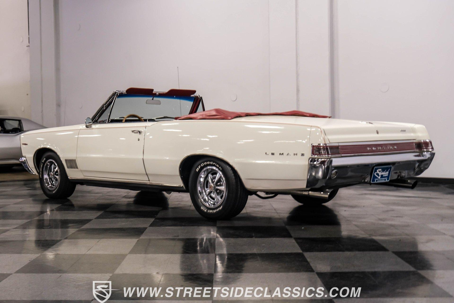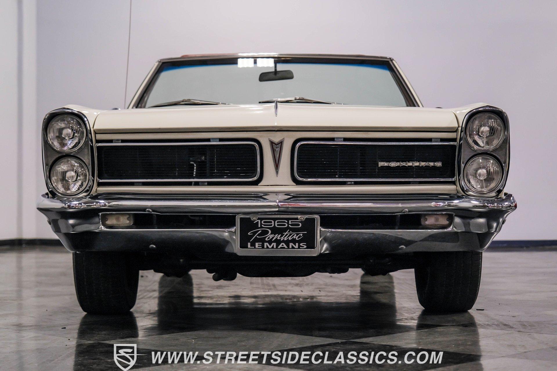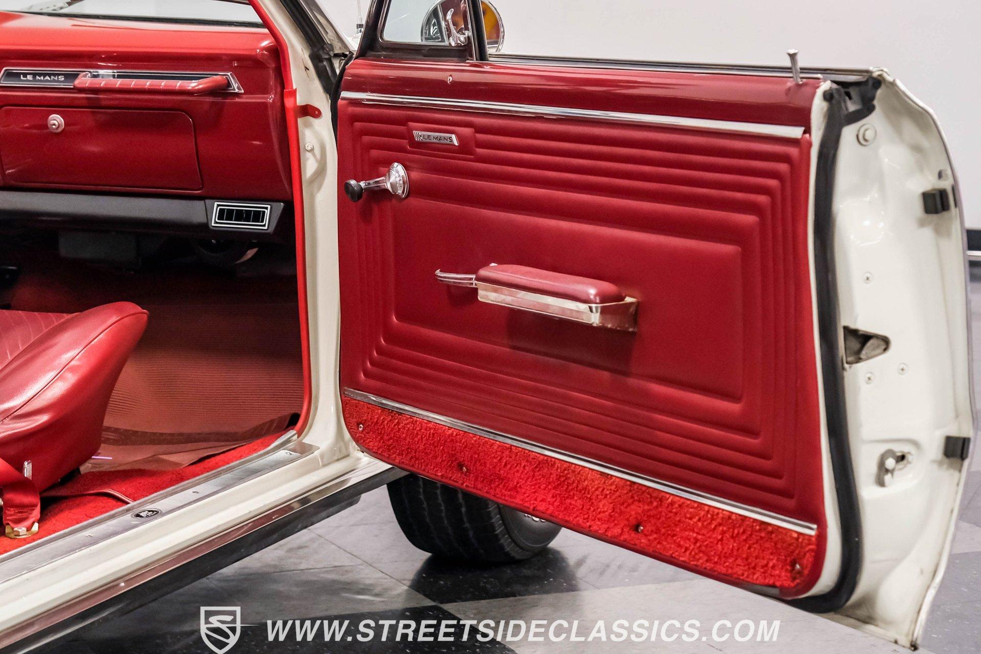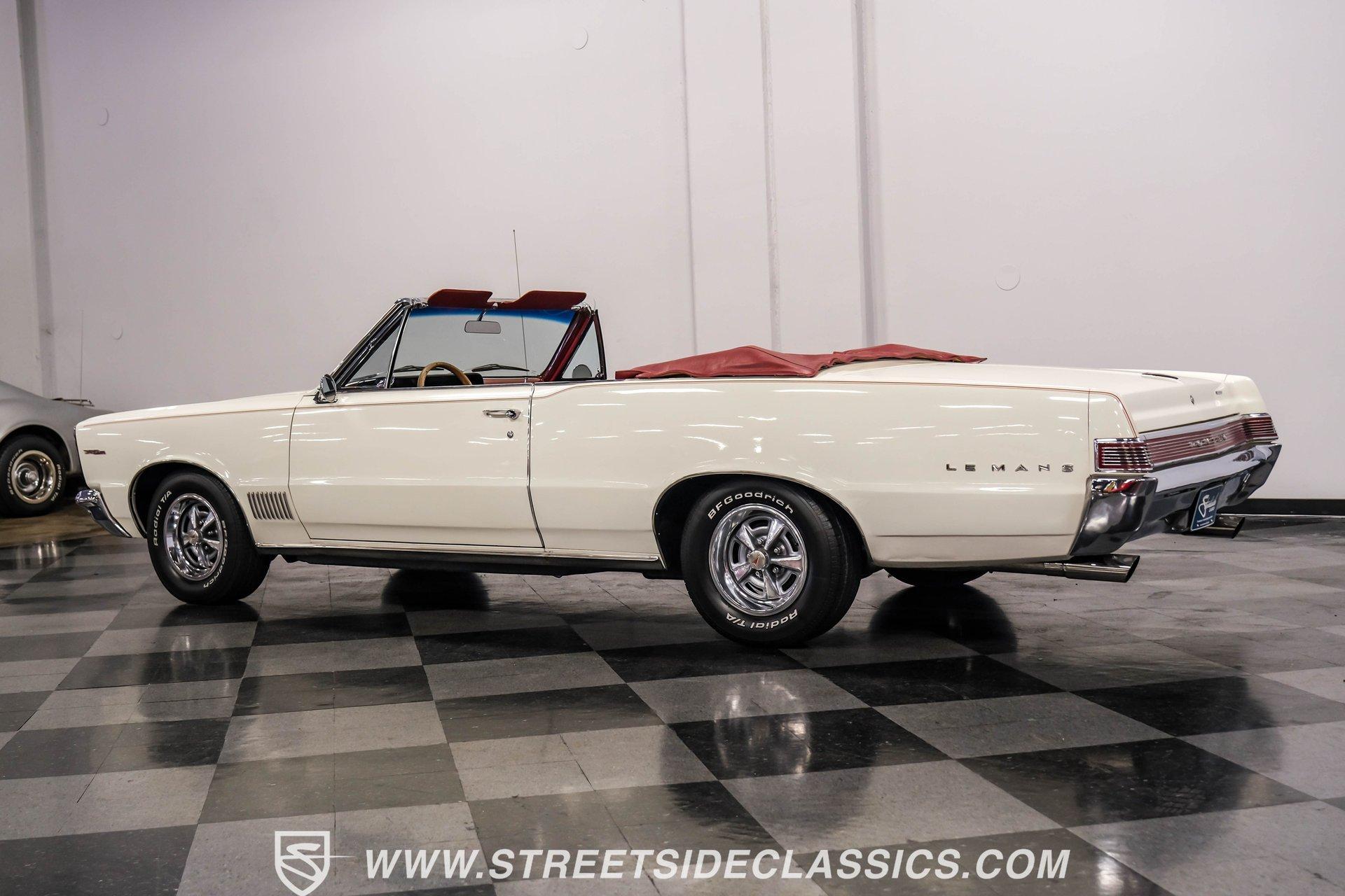 California drop-tops like the mid-sixties Pontiac have always drawn attention. Finished in factory Cameo Ivory, this 1965 Pontiac LeMans Convertible presents classic muscle car styling with clean proportions. The white vinyl convertible top operates with power assistance and includes a matching boot cover. Chrome accents frame the distinctive split grille and taillight housings while 14-inch wheels wrapped in 225/70R14 BFG tires give a proper stance. Dual exhaust with cutouts adds an aggressive look from the rear view. Red vinyl covers the interior of this LeMans, giving a strong visual against the ivory exterior. Bucket seats sit on either side of a factory center console with floor shifter for a muscle car layout. Instrumentation includes the stock gauge cluster plus additional Auto-Gage units mounted under the dash displaying oil pressure, voltage, and temperature readings. The cabin features a RetroSound radio, air conditioning, power convertible top, and an anti-theft system. Every component maintains the period-correct appearance while adding modern function to this classic Pontiac. A 326 cubic inch V8 engine powers this LeMans convertible. The motor features an Edelbrock intake manifold topped with a four-barrel carburetor. Long tube headers lead to a dual exhaust system with X-pipe and cutouts. A two-speed Powerglide automatic transmission pairs with this V8 setup. The front disc brakes, power steering, and suspension with coil springs, shocks, and sway bars create a solid mechanical foundation. Spring-assisted rear shocks improve the ride quality. An electric cooling fan and MSD ignition round out the mechanical upgrades on this classic Pontiac. HIGHLIGHTS: 326 V8 Engine Two-Speed Powerglide Automatic Transmission Edelbrock Intake Manifold Edelbrock Four-Barrel Carburetor Long Tube Headers Dual Exhaust With X-Pipe And Cutouts Electric Cooling Fan MSD Ignition Box Power Brakes with Front Disc Sway Bars Front And Rear 10-Bolt Rear Axle Cameo Ivory Paint White Vinyl Power Convertible Top Convertible Boot Cover 14-Inch Wheels In 225/70R14 BFG Tires Red Interior With Bucket Seats And Console Floor Shifter Power Steering RetroSound Radio Air Conditioning Auto-Gage Under-Dash Gauges Anti-Theft System California Car V8 power and open-air cruising, this 1965 Pontiac LeMans Convertible offers both with its ivory-over-red color scheme, strong mechanical setup, and comfortable interior. A perfect classic for sunny weekend drives and the top down. Call today!