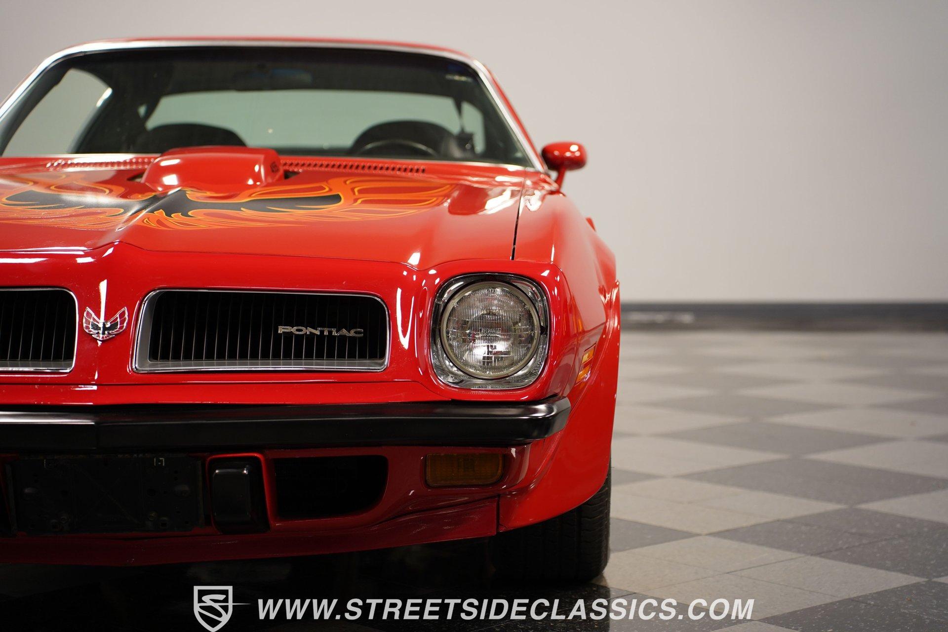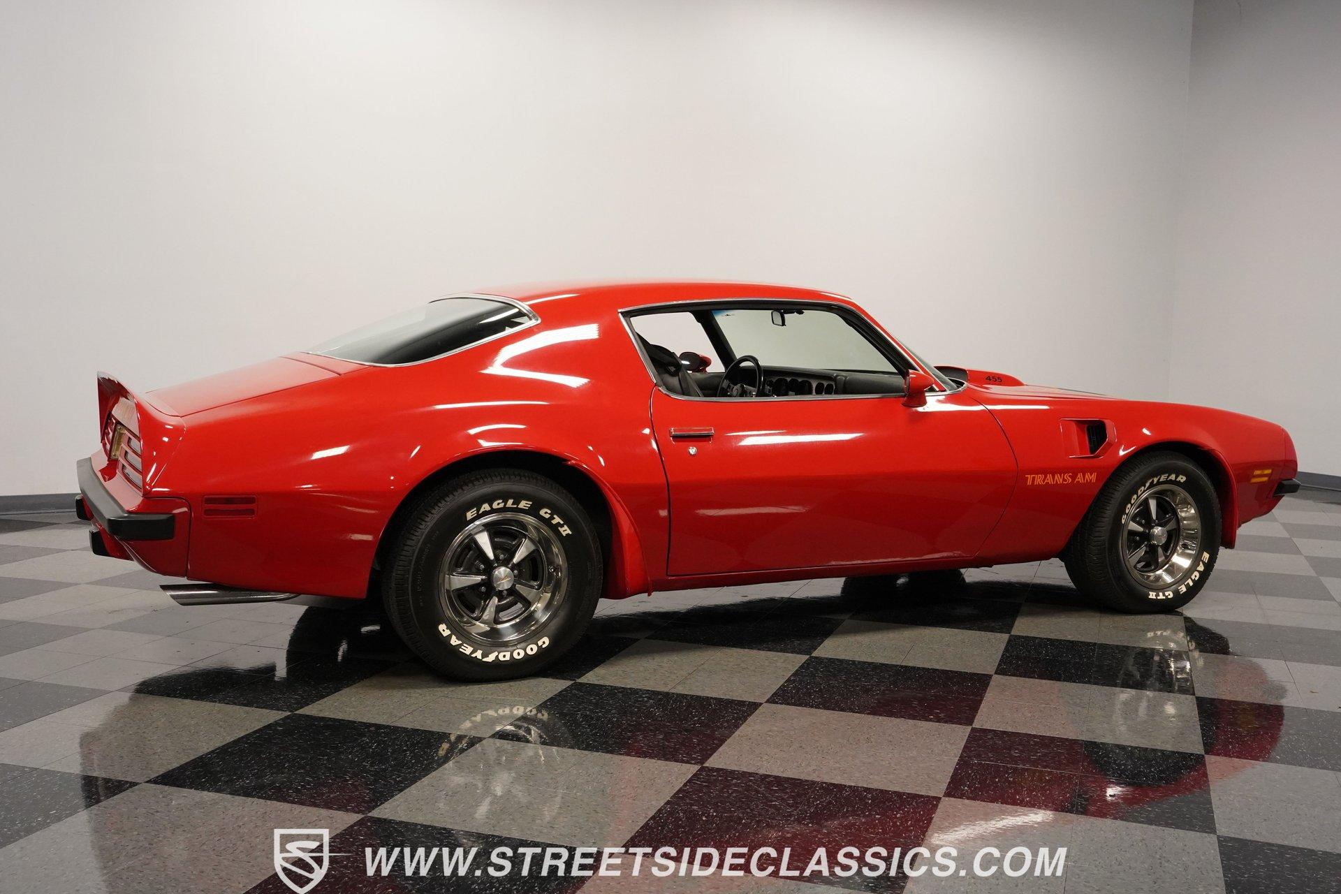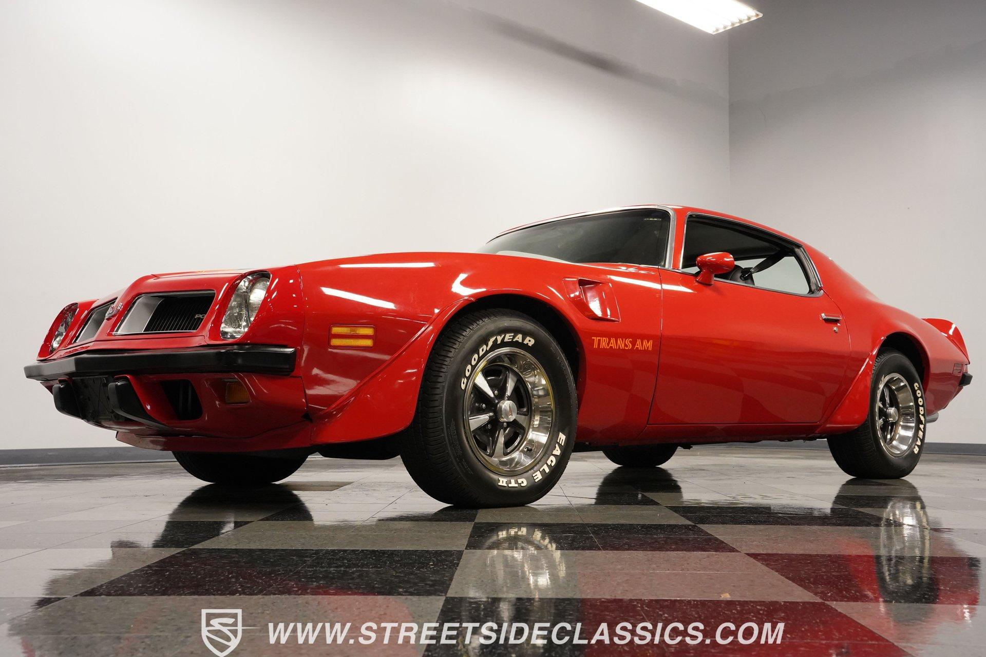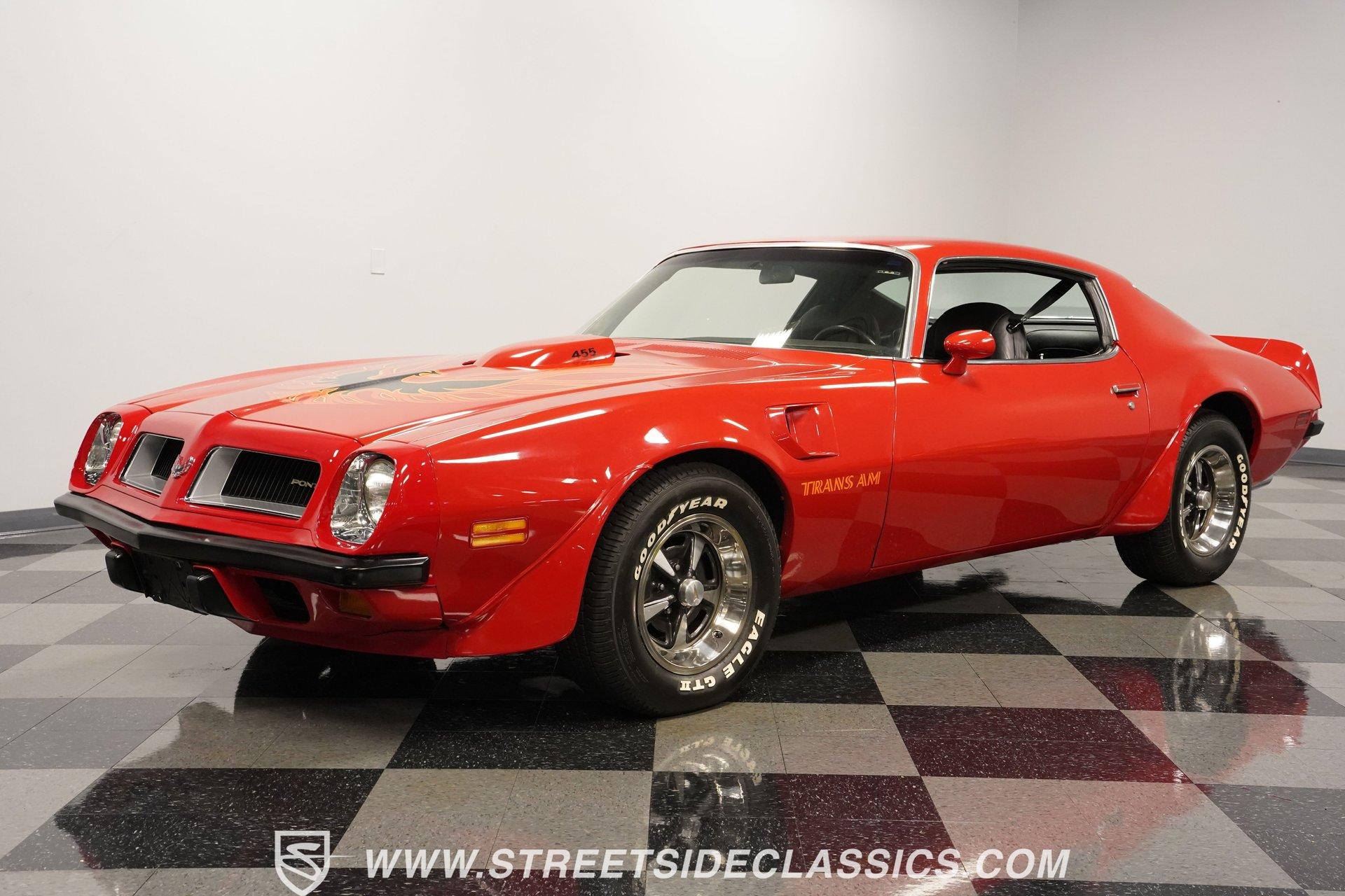 This 1974 Trans Am 455 is all about attitude. The Shaker hood scoop pairs perfectly with the famous Firebird decal, and the Buccaneer Red paint job just screams, "Look At Me." It's a sports car worth cruising to any car show or car cruise. The rear spoiler and wheel fender flares match up great with the fender air scoops and aggressive tailpipes. With the 455 emblems, this Trans Am looks like a menace on the road to anyone who rolls up on it. The interior of this Trans Am is in pretty good shape. Mostly blacked out with black leather bucket seats and a floor shifter, you truly feel like you're in a bad-to-the-bone sports car. And although it's a sports car, there is plenty of storage room between the door panel compartments, center console, glove box, and trunk. The back seats look well-maintained and offer enough space for an average-sized person. The gauge cluster surround is polished aluminum, while the gauges themselves are believed to be stock original. Under the hood sits the original 455 cubic-inch V8 big-block. It's paired with a TH400 3-speed automatic transmission, a powerful combination in a car like this Trans Am. Out back, a 10-bolt rear axle is responsible for turning the wheels, while rear leaf springs and shocks smooth out the ride. Up front, coil springs, shocks, and a sway bar keep cornering as tight as possible. Front power disc brakes and rear power drum brakes deliver consistent stopping power, while the P255/60R15 tires wrapped around stock-appearing wheels contribute to both ride quality and period-correct looks. And for the finishing touch, dual exhaust with aftermarket mufflers gives this Trans Am its classic sports car sound. Highlights: One Owning For The Last 9 Years Original 455 V8 With Single 4-Barrel TH400 3-Speed Automatic Transmission Classic Shaker Hood Big Firebird Decal On The Hood Rear Spoiler, Wheel Spoiler, Fender Air Scoops Dual Exhaust With Aftermarket Mufflers Front Power Disc Brakes Stock appearing 15-Inch Rims Black Leather Seating If you've ever dreamt about owning a classic sports car but haven't pulled the trigger yet, here's your chance. This 1974 Pontiac Firebird Trans Am 455 has the iconic look loved by just about every car enthusiast. The color is undeniable, the Firebird decal on the hood is legendary, and the Shaker hood concept has been around for decades for a reason: it's awesome. To get your sports car vibe on, call today!