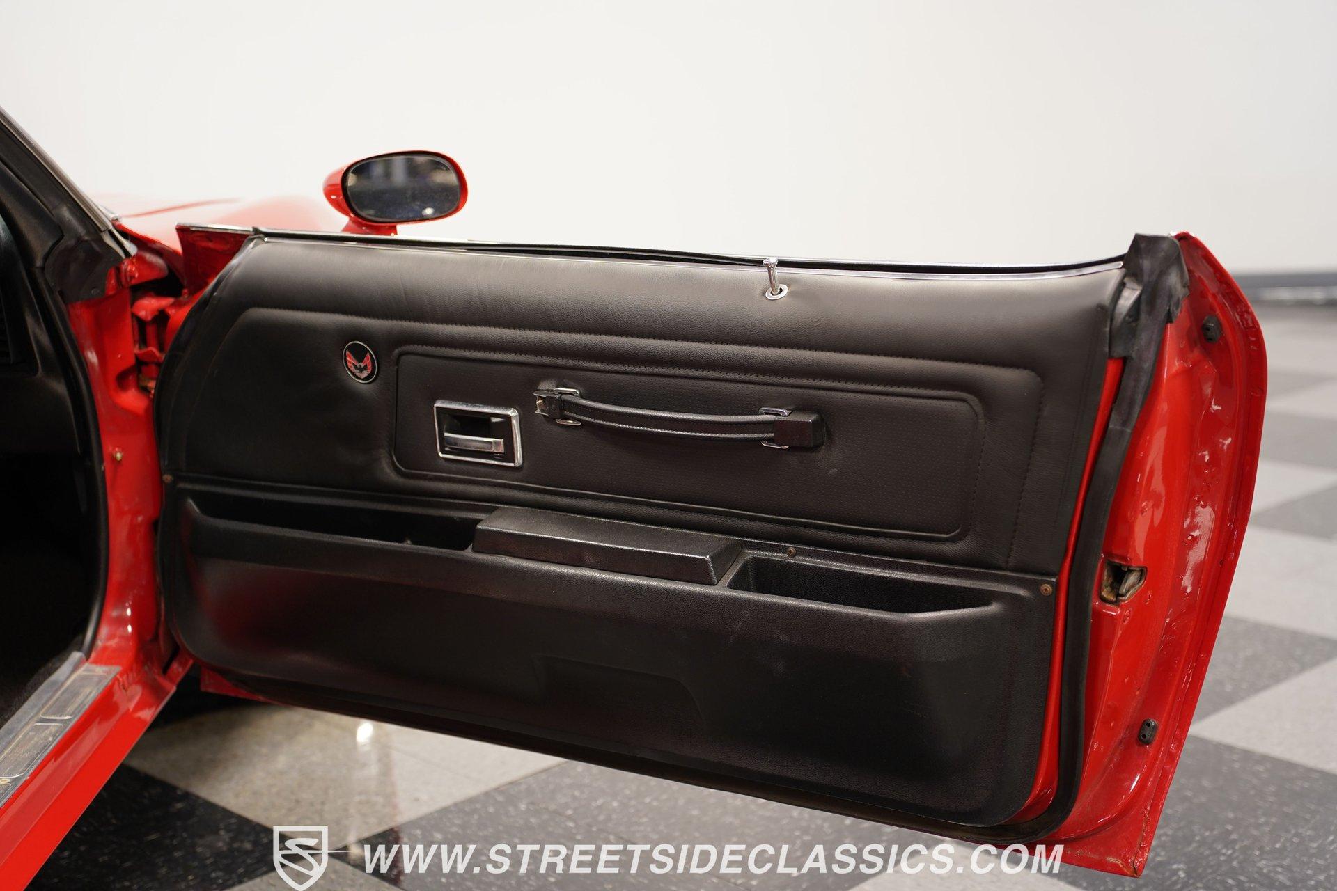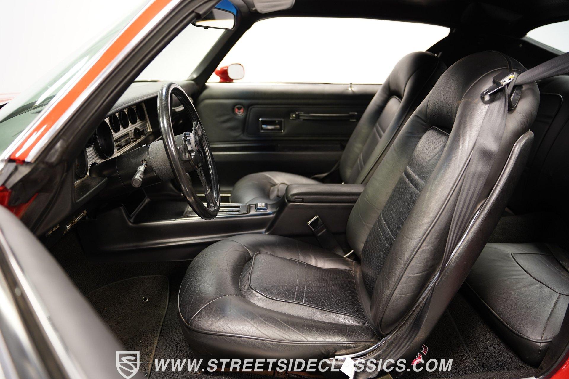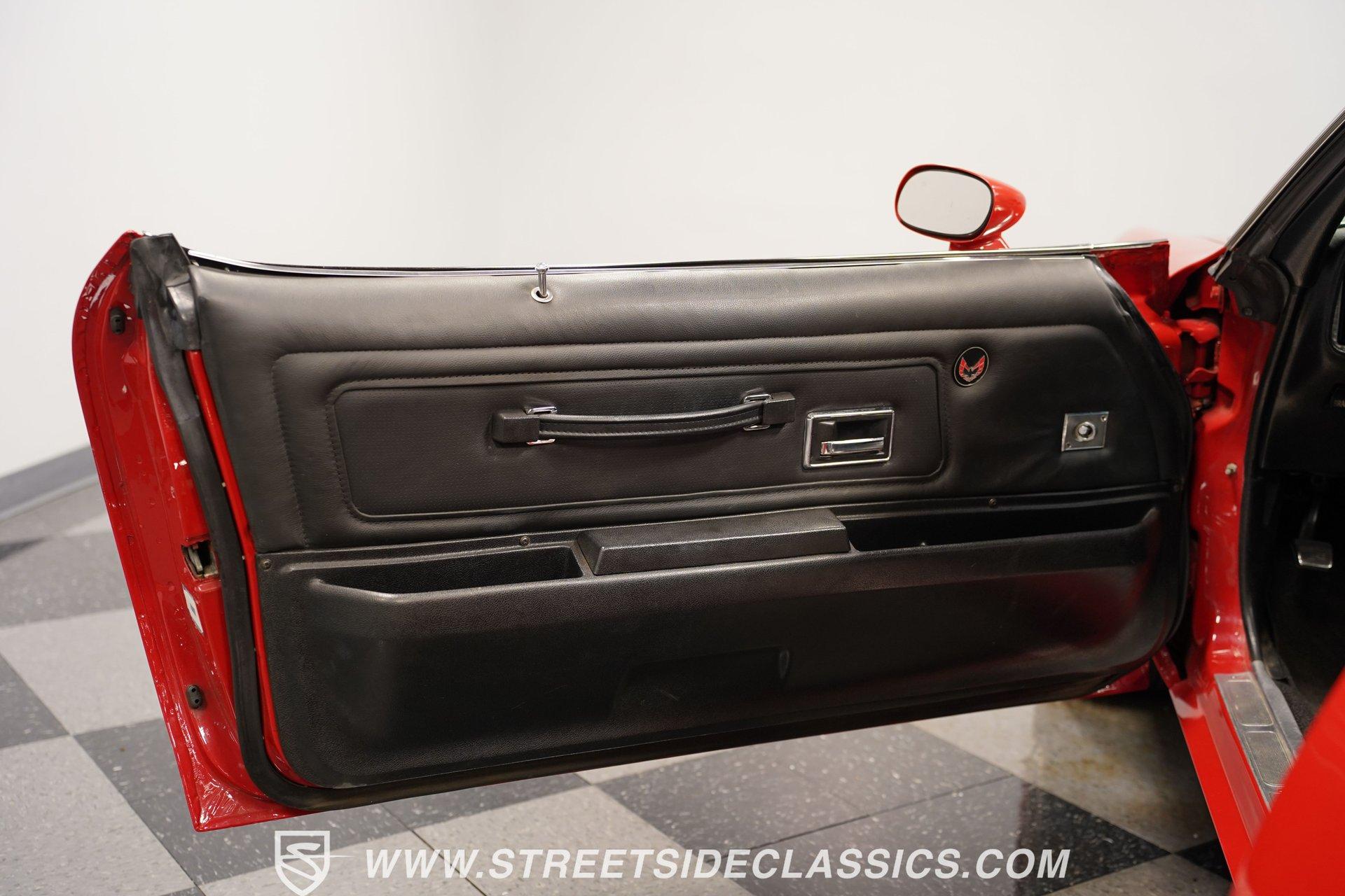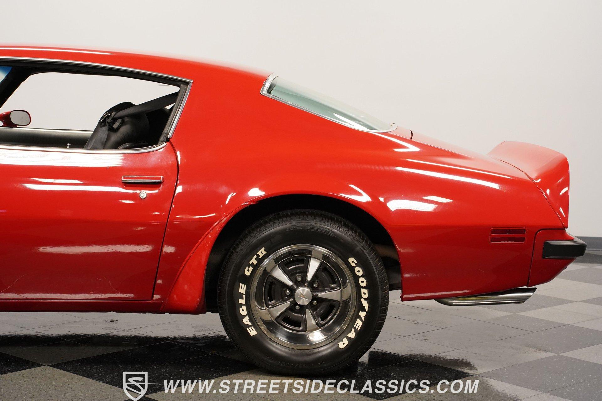 This 1974 Trans Am 455 is all about attitude. The Shaker hood scoop pairs perfectly with the famous Firebird decal, and the Buccaneer Red paint job just screams, "Look At Me." It's a sports car worth cruising to any car show or car cruise. The rear spoiler and wheel fender flares match up great with the fender air scoops and aggressive tailpipes. With the 455 emblems, this Trans Am looks like a menace on the road to anyone who rolls up on it. The interior of this Trans Am is in pretty good shape. Mostly blacked out with black leather bucket seats and a floor shifter, you truly feel like you're in a bad-to-the-bone sports car. And although it's a sports car, there is plenty of storage room between the door panel compartments, center console, glove box, and trunk. The back seats look well-maintained and offer enough space for an average-sized person. The gauge cluster surround is polished aluminum, while the gauges themselves are believed to be stock original. Under the hood sits the original 455 cubic-inch V8 big-block. It's paired with a TH400 3-speed automatic transmission, a powerful combination in a car like this Trans Am. Out back, a 10-bolt rear axle is responsible for turning the wheels, while rear leaf springs and shocks smooth out the ride. Up front, coil springs, shocks, and a sway bar keep cornering as tight as possible. Front power disc brakes and rear power drum brakes deliver consistent stopping power, while the P255/60R15 tires wrapped around stock-appearing wheels contribute to both ride quality and period-correct looks. And for the finishing touch, dual exhaust with aftermarket mufflers gives this Trans Am its classic sports car sound. Highlights: One Owning For The Last 9 Years Original 455 V8 With Single 4-Barrel TH400 3-Speed Automatic Transmission Classic Shaker Hood Big Firebird Decal On The Hood Rear Spoiler, Wheel Spoiler, Fender Air Scoops Dual Exhaust With Aftermarket Mufflers Front Power Disc Brakes Stock appearing 15-Inch Rims Black Leather Seating If you've ever dreamt about owning a classic sports car but haven't pulled the trigger yet, here's your chance. This 1974 Pontiac Firebird Trans Am 455 has the iconic look loved by just about every car enthusiast. The color is undeniable, the Firebird decal on the hood is legendary, and the Shaker hood concept has been around for decades for a reason: it's awesome. To get your sports car vibe on, call today!