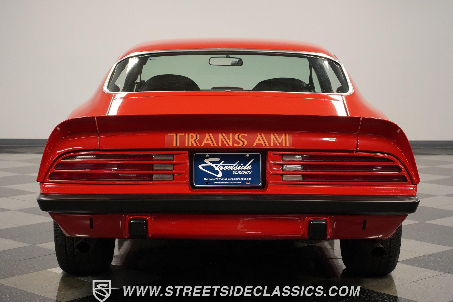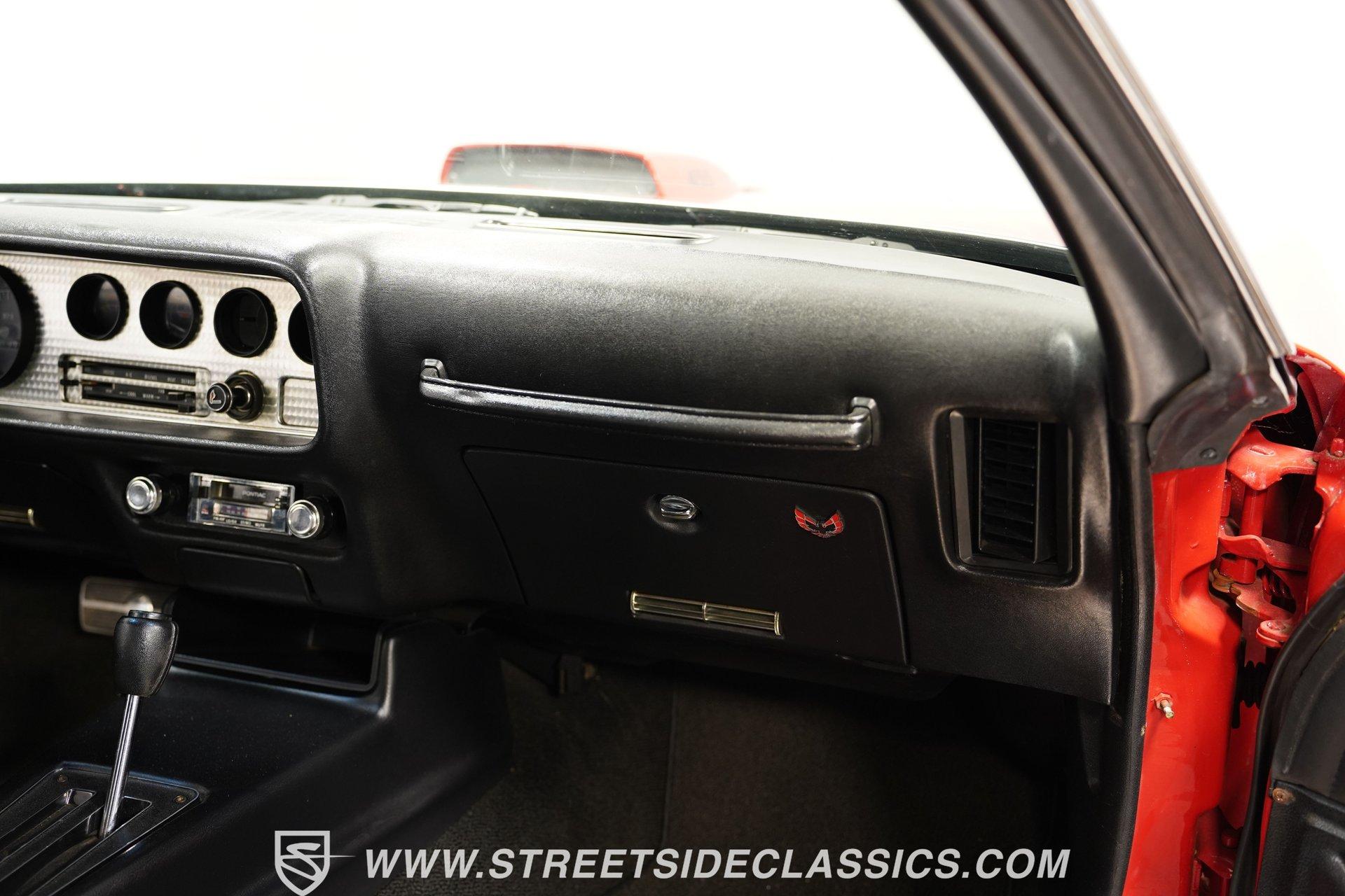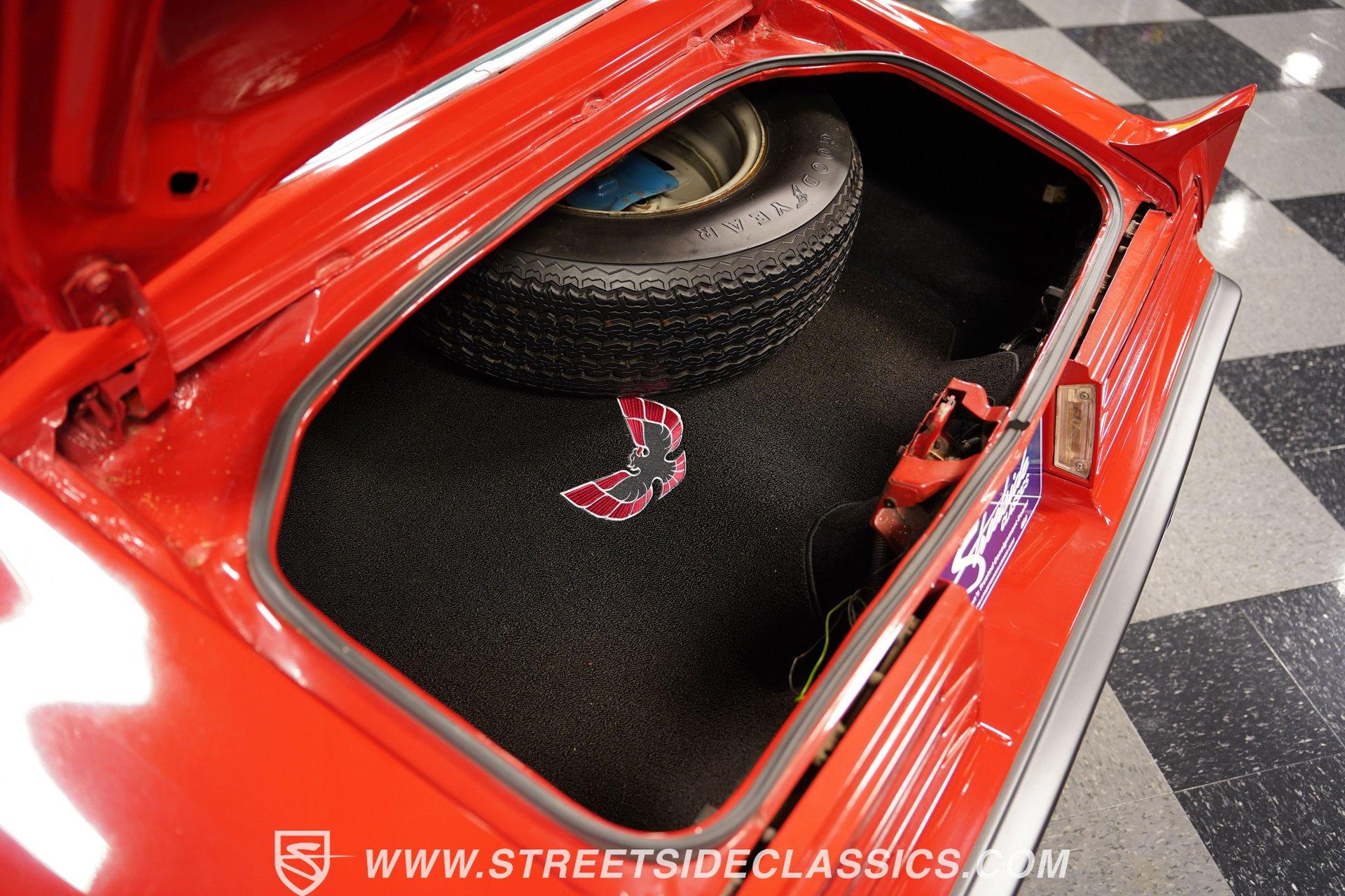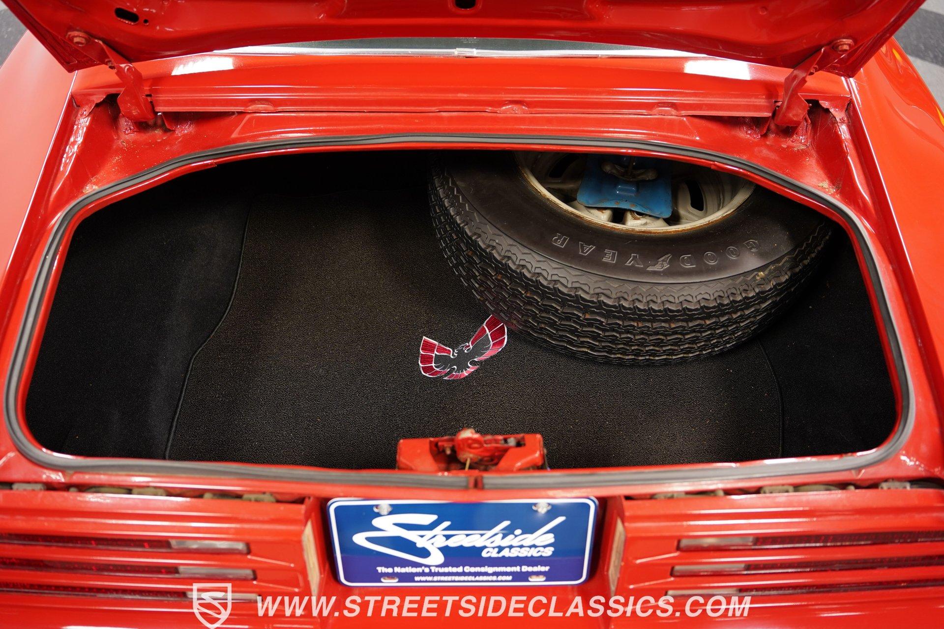 This 1974 Trans Am 455 is all about attitude. The Shaker hood scoop pairs perfectly with the famous Firebird decal, and the Buccaneer Red paint job just screams, "Look At Me." It's a sports car worth cruising to any car show or car cruise. The rear spoiler and wheel fender flares match up great with the fender air scoops and aggressive tailpipes. With the 455 emblems, this Trans Am looks like a menace on the road to anyone who rolls up on it. The interior of this Trans Am is in pretty good shape. Mostly blacked out with black leather bucket seats and a floor shifter, you truly feel like you're in a bad-to-the-bone sports car. And although it's a sports car, there is plenty of storage room between the door panel compartments, center console, glove box, and trunk. The back seats look well-maintained and offer enough space for an average-sized person. The gauge cluster surround is polished aluminum, while the gauges themselves are believed to be stock original. Under the hood sits the original 455 cubic-inch V8 big-block. It's paired with a TH400 3-speed automatic transmission, a powerful combination in a car like this Trans Am. Out back, a 10-bolt rear axle is responsible for turning the wheels, while rear leaf springs and shocks smooth out the ride. Up front, coil springs, shocks, and a sway bar keep cornering as tight as possible. Front power disc brakes and rear power drum brakes deliver consistent stopping power, while the P255/60R15 tires wrapped around stock-appearing wheels contribute to both ride quality and period-correct looks. And for the finishing touch, dual exhaust with aftermarket mufflers gives this Trans Am its classic sports car sound. Highlights: One Owning For The Last 9 Years Original 455 V8 With Single 4-Barrel TH400 3-Speed Automatic Transmission Classic Shaker Hood Big Firebird Decal On The Hood Rear Spoiler, Wheel Spoiler, Fender Air Scoops Dual Exhaust With Aftermarket Mufflers Front Power Disc Brakes Stock appearing 15-Inch Rims Black Leather Seating If you've ever dreamt about owning a classic sports car but haven't pulled the trigger yet, here's your chance. This 1974 Pontiac Firebird Trans Am 455 has the iconic look loved by just about every car enthusiast. The color is undeniable, the Firebird decal on the hood is legendary, and the Shaker hood concept has been around for decades for a reason: it's awesome. To get your sports car vibe on, call today!