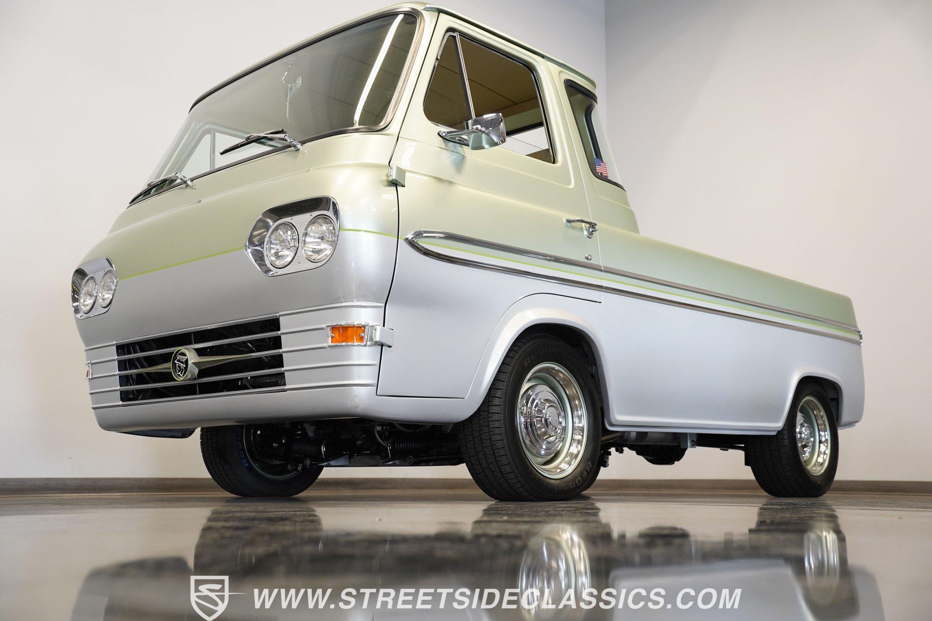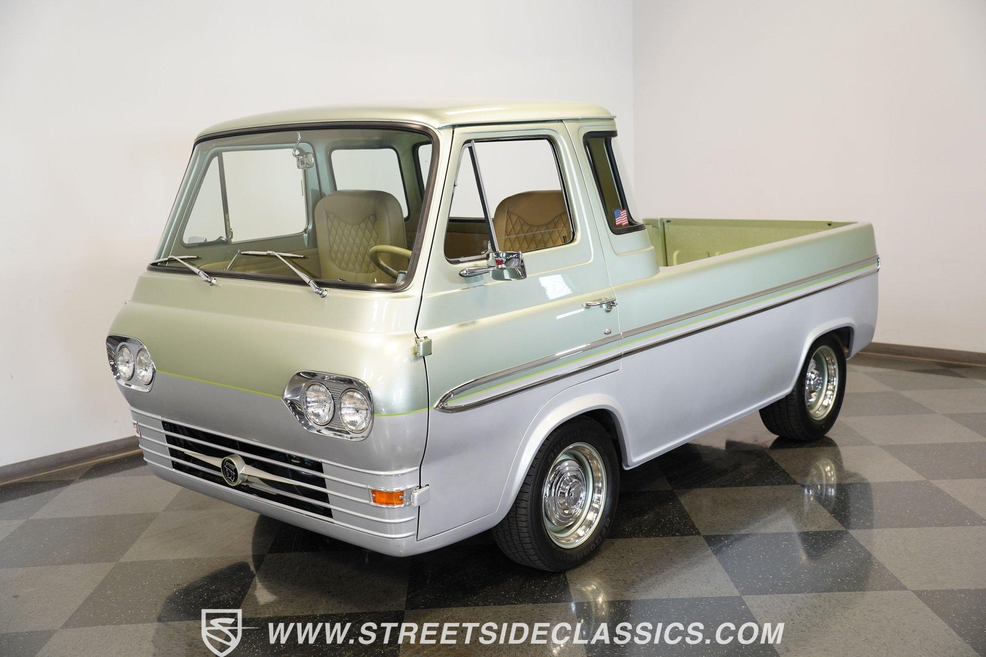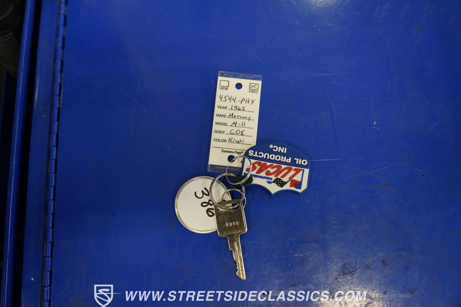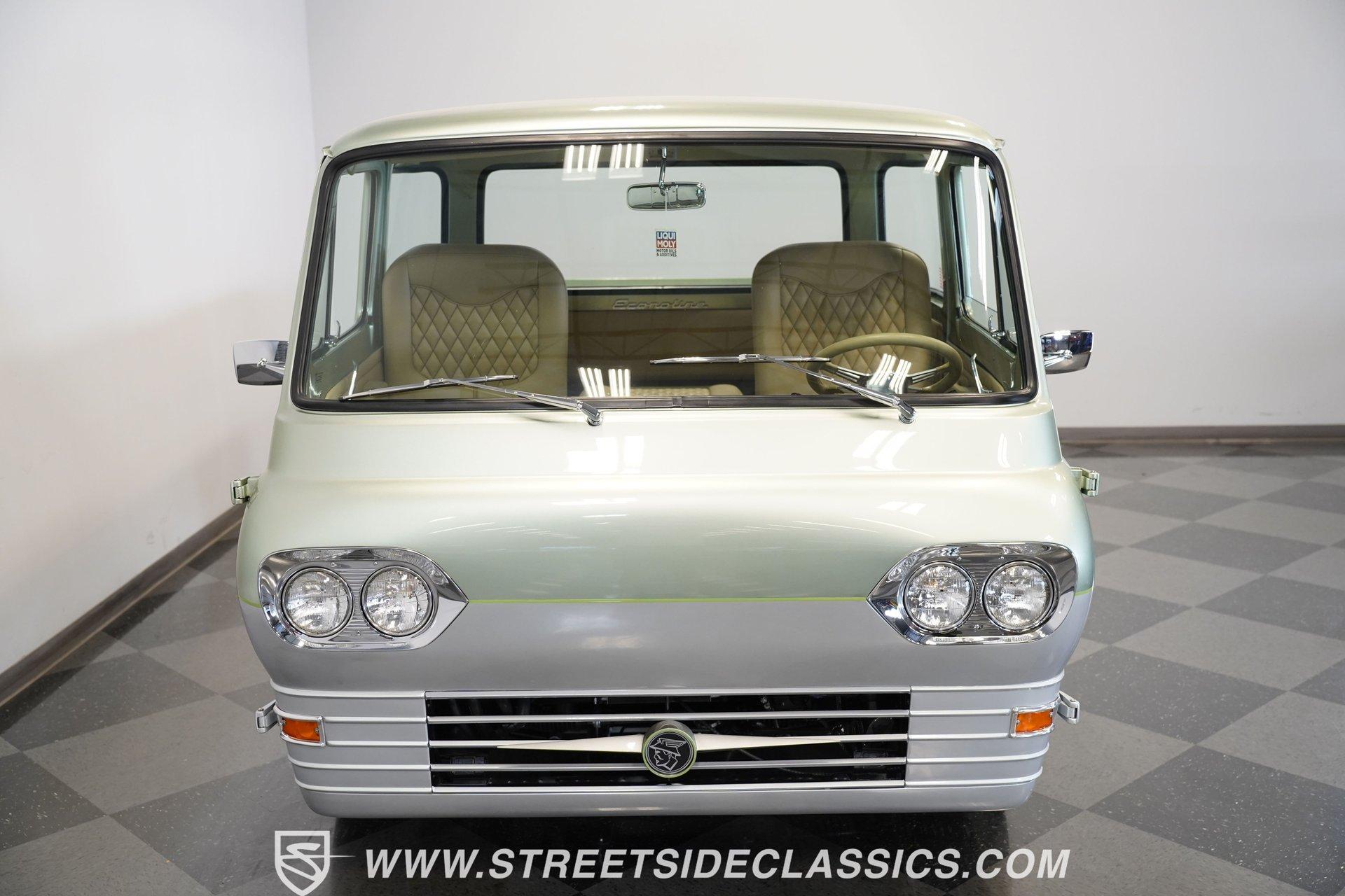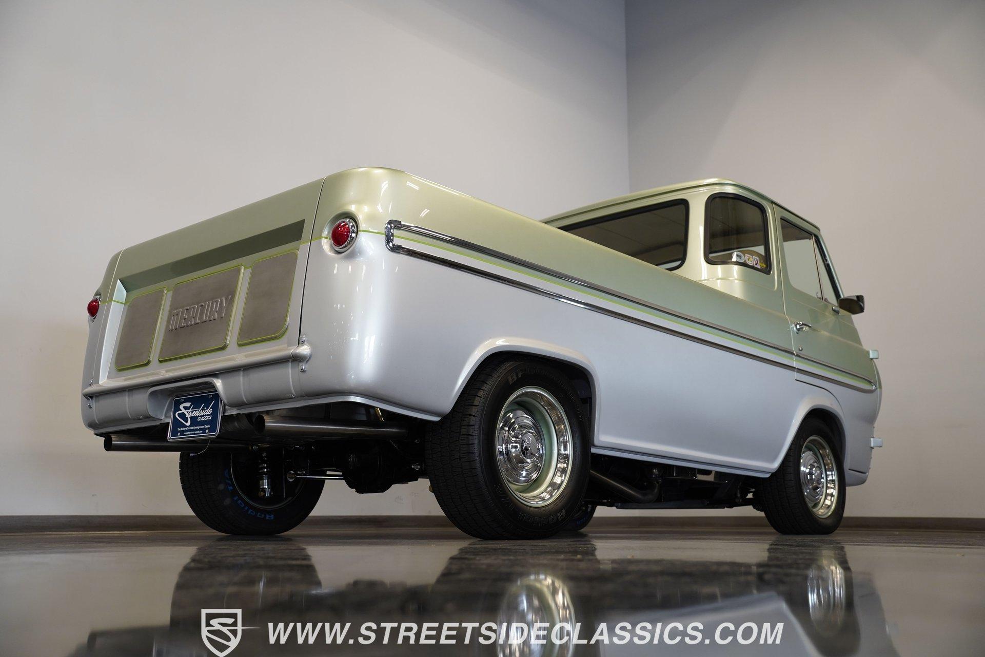 Here is a really different, yet cool-looking truck. These trucks were originally built for Canada, but this one resides here in the U.S. It's a fully restored 1965 Mercury M-1 Five-Window Econoline custom pickup truck with a short bed. The exterior top-half color is Kiwi Green Metallic, and the bottom-half is silver, with both colors separated by a painted green pinstripe. The wheels match the Kiwi Green color, with chrome-plated center pieces and outer beauty rings. The rear-end view finishes out well, as does the inside of the truck bed. The interior looks just as good as the exterior. Using Kiwi Green and tan colors with bright green pinstriping gives this cabin a fun and free look. Leather seats with dark brown diamond-stitched inlays add character. The center armrest is big enough for both passenger elbows, and the matching-colored door cards are in great shape. The steering column features tilt for the custom steering wheel and also hosts the gear select. The gold dashboard gauges look very retro and perfectly themed to the rest of the interior. In the center console, you'll find the heat, defrost, and air conditioning controls, cupholders, and a Pioneer head unit with AM/FM/CD/Aux and Bluetooth. Between the seats and under the armrest sits an insulated 302 cubic-inch V8 crate motor. An Edelbrock 4-barrel AVS2 Series carburetor feeds this engine plenty of fuel. Power is delivered to a 4-speed Ford Mustang automatic overdrive transmission, which then connects to a 2000 Ford Explorer 4x4 rear differential. Suspension duties are handled by an independent front suspension, with control arms, coilovers, a sway bar, and rack-and-pinion steering. The rear suspension uses factory trailing arms, coil springs, and air shocks. Stopping power comes from front and rear power disc brakes, and in front of those brakes are 15-inch color-matched steel wheels with center caps and beauty rings. BFG Radial T/A front 215/60R15 and 245/60R15 rear tires wrap those wheels for a great stance and solid traction. Highlights: Ford Mustang 5.0 Liter (302 Cubic-Inch) Crate Motor Edelbrock AVS2 4-Barrel Carburetor Ford Mustang 4-Speed Automatic Transmission W/Overdrive Shorty Headers, Dual Exhaust, And FlowMaster Mufflers Independent Front Suspension With Control Arms, Coilovers, And A Sway Bar Rack And Pinion Steering Rear Factory Trailing Arms, Coil Springs, And Air Shocks 15-Inch Color-Matched Steel Wheels With Center Caps, And Beauty Rings BFG Radial T/A Front 215/60R15 And 245/60R15 Rear Tires Front And Rear Power Disc Brakes Custom Gold Gauges Heat And Air Conditioning Custom Steering Wheel With Tilt Pioneer AM/FM/CD/Aux With Bluetooth This vehicle is a standout due to its uniqueness. Not many 1965 Mercury M-1 Five-Window Econoline trucks roam the streets any longer, so if you dare to be different, Call Today!