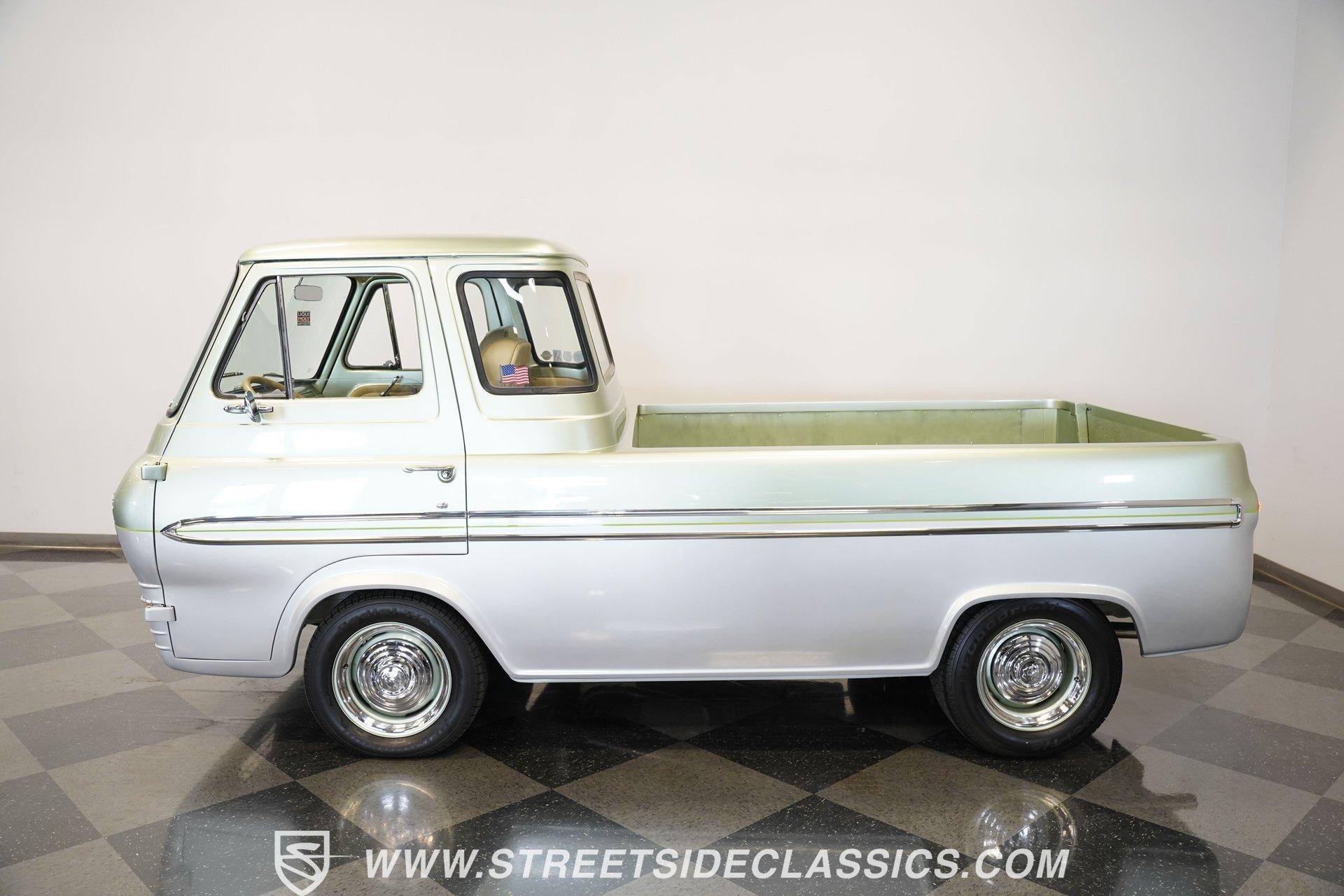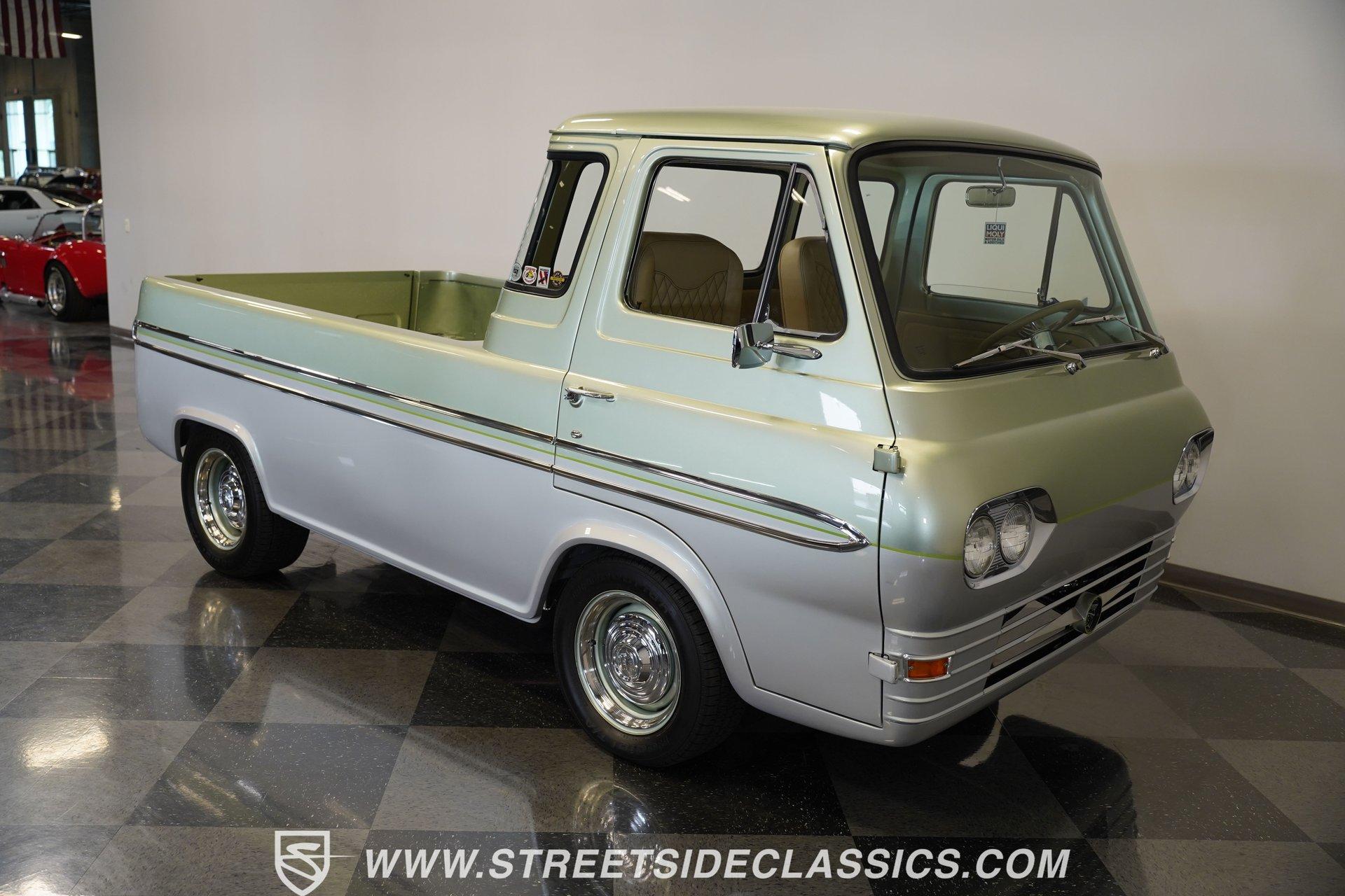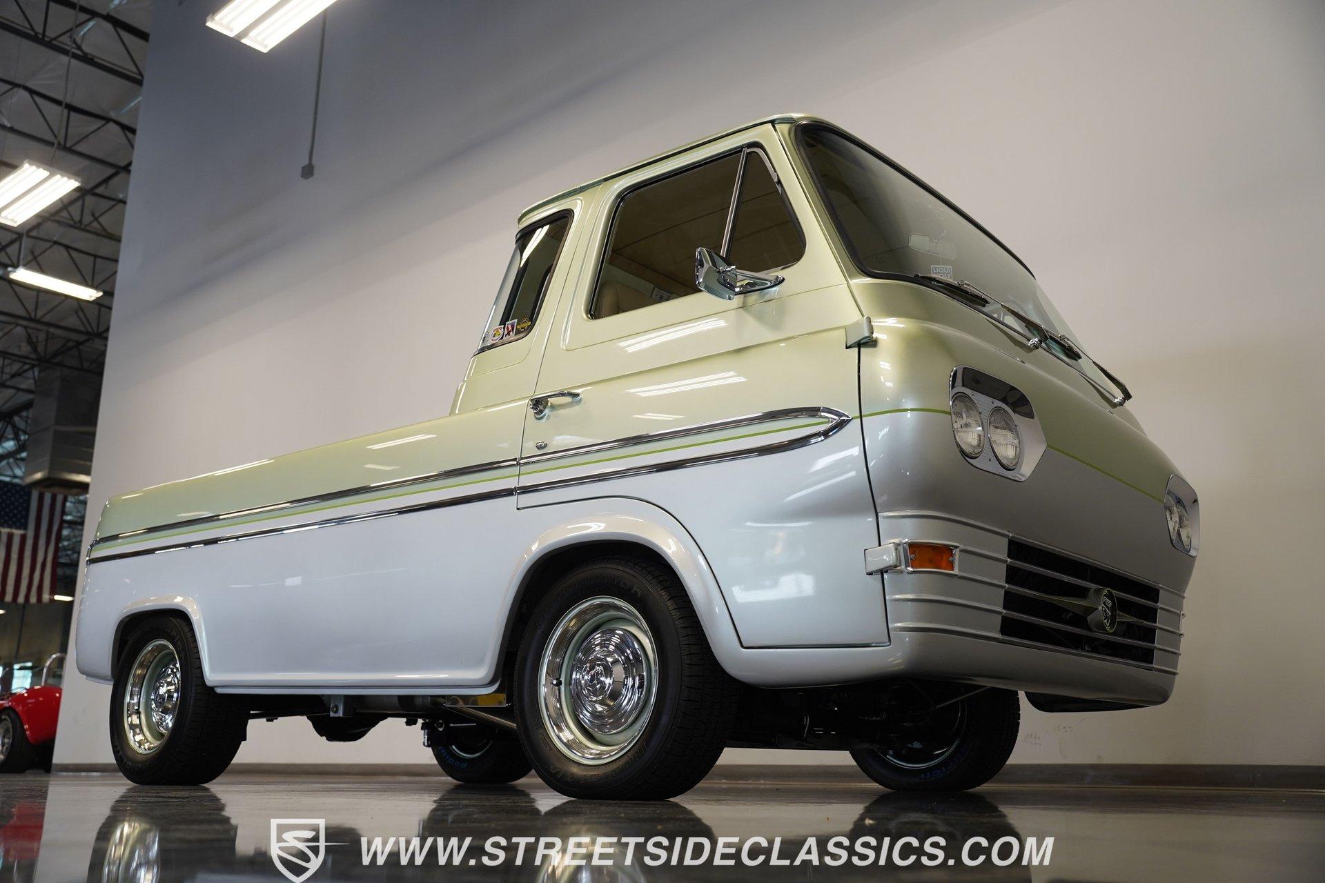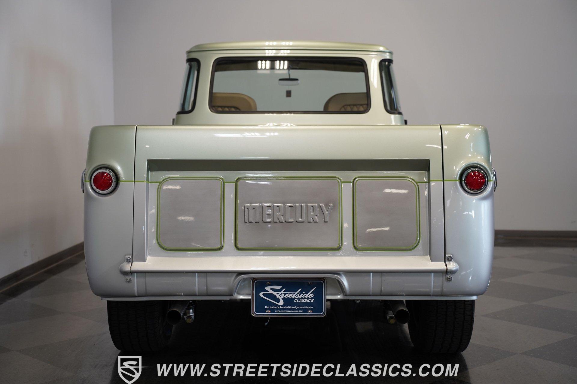 Here is a really different, yet cool-looking truck. These trucks were originally built for Canada, but this one resides here in the U.S. It's a fully restored 1965 Mercury M-1 Five-Window Econoline custom pickup truck with a short bed. The exterior top-half color is Kiwi Green Metallic, and the bottom-half is silver, with both colors separated by a painted green pinstripe. The wheels match the Kiwi Green color, with chrome-plated center pieces and outer beauty rings. The rear-end view finishes out well, as does the inside of the truck bed. The interior looks just as good as the exterior. Using Kiwi Green and tan colors with bright green pinstriping gives this cabin a fun and free look. Leather seats with dark brown diamond-stitched inlays add character. The center armrest is big enough for both passenger elbows, and the matching-colored door cards are in great shape. The steering column features tilt for the custom steering wheel and also hosts the gear select. The gold dashboard gauges look very retro and perfectly themed to the rest of the interior. In the center console, you'll find the heat, defrost, and air conditioning controls, cupholders, and a Pioneer head unit with AM/FM/CD/Aux and Bluetooth. Between the seats and under the armrest sits an insulated 302 cubic-inch V8 crate motor. An Edelbrock 4-barrel AVS2 Series carburetor feeds this engine plenty of fuel. Power is delivered to a 4-speed Ford Mustang automatic overdrive transmission, which then connects to a 2000 Ford Explorer 4x4 rear differential. Suspension duties are handled by an independent front suspension, with control arms, coilovers, a sway bar, and rack-and-pinion steering. The rear suspension uses factory trailing arms, coil springs, and air shocks. Stopping power comes from front and rear power disc brakes, and in front of those brakes are 15-inch color-matched steel wheels with center caps and beauty rings. BFG Radial T/A front 215/60R15 and 245/60R15 rear tires wrap those wheels for a great stance and solid traction. Highlights: Ford Mustang 5.0 Liter (302 Cubic-Inch) Crate Motor Edelbrock AVS2 4-Barrel Carburetor Ford Mustang 4-Speed Automatic Transmission W/Overdrive Shorty Headers, Dual Exhaust, And FlowMaster Mufflers Independent Front Suspension With Control Arms, Coilovers, And A Sway Bar Rack And Pinion Steering Rear Factory Trailing Arms, Coil Springs, And Air Shocks 15-Inch Color-Matched Steel Wheels With Center Caps, And Beauty Rings BFG Radial T/A Front 215/60R15 And 245/60R15 Rear Tires Front And Rear Power Disc Brakes Custom Gold Gauges Heat And Air Conditioning Custom Steering Wheel With Tilt Pioneer AM/FM/CD/Aux With Bluetooth This vehicle is a standout due to its uniqueness. Not many 1965 Mercury M-1 Five-Window Econoline trucks roam the streets any longer, so if you dare to be different, Call Today!