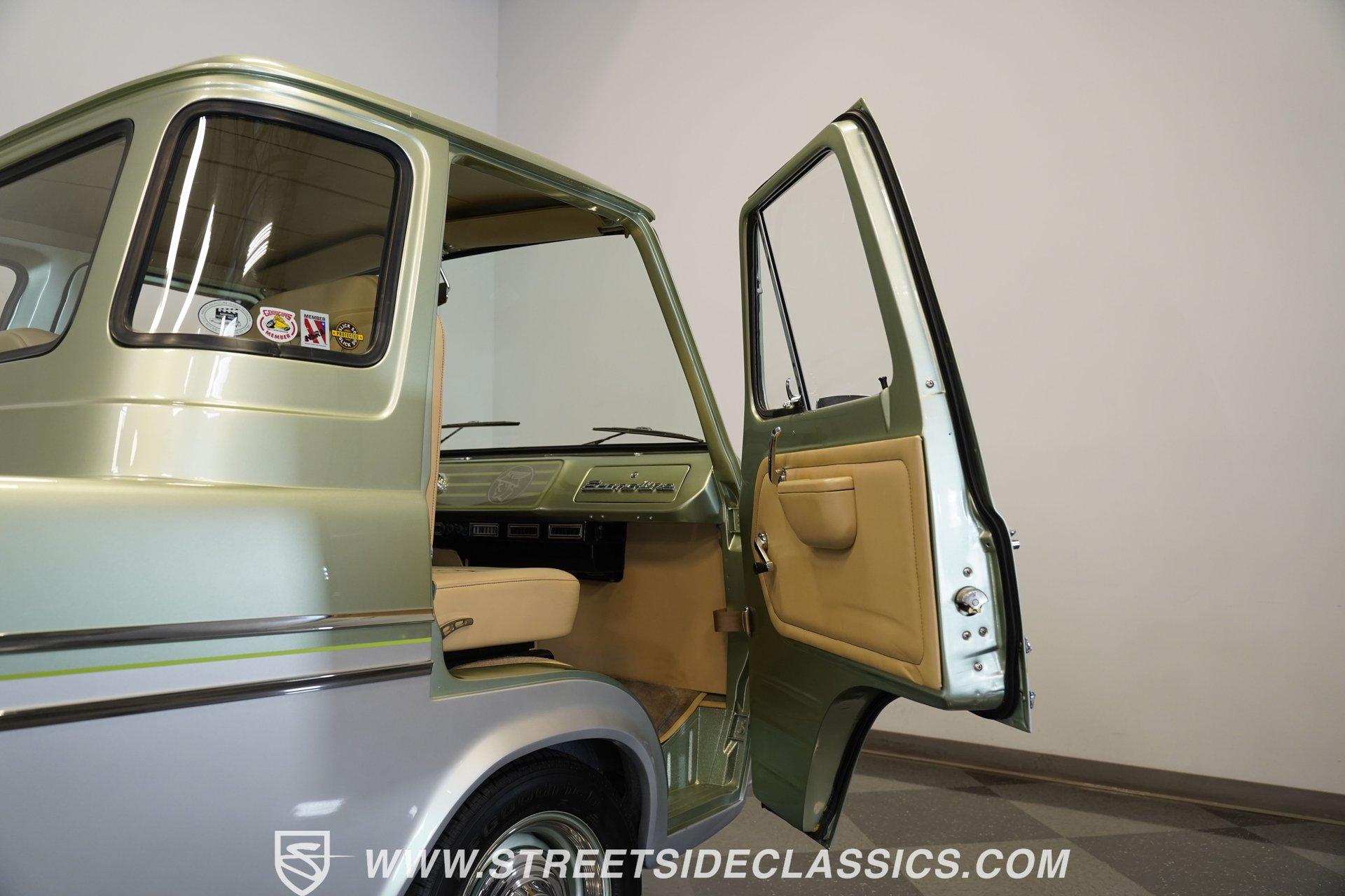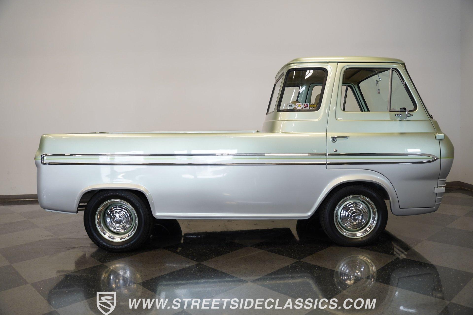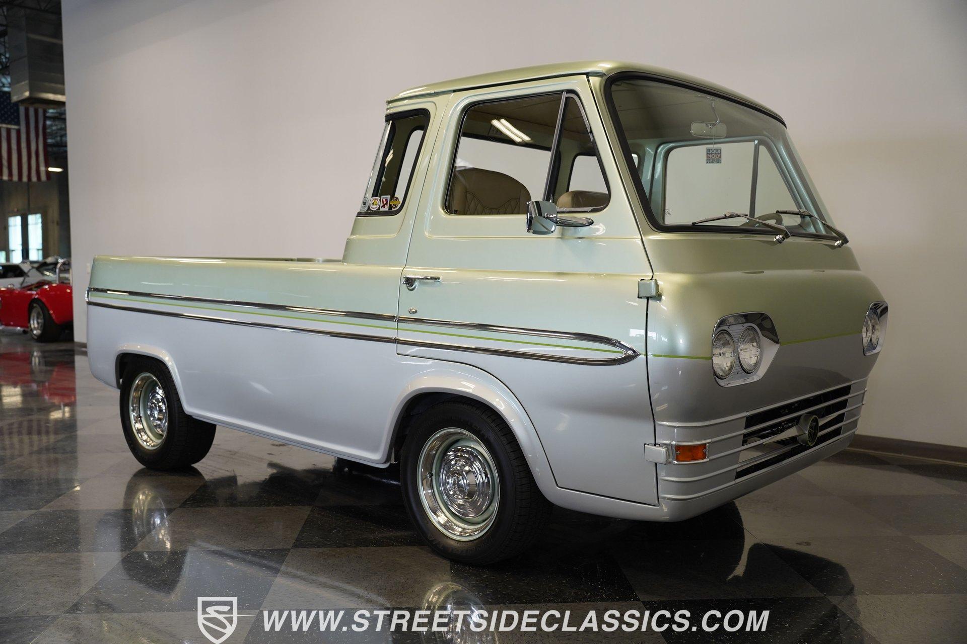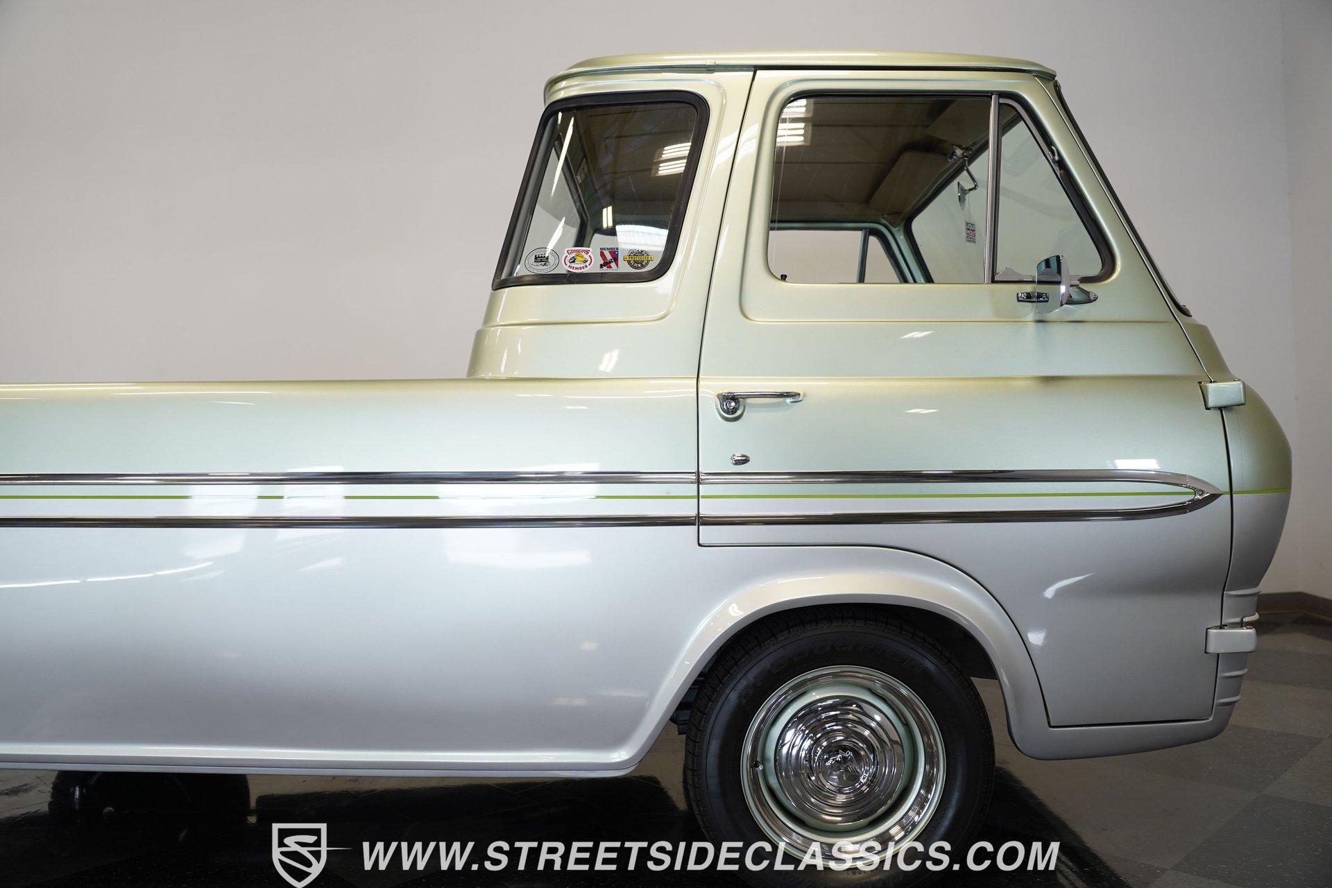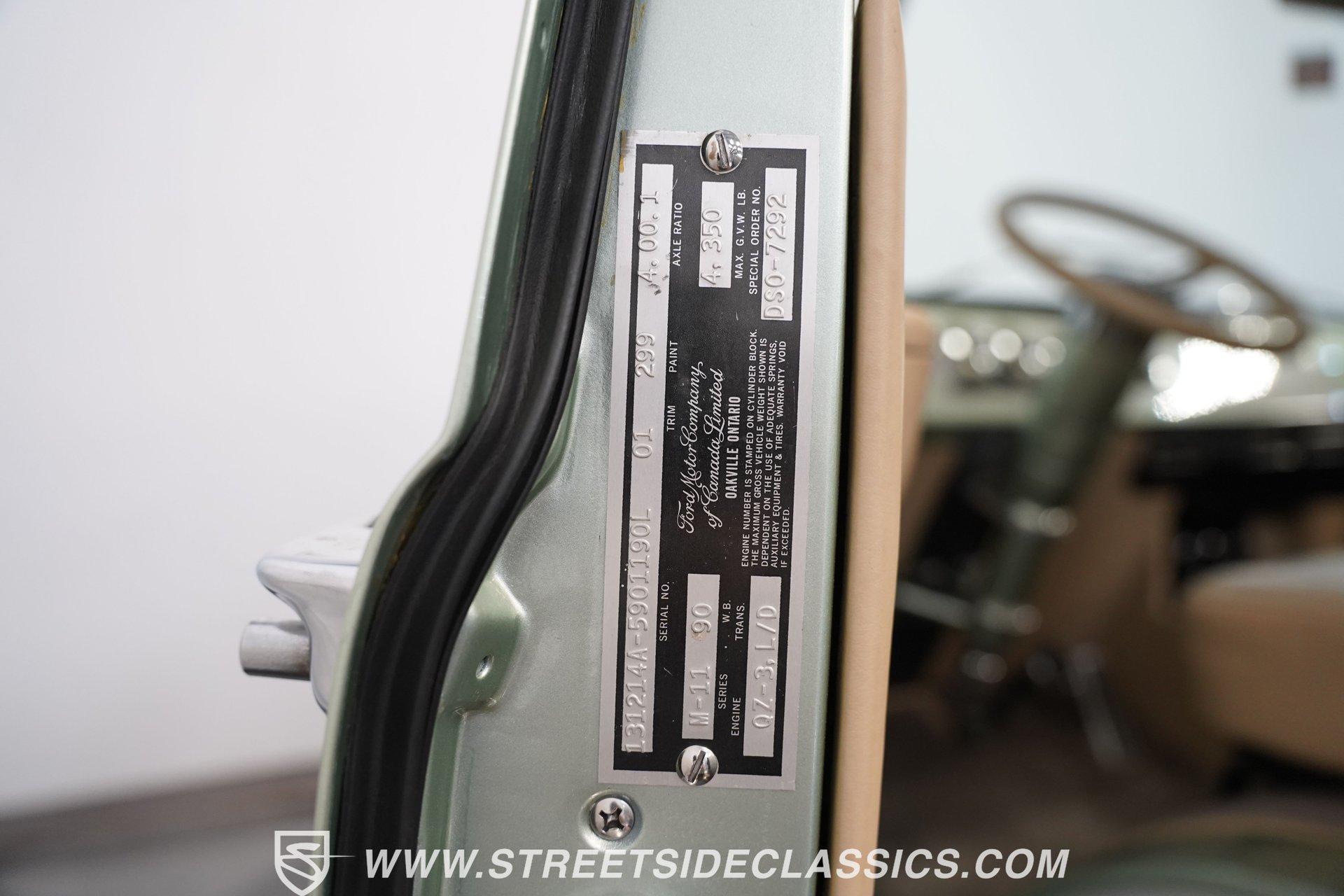 Here is a really different, yet cool-looking truck. These trucks were originally built for Canada, but this one resides here in the U.S. It's a fully restored 1965 Mercury M-1 Five-Window Econoline custom pickup truck with a short bed. The exterior top-half color is Kiwi Green Metallic, and the bottom-half is silver, with both colors separated by a painted green pinstripe. The wheels match the Kiwi Green color, with chrome-plated center pieces and outer beauty rings. The rear-end view finishes out well, as does the inside of the truck bed. The interior looks just as good as the exterior. Using Kiwi Green and tan colors with bright green pinstriping gives this cabin a fun and free look. Leather seats with dark brown diamond-stitched inlays add character. The center armrest is big enough for both passenger elbows, and the matching-colored door cards are in great shape. The steering column features tilt for the custom steering wheel and also hosts the gear select. The gold dashboard gauges look very retro and perfectly themed to the rest of the interior. In the center console, you'll find the heat, defrost, and air conditioning controls, cupholders, and a Pioneer head unit with AM/FM/CD/Aux and Bluetooth. Between the seats and under the armrest sits an insulated 302 cubic-inch V8 crate motor. An Edelbrock 4-barrel AVS2 Series carburetor feeds this engine plenty of fuel. Power is delivered to a 4-speed Ford Mustang automatic overdrive transmission, which then connects to a 2000 Ford Explorer 4x4 rear differential. Suspension duties are handled by an independent front suspension, with control arms, coilovers, a sway bar, and rack-and-pinion steering. The rear suspension uses factory trailing arms, coil springs, and air shocks. Stopping power comes from front and rear power disc brakes, and in front of those brakes are 15-inch color-matched steel wheels with center caps and beauty rings. BFG Radial T/A front 215/60R15 and 245/60R15 rear tires wrap those wheels for a great stance and solid traction. Highlights: Ford Mustang 5.0 Liter (302 Cubic-Inch) Crate Motor Edelbrock AVS2 4-Barrel Carburetor Ford Mustang 4-Speed Automatic Transmission W/Overdrive Shorty Headers, Dual Exhaust, And FlowMaster Mufflers Independent Front Suspension With Control Arms, Coilovers, And A Sway Bar Rack And Pinion Steering Rear Factory Trailing Arms, Coil Springs, And Air Shocks 15-Inch Color-Matched Steel Wheels With Center Caps, And Beauty Rings BFG Radial T/A Front 215/60R15 And 245/60R15 Rear Tires Front And Rear Power Disc Brakes Custom Gold Gauges Heat And Air Conditioning Custom Steering Wheel With Tilt Pioneer AM/FM/CD/Aux With Bluetooth This vehicle is a standout due to its uniqueness. Not many 1965 Mercury M-1 Five-Window Econoline trucks roam the streets any longer, so if you dare to be different, Call Today!