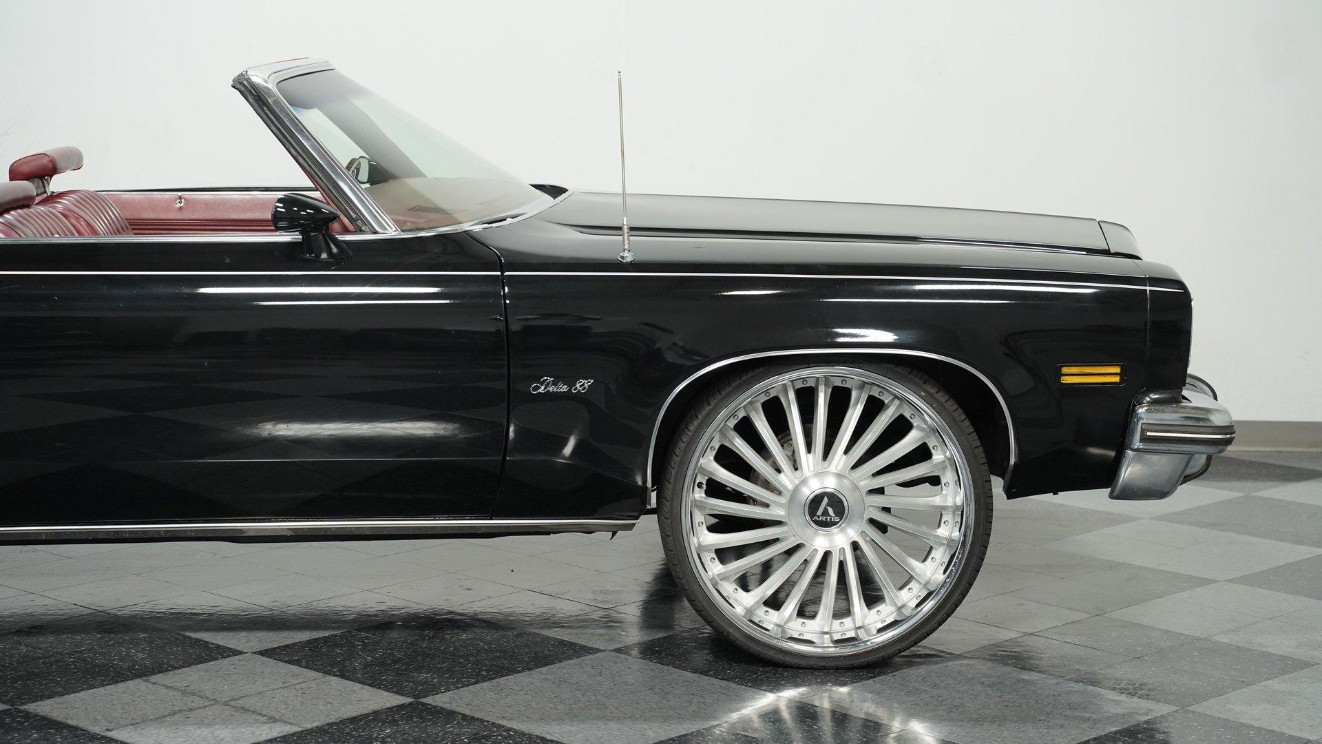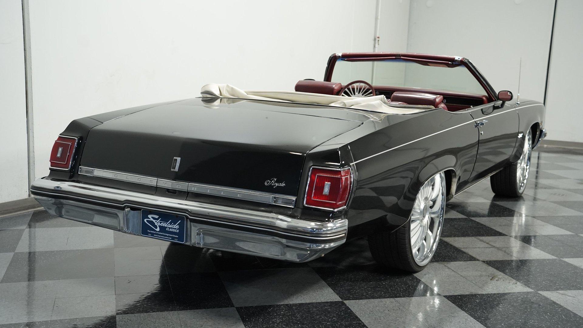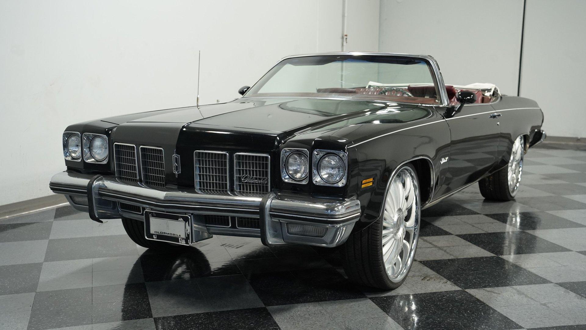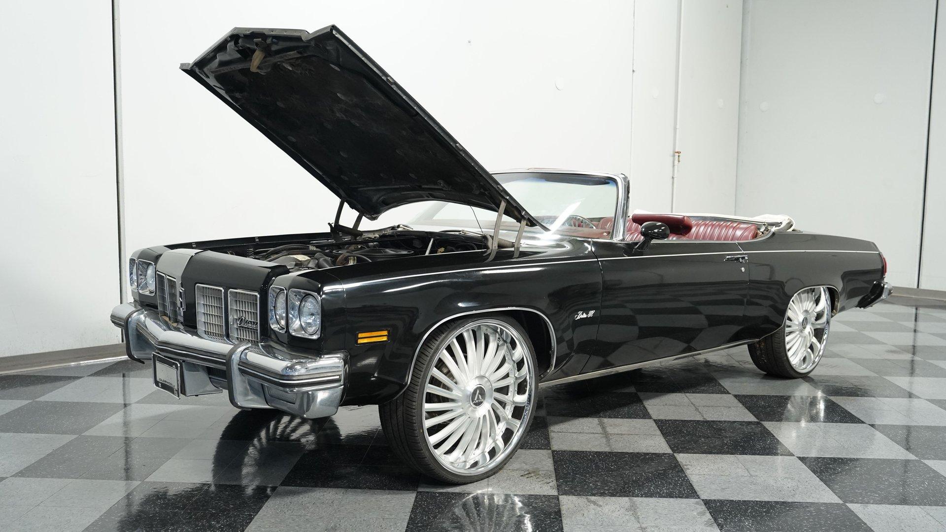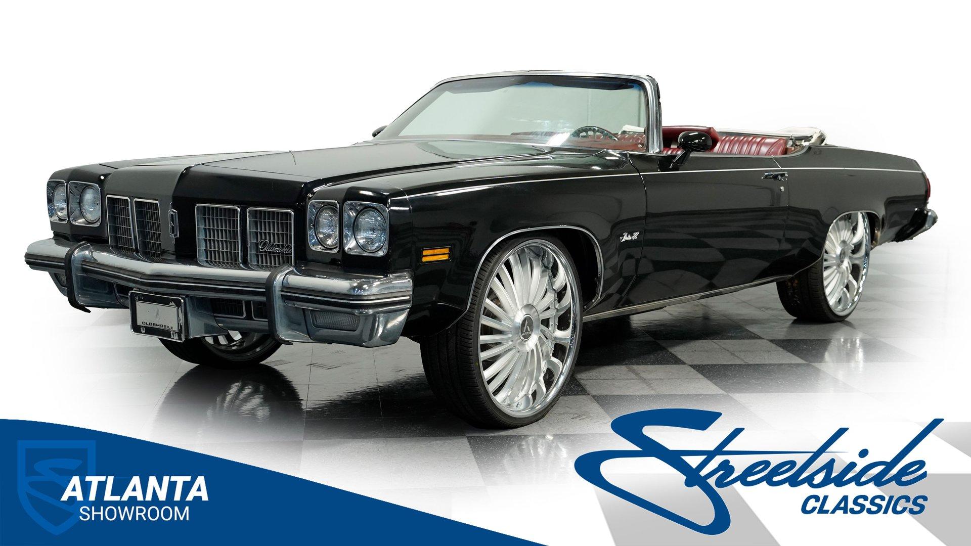 It's hard to beat the wind in your hair from behind the wheel of a full-sized American classic. The last drop-top Olds would produce for fifteen years (until the 1990 Cutlass Supreme), this 1975 Oldsmobile Delta 88 Royale Convertible represents the end of an era, and with its full Ebony Black repaint and complementing silver pinstripes, this car is as collectible as it is enjoyable. Inside, we find a captivating Dark Oxblood Red vinyl interior. A pair of plush bucket seats, each with a folding armrest, offers plenty of room for the front occupants, while a standard bench in the back doubles the available seating area. The custom Artis Forged wheel, created to tie it together with the same style wheels, stands as the center of attention. Beyond the wheel sits a horizontal 100 mph speedometer, fuel gauge, and drive indicator for the column-shifted transmission. To the left sits a set of simple toggle switches and sliding controls for HVAC activation. Under that expansive hood, we find a massive 455 cubic-inch V-8 engine. Topped with a single four-barrel carburetor, this big block typically made about 210 horsepower and 375 pound-feet of torque (both SAE net) when it as new. A single factory exhaust kept things civilized. Power is routed through a TH400 three-speed automatic transmission before being sent out to the 12-bolt rear, which transfers those ponies to the pavement via those colossal 26-inch Artis wheels shod in wide 275/25R-26 low-profile rubber. *Final Olds Drop Top Until 1990 *Only About 7,181 Made *Full Ebony Black Repaint *455 CID V8 *TH400 Three Speed Auto *Dark Oxblood Red Vinyl *Tilt Wheel *Cruise *Artis Custom Steering Wheel *26 Inch Artis Wheels *Low Profile Tires *Power Steering *Power Brakes *Front Discs This 1975 Oldsmobile Delta 88 Royale Convertible rides on a suspension consisting of an independent front that uses coil springs, shocks, along with upper and lower control arms. A live axle rear also uses coil springs and shocks tuned for comfort over sport. Not only serving as the final drop-top Oldsmobile would make for a decade and a half, only about 7,181 of these were ever produced, making it a relatively rare item to come across. So, if you want to feel the wind in your hair from behind the wheel of this comfortable cruiser, don't wait, call today!