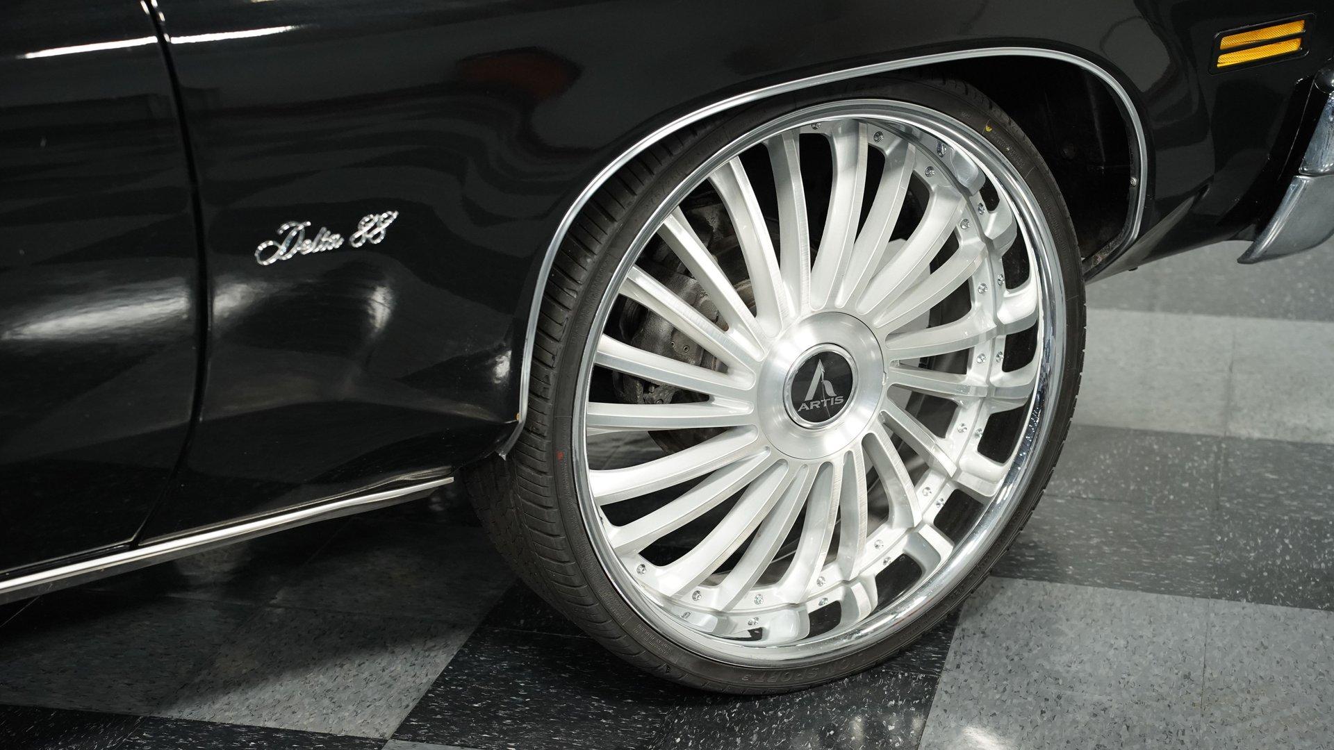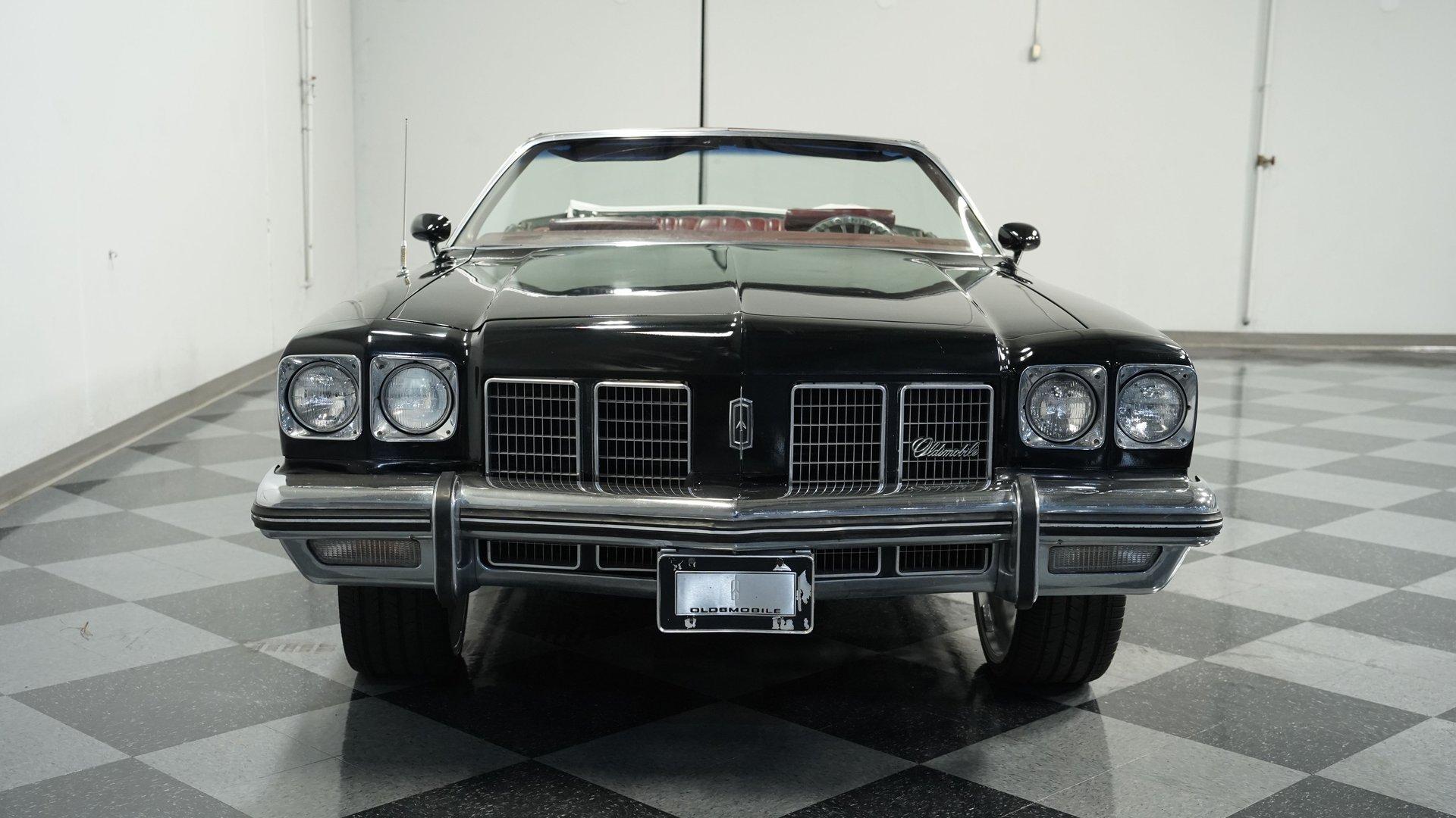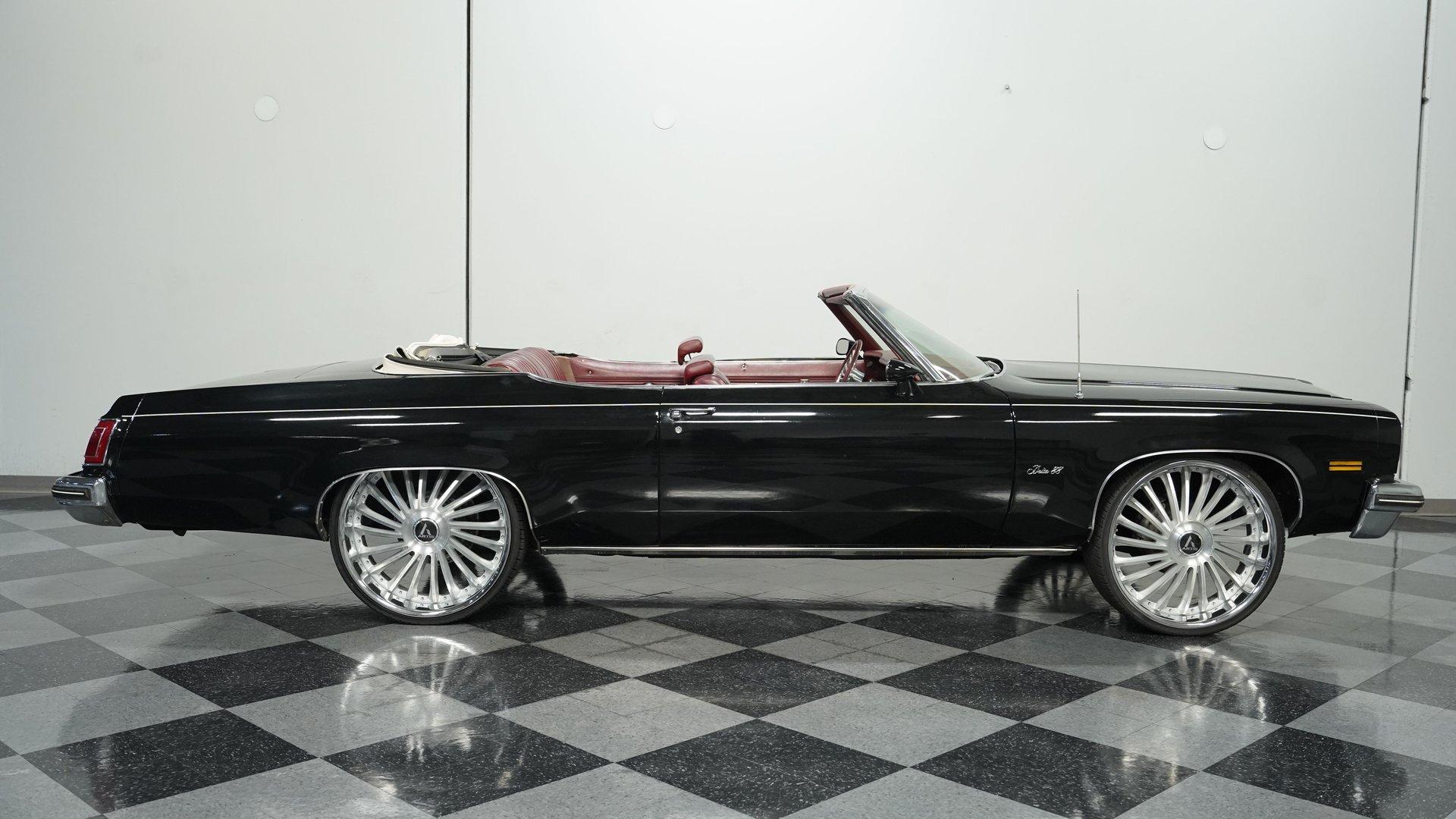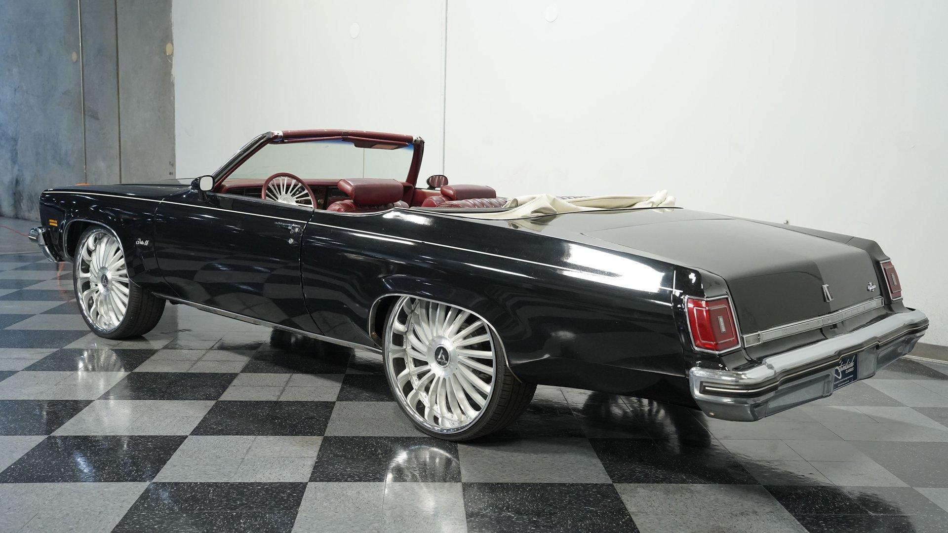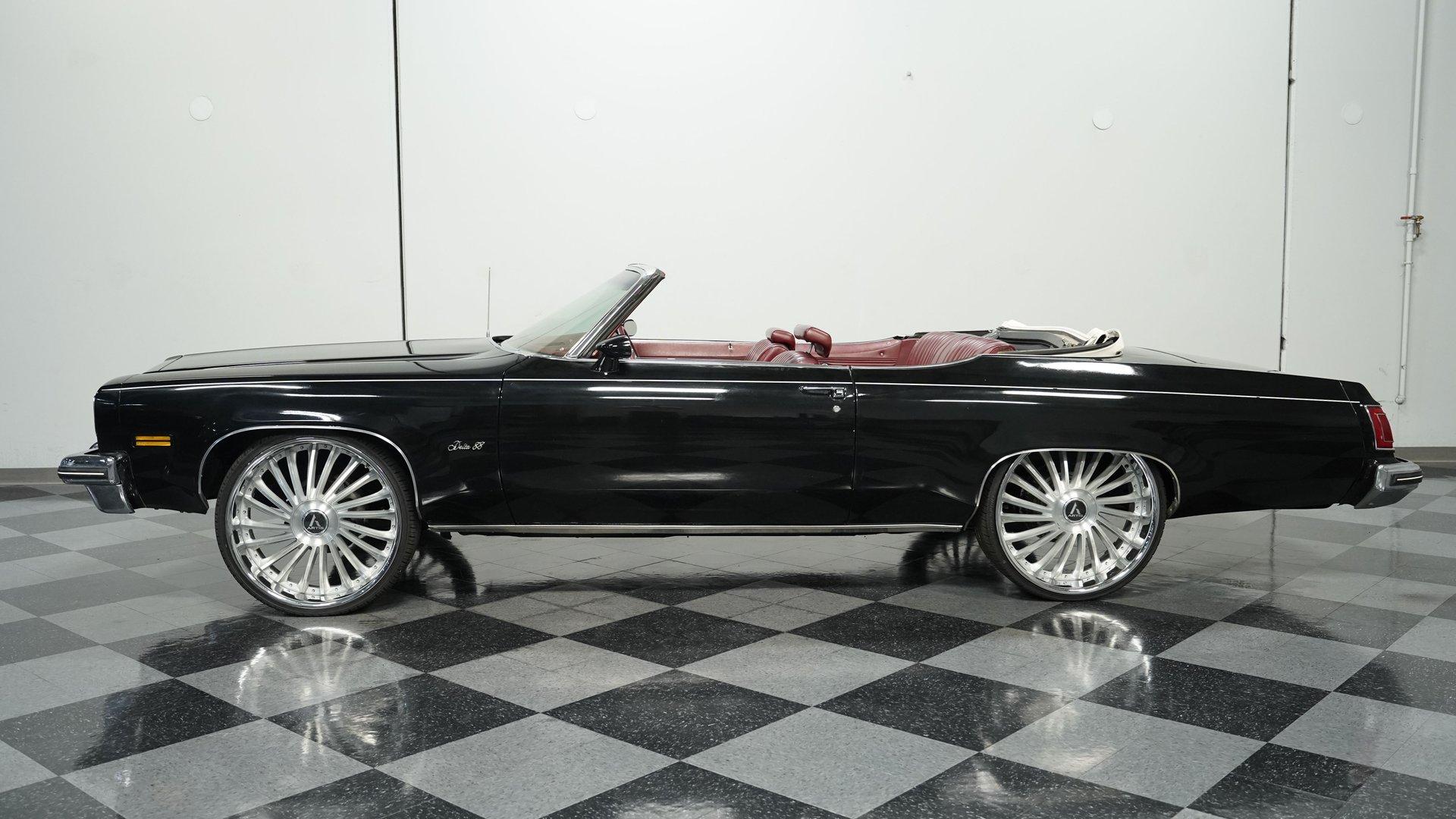 It's hard to beat the wind in your hair from behind the wheel of a full-sized American classic. The last drop-top Olds would produce for fifteen years (until the 1990 Cutlass Supreme), this 1975 Oldsmobile Delta 88 Royale Convertible represents the end of an era, and with its full Ebony Black repaint and complementing silver pinstripes, this car is as collectible as it is enjoyable. Inside, we find a captivating Dark Oxblood Red vinyl interior. A pair of plush bucket seats, each with a folding armrest, offers plenty of room for the front occupants, while a standard bench in the back doubles the available seating area. The custom Artis Forged wheel, created to tie it together with the same style wheels, stands as the center of attention. Beyond the wheel sits a horizontal 100 mph speedometer, fuel gauge, and drive indicator for the column-shifted transmission. To the left sits a set of simple toggle switches and sliding controls for HVAC activation. Under that expansive hood, we find a massive 455 cubic-inch V-8 engine. Topped with a single four-barrel carburetor, this big block typically made about 210 horsepower and 375 pound-feet of torque (both SAE net) when it as new. A single factory exhaust kept things civilized. Power is routed through a TH400 three-speed automatic transmission before being sent out to the 12-bolt rear, which transfers those ponies to the pavement via those colossal 26-inch Artis wheels shod in wide 275/25R-26 low-profile rubber. *Final Olds Drop Top Until 1990 *Only About 7,181 Made *Full Ebony Black Repaint *455 CID V8 *TH400 Three Speed Auto *Dark Oxblood Red Vinyl *Tilt Wheel *Cruise *Artis Custom Steering Wheel *26 Inch Artis Wheels *Low Profile Tires *Power Steering *Power Brakes *Front Discs This 1975 Oldsmobile Delta 88 Royale Convertible rides on a suspension consisting of an independent front that uses coil springs, shocks, along with upper and lower control arms. A live axle rear also uses coil springs and shocks tuned for comfort over sport. Not only serving as the final drop-top Oldsmobile would make for a decade and a half, only about 7,181 of these were ever produced, making it a relatively rare item to come across. So, if you want to feel the wind in your hair from behind the wheel of this comfortable cruiser, don't wait, call today!