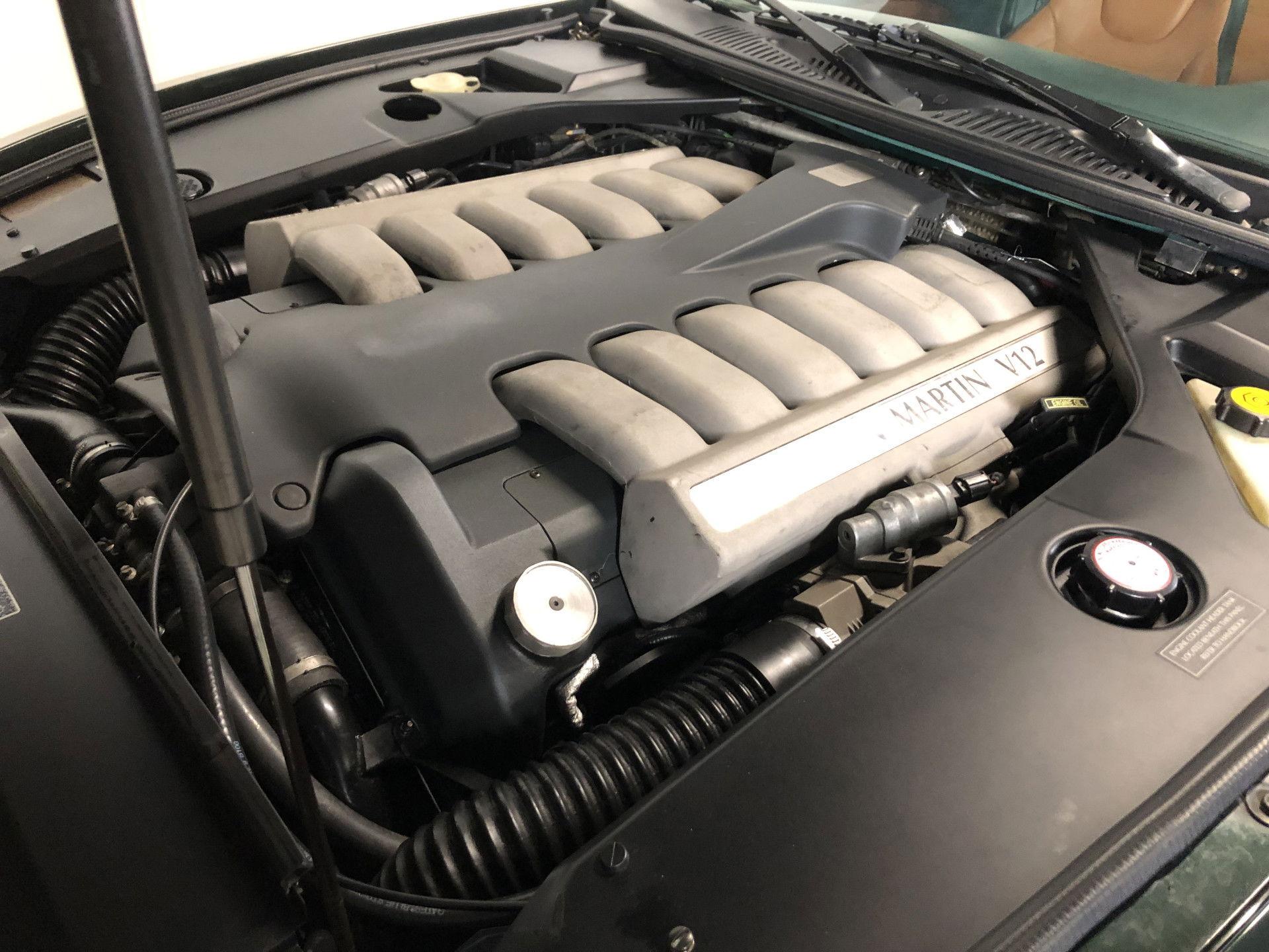 In 1999 the more powerful DB7 V12 Vantage was introduced at the Geneva Motor Show. The 5,9 liter Aston Martin V12 engine with 48 valves has an output of 426 hp and a torque of 542 N⋅m. It has a compression ratio of 10,3:1. Two transmission choices were available: a TREMEC T-56 six-speed manual or a ZF 5HP30 five-speed automatic. Aston Martin claimed the car had a top speed of 299 km/h (186 mph) with the manual gearbox or 266 km/h (165 mph) with the automatic gearbox, and could accelerate from 0-97 km/h (60 mph) in 4,9 seconds. The V12 Vantage is 4.692 mm long, 184,7 mm wide, 1.830 mm high and weighs 1.243 kg. Aesthetic differences from the inline 1.800 DB6 include different door mirrors and large fog lamps under the headlights, along with "DB7 Vantage" badging at the rear.