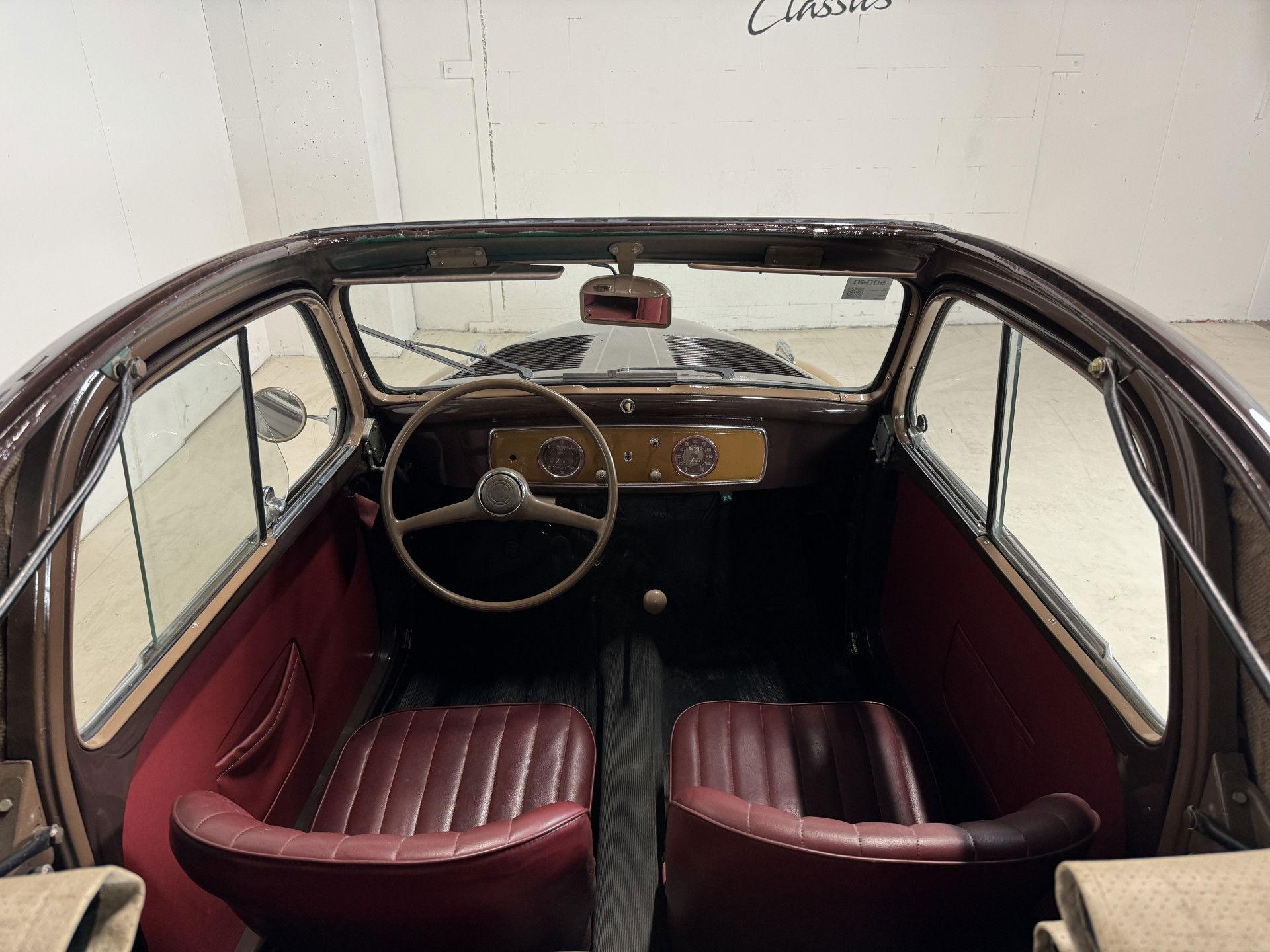 The Fiat 500 'Topolino' was built by Fiat between 1936 and 1955. The name 'Topolino' means 'little mouse' in Italian, but is also the Italian name for 'Mickey Mouse'. Like 'Beetle' and 'Duck', 'Topolino' is not the official name of the model, but a nickname that sticks and that enthusiasts always use for this cuddly little Italian. The Topolino was one of the smallest cars in the world when it was launched in 1937. Three models were produced until 1955, with only minor mechanical and cosmetic changes between them. The model was equipped with a matching 569 cc four-cylinder, water-cooled engine mounted at the front. The radiator was placed behind the engine, which allowed for a lowered aerodynamic nose. Something that stood in contrast to the flat, almost vertical grilles of its competitors. The shape of the front of the car provided an exceptionally good view to the front. With a power of approximately 13 HP, the top speed of the Fiat Topolino was approximately 85 km/h. Shortly after the introduction of the B, the C model also came onto the market in 1949. The engine retained its 16 HP, but the bodywork was thoroughly revised. The front was completely overhauled, with the headlight units integrated into the much more robust mudguards. The vertical, shield-shaped grille made way for a horizontally oriented one. At the rear, the interventions were less noticeable, but at least as large. The longer rear end provided more space and also resulted in a different, slightly less squat shape.