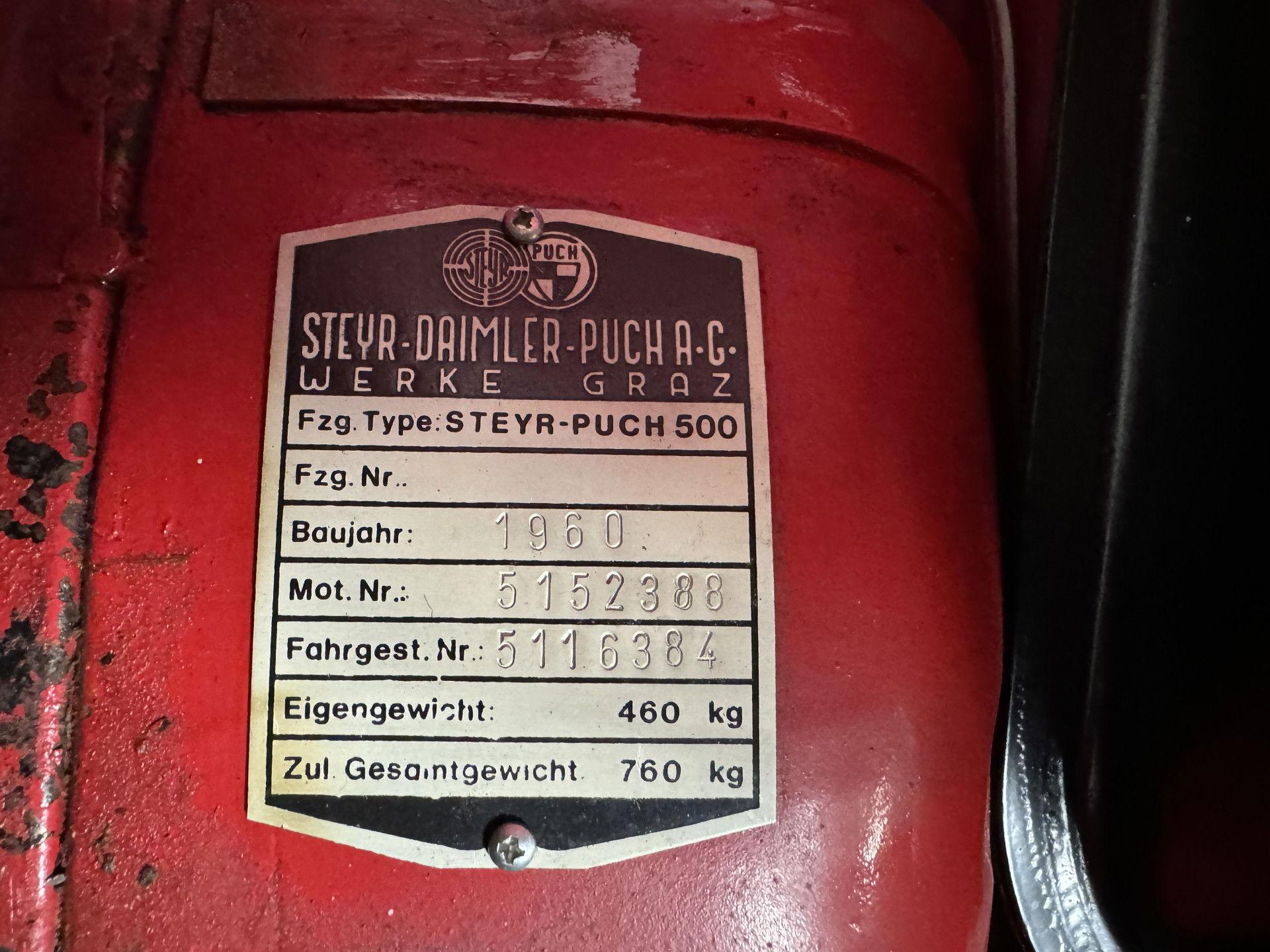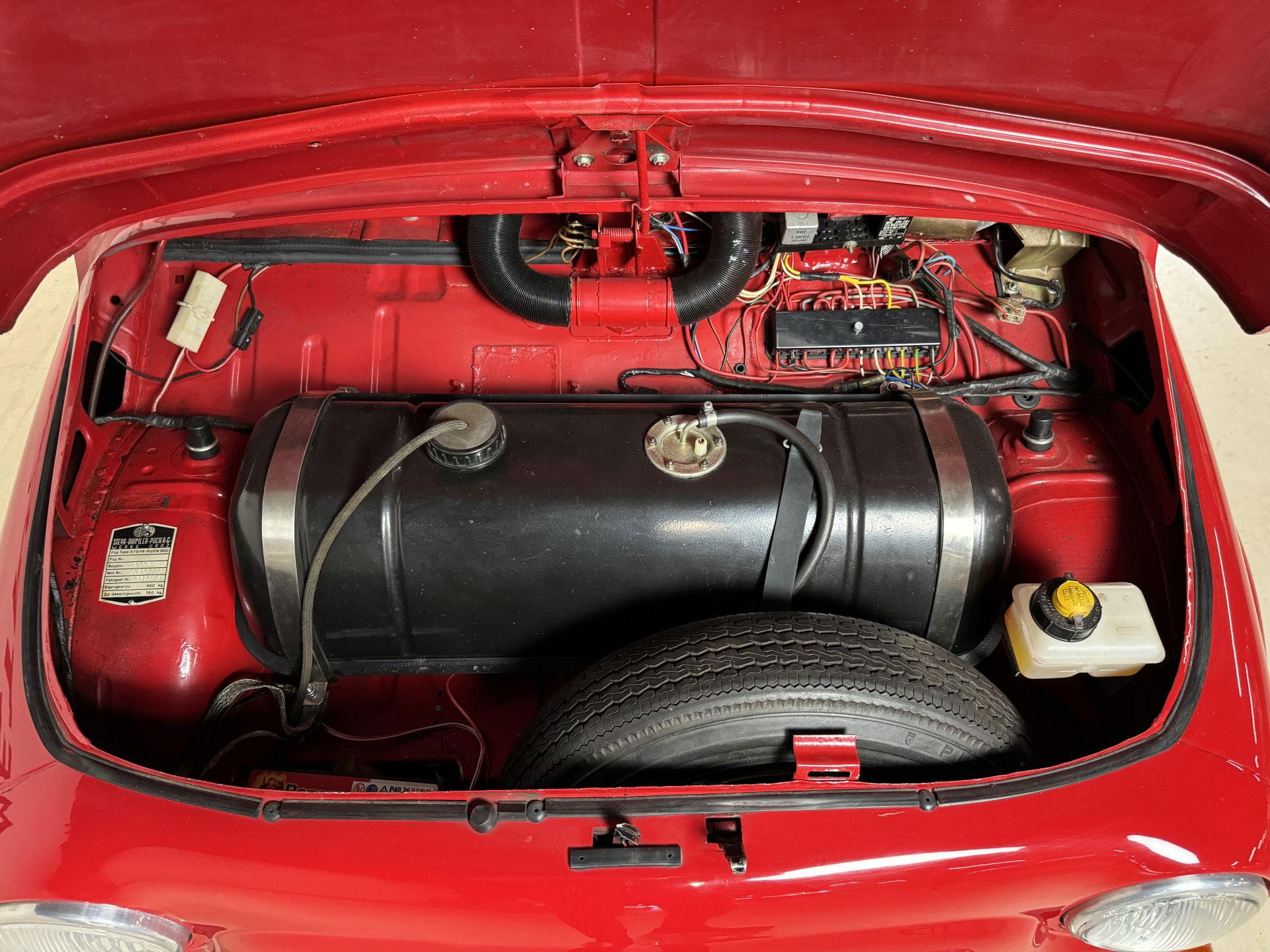 •DELIVERED NEW IN GERMANY + •FULLY MODIFIED TO 'TR II' SPECIFICATIONS + •660 CC ENGINE + •PORSCHE SEATS AND INSTRUMENTS + •REGISTERED IN GERMANY + THIS RARE STEYR-PUCH 500D, A LICENSED VERSION OF FIAT'S UNIVERSAL NUOVA 500, WAS ORIGINALLY REGISTERED ON JUNE 14TH 1960 BY ITS FIRST OWNER IN FRANKFURT, WHO OWNED IT FOR FOUR YEARS. THE SUBSEQUENT OWNER KEEP IT UNTIL 1968 WHEN IT WAS REGISTERED IN BRAUNSCHWEIG, GERMANY. OVER THE PAST YEARS THE CAR HAS BEEN RESTORED AND SIGNIFICANTLY MODIFIED TO GIVE IT THE FEATURES OF THE TR II SPORTS VERSION. THE ENGINE HAS BEEN UPGRADED FROM THE ORIGINAL 499CC TO 660CC AND FITTED WITH A PORSCHE HKZ IGNITION SYSTEM AND A WEBER 36 CARBURETTOR, WHILE THE SUSPENSION IS NOW OF THE STEYR-PUCH MONTE-CARLO TWIN TYPE. IN ADDITION, FIAT 126 SUSPENSION AND STEERING WERE INSTALLED, THE BRAKES CHANGED TO DUAL CIRCUIT, A STEYR-PUCH 700E ESTATE GEARBOX FITTED AND THE BATTERY MOVED FORWARD FOR BETTER WEIGHT DISTRIBUTION. PORSCHE SEATS (THOSE FROM A 914) WERE FITTED, AS WELL AS A GERSTL-SPORTS STEERING WHEEL AND PORSCHE INSTRUMENTS. ALL OF THESE UPGRADES WERE DULY REGISTERED ON THE GERMAN REGISTRATION PAPERS. PAINTED IN A SPICY RED WITH A BLACK INTERIOR, YET UNDESCRIBED, THIS CHARMING 'POCKET ROCKET' WILL SURELY GIVE ITS DRIVER A LOT OF PLEASURE. THIS UNIQUE CAR IS BEING SOLD WITH ITS OLD ORIGINAL (EXPIRED) KRAFTFAHRZEUSBRIEF AND GERMAN REGISTRATION PAPERS.