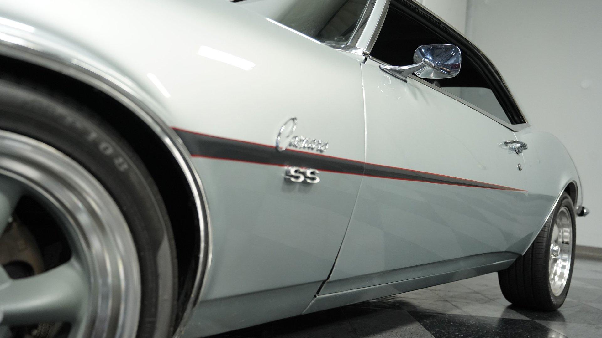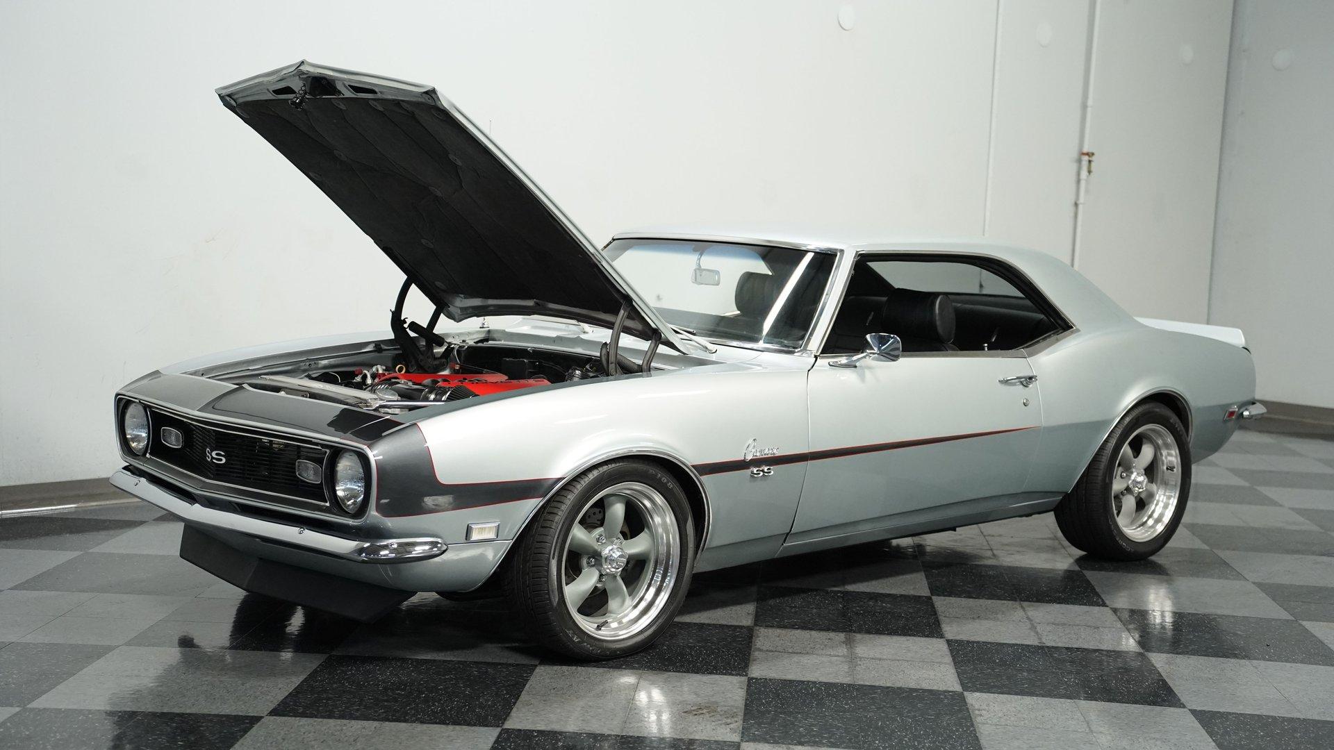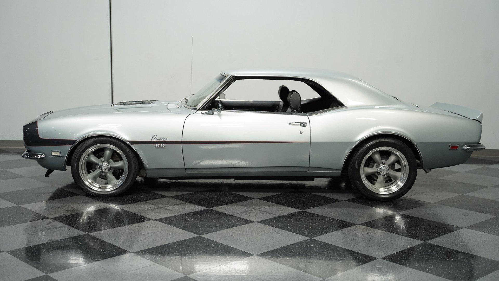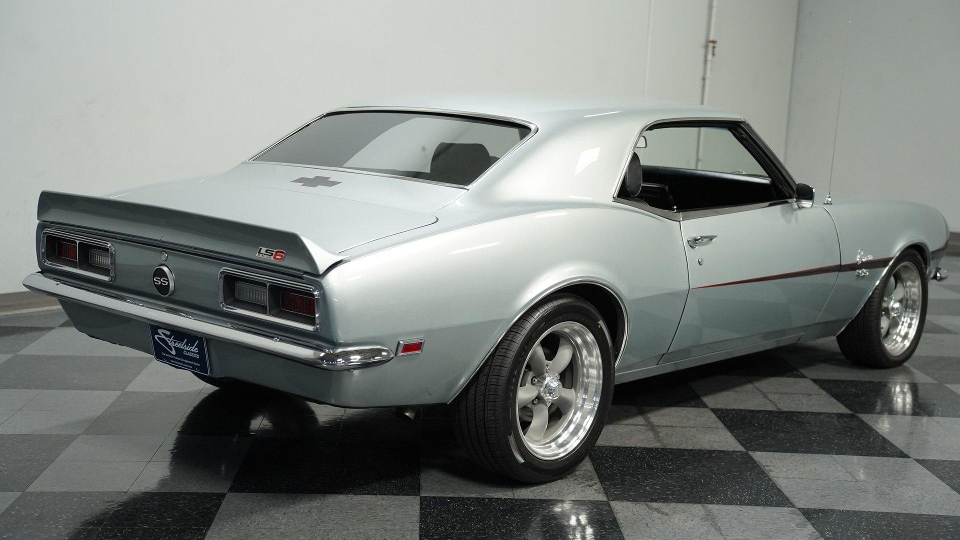 Here is a 1968 Chevrolet Camaro Restomod with a striking color combination. The silver paint pairs flawlessly with the painted charcoal stripes pinstriped in red, and the Matte Gray American Racing wheels. The front and rear chrome bumpers shine brightly, while the LS6 badge on the back lets everyone know what kind of horsepower punch this Camaro is packing. Period-correct hood vents and a spoiler enhance its already handsome exterior. This Camaro is a true head-turner that will draw plenty of attention and compliments. The interior looks fantastic, covered mostly in black. Chrome trim and woodgrain accents break up the color nicely, along with Houndstooth front and rear seat inserts. The door panels and dashboard are in excellent shape, along with all the knobs and buttons. A retro-style aftermarket radio provides AM/FM and Bluetooth connectivity. An upgraded steering wheel and shifter lever add to the fun driving characteristics. The carpets look good and are protected by LS6 floor mats. Door jambs and sills are super clean, and the headliner and weather stripping are in good condition. Under the hood sits an impressive setup: a big 5.7-liter LS6 engine with electronic fuel injection, snugly fitted and ready to perform. It's paired with a 4L80E transmission running back to a 10-bolt GM rear axle. Up front, rack-and-pinion steering with adjustable coilovers provides responsive handling, while the rear features leaf springs, shocks, and a sway bar. Seventeen-inch American Racing wheels are wrapped in 255/45ZR17 tires, paired with power front disc brakes and power rear drum brakes. Subframe connectors help keep the chassis rigid, minimizing twist. Long-tube headers feed dual exhaust pipes running through Flowmaster mufflers, giving this Camaro a powerful growl. Highlights: 5.7-Liter LS6 Engine With Electronic Fuel Injection Upgraded Aluminum Radiator 4L80E 4-Speed Automatic Transmission 10-Bolt GM Rear Axle Subframe Connectors Rack And Pinion Steering With Adjustable Coilovers Rear Leaf Springs, Shocks, And A Sway Bar 17-Inch American Racing Rims Front Power Disc Brakes And Rear Power Drum Brakes Long Tube Headers, Dual Exhaust, Flowmaster Mufflers Power Steering Heat, Defrost, Air Conditioning Tilt Steering Column Houndstooth Front And Rear Seat Inserts Retro Style AM/FM/AUX Radio With Bluetooth This is one sharp-looking 1968 Chevrolet Camaro Restomod with a modern LS6 engine for confident cruising. With its comfortable interior, updated components, and clean presentation, this Camaro is built to provide many more years of enjoyment without major issues. Call Today!