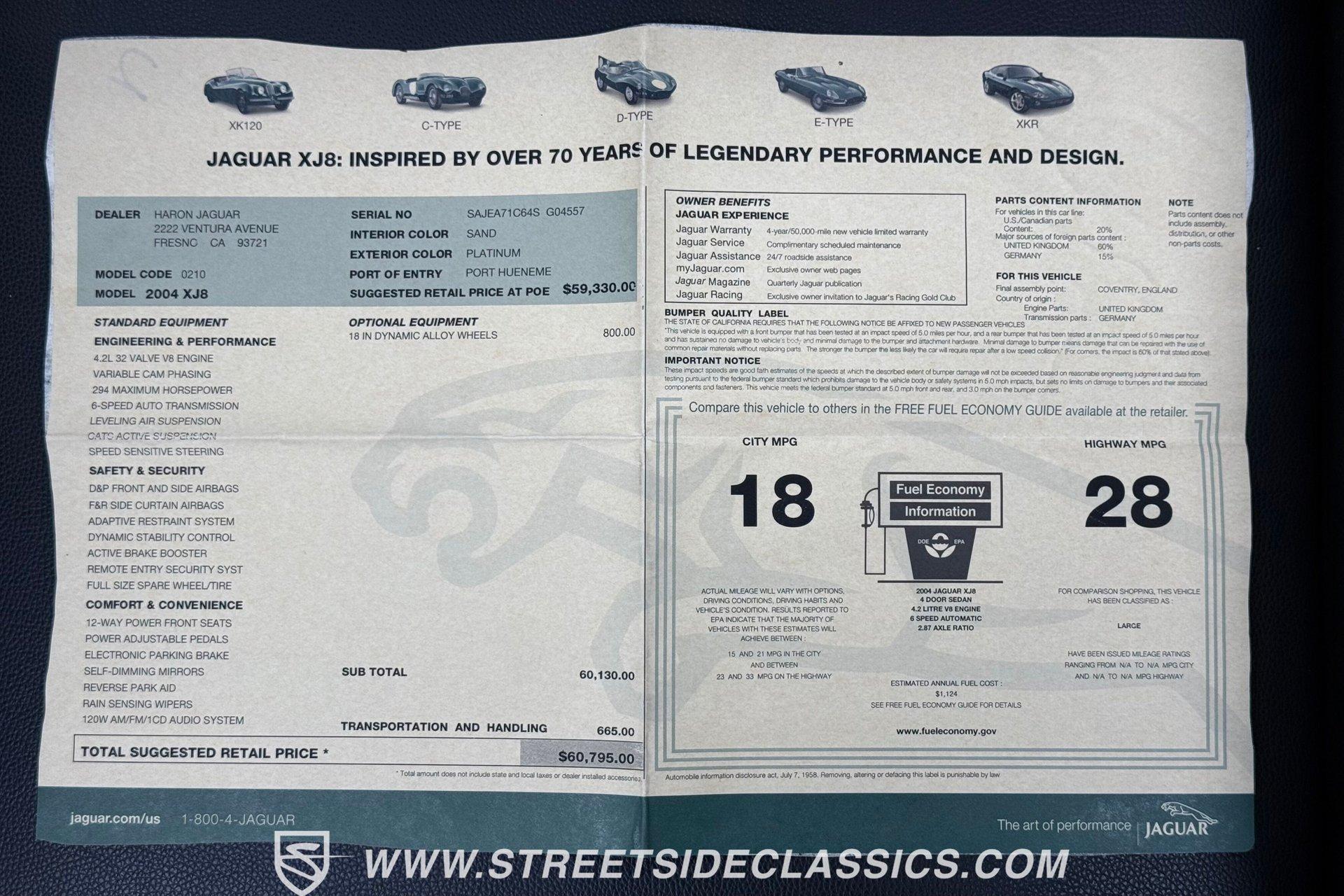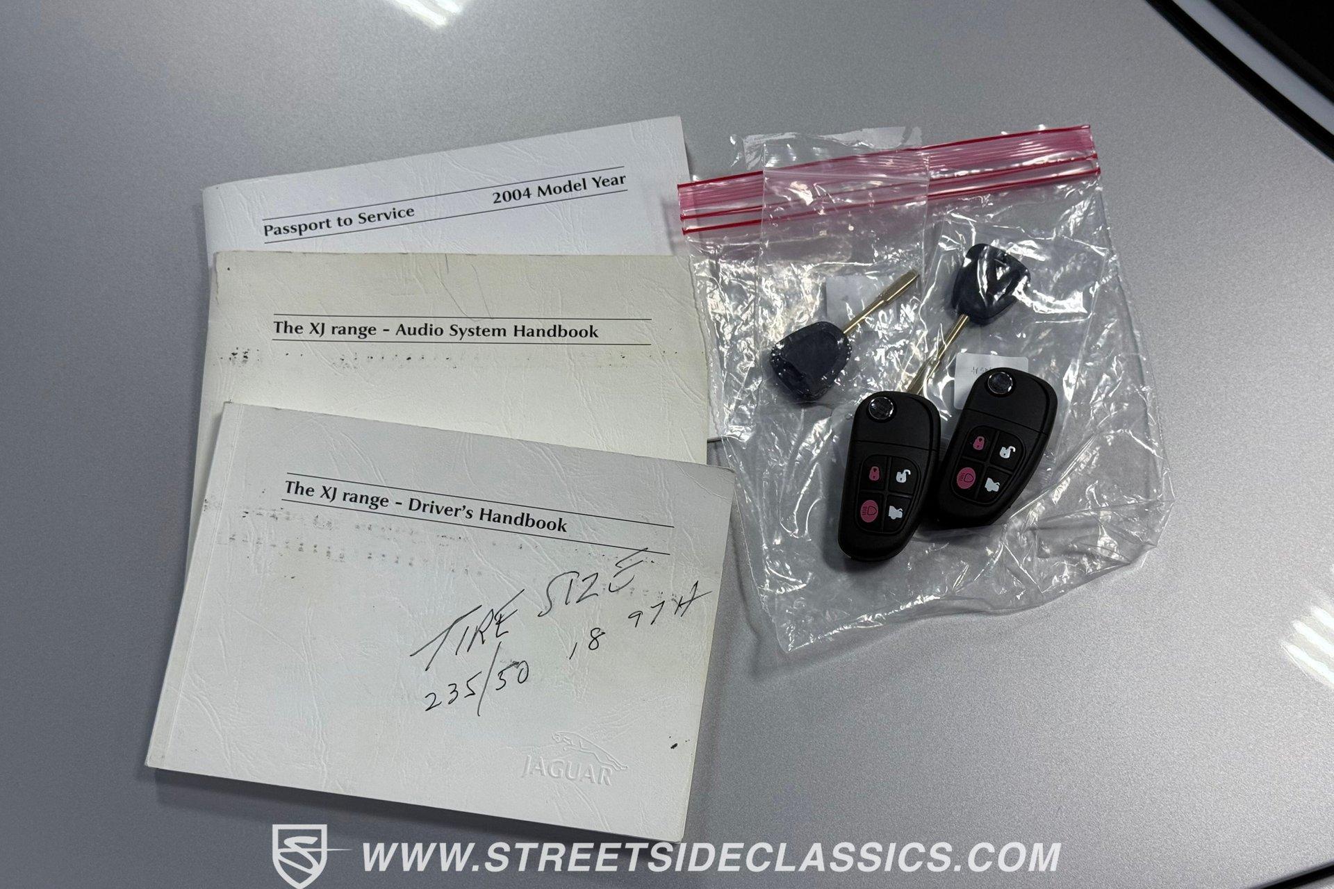 This low-mileage 2004 Jaguar XJ8 offers the best of everything. It has smooth V8 power, exceptional modern luxury, and it's all wrapped in a sleek European style. And while this offers you an executive-level experience, you can get it today for a mailroom kind of price. A sophisticated color like Platinum gives the exact right first impression for a car like this. It instantly conveys Jaguar's reputation for sophistication, performance, and tradition in one elegant hue. This car has had the best of care and has accumulated only 64,614 carefully driven miles since it was new. The body panels show off the long, low Jaguar profile is instantly recognizable as the shape that built this icon. Overall, the finish is extremely nice and definitely demonstrates the superior quality you got for your money when you bought a top-of-the-line luxury car. Complementing the elegant styling are optional factory 18-inch Dynamic Alloy wheels. Inside is a great mix of old-world luxury and modern technology. The Sand tan leather interior rains looking premium and feeling supple. The walnut wood trim has a matching pattern with the doors, dash, and center console to really warm up the atmosphere. The luxury continues with a long list of desirable features such as dual-zone automatic climate control, power windows, power locks, keyless entry/alarm, cruise control, power seats, a premium AM/FM/CD stereo, power tilt/telescopic steering column, and a power sunroof. Modern features not only mean superior luxury, but also the modern safety of dual front airbags, side airbags, and anti-lock brakes. The 8 in XJ8 means you're in the generation of proper V8 power. The engine bay shows off a very tidy 4.2-liter fuel-injected unit. This motor is famous for combining the engineering talents of Ford with Jaguar's flair for driving passion. It purrs with buttery smoothness but can growl with the biggest cats when you plant your right foot. This luxury sedan was built to make your heart race like a sports car, and so the motor is mated to a six-speed automatic transmission (utilizing the iconic J-gate shifter.) The European engineered fully independent suspension, power steering, and four-wheel disc brakes mean this executive sedan begs for the back roads. HIGHLIGHTS: 64,614 Miles from New 4.2-Litre V8 Engine 6-Speed Automatic Transmission Window Sticker Leather Interior Dual-Zone Climate Control AM/FM/CD Stereo Power Windows Keyless Entry Power Bucket Seats Power Tilt Steering Column Front and Side Impact Air Bags 18-Inch Factory Optional Dynamic Alloy Wheels Owner's Manual Car Cover Power Sunroof The sale comes complete with the owner's manual, window sticker, car cover and both a spare key and valet key. This elegant and well-preserved 2004 Jaguar XJ8 is ready to pamper its next owner with luxury and style. Call today!!!