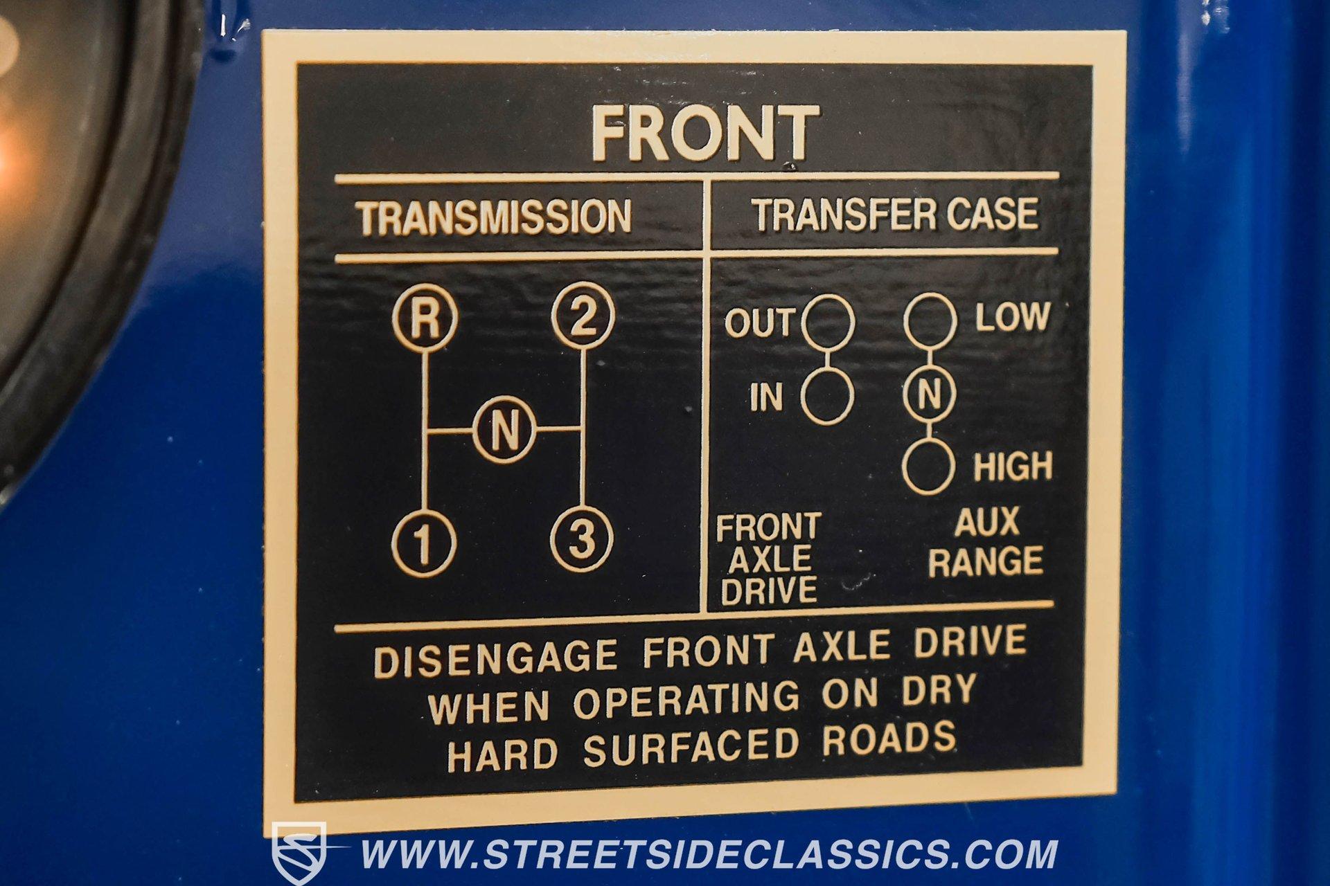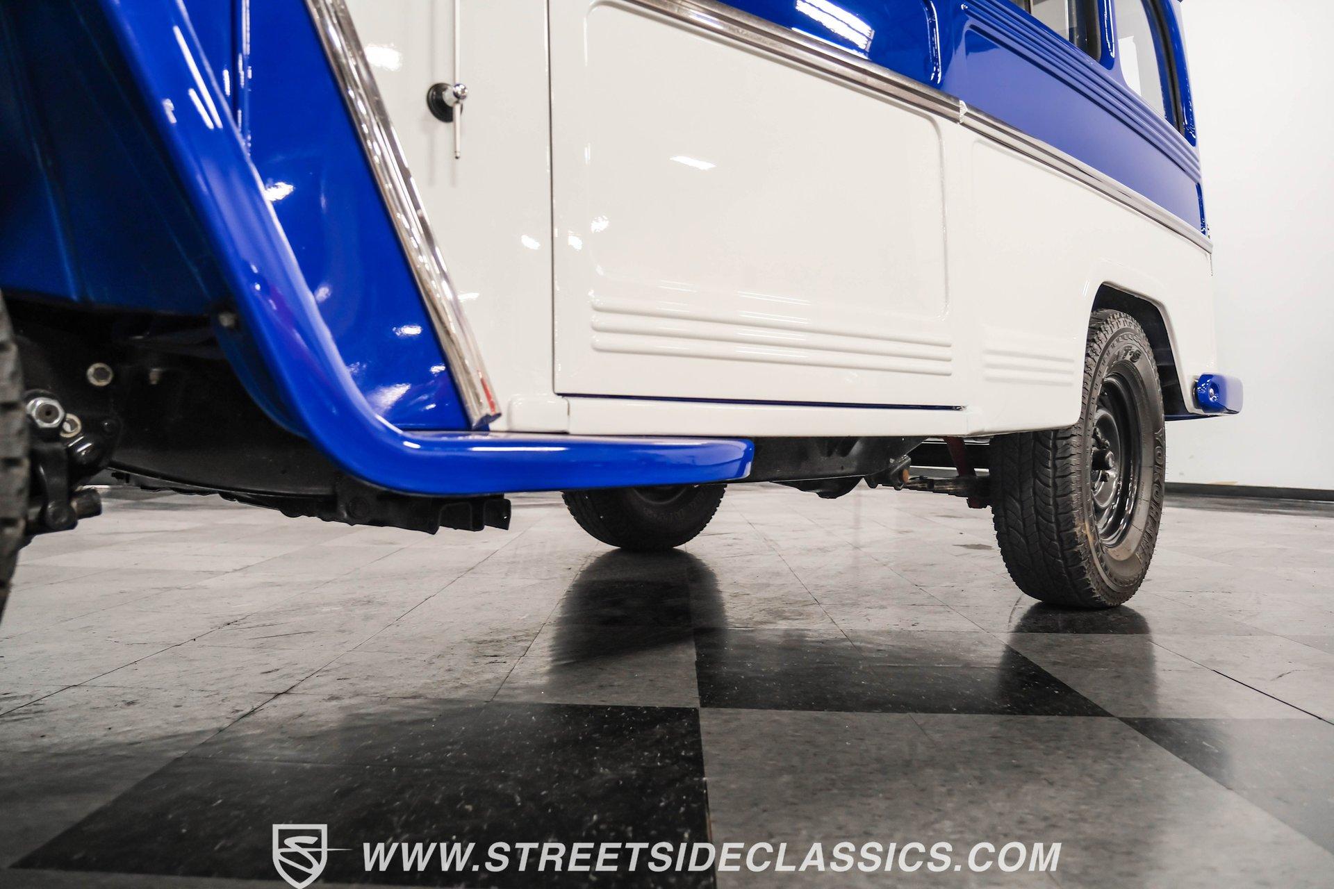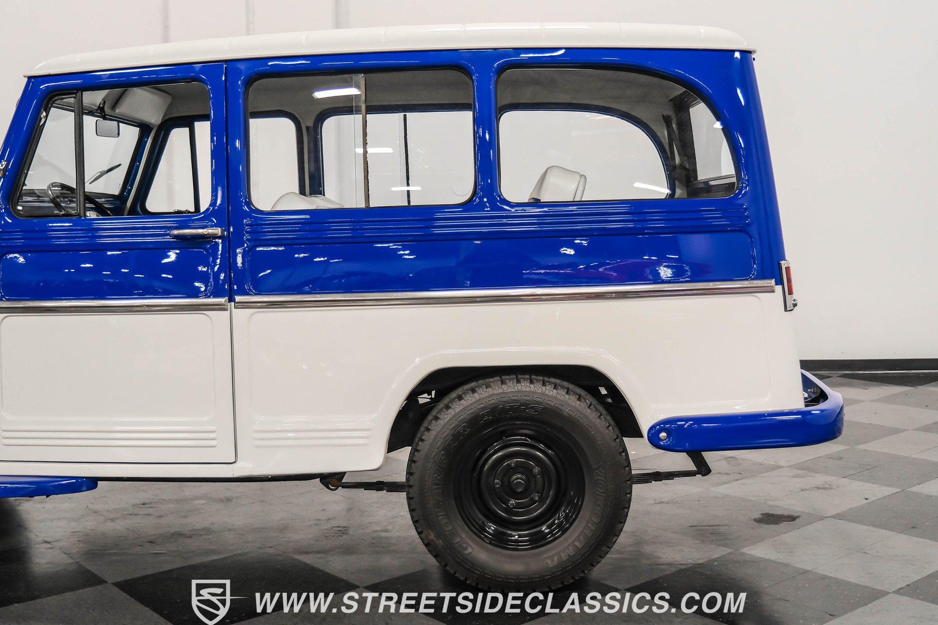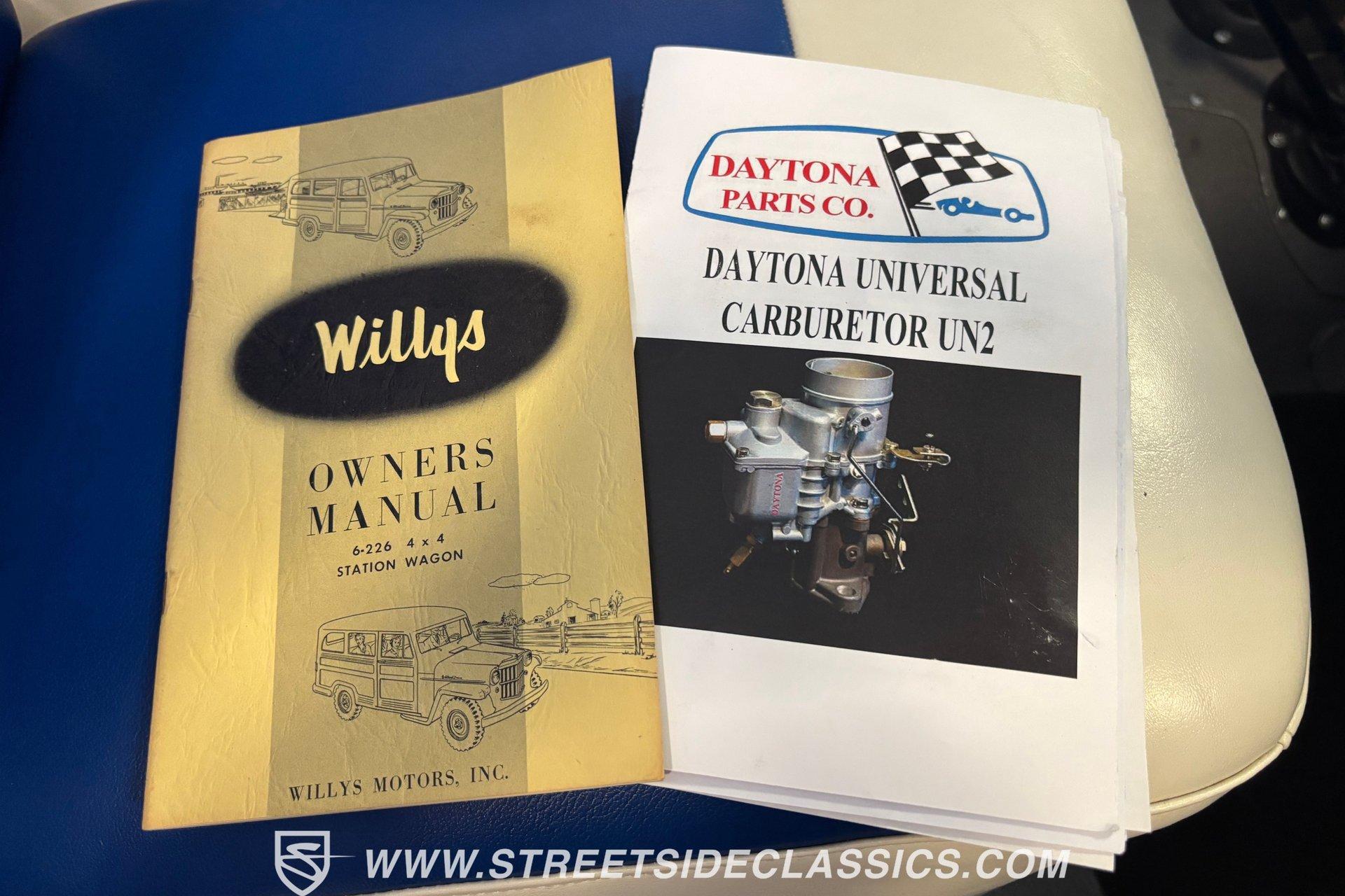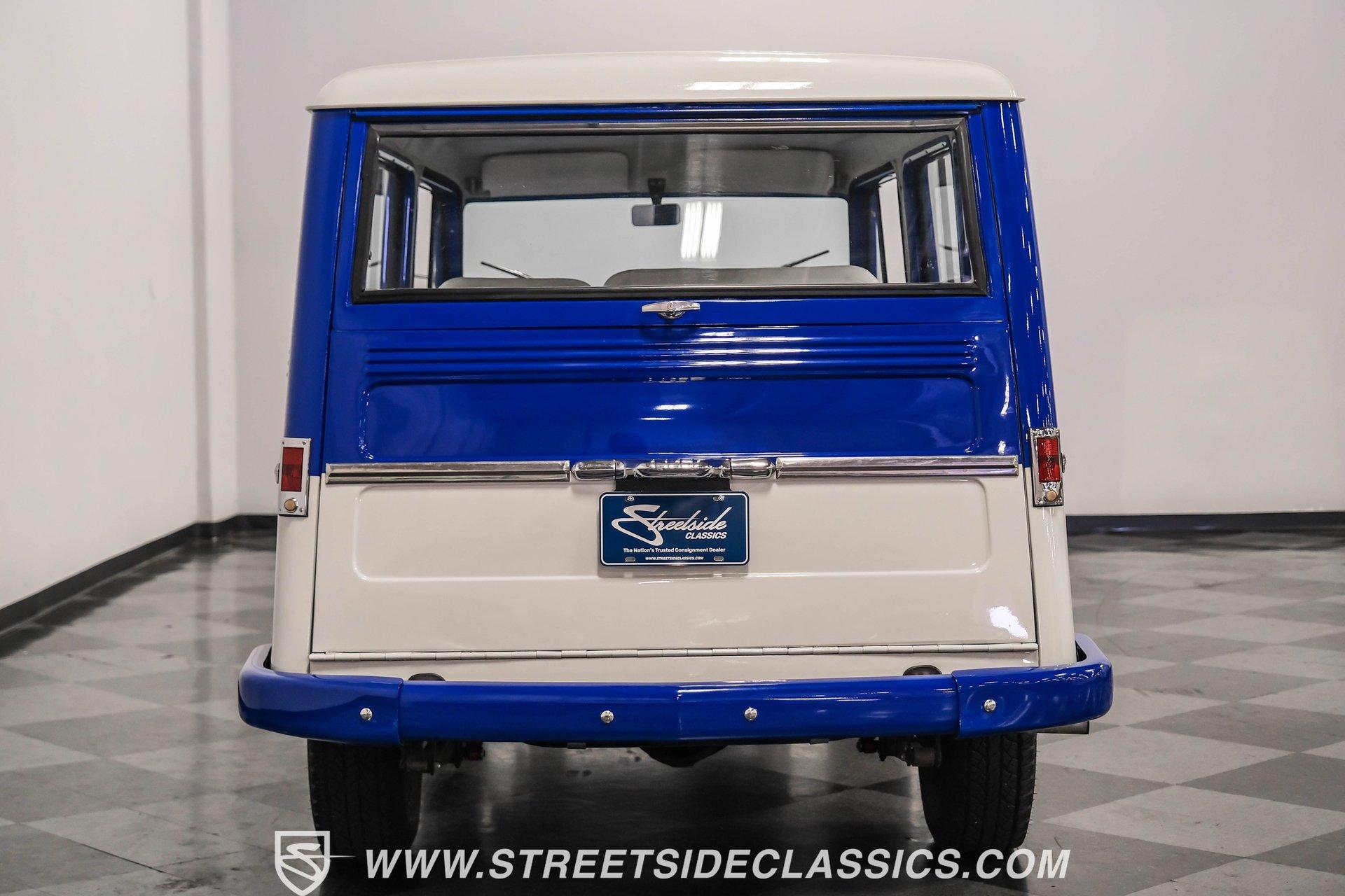 This is one "super clean" vehicle inside and out. It's hard enough to find a Willys as it is, but finding one in this good of shape is almost impossible. This 1961 Willys Jeep Wagon 4x4 has been completely restored and is dressed to impress. The Blue and White two-tone exterior instantly catches the eye with its black wheels, painted bumpers, and chrome trim. Its stance is imposing, the front grille even more so, and overall, it's simply a very cool vehicle to look at and enjoy. The interior continues the theme, with white and blue vinyl seats. The door panels as well carry the same look and are in equally good condition. The headliner is in great shape, and instead of carpet, the front features metal floors, while behind the front seats begins a set of wooden running boards over the steel floor. The dashboard is painted blue to match the exterior and looks outstanding. The steering wheel and speedometer have a stock appearance, as does the rest of the dash, except for one neatly mounted water temperature gauge beneath the dash. Door jambs, weatherstripping, and glass all look good with no major damage and the floor shifters are in good shape, easy to reach, and ready for fun. Under the hood, you'll find a very obedient 226 cubic-inch inline-6 cylinder engine, nicknamed the "Super Hurricane". It's paired with a 3-speed manual transmission that delivers power to the front and rear Dana 30 solid axles. Both axles use leaf springs with shocks for suspension duties, while at all four corners sit 15-inch painted black rims wrapped in 235/75R15 Yokohama tires. Drum brakes handle stopping power, and a stock exhaust system keeps this Willys sounding just right. Highlights: Four-Wheel Drive 226 Cubic-Inch Inline-6 Cylinder Engine (Super Hurricane) 3-Speed Manual Transmission Front And Rear Dana 30 Solid Axles Front And Rear, Leaf Springs And Shocks 15-Inch Painted Black Wheels Front And Rear 235/75R15 Yokohama Tires Heat And Defrost AM Radio Owner's Manual Here is a vehicle that runs and drives as good as it looks. This 1961 Willys Jeep Wagon 4x4 will treat you well as long as you treat it well. With a frame-off restoration, this Jeep has the potential to last someone a very long time. Call Today!