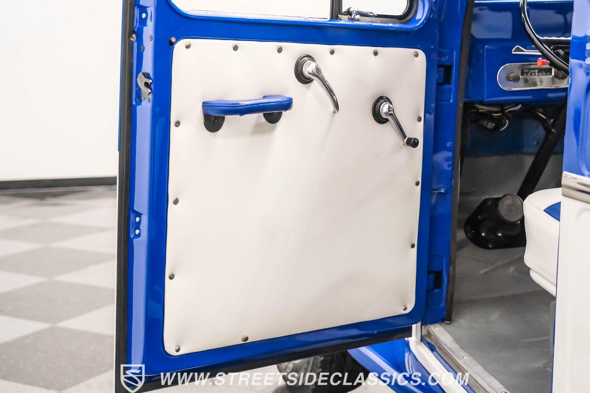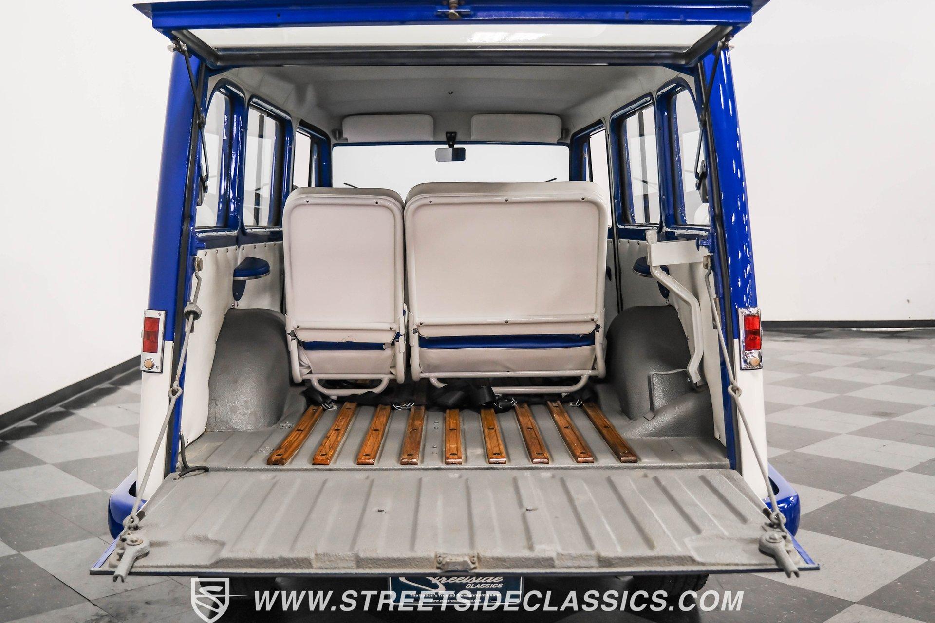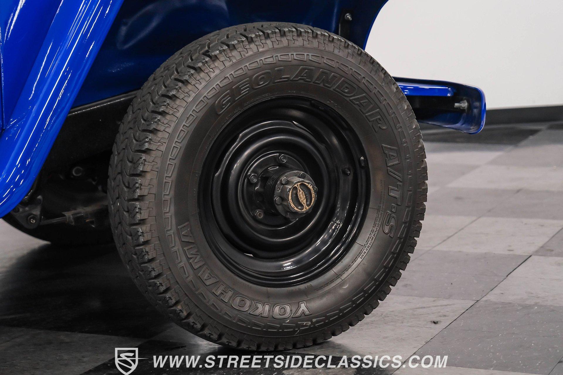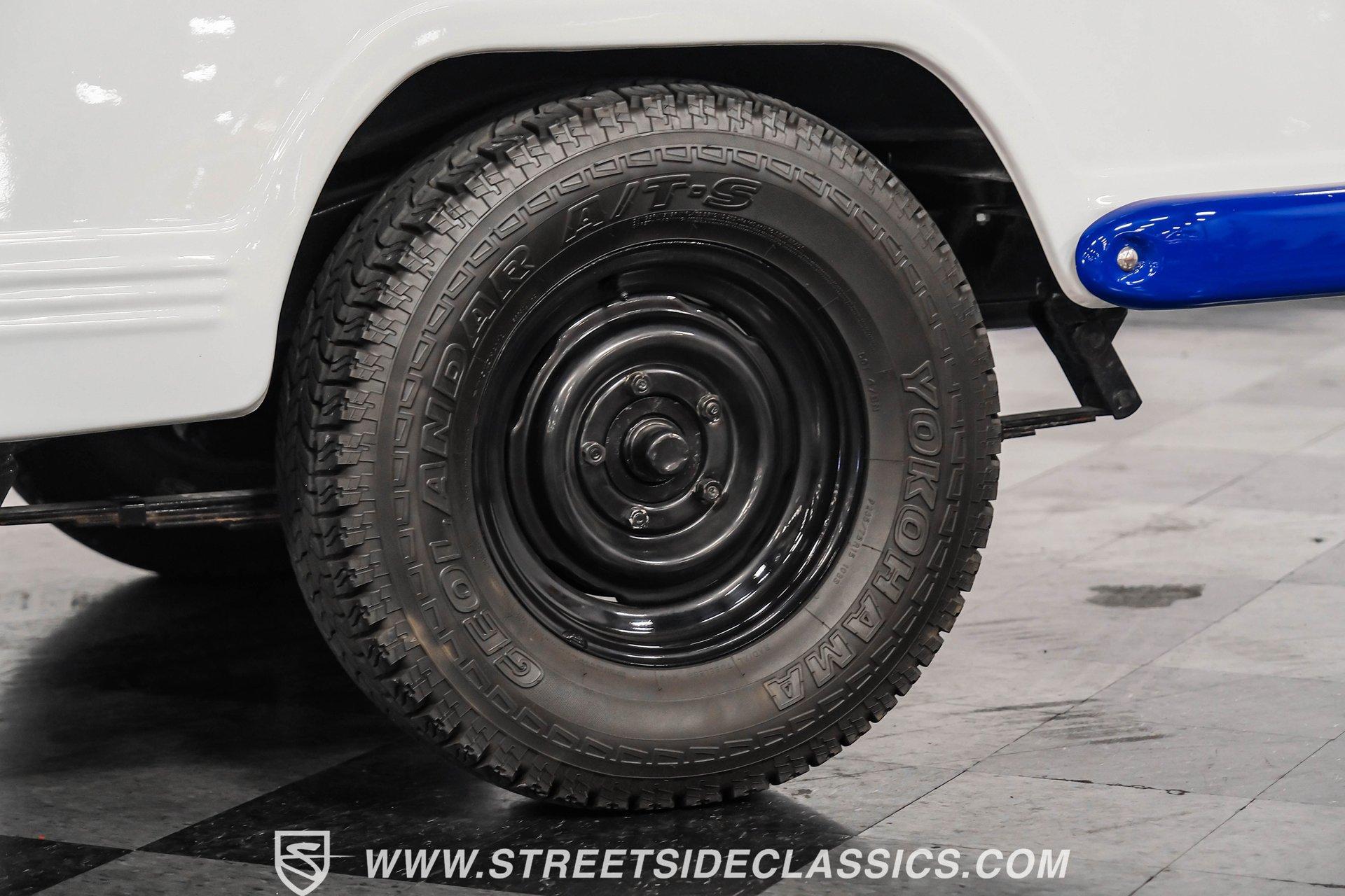 This is one "super clean" vehicle inside and out. It's hard enough to find a Willys as it is, but finding one in this good of shape is almost impossible. This 1961 Willys Jeep Wagon 4x4 has been completely restored and is dressed to impress. The Blue and White two-tone exterior instantly catches the eye with its black wheels, painted bumpers, and chrome trim. Its stance is imposing, the front grille even more so, and overall, it's simply a very cool vehicle to look at and enjoy. The interior continues the theme, with white and blue vinyl seats. The door panels as well carry the same look and are in equally good condition. The headliner is in great shape, and instead of carpet, the front features metal floors, while behind the front seats begins a set of wooden running boards over the steel floor. The dashboard is painted blue to match the exterior and looks outstanding. The steering wheel and speedometer have a stock appearance, as does the rest of the dash, except for one neatly mounted water temperature gauge beneath the dash. Door jambs, weatherstripping, and glass all look good with no major damage and the floor shifters are in good shape, easy to reach, and ready for fun. Under the hood, you'll find a very obedient 226 cubic-inch inline-6 cylinder engine, nicknamed the "Super Hurricane". It's paired with a 3-speed manual transmission that delivers power to the front and rear Dana 30 solid axles. Both axles use leaf springs with shocks for suspension duties, while at all four corners sit 15-inch painted black rims wrapped in 235/75R15 Yokohama tires. Drum brakes handle stopping power, and a stock exhaust system keeps this Willys sounding just right. Highlights: Four-Wheel Drive 226 Cubic-Inch Inline-6 Cylinder Engine (Super Hurricane) 3-Speed Manual Transmission Front And Rear Dana 30 Solid Axles Front And Rear, Leaf Springs And Shocks 15-Inch Painted Black Wheels Front And Rear 235/75R15 Yokohama Tires Heat And Defrost AM Radio Owner's Manual Here is a vehicle that runs and drives as good as it looks. This 1961 Willys Jeep Wagon 4x4 will treat you well as long as you treat it well. With a frame-off restoration, this Jeep has the potential to last someone a very long time. Call Today!
