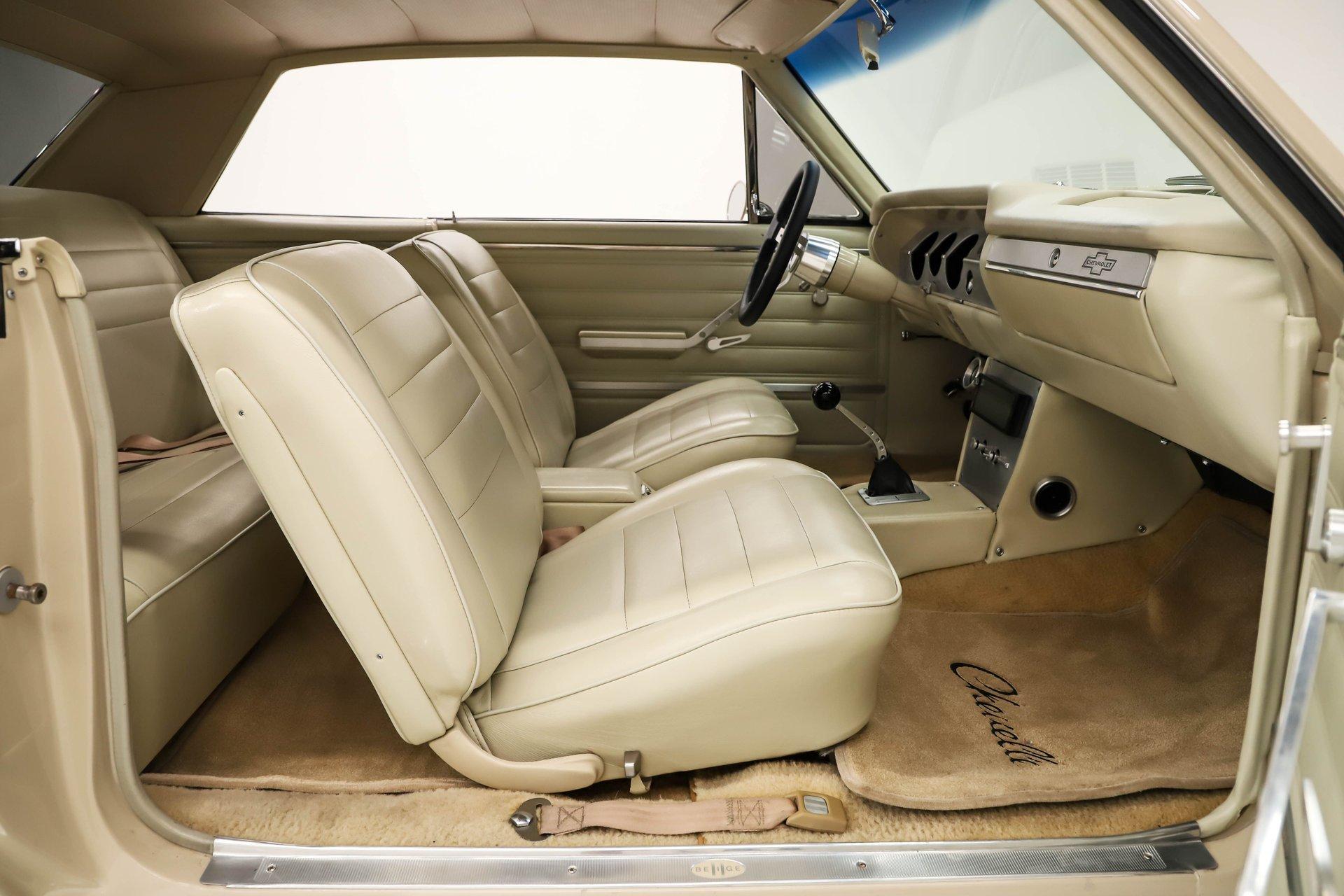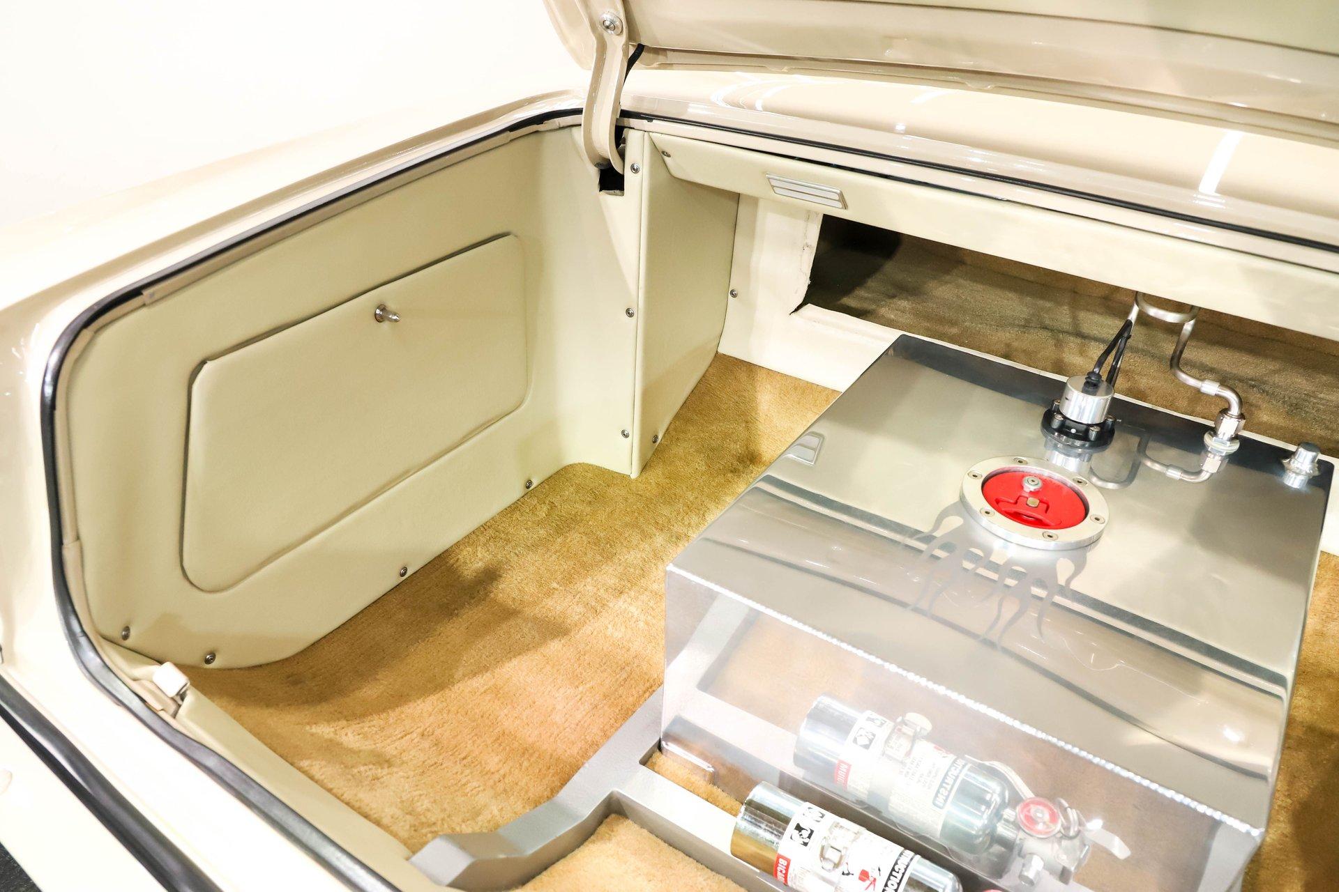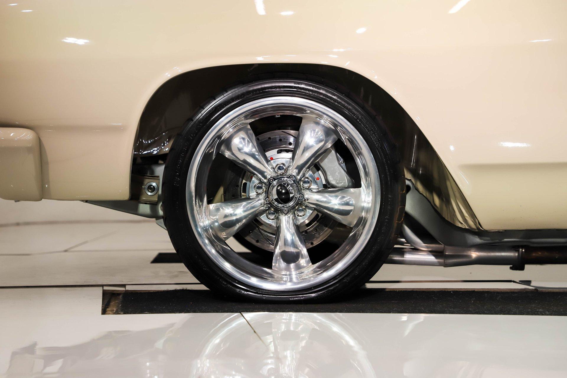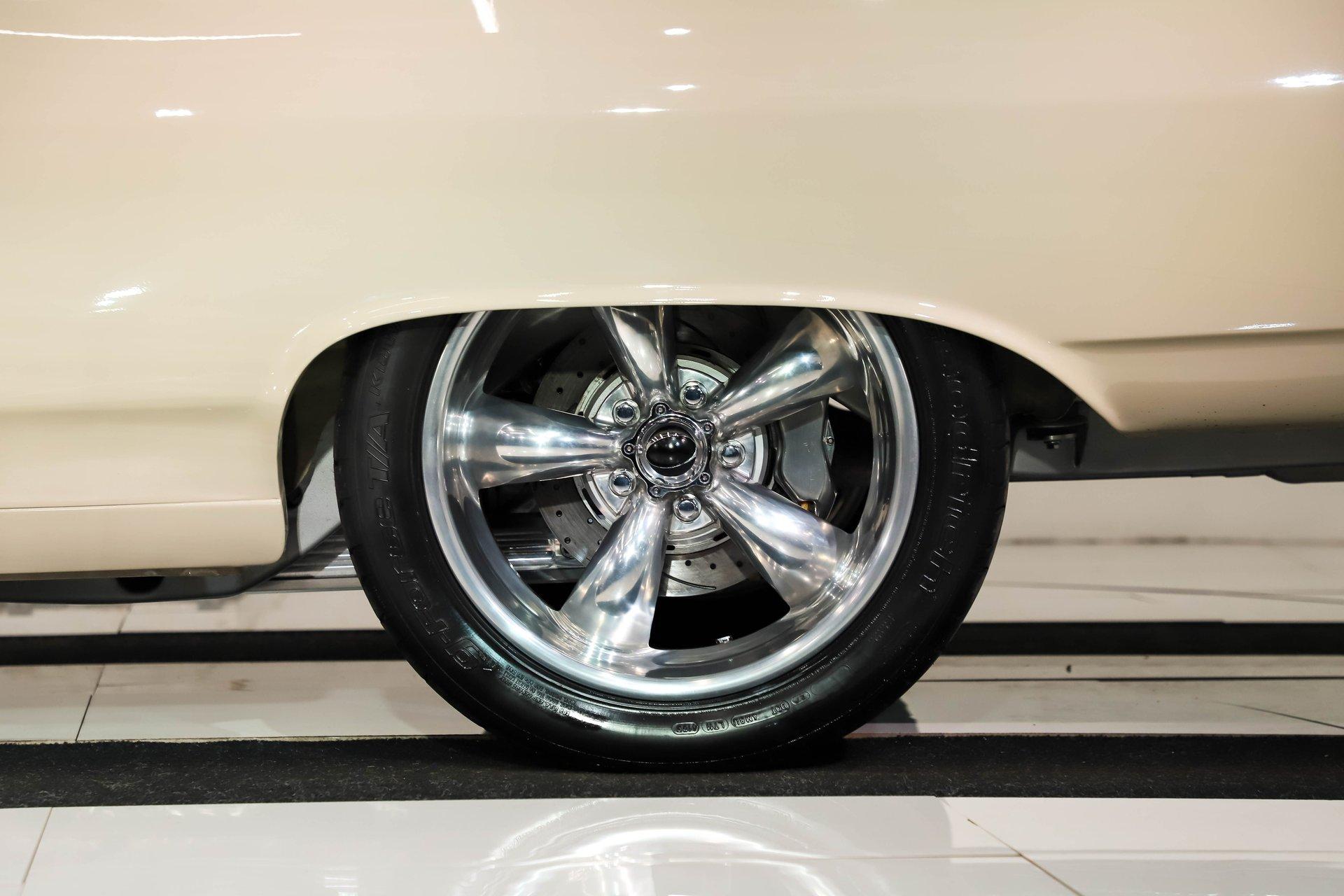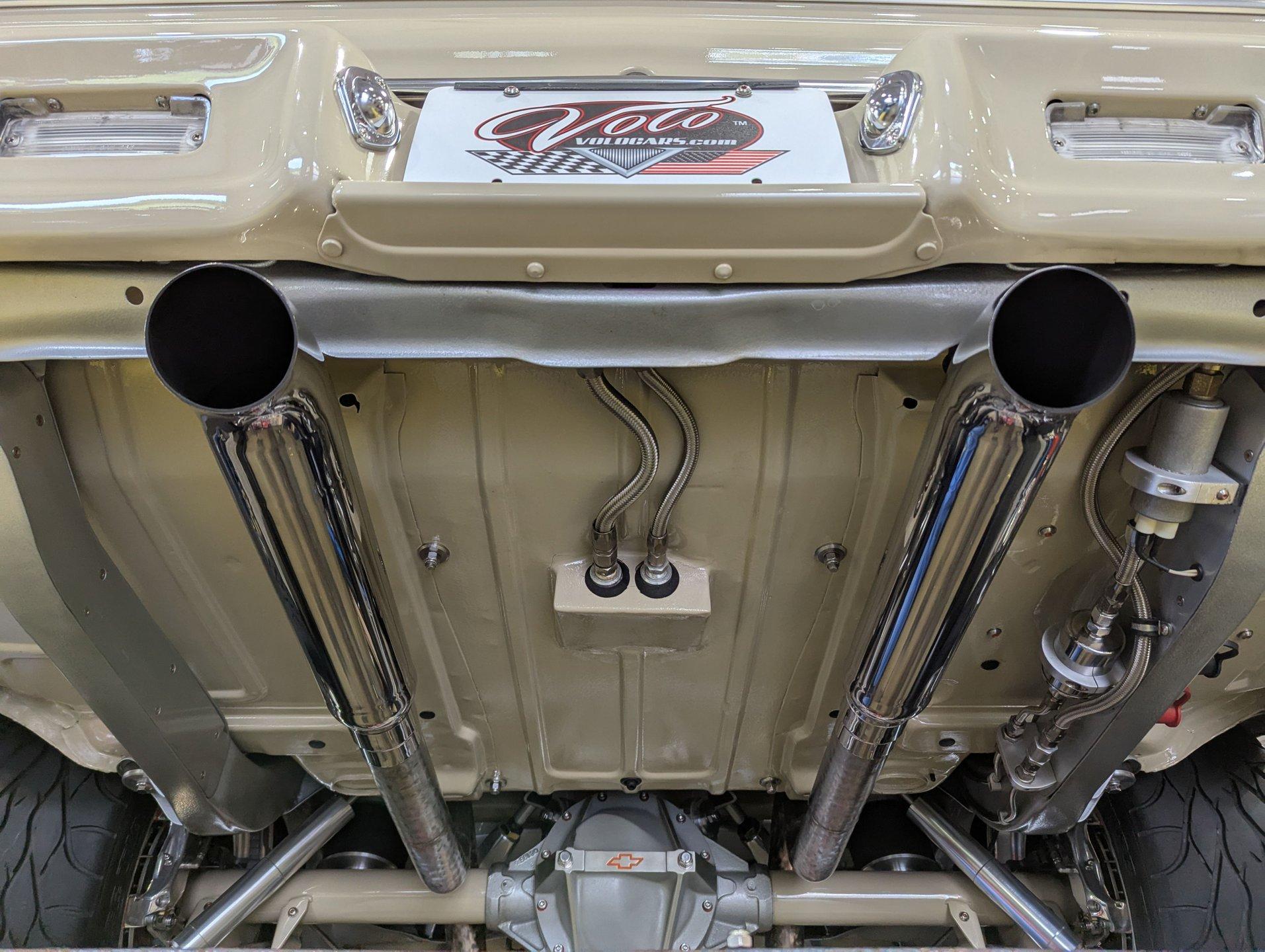 Celebrating our 65 year anniversary! This family owned and operated business was established in 1960, making us the oldest classic car dealership in America. Special thank you to all our customers for entrusting us to park the car of your dreams in your driveway while preserving automotive history for future generations to embrace and enjoy. -Grams family & Volo Museum staff INTRODUCTION: Very meticulous frame off build with many handmade details! Don't let the subtle beige fool you, there's a dual quad stroker under the hood, and a built 4-speed with overdrive, a posi and custom chassis under the car. It is beautifully detailed throughout! EXTERIOR: California car with a super clean body. A metal cowl hood was added, the laser straight panels fit square and flush. The beige paint is polished smooth and glossy. The bumpers were color matched. Decal stripes were added to give it some pop! The rest of the chrome and trim has been replaced or restored. The windshield was replaced and the windows were tinted. The weatherstrips were replaced. There is a third brake light custom built into the rear molding and a back up camera mounted above the license plate. so backup camera. It's rolling on Coy's five spoke aluminum wheels wrapped in G-Force tires, 17s in front and 18s in back that are much wider. INTERIOR: It has been completely redone and has several custom touches. Upgraded with a Ron Francis wiring system. On the floor it has plush carpets with Lloyd's embroidered mats. The center console is home to the stereo, headlight switch, vents, air ride controls and a four-speed shifter with a custom drilled handle. The lower dash is upholstered and has dash pad on top. The instrument panel is custom with a beautiful set of Dakota Digital gauges. It has a nice cushion grip steering wheel and the turn signal lever was custom fitted with a button that controls the overdrive. The air ride gauge is below the dash and seat belts were installed. The door panels are reproduction with custom-made billet trim, handles and armrest bases. The headliner and visors were replaced. ENGINE COMPARTMENT: It was meticulously designed, assembled and detailed. The heartbeat comes from a 385 that's been built, balanced and stroked. It has aluminum heads, dual quad intake with fuel injection, MSD ignition and coated headers. Beautifully finished tall aluminum valve covers, the front of the motor has polished brackets, alternator and pulleys with a serpentine belt. There are brushed aluminum inserts on the firewall and above the radiator. It runs cool with an electric water pump, a big aluminum radiator and overflow bottle with three electric fans. I am really impressed with the hard pipe hoses with custom fittings. The power brake booster is chrome and the master cylinder is polished. There is so much detail and handmade custom items in this engine compartment. TRUNK COMPARTMENT: Even the trunk is filled with little details! Under the trunk lid and the jamb are painted smooth like the car. It has custom upholstered inserts on the bottom of the trunk lid and billet stainless hardware. Inside it's completely boxed and upholstered. It has a side compartment that opens and built in lights that turn on with a switch. There's a battery box, the compressor and components for the air ride. The floor is carpeted and there's a special made cradle with hammered silver paint that holds the polished fuel cell. A chrome fire extinguisher, car cover and a bra is included. UNDERSIDE: It was treated to a very detailed body off frame restoration! The frame was boxed, it has been smoothed out and painted hammered silver and has bow tie shaped access holes. Up front is upgraded with tubular control arms, coilover adjustable air bags, upgraded sway bar with billet brackets. The steering was all rebuilt, it has a 525 steering box. In back it has upgraded billet lower control arms, adjustable upper control arms, a swaybar, adjustable gas shocks and air bags. Stainless fuel and brake lines, and stainless e-brake cables were installed. The stainless Magnaflow exhaust system has an X-Pipe, machine turned pipes and polished turn down tips. The brakes were upgraded with polished calipers, drilled and slotted disc at all four wheels. Looking up at the motor the oil pan is painted silver like the frame and there is a high torque starter. A Lakewood scatter shield houses a Centerforce clutch. The Muncie M21 is a reproduction Auto Gear Supercase, and there's a Gear Vendors overdrive and a Hurst Competition Plus linkage. Complete rebuild of the 12 bolt rear end was done by Pro Differentials and it has an aluminum girdle cover. The rust free floors are pristine. They were given two coats of bed liner, two coats of primer, two coats of beige and then two coats of clear coat!! There's a battery disconnect and remote jumper terminals under the car along with a fuel shut off, filters and pump under the car. A custom made grille was installed under the radiator. SERVICE: We take pride in our cars and reputation. Therefore, we built a 2 million dollar, 10,000 square ft service center, and hired a team of technicians to work it. This is so we can sell you the best cars within reason. CONCLUSION: This car would cost a fortune to duplicate at a professional shop! Not only the typical restoration costs, but this car has so many hand fabricated one of a kind pieces and that's where labor costs really soar. A pile of documentation is included. It's a great value for a fun, unique muscle car! For nearly 30 years, I, Jay Grams, have personally written the highlights for almost every car in our collection. What I provide is my professional opinion based on my experience with these vehicles. However, opinions can vary, and I strongly recommend a personal inspection to form your own view. Our sales team is always available to answer any questions you may have. One great option is to request a personalized walk-around video, where we can showcase the car and share our t
