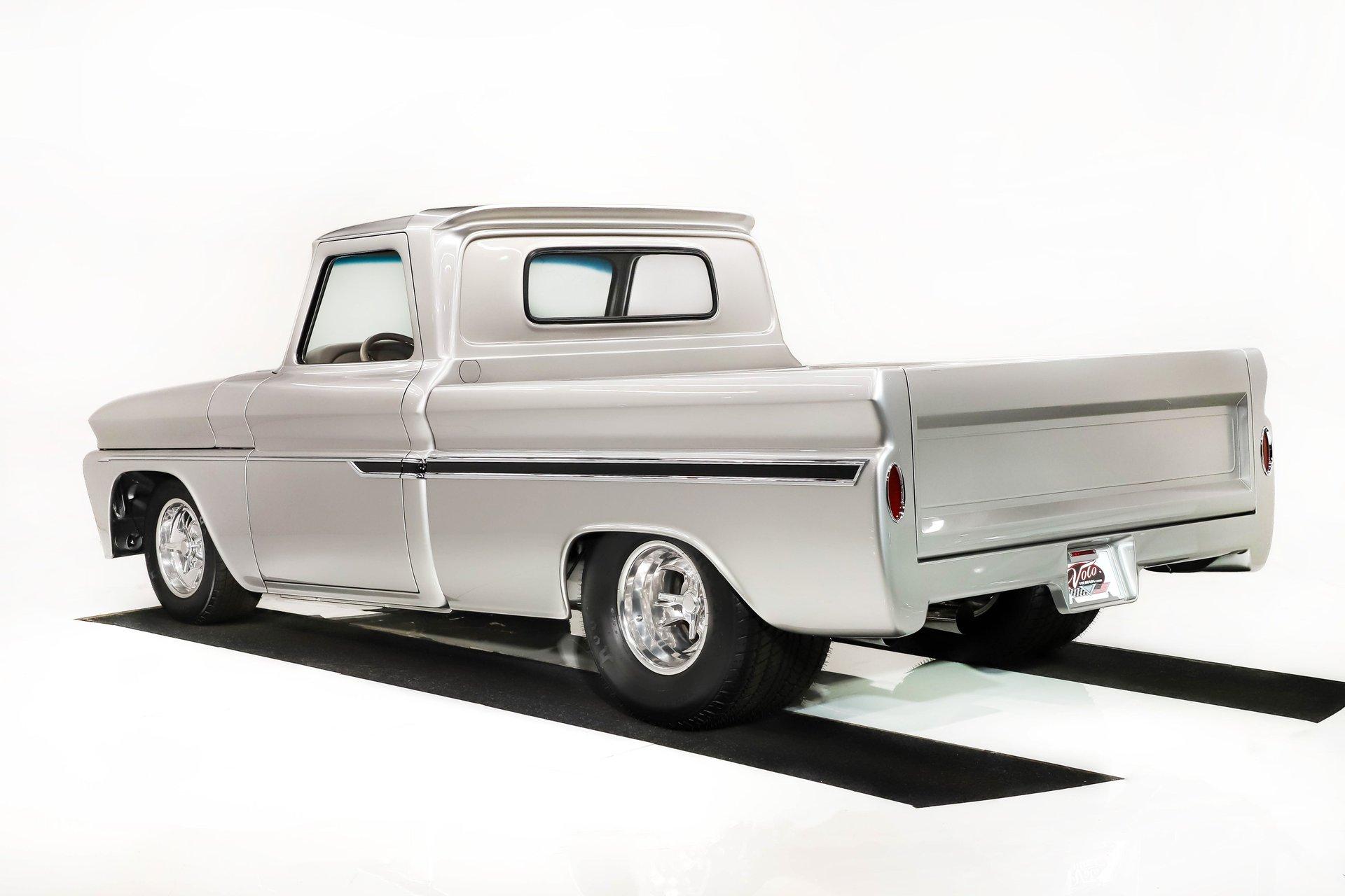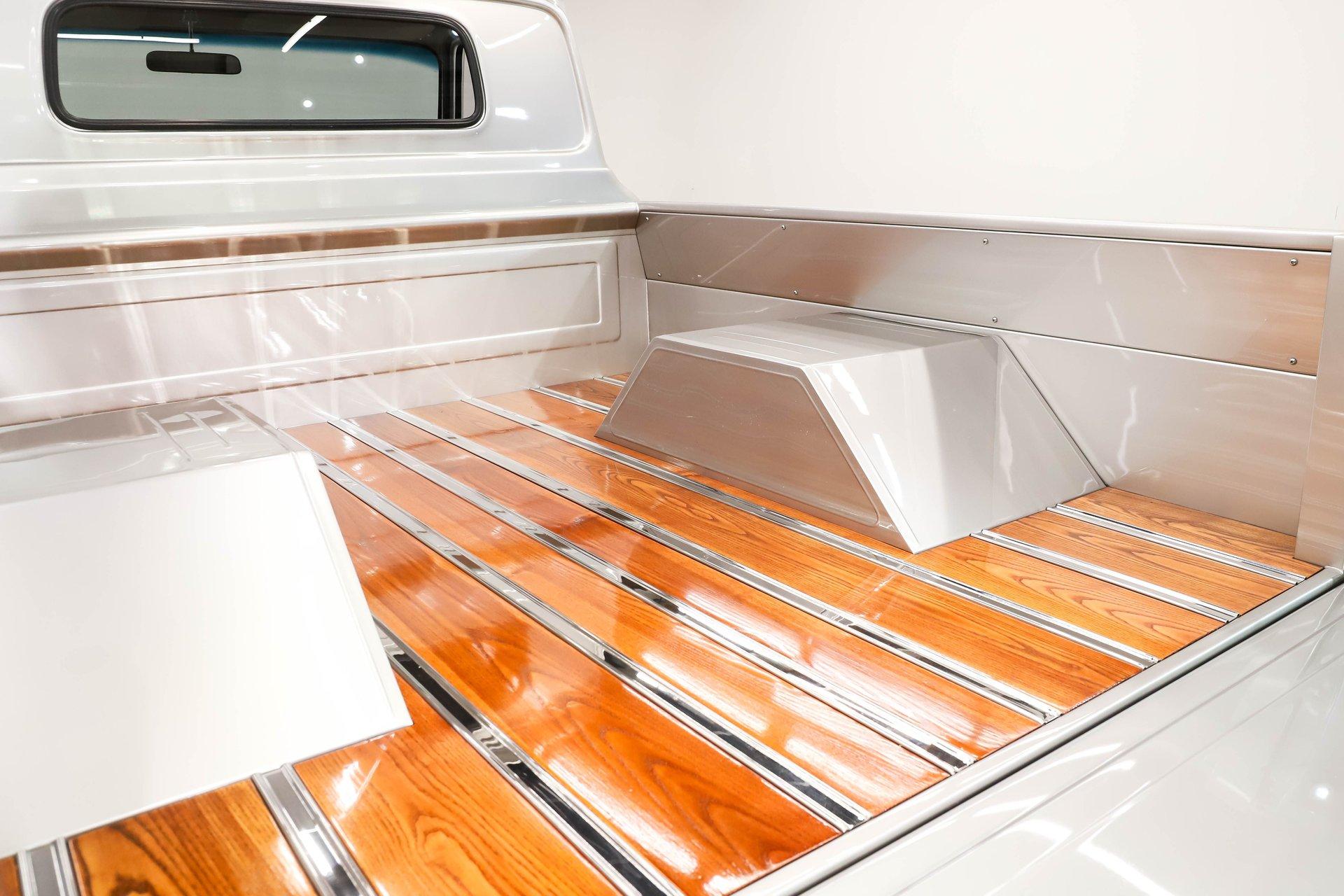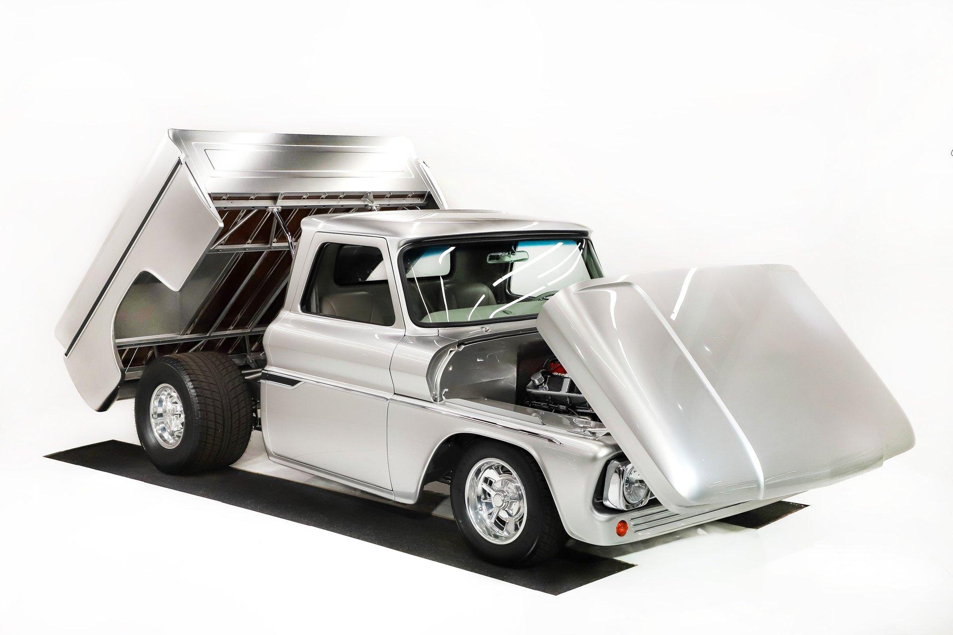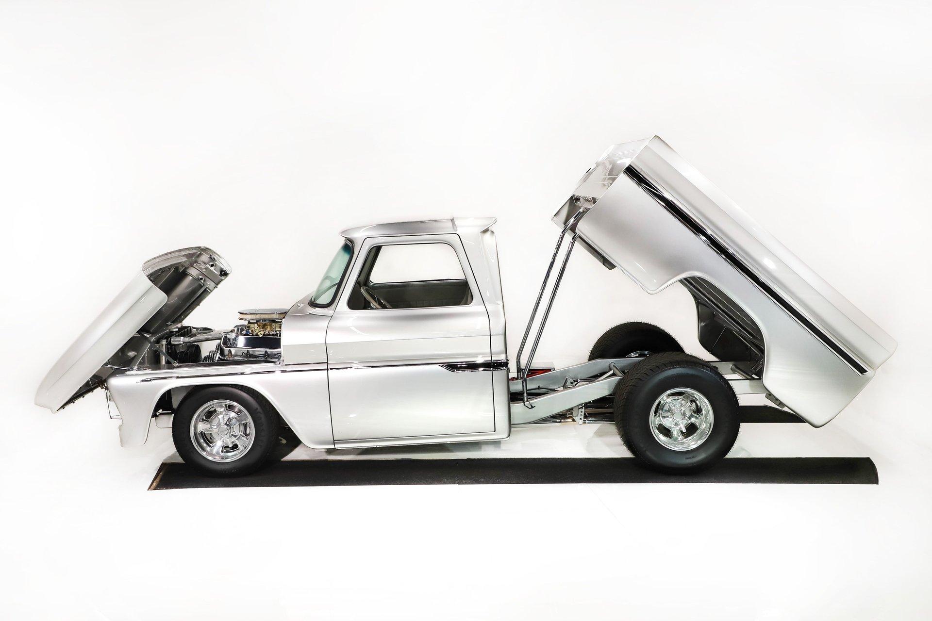 Celebrating our 65 year anniversary! This family owned and operated business was established in 1960, making us the oldest classic car dealership in America. Special thank you to all our customers for entrusting us to park the car of your dreams in your driveway while preserving automotive history for future generations to embrace and enjoy. -Grams family & Volo Museum staff The best in existence! Only 25 test miles on a breathtaking bespoke build. The quality of workmanship is out of this world. The custom tilt bed and hood put it in another stratosphere. Here is a unique opportunity to own a “once in a lifetime, pinnacle build” that was meticulously crafted by expert artisans. Really, anyone can brag about the quality of a vehicle, this is the best of the best. Michael and I were so very impressed with the owner and builder when he told us about the build. The amount of care, pride and effort that went into this truck is insurmountable! EXTERIOR: Beyond exceptionally impressive! It started as a clean southern Tennessee truck that was stripped to bare metal. There are some very significant and many subtle body modifications that were made, the longer you gaze, the more you will see. Looking down the side of the laser straight body is satisfying with its smooth contours and crisp lines. The truck was shaved removing emblems, mirrors, handles, bumpers and even the rain gutters for a clean look. The hood was extensively modified filling in the front vents and turn signals as well as redesigning it to flip forward. The turn signals were relocated to the lower front valance that was completely custom fabricated. The bed actually tilts back to show off the detail of the chassis! The tailgate is also a custom, smoother version of the original. The panels were painstakingly aligned with precise gaps that are right on the money. The doors close easily like a new car and pop open via electric remote key fob (there is also a manual release under the drivers side rocker panel). The high quality paint color is called Light Platinum Metallic and is a 2005 Cadillac XLR color that was tweaked with a very classy and slightly larger metal flake. It is literally polished smooth like a piece of glass, and has a reflection you could shave in. The side trim pieces were hand fabricated from solid brass then clad with show quality chrome. It also has a custom hand fabricated rollpan with an integrated license plate holder. A custom pop up gas door also has a quick fill cap. It was upgraded with nice bright halogen headlights. The handmade LED taillights are one of a kind, and the front turn signals are from a Harley Davidson Night Train. All the glass was replaced, the vent windows were eliminated for a cleaner looking 1 piece glass. The rubber seals are brand new. The entire ensemble is rolling on an awesome set of Halibrand chrome wheels with spinner center caps that are size 15x10 up front, and a ginormous 15×15 out back. They are wrapped in a new set of Hoosier performance radials. INTERIOR: Genuine glove soft leather everywhere! It took 8 cowhides to cover the seats, behind the seats, center console, dashboard, door panels, kick panels, and headliner. The leather was custom dyed at the same time for a perfectly consistent color. The interior smells great, just like a store that sells quality cowboy boots. The freshly upholstered buckets offer great support and comfort, all incorporated with an extremely clean look. They are equipped with modern 3 point shoulder harnesses for safety. All of the controls and switches are neatly concealed in the sliding center console compartment including the electronic push button transmission selector, ignition key cylinder, stereo, power window switches, and climate controls. The console also has speakers built into the side. The emergency brake is tucked away between the console and driver's seat. The gauges by Classic Instruments were the ideal choice matching the color and style of this truck so well. Air vents were added to the dash for the modern air conditioning system. A new tilt column was custom painted to match the upholstery and also has a leather wrapped billet steering wheel. Even the gas and brake pedals are new and upgraded to billet aluminum. The plush carpeting was custom cut and molded to fit tight with nicely bound edges. ENGINE COMPARTMENT: Professionally built! A 454 block was bored .030 over making it a 468 cubic inch V8 dyno tuned at 585 horsepower and 589 ft lbs of torque while running on pump gas. It was assembled utilizing the best parts available, they were part of a high quality kit which included the crank, rods, pistons and all the other internals. It was purchased from Reher Morrison Racing Engines, then precisely assembled by John Gosh from Motors by Gosh. Everything that could be balanced and rollered internally was. It has new Brodix heads, an Edelbrock intake manifold, and a giant Holley carburetor sitting on top. A really nice set of block hugger headers flank the sides. It is equipped with modern air conditioning, power steering, and a HEI ignition. The radiator was replaced and upgraded to a large unit with dual electric fans. Polished pulleys, a chrome air cleaner, and chrome valve covers dress up the bay nicely. The compartment has a custom cut firewall that was completely smoothed, and custom fabricated fenderwells too. The reverse opening hood is just too cool. Making things look so clean and tidy is like performing magic; and the builder of this truck was a true wizard! TRUNK COMPARTMENT: Tilt bed! Super spotless! Custom latches release the mechanism then the tailgate is held up by self retracting steel cables. Inside the jamb is painted slick just like the exterior. The rear wheel wells have been tubbed to accommodate the huge tires. The side walls have custom made panels that give it a very clean look. All the painted areas are finished to the same quality as the body. The floor was redone with nice thick oak slats and po