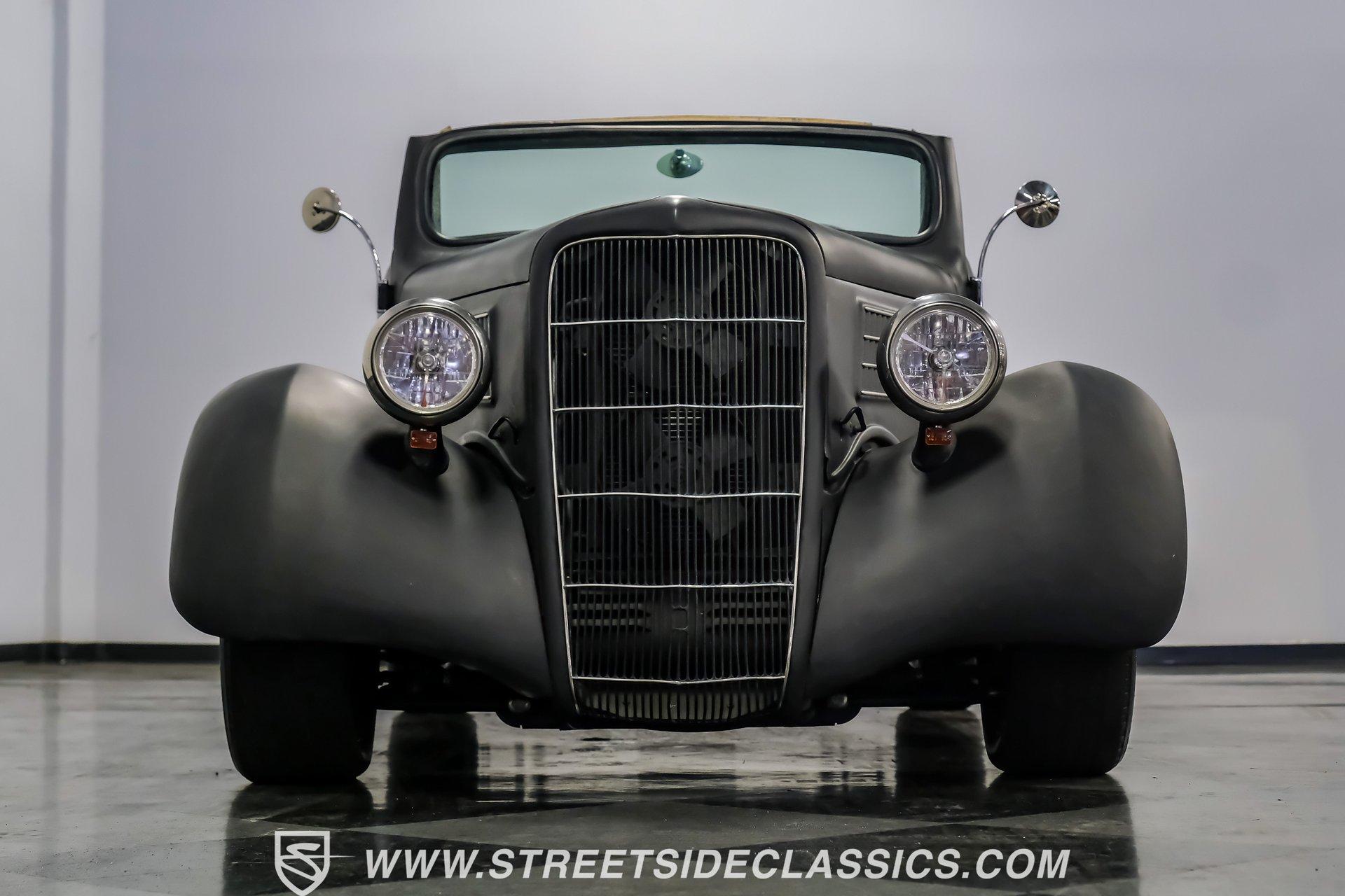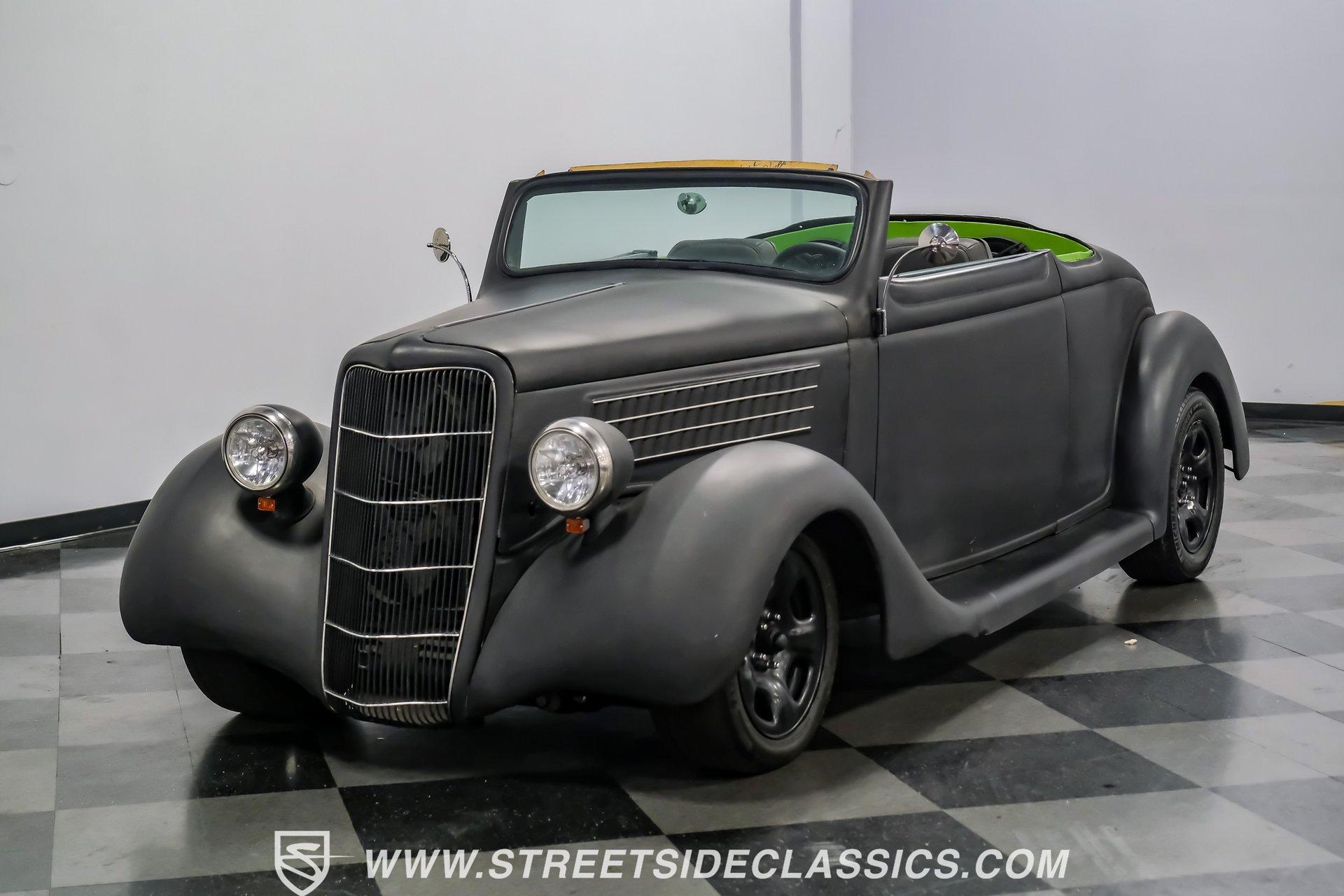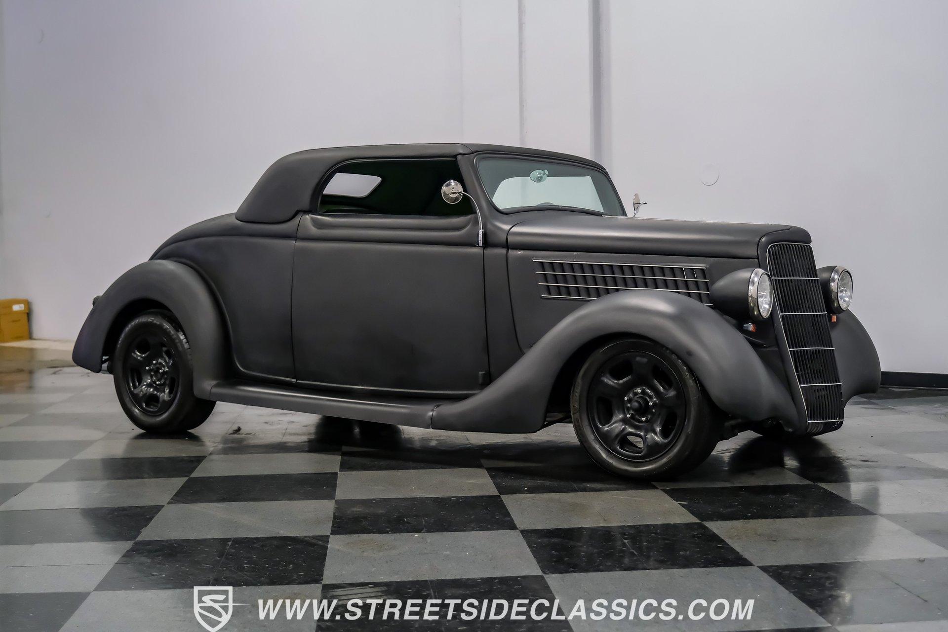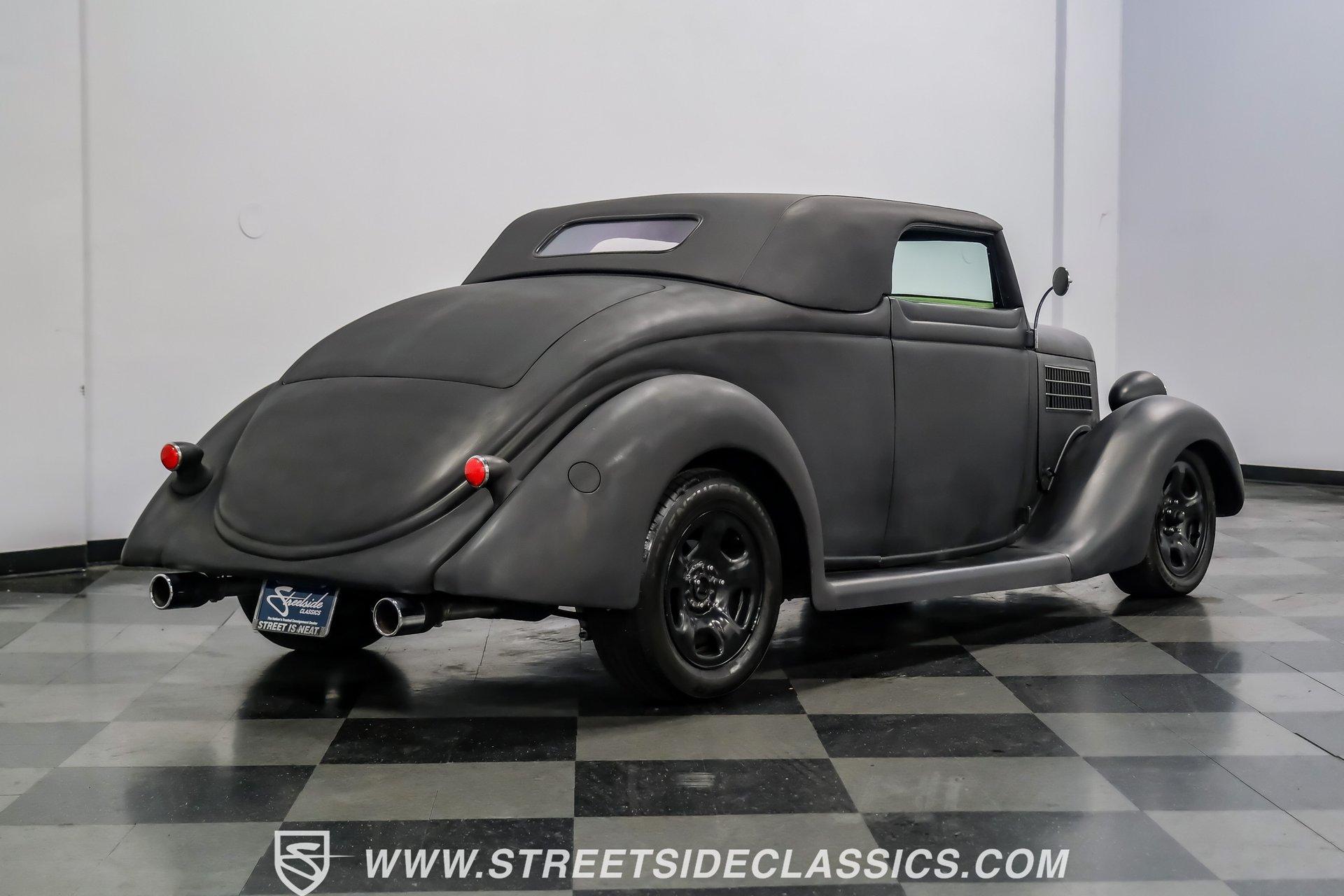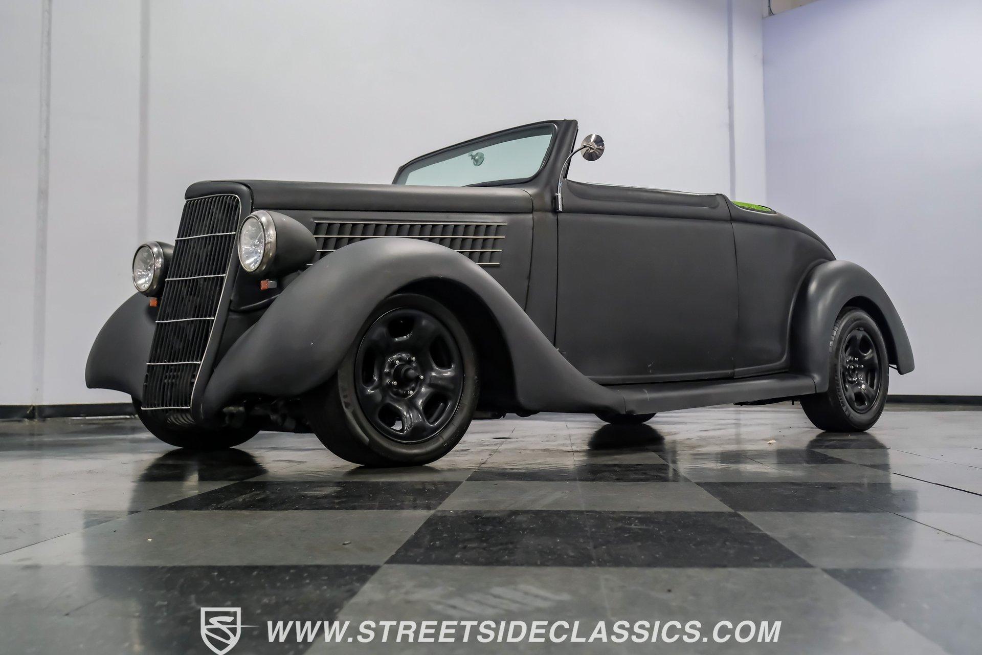 There is something irresistible about stepping into a vintage roadster that wears the past and the present at the same time. This car speaks to the builder who wanted classic lines with modern punch, a rolling statement that turns heads whether parked at a show or rolled down a coastal boulevard. It invites you to imagine weekend drives, the sound of a V8, and the satisfaction of owning something one of a kind. For the driver who values style and performance, this 1935 Ford Cabriolet Restomod, wearing a full flat black paint and powered by a 5.7L LS1 V8 and paired with a 4-speed automatic, is ready for its next chapter. Inside you will find a custom two-tone interior that prioritizes comfort and show presence over period correctness. The cabin wears aftermarket Pontiac bucket seats, a custom Camaro center console, Intellitronix digital-style gauges, and a dual-brand single-din head unit with Bluetooth, aux and USB. A chrome tilt column with a billet steering wheel adds some feel-good detail and it does come with provisions for air conditioning, but it will need servicing to blow cold again. Power windows operate by remote and the trunk is opened via a switch behind the driver seat. Underhood this Ford hides modern performance. The 5.7L LS1 V8 feeds a 4L60 4-speed automatic and cooling is handled by an aluminum radiator and electric fans which help the engine start right up and run well. The front suspension is a Mustang II-style setup with tubular A-arms while the rear is a solid axle with leaf springs and a 10-bolt posi rear end. Braking is handled by power discs front and rear and the ride sits on 16 inch wheels shod in 205 series tires. The dual exhaust system includes Flowmaster mufflers for an authoritative sound. Highlights: 5.7L LS1 V8 4L60 4-speed automatic transmission Aluminum radiator with electric fans 10-bolt posi rear differential Front suspension includes Mustang II-style with tubular A-arms Power disc brakes front and rear Custom two-tone interior with Pontiac bucket seats, Camaro console, Intellitronix gauges, Bluetooth head unit Vintage air conditioning - needs servicing to blow cold again Flat black repaint with deleted bumpers, flush gas filler, clear headlights, custom removable hard top This 1935 Ford Cabriolet Restomod is a very unique build that will appeal to a buyer seeking character and modern drivability in a classic package. Call today!