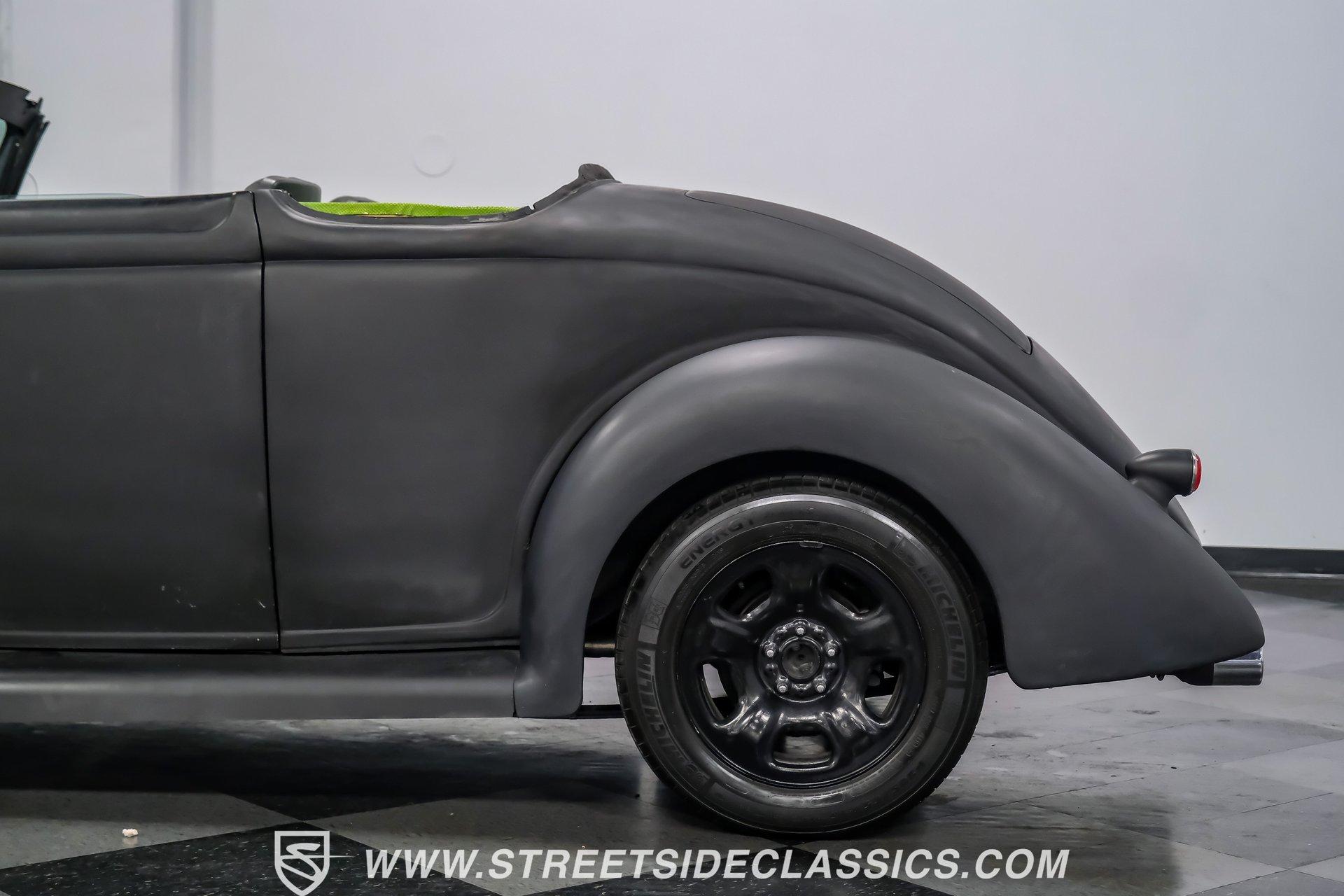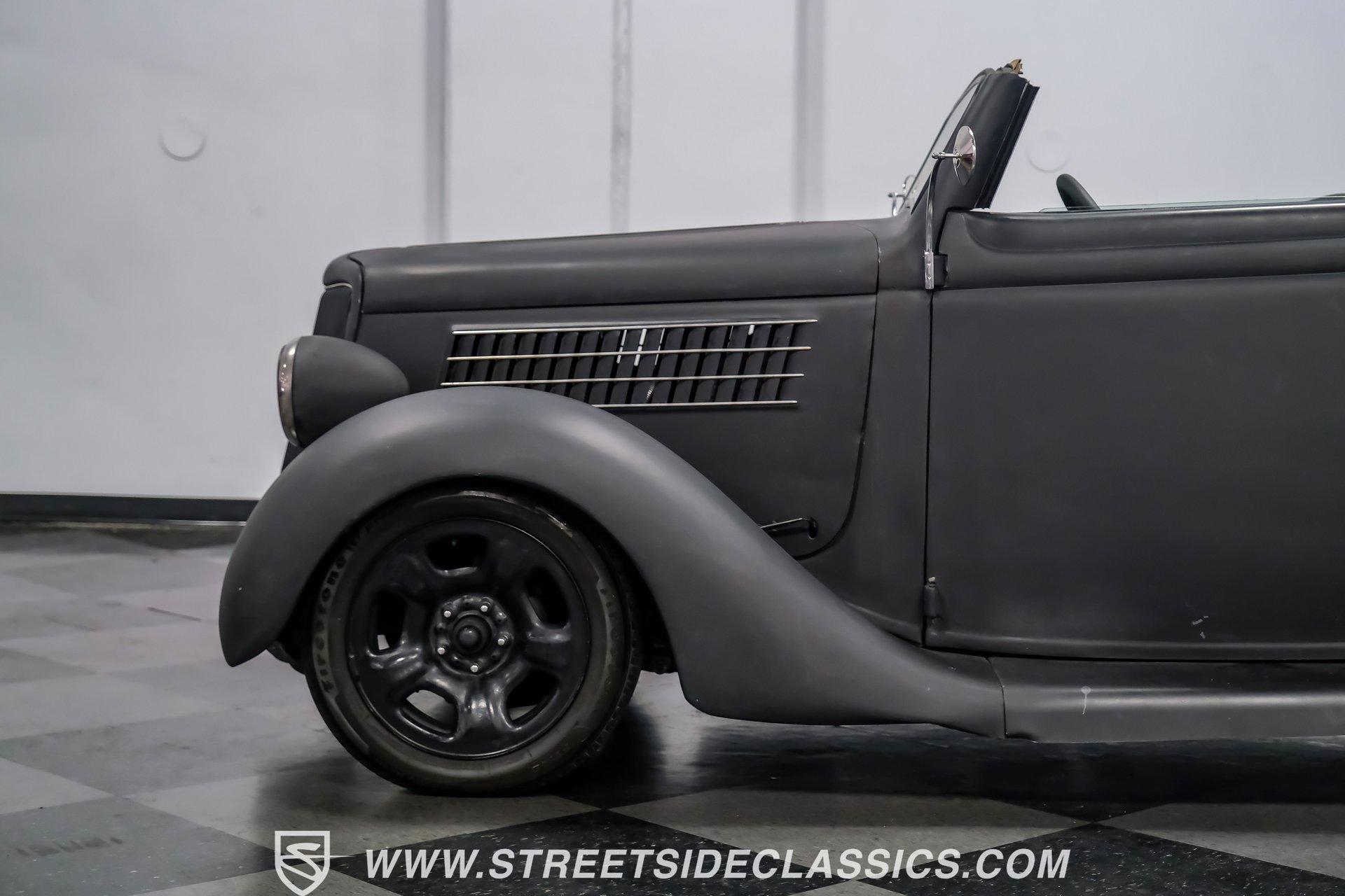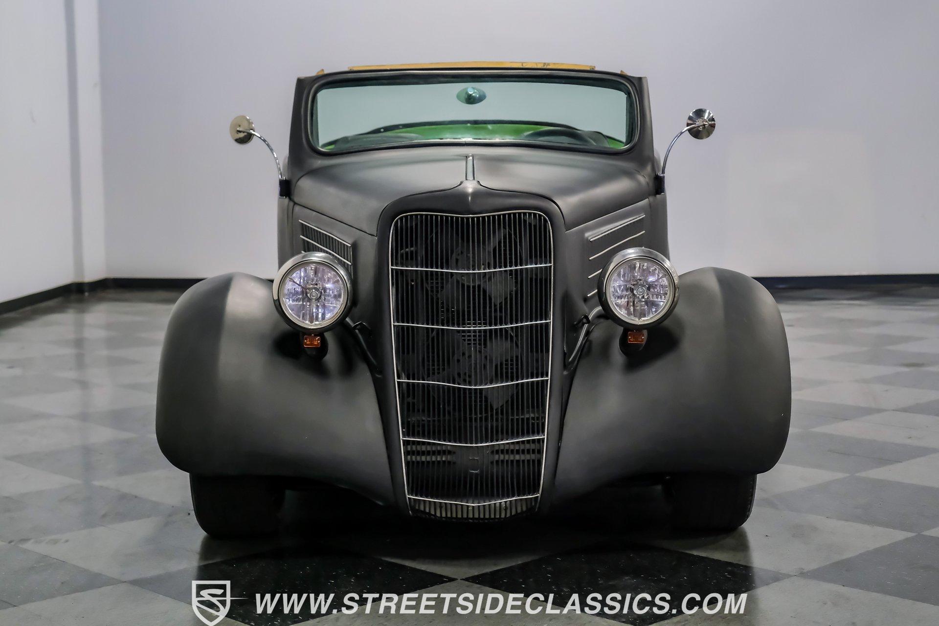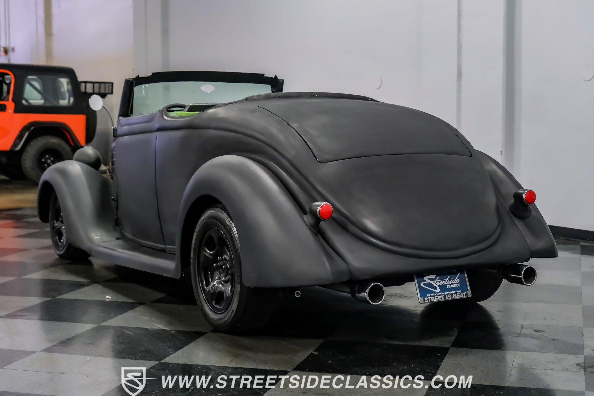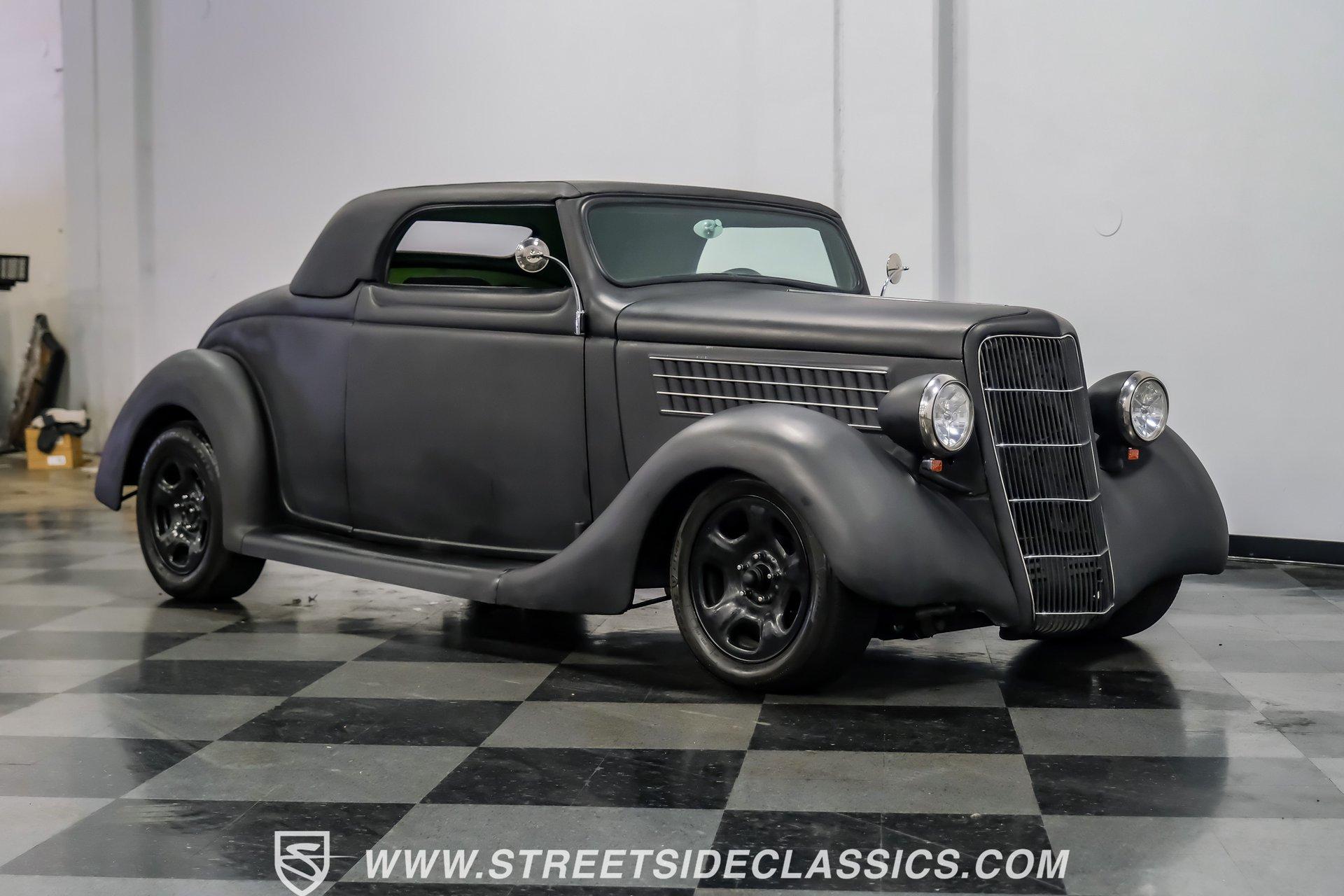 There is something irresistible about stepping into a vintage roadster that wears the past and the present at the same time. This car speaks to the builder who wanted classic lines with modern punch, a rolling statement that turns heads whether parked at a show or rolled down a coastal boulevard. It invites you to imagine weekend drives, the sound of a V8, and the satisfaction of owning something one of a kind. For the driver who values style and performance, this 1935 Ford Cabriolet Restomod, wearing a full flat black paint and powered by a 5.7L LS1 V8 and paired with a 4-speed automatic, is ready for its next chapter. Inside you will find a custom two-tone interior that prioritizes comfort and show presence over period correctness. The cabin wears aftermarket Pontiac bucket seats, a custom Camaro center console, Intellitronix digital-style gauges, and a dual-brand single-din head unit with Bluetooth, aux and USB. A chrome tilt column with a billet steering wheel adds some feel-good detail and it does come with provisions for air conditioning, but it will need servicing to blow cold again. Power windows operate by remote and the trunk is opened via a switch behind the driver seat. Underhood this Ford hides modern performance. The 5.7L LS1 V8 feeds a 4L60 4-speed automatic and cooling is handled by an aluminum radiator and electric fans which help the engine start right up and run well. The front suspension is a Mustang II-style setup with tubular A-arms while the rear is a solid axle with leaf springs and a 10-bolt posi rear end. Braking is handled by power discs front and rear and the ride sits on 16 inch wheels shod in 205 series tires. The dual exhaust system includes Flowmaster mufflers for an authoritative sound. Highlights: 5.7L LS1 V8 4L60 4-speed automatic transmission Aluminum radiator with electric fans 10-bolt posi rear differential Front suspension includes Mustang II-style with tubular A-arms Power disc brakes front and rear Custom two-tone interior with Pontiac bucket seats, Camaro console, Intellitronix gauges, Bluetooth head unit Vintage air conditioning - needs servicing to blow cold again Flat black repaint with deleted bumpers, flush gas filler, clear headlights, custom removable hard top This 1935 Ford Cabriolet Restomod is a very unique build that will appeal to a buyer seeking character and modern drivability in a classic package. Call today!
