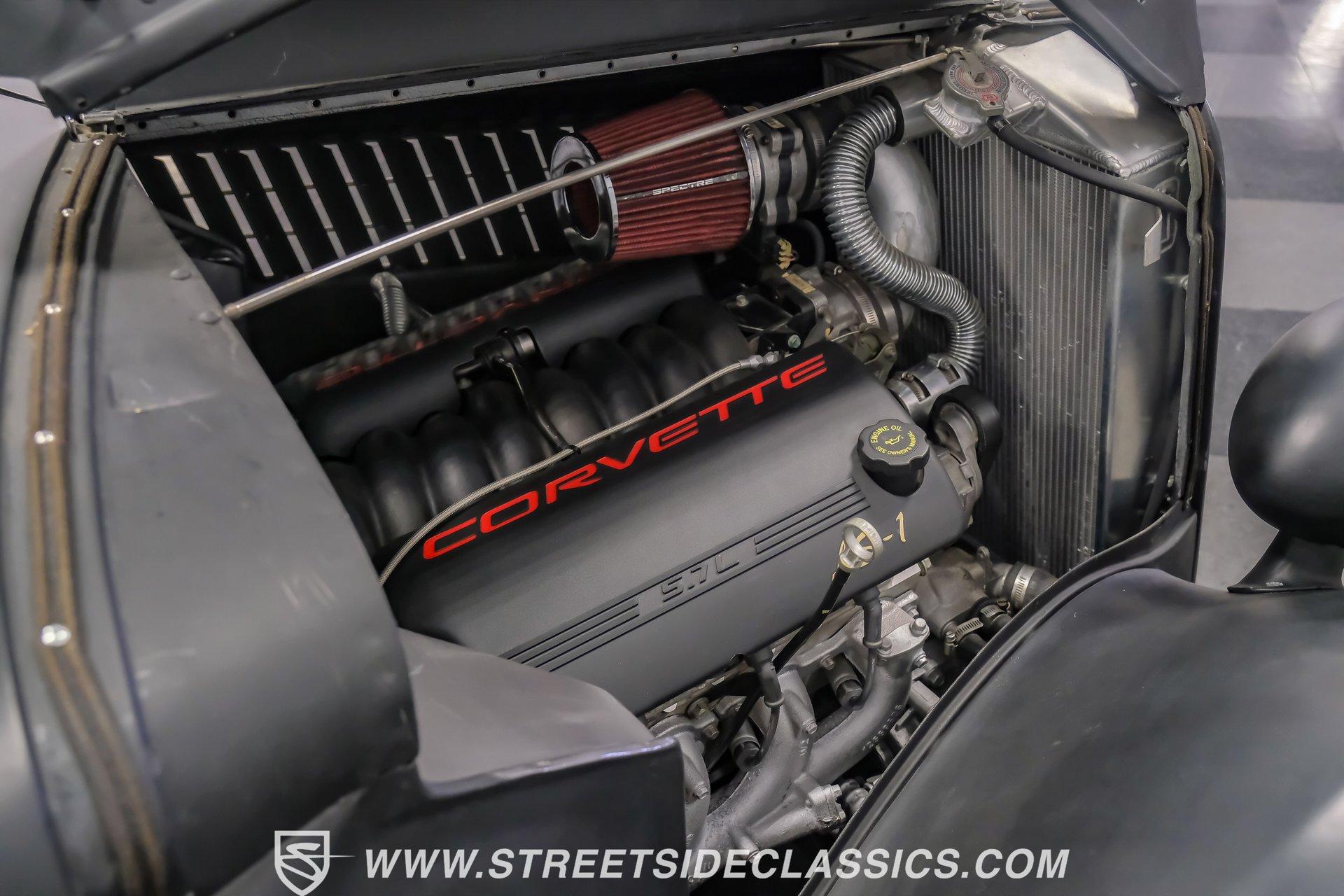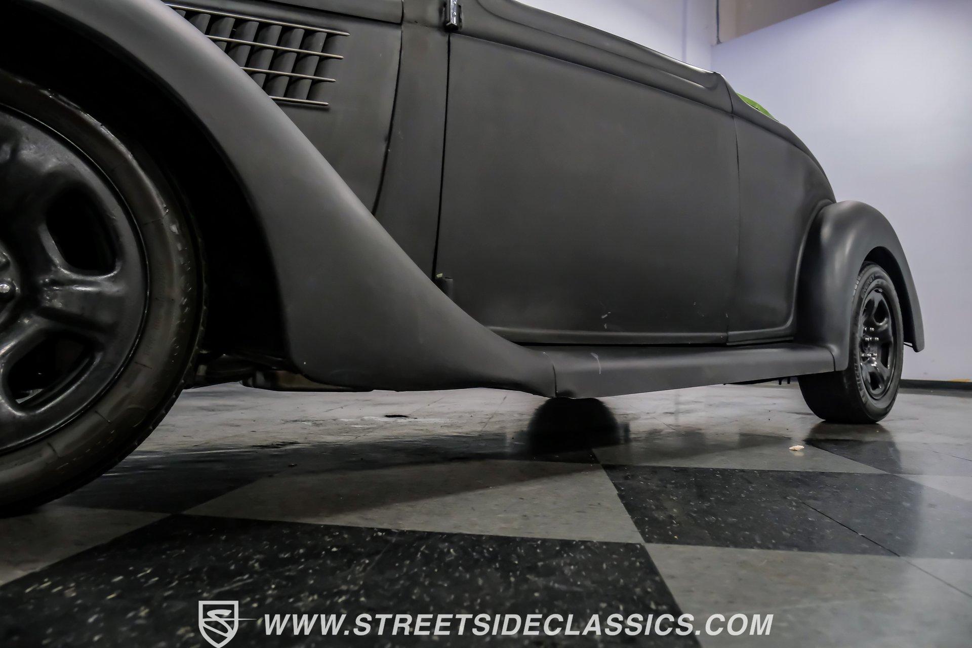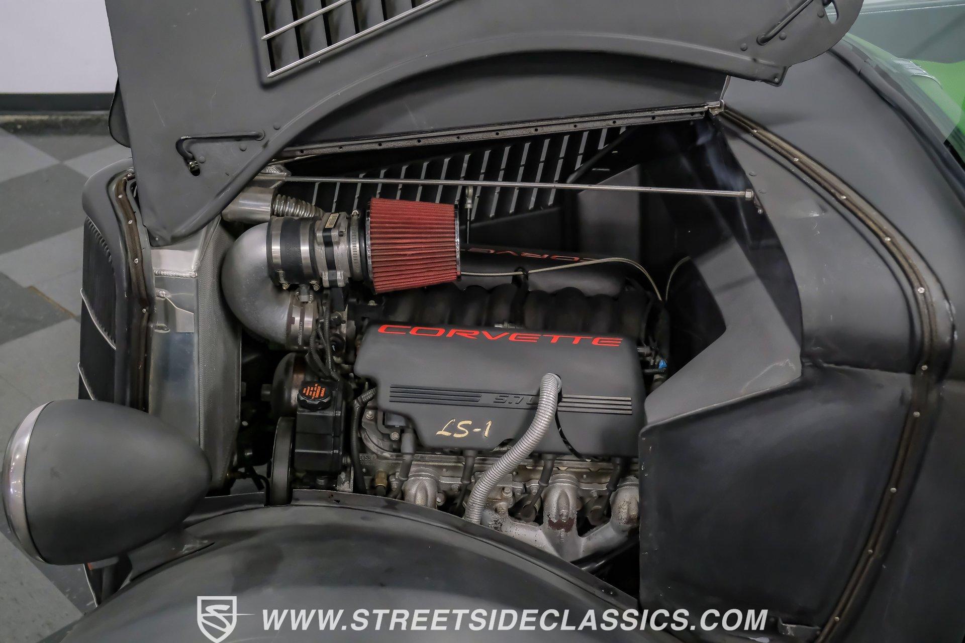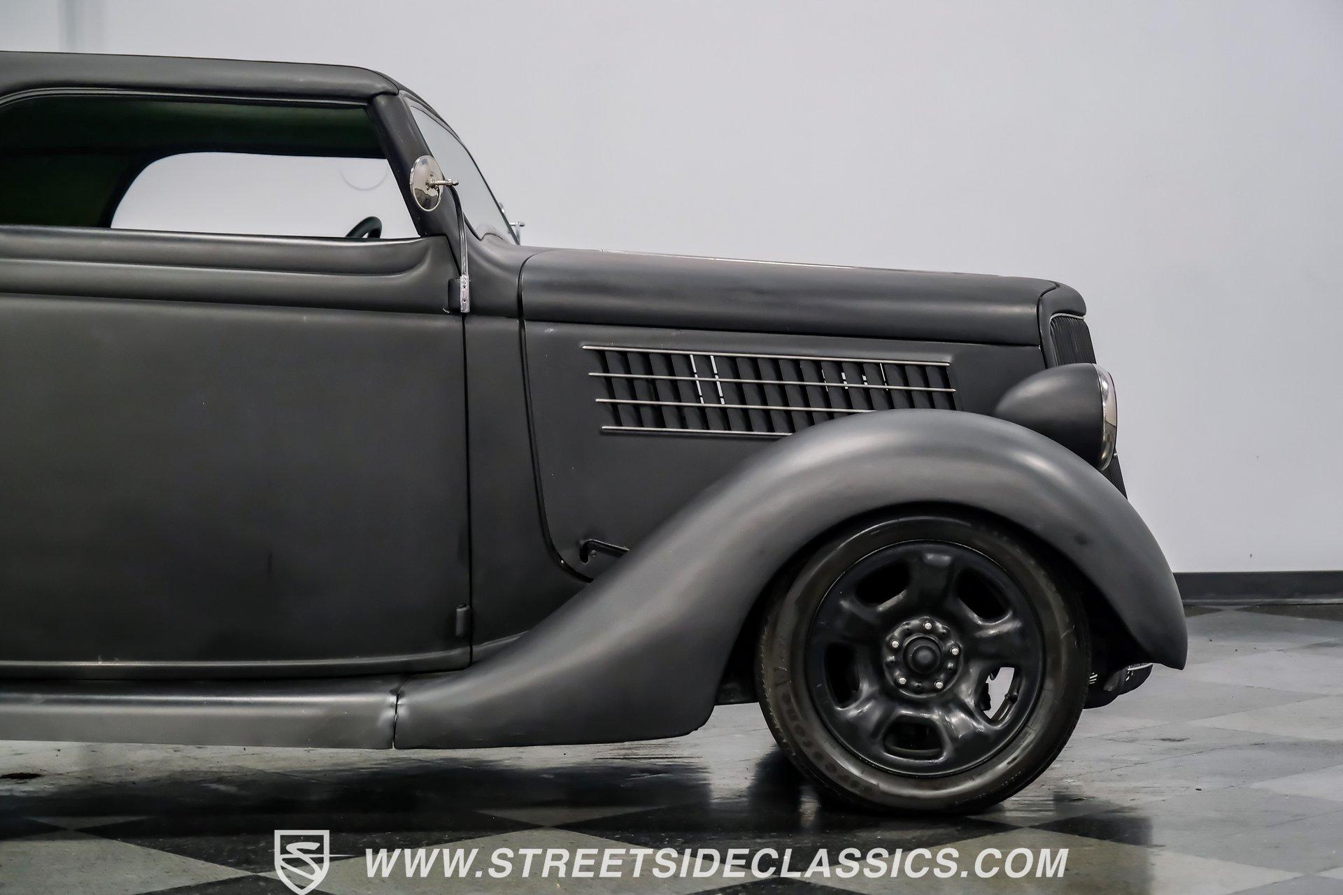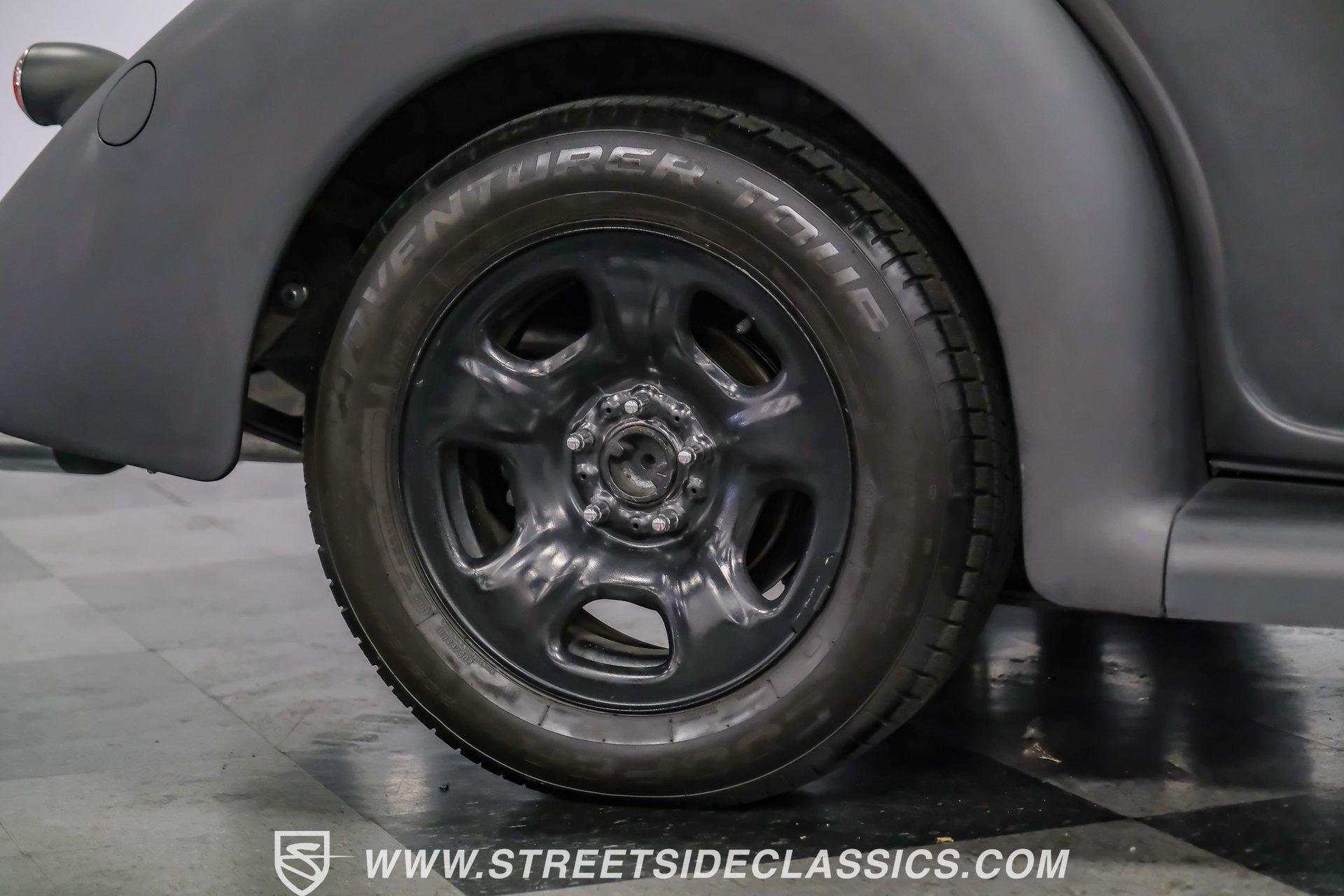 There is something irresistible about stepping into a vintage roadster that wears the past and the present at the same time. This car speaks to the builder who wanted classic lines with modern punch, a rolling statement that turns heads whether parked at a show or rolled down a coastal boulevard. It invites you to imagine weekend drives, the sound of a V8, and the satisfaction of owning something one of a kind. For the driver who values style and performance, this 1935 Ford Cabriolet Restomod, wearing a full flat black paint and powered by a 5.7L LS1 V8 and paired with a 4-speed automatic, is ready for its next chapter. Inside you will find a custom two-tone interior that prioritizes comfort and show presence over period correctness. The cabin wears aftermarket Pontiac bucket seats, a custom Camaro center console, Intellitronix digital-style gauges, and a dual-brand single-din head unit with Bluetooth, aux and USB. A chrome tilt column with a billet steering wheel adds some feel-good detail and it does come with provisions for air conditioning, but it will need servicing to blow cold again. Power windows operate by remote and the trunk is opened via a switch behind the driver seat. Underhood this Ford hides modern performance. The 5.7L LS1 V8 feeds a 4L60 4-speed automatic and cooling is handled by an aluminum radiator and electric fans which help the engine start right up and run well. The front suspension is a Mustang II-style setup with tubular A-arms while the rear is a solid axle with leaf springs and a 10-bolt posi rear end. Braking is handled by power discs front and rear and the ride sits on 16 inch wheels shod in 205 series tires. The dual exhaust system includes Flowmaster mufflers for an authoritative sound. Highlights: 5.7L LS1 V8 4L60 4-speed automatic transmission Aluminum radiator with electric fans 10-bolt posi rear differential Front suspension includes Mustang II-style with tubular A-arms Power disc brakes front and rear Custom two-tone interior with Pontiac bucket seats, Camaro console, Intellitronix gauges, Bluetooth head unit Vintage air conditioning - needs servicing to blow cold again Flat black repaint with deleted bumpers, flush gas filler, clear headlights, custom removable hard top This 1935 Ford Cabriolet Restomod is a very unique build that will appeal to a buyer seeking character and modern drivability in a classic package. Call today!