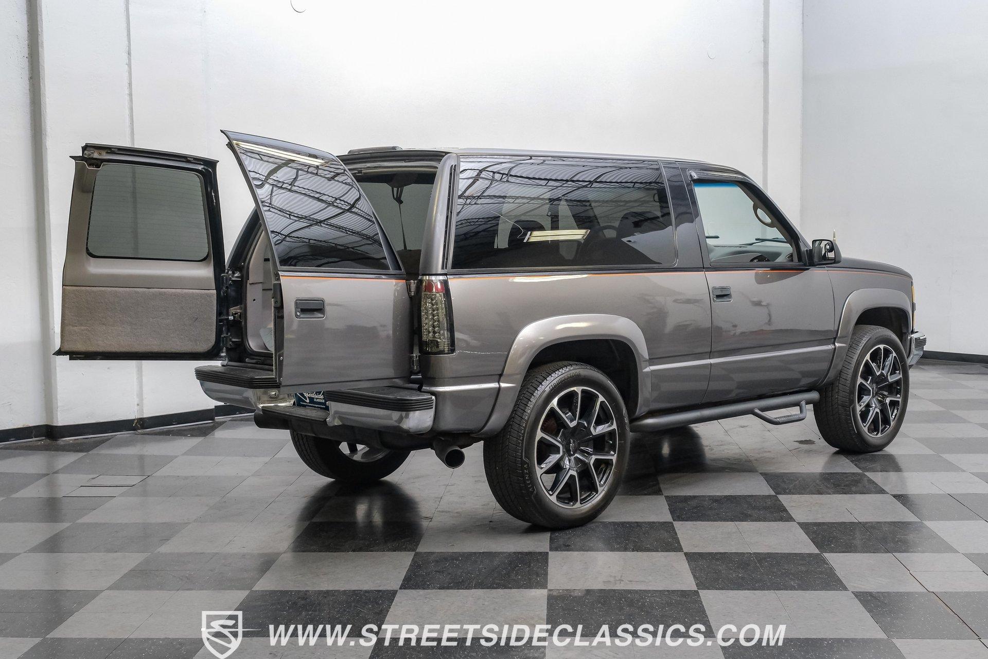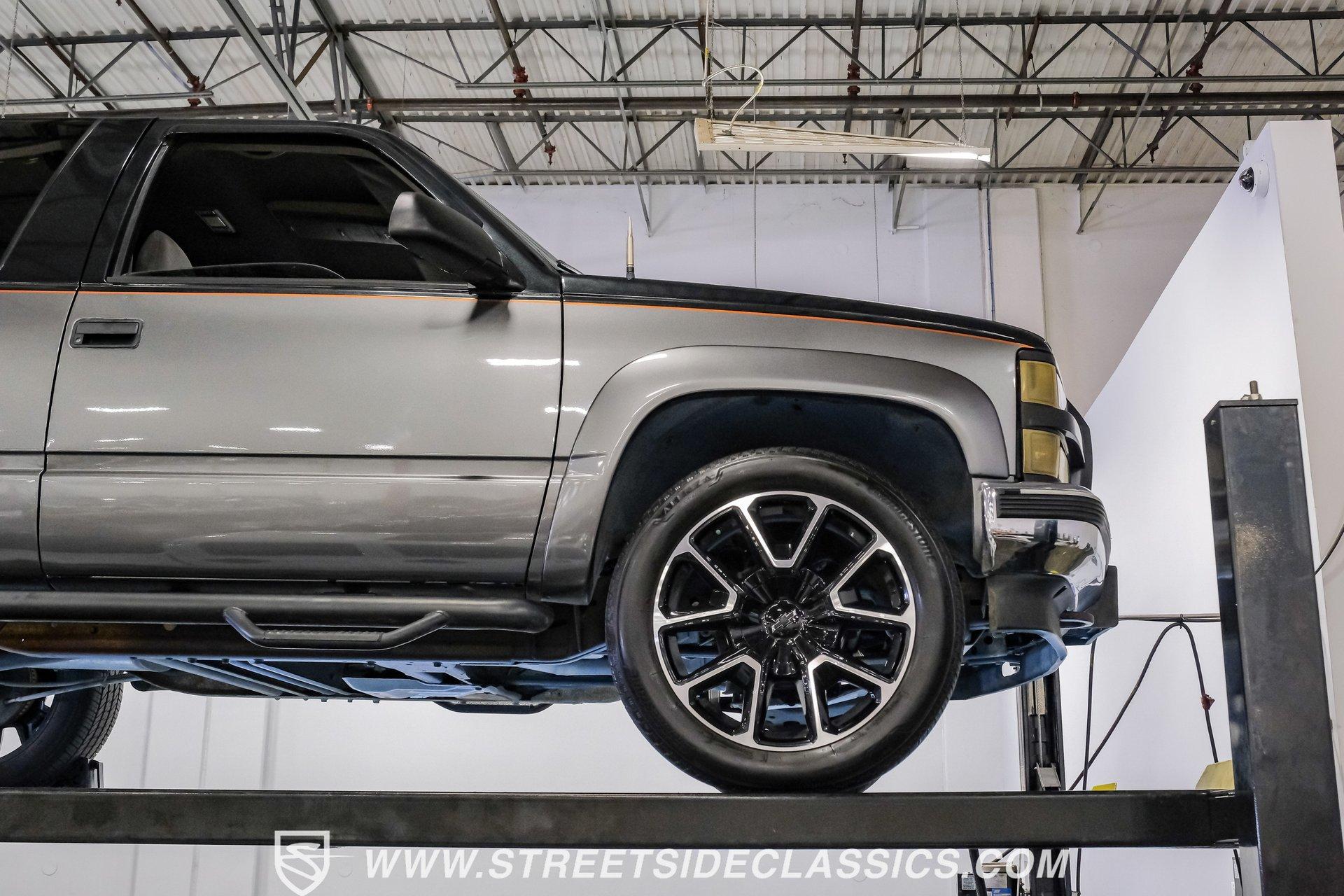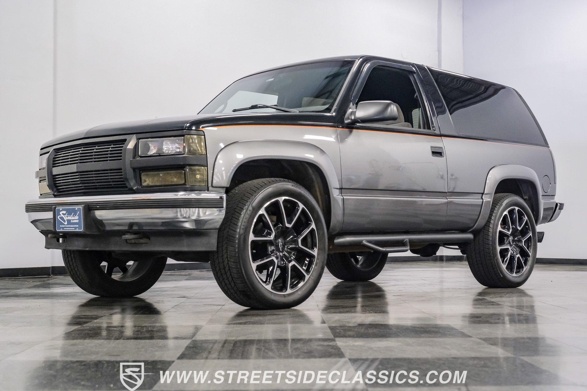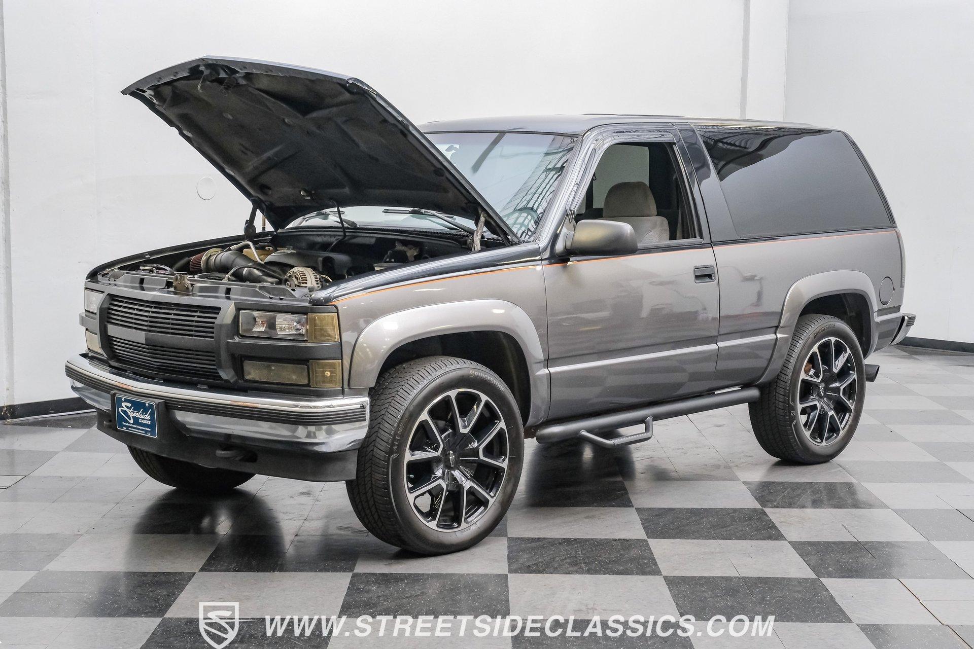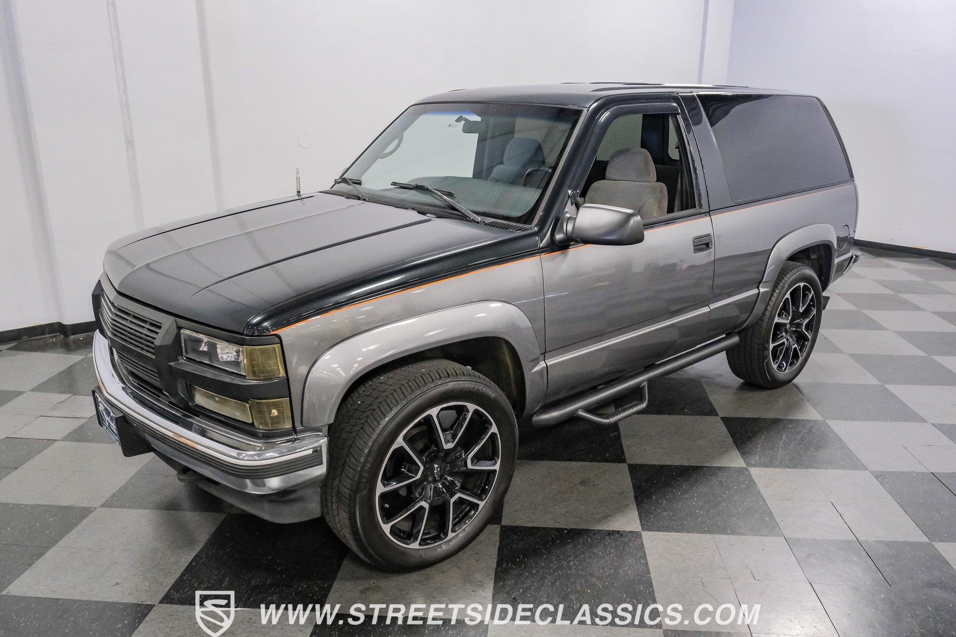 There is something about a two-door SUV that still captures the imagination. It reads like a time capsule from an era when trucks were simple, tough, and full of character. This Tahoe has been given a thoughtful twist that hints at what the next generation might have become if it had been allowed to evolve: modern presence with classic attitude. With hints of updated styling and a purposeful stance that turns heads, this is a truck that makes a statement and begs to be driven, especially as a 1995 Chevrolet Tahoe fitted with a Gen3 6.0 LQ9 V8 and 4L60E automatic transmission. Step inside and you will find a mostly stock layout with a few modern comforts. The cabin features cold blowing air conditioning, Dakota digital style gauges and a double din Kenwood head unit with Bluetooth, AM/FM, and a backup camera. Power driver seat, power windows, locks, mirrors, tilt wheel, and cruise control add convenience. Under the hood is a Gen3 6.0 LQ9 V8 sourced from a later Cadillac Escalade, paired with a 4L60E four speed automatic. The setup includes a big intake, mild cam, and headers, with the GM engine control module relocated just under the factory ECM. The truck starts readily and drives well while the front braking is power disc with rear power drum, steering is power assisted, and the rear is built around a 10 bolt axle. Rolling stock includes 22 inch wheels with Bridgestone 275/50R22 tires from 2021 that give it a modern, planted look. Highlights: Gen3 6.0 LQ9 V8 swap from a Cadillac Escalade 4L60E four speed automatic transmission Engine upgrades include a large intake, mild cam, and headers 10 bolt rear axle Front power disc brakes and rear power drum 22 inch wheels with 275/50R22 Bridgestone tires Full repaint with metallic flake Aftermarket grille and taillights Dakota style digital gauges, Kenwood double din with backup camera, Power driver seat This two-door Tahoe presents a rare opportunity to own a blend of classic SUV character with modern V8 muscle and contemporary styling cues. It will make a great driver or a solid starting point for further cosmetic finishing. Call today to arrange an appointment or to learn more.