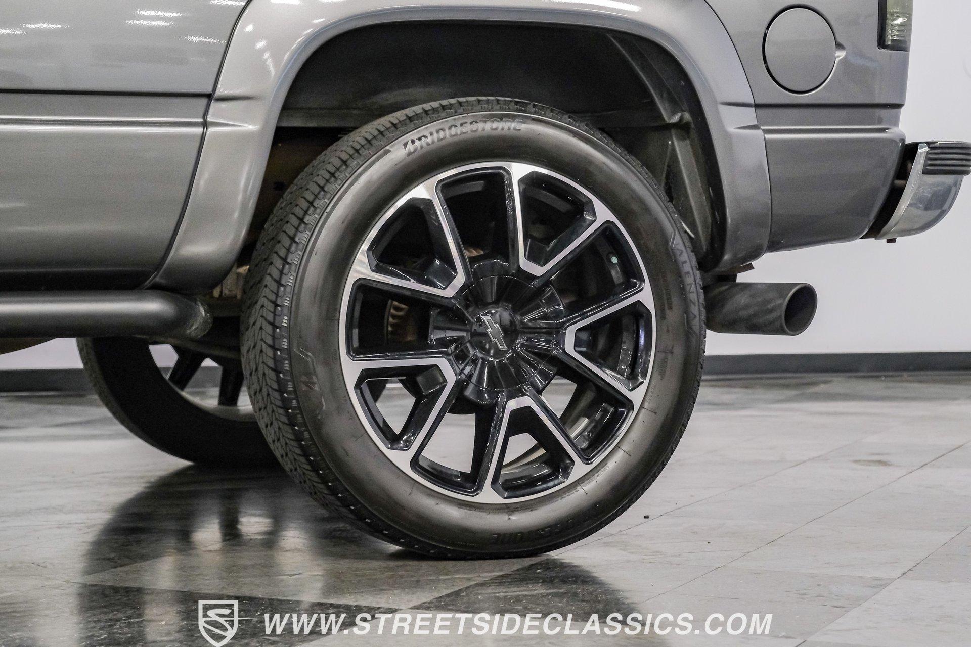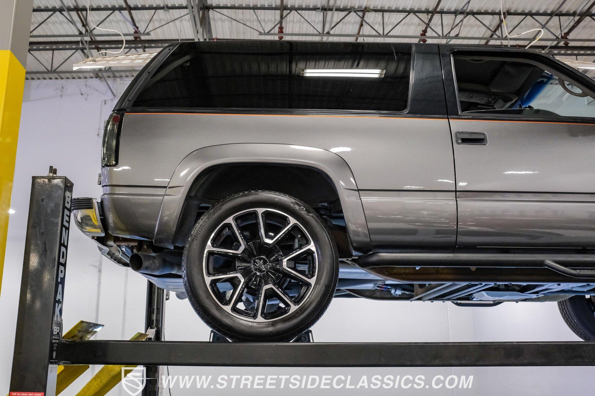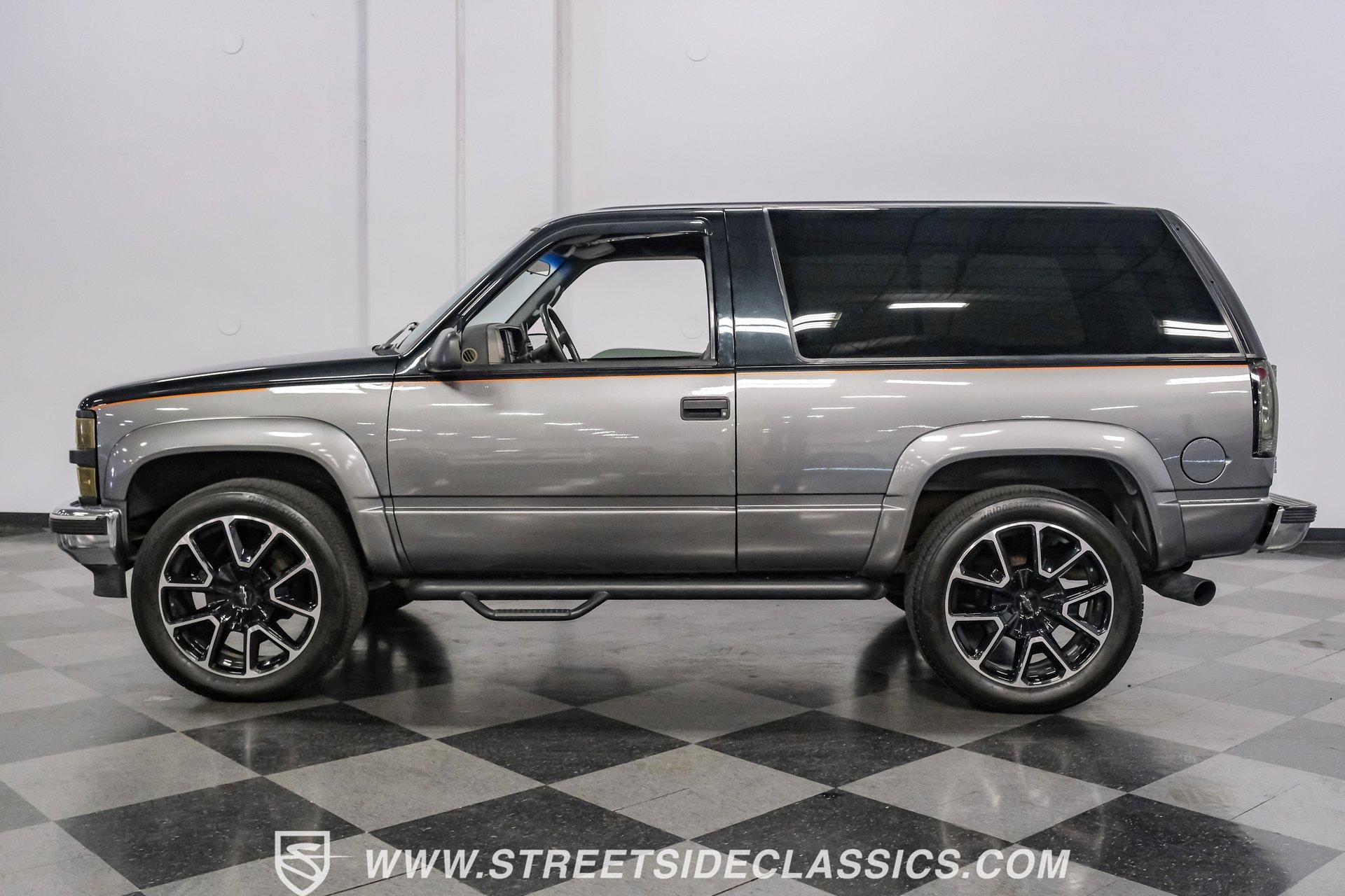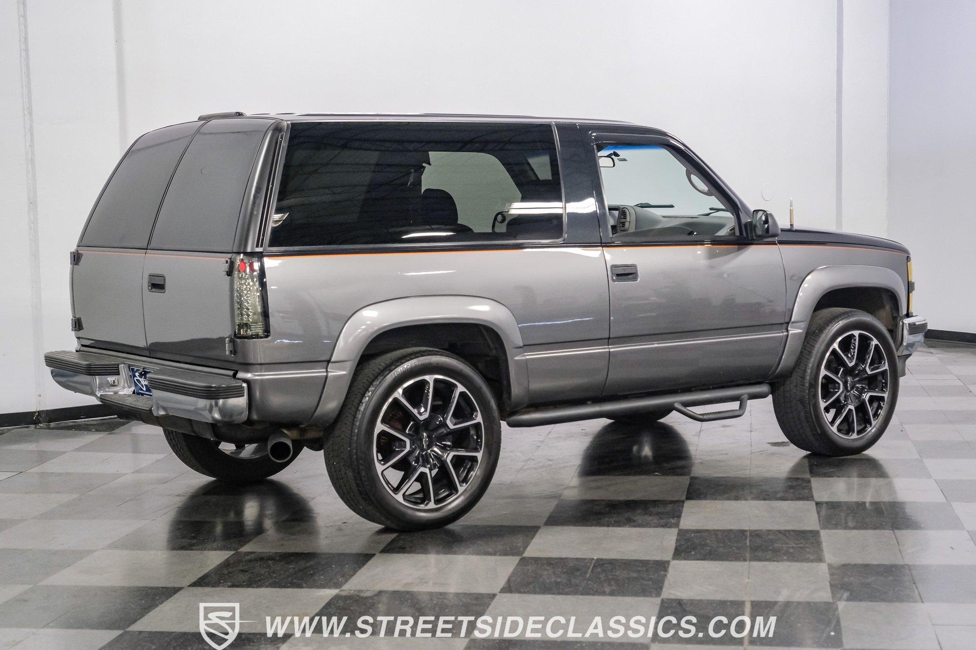 There is something about a two-door SUV that still captures the imagination. It reads like a time capsule from an era when trucks were simple, tough, and full of character. This Tahoe has been given a thoughtful twist that hints at what the next generation might have become if it had been allowed to evolve: modern presence with classic attitude. With hints of updated styling and a purposeful stance that turns heads, this is a truck that makes a statement and begs to be driven, especially as a 1995 Chevrolet Tahoe fitted with a Gen3 6.0 LQ9 V8 and 4L60E automatic transmission. Step inside and you will find a mostly stock layout with a few modern comforts. The cabin features cold blowing air conditioning, Dakota digital style gauges and a double din Kenwood head unit with Bluetooth, AM/FM, and a backup camera. Power driver seat, power windows, locks, mirrors, tilt wheel, and cruise control add convenience. Under the hood is a Gen3 6.0 LQ9 V8 sourced from a later Cadillac Escalade, paired with a 4L60E four speed automatic. The setup includes a big intake, mild cam, and headers, with the GM engine control module relocated just under the factory ECM. The truck starts readily and drives well while the front braking is power disc with rear power drum, steering is power assisted, and the rear is built around a 10 bolt axle. Rolling stock includes 22 inch wheels with Bridgestone 275/50R22 tires from 2021 that give it a modern, planted look. Highlights: Gen3 6.0 LQ9 V8 swap from a Cadillac Escalade 4L60E four speed automatic transmission Engine upgrades include a large intake, mild cam, and headers 10 bolt rear axle Front power disc brakes and rear power drum 22 inch wheels with 275/50R22 Bridgestone tires Full repaint with metallic flake Aftermarket grille and taillights Dakota style digital gauges, Kenwood double din with backup camera, Power driver seat This two-door Tahoe presents a rare opportunity to own a blend of classic SUV character with modern V8 muscle and contemporary styling cues. It will make a great driver or a solid starting point for further cosmetic finishing. Call today to arrange an appointment or to learn more.