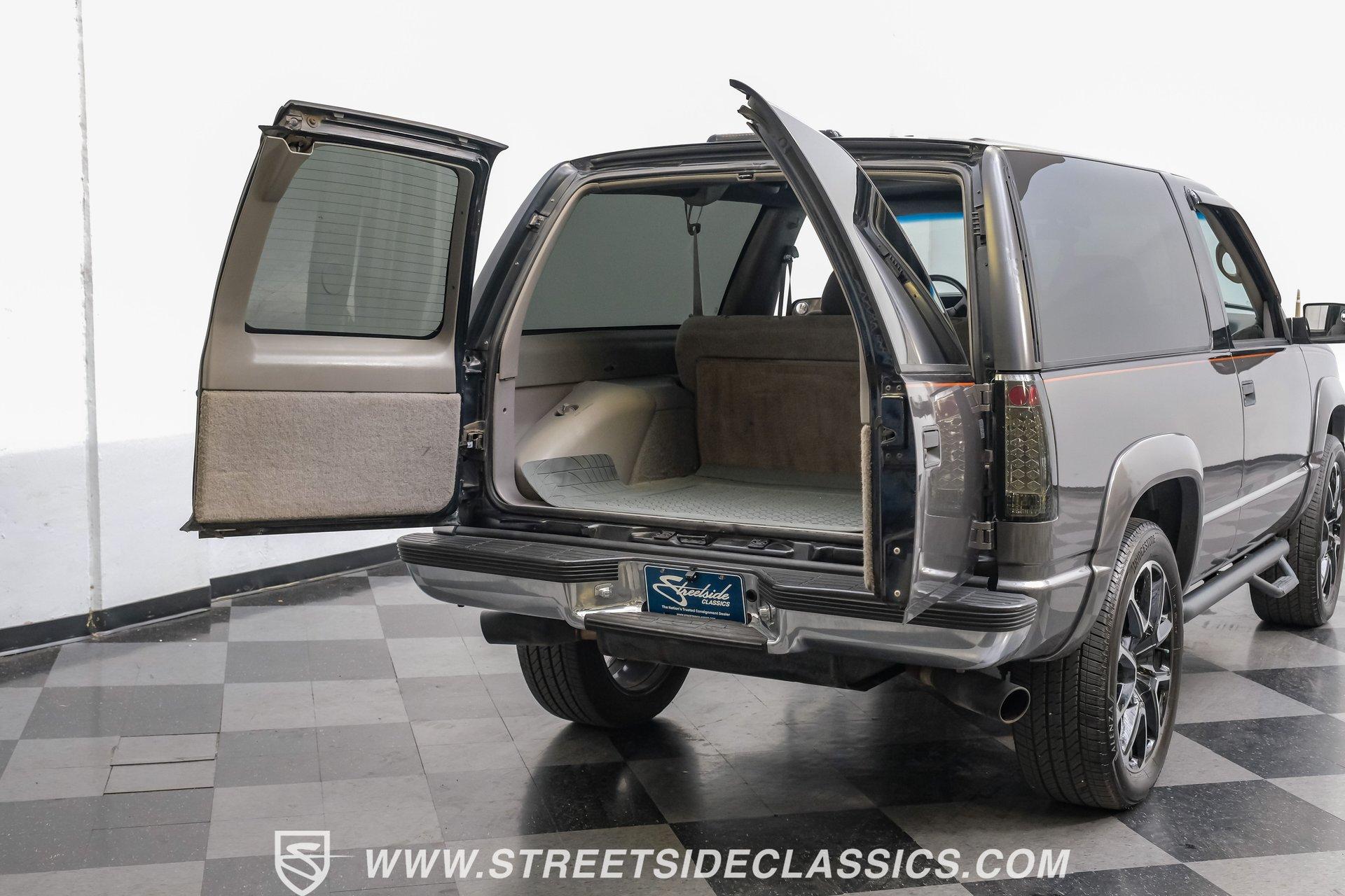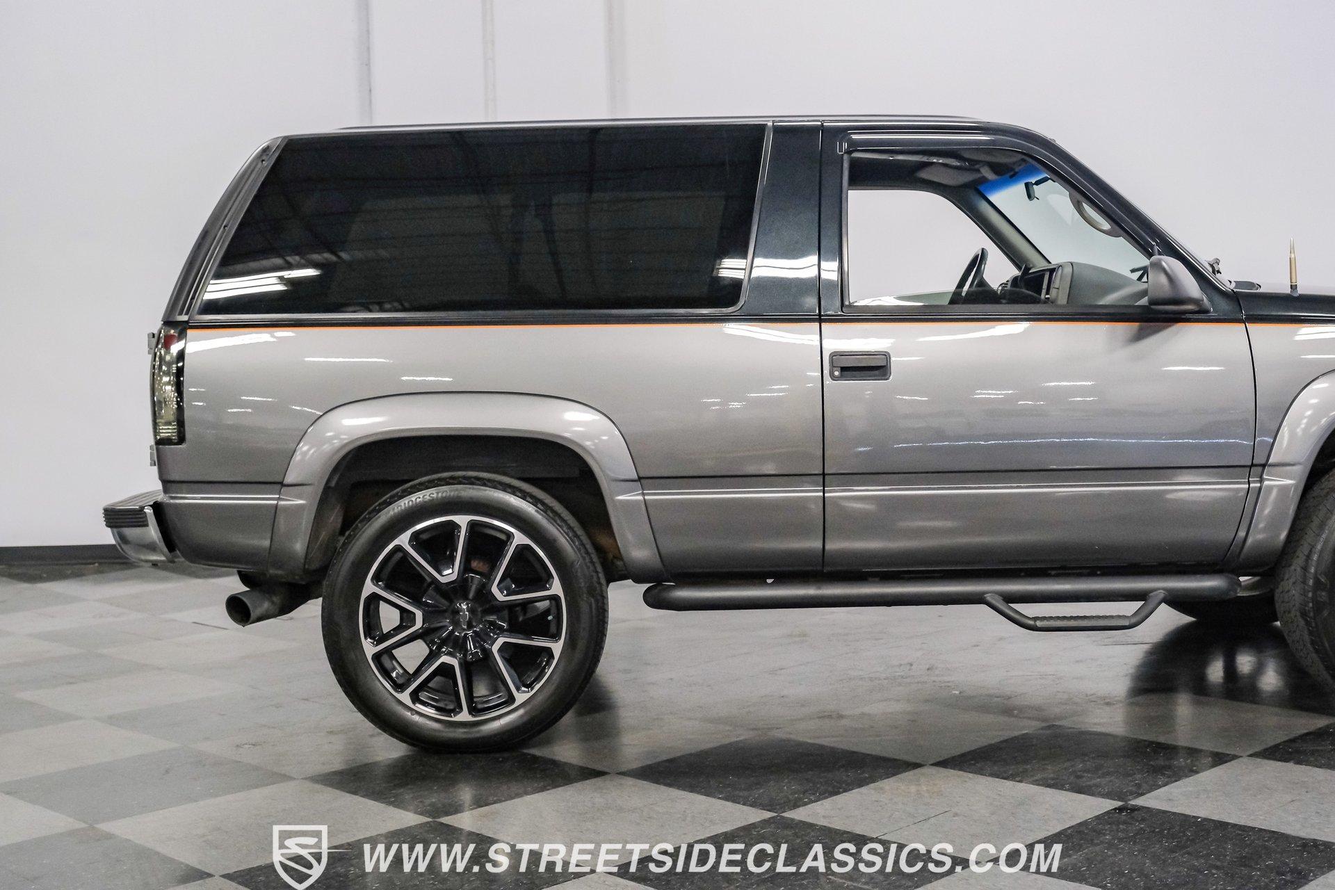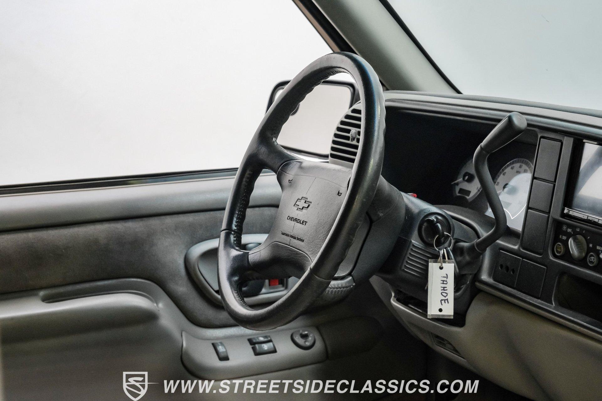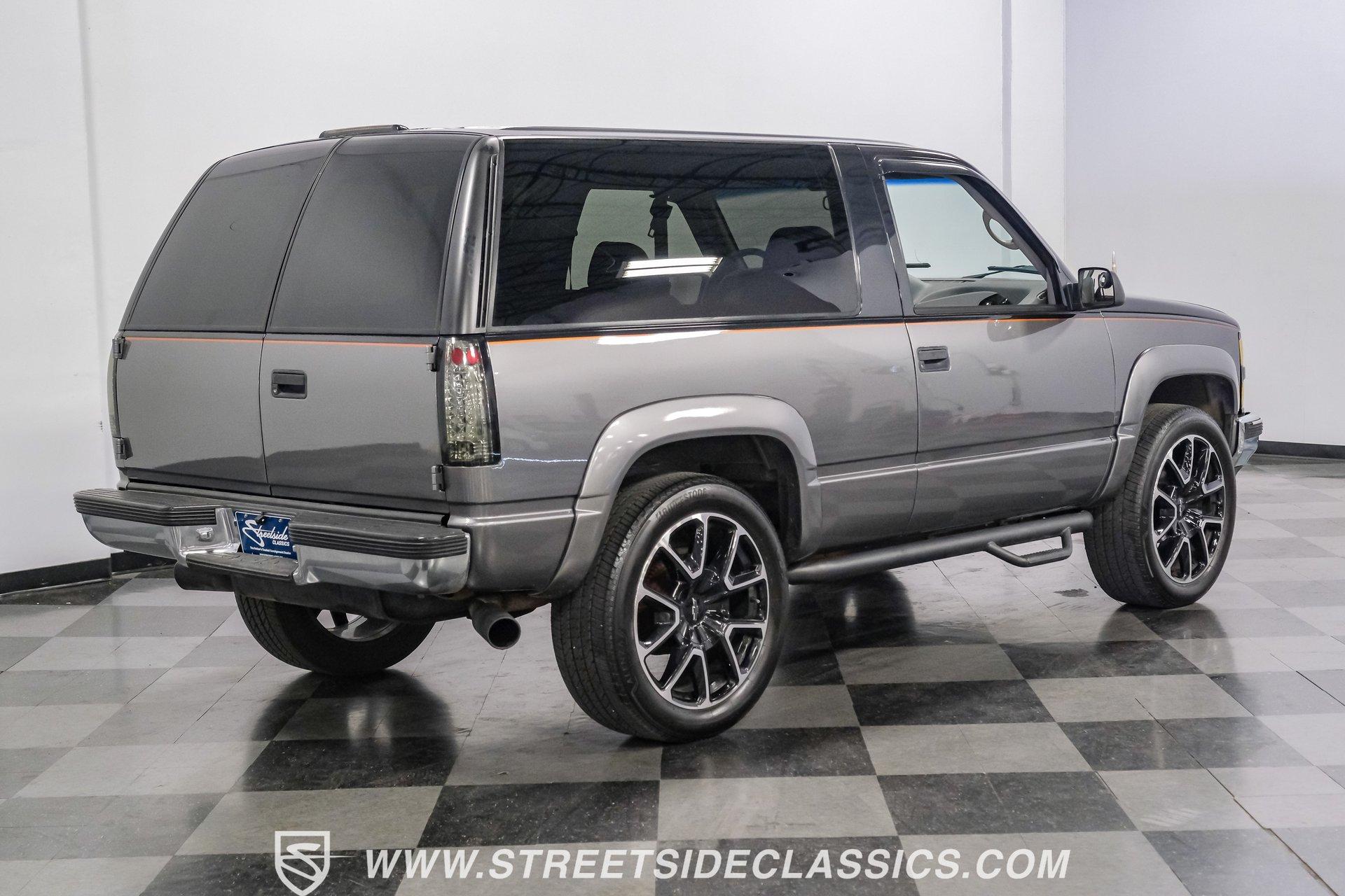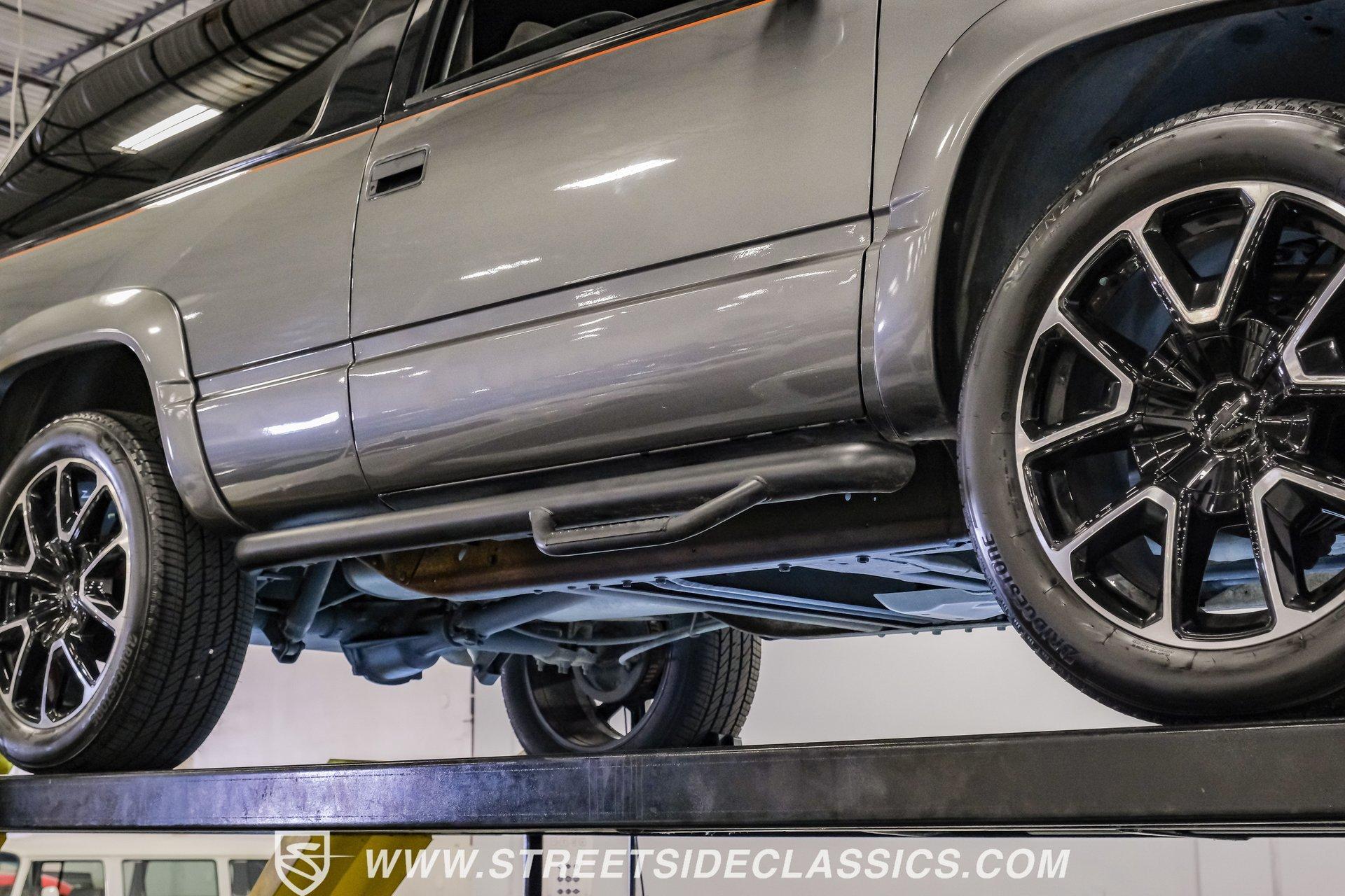 There is something about a two-door SUV that still captures the imagination. It reads like a time capsule from an era when trucks were simple, tough, and full of character. This Tahoe has been given a thoughtful twist that hints at what the next generation might have become if it had been allowed to evolve: modern presence with classic attitude. With hints of updated styling and a purposeful stance that turns heads, this is a truck that makes a statement and begs to be driven, especially as a 1995 Chevrolet Tahoe fitted with a Gen3 6.0 LQ9 V8 and 4L60E automatic transmission. Step inside and you will find a mostly stock layout with a few modern comforts. The cabin features cold blowing air conditioning, Dakota digital style gauges and a double din Kenwood head unit with Bluetooth, AM/FM, and a backup camera. Power driver seat, power windows, locks, mirrors, tilt wheel, and cruise control add convenience. Under the hood is a Gen3 6.0 LQ9 V8 sourced from a later Cadillac Escalade, paired with a 4L60E four speed automatic. The setup includes a big intake, mild cam, and headers, with the GM engine control module relocated just under the factory ECM. The truck starts readily and drives well while the front braking is power disc with rear power drum, steering is power assisted, and the rear is built around a 10 bolt axle. Rolling stock includes 22 inch wheels with Bridgestone 275/50R22 tires from 2021 that give it a modern, planted look. Highlights: Gen3 6.0 LQ9 V8 swap from a Cadillac Escalade 4L60E four speed automatic transmission Engine upgrades include a large intake, mild cam, and headers 10 bolt rear axle Front power disc brakes and rear power drum 22 inch wheels with 275/50R22 Bridgestone tires Full repaint with metallic flake Aftermarket grille and taillights Dakota style digital gauges, Kenwood double din with backup camera, Power driver seat This two-door Tahoe presents a rare opportunity to own a blend of classic SUV character with modern V8 muscle and contemporary styling cues. It will make a great driver or a solid starting point for further cosmetic finishing. Call today to arrange an appointment or to learn more.