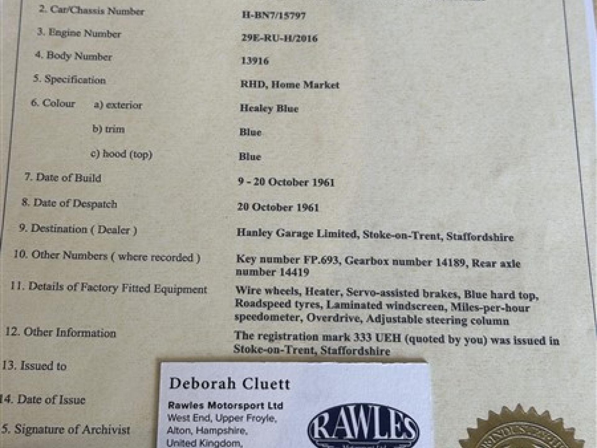 Built between 9-20th October 1961 and despatched from Austin’s Abingdon factory a little later on 20th October to Henley Garage of Stoke-on-Trent this Healey was first registered as 333 UEH (retained today) and well optioned with servo brakes, wire wheels, a heater, overdrive and an adjustable steering column.