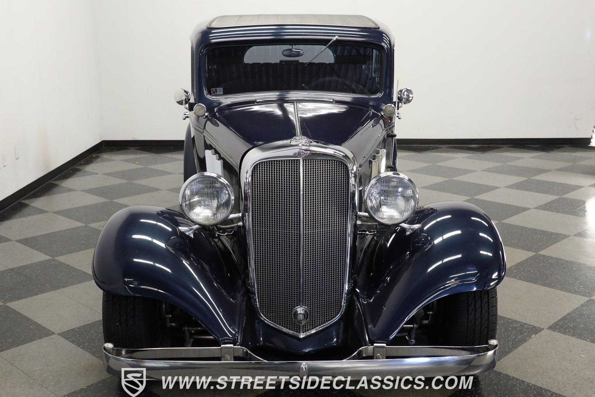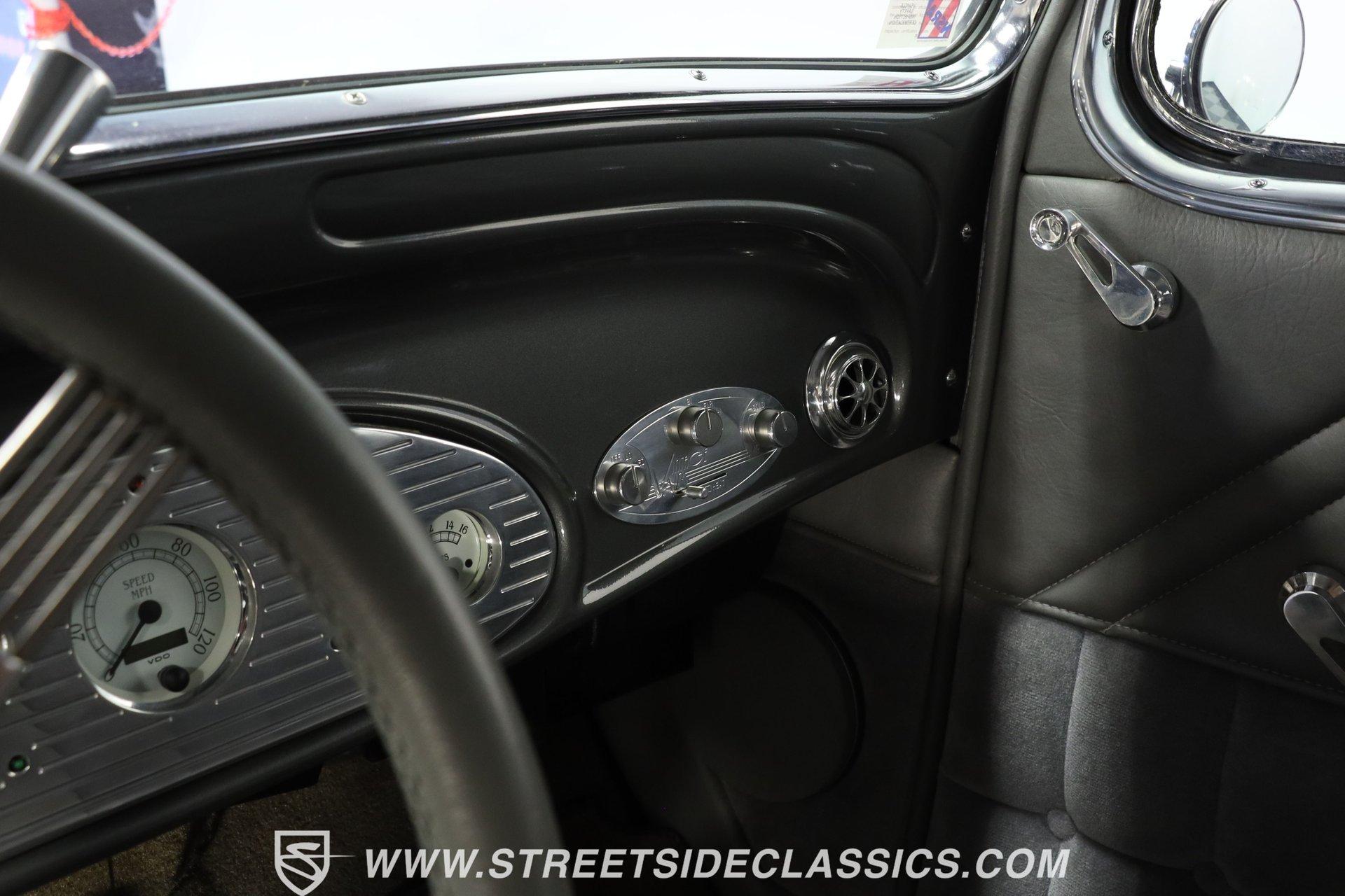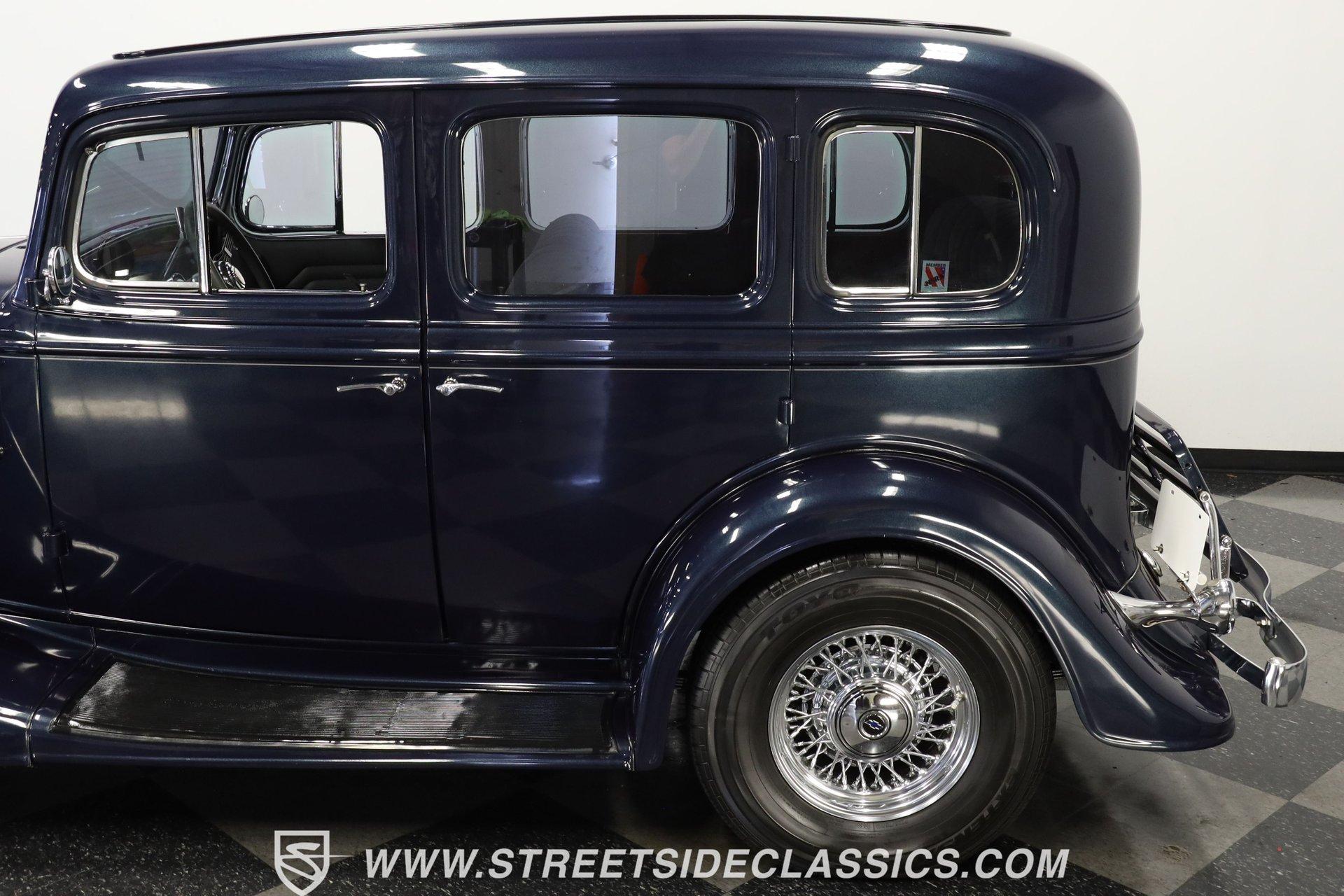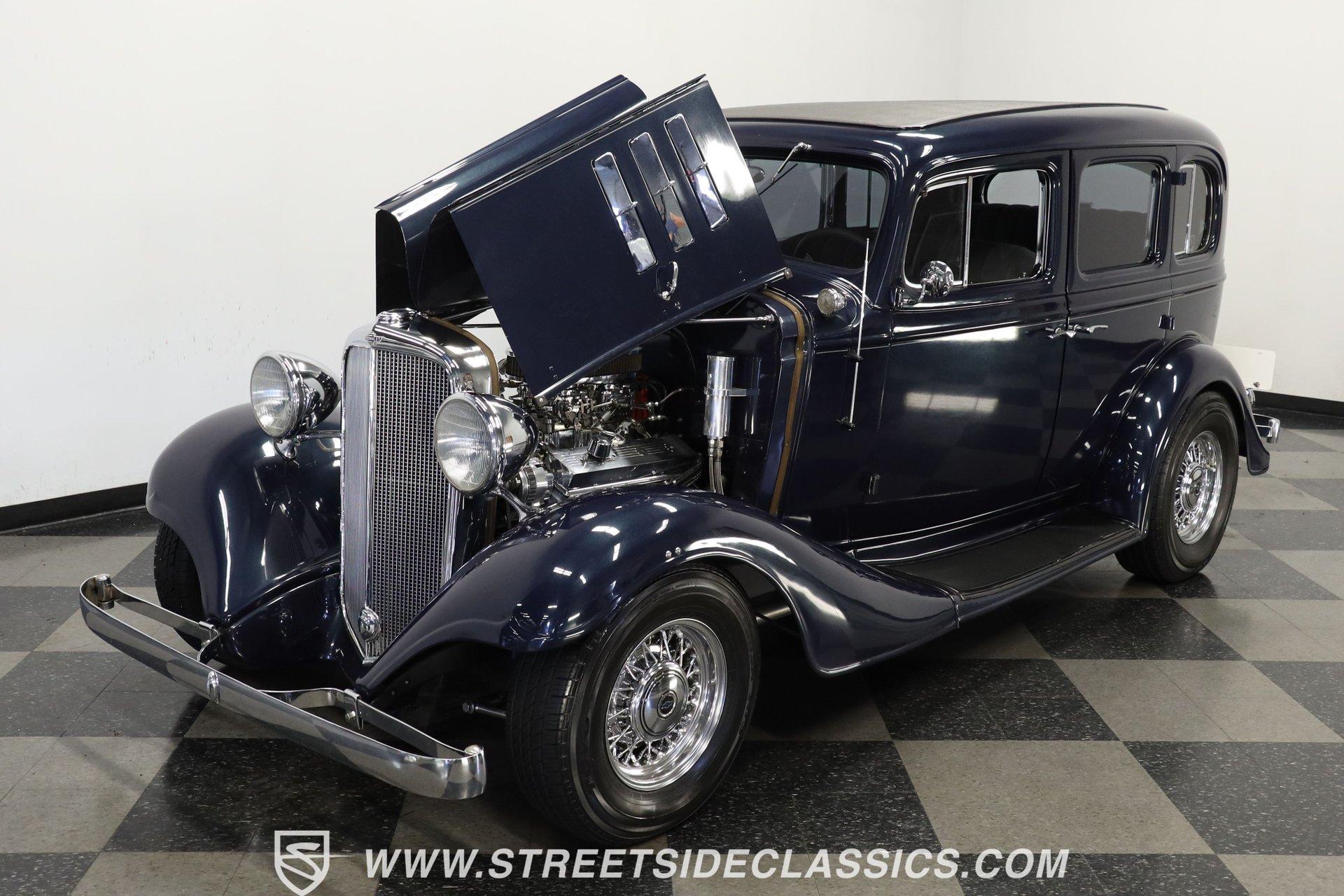 Step back in time and experience the charm and power of a true classic with this beautifully restored 1933 Chevrolet Master Touring Sedan. This iconic vehicle blends vintage elegance with modern performance, offering a driving experience that connects you to the golden era of American automobiles while enjoying today's reliability. Whether cruising down a scenic route or showing off at a car meet, this Chevrolet Master represents a timeless statement of style and craftsmanship. With its striking dark blue metallic paint and sleek four-door design, this sedan invites you to own a piece of automotive history that's ready to impress. Inside, the interior welcomes you with a sophisticated gray cloth and vinyl combination that exudes comfort and class. The dashboard, finished in metallic gray, features crisp VDO white face gauges for a vintage yet functional look. Vintage Air climate controls keep the cabin comfortable, complemented by a banjo-style steering wheel on a tilt column for added driving ease. Polished metal and chrome accents throughout highlight the meticulous attention to detail, while the full-size rear bench seat and front and rear seatbelts ensure a safe and enjoyable ride. Under the hood, you'll find a powerful ZZ4 crate 355 cubic inch small block engine paired with a smooth-shifting 4-speed automatic transmission (700R4). This setup is enhanced with dual Edelbrock 4-barrel carburetors, a chrome Edelbrock intake, headers, and an MSD ignition system, all contributing to impressive performance and reliability. Power steering and front disc brakes provide responsive handling and stopping power, while an upgraded front suspension with adjustable coilovers improves ride quality and control. The dual exhaust system and chrome touches add both style and performance benefits to this well-rounded drivetrain. Highlights 1933 Chevrolet Master Touring Sedan 4,903 Miles Since Built ZZ4 Crate 355ci Small Block Engine 4-Speed Automatic Transmission (700R4) Dual Edelbrock 4-Barrel Carburetors Chrome Edelbrock Intake Manifold MSD Ignition System Power Steering Front Disc Brakes Dual Exhaust System Upgraded Front Suspension with Adjustable Coilovers Vintage Air Climate Control Gray Cloth and Vinyl Interior Chrome Wire Wheels with 2018 Tires Mostly Steel Body with Fiberglass Rear Fenders Air Conditioning Seatbelts Front and Rear Excellent Paint with Medium Metallic Dark Blue Financing Available Vehicle Protection Plans Available Worldwide Shipping This 1933 Chevrolet Master Touring Sedan is a fantastic blend of classic style and modern upgrades, making it an excellent choice for collectors and enthusiasts alike. Its combination of eye-catching aesthetics, comfortable interior, and strong performance means it's ready for the road and show. Don't miss your chance to own this stunning piece of automotive history. Call, email, or come visit our showroom today! We can assist you with getting an Extended Vehicle Service Plan from Freedom Warranty, which provides comprehensive coverage that can save thousands of dollars on unexpected repairs. Inquire for more details and pricing!