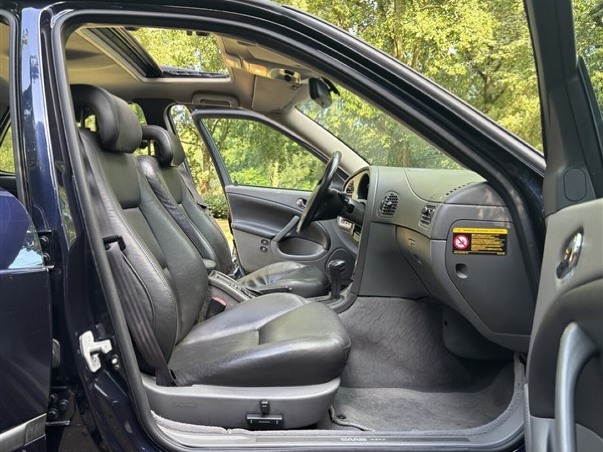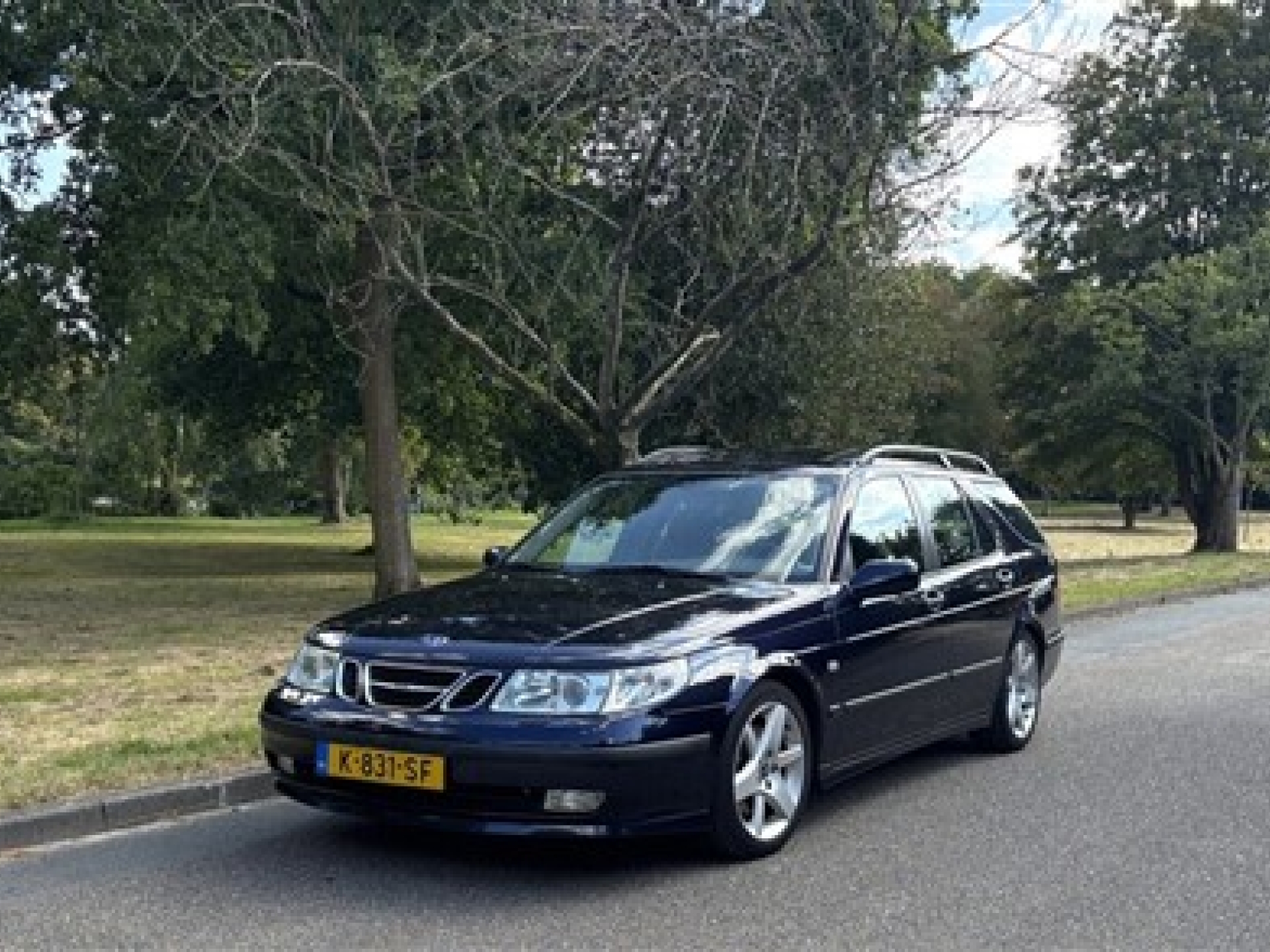 The exterior is stunning. The color “Midnight Blue” suits the Estate beautifully, especially combined with the original AERO wheels, which look almost new. The Aero version is slightly lowered compared to standard 9-5 models, giving it a tighter stance on the road. The paint is largely original and very well maintained, with only minimal signs of use appropriate for a 22-year-old youngtimer.