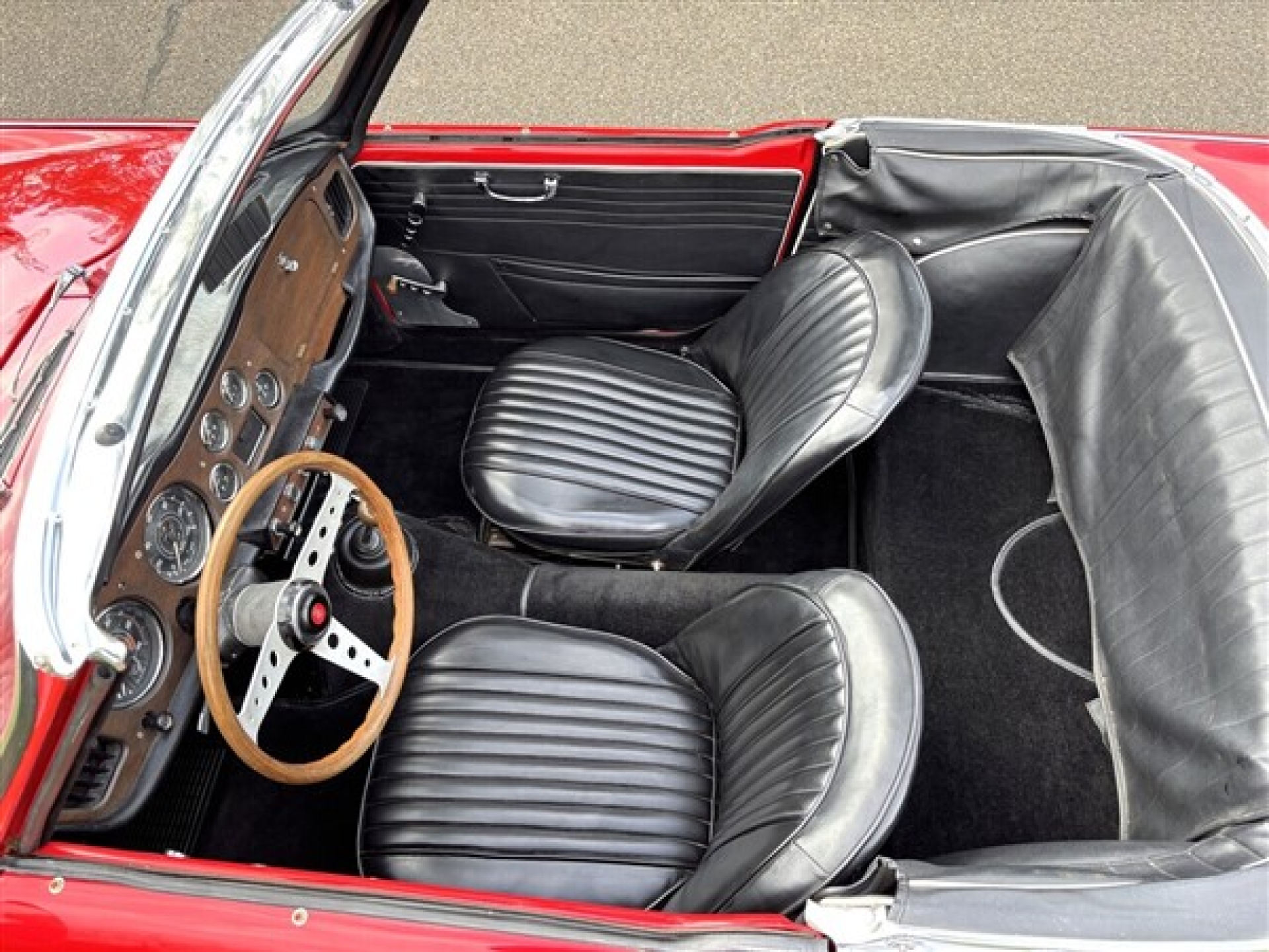 The exterior looks very good, repainted in the stunning TR4 color “Signal Red,” with the paint in great condition. There are hardly any signs of use, and the finish has a deep shine. The robust alloy wheels are painted black with chrome central wing nuts as a stylish accent. The soft top was recently replaced and closes perfectly. Simply a beautiful, clean TR4.
