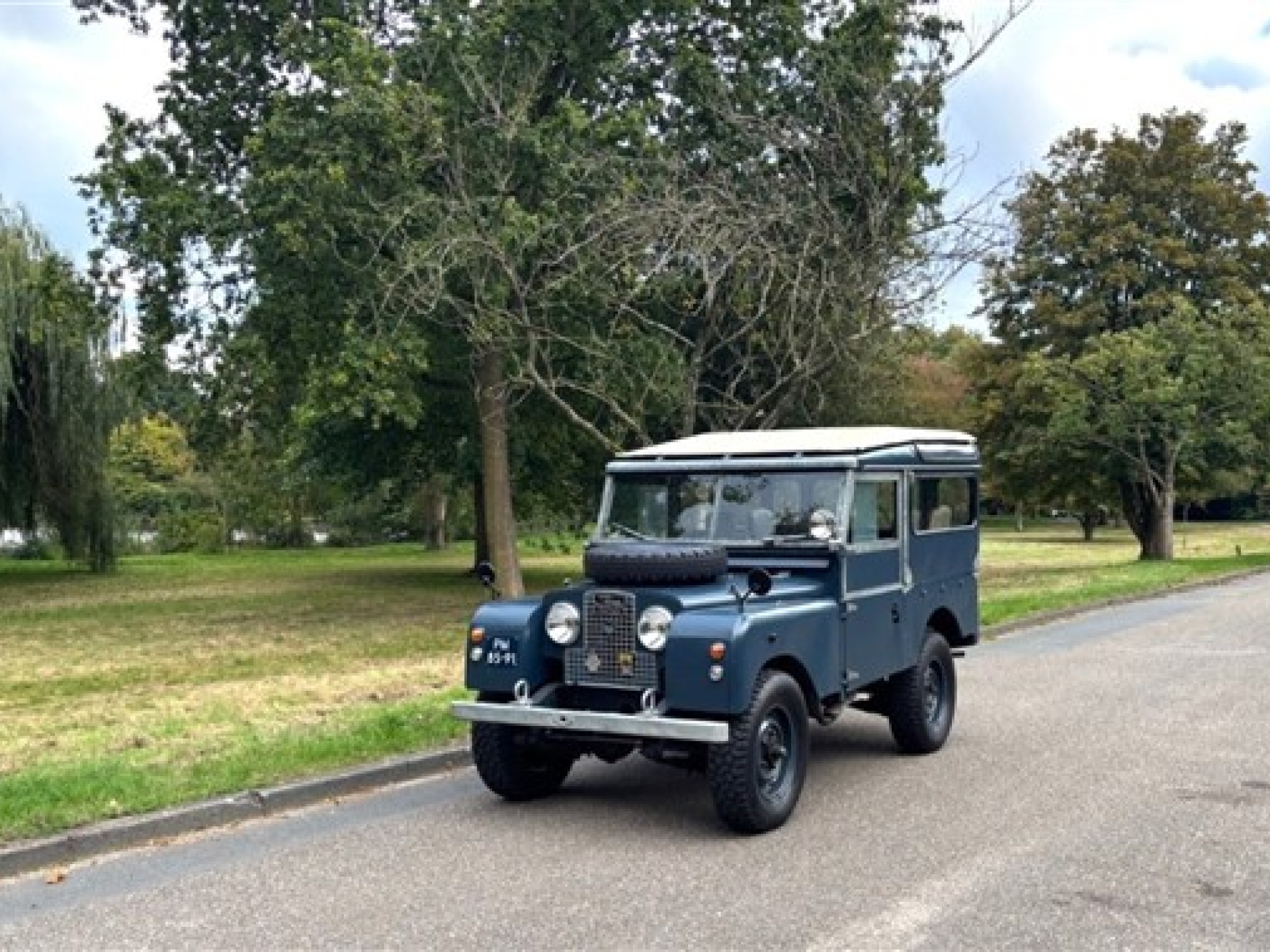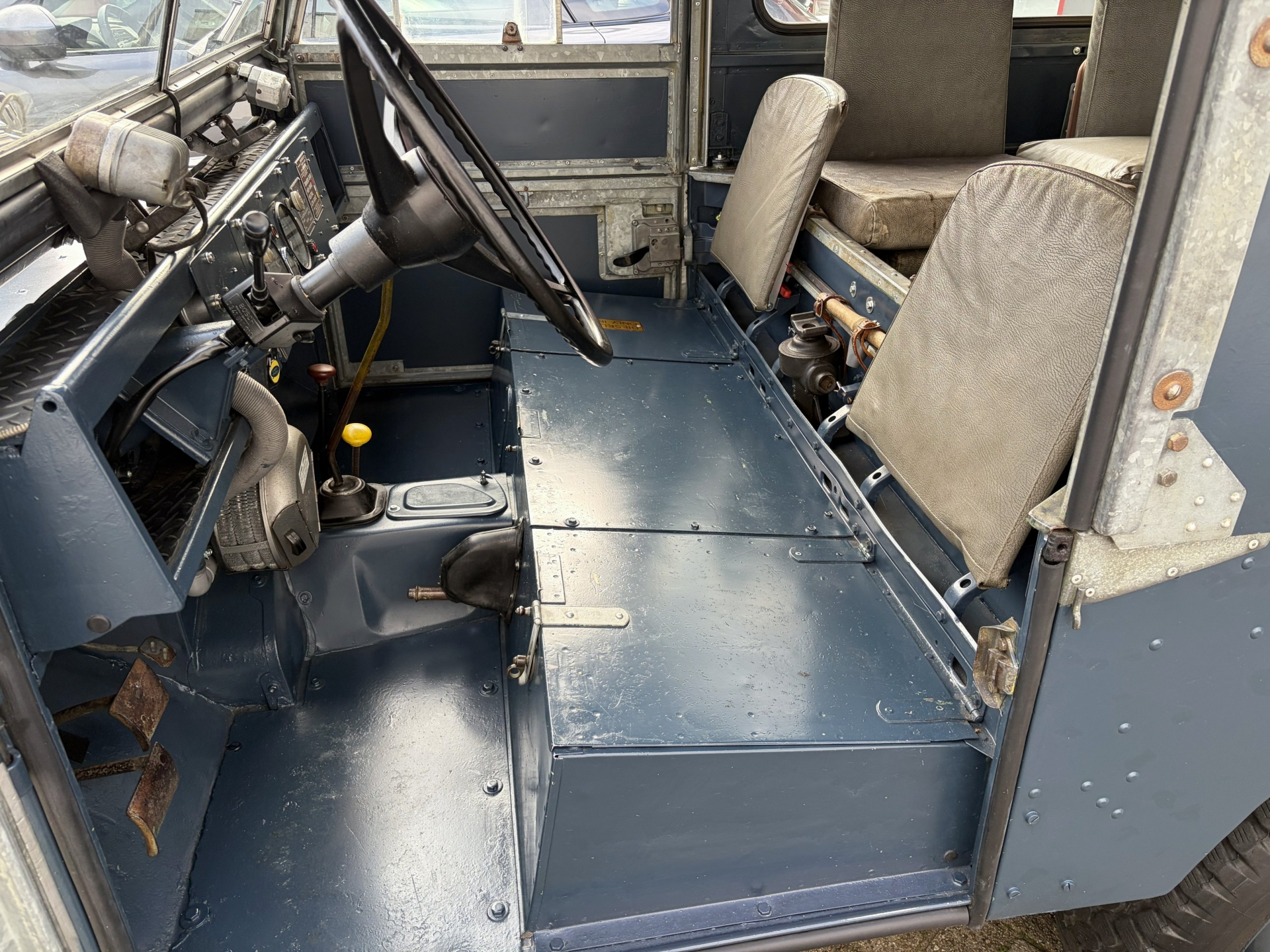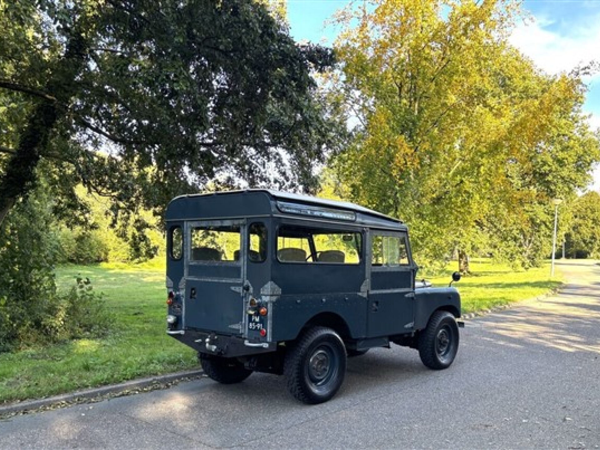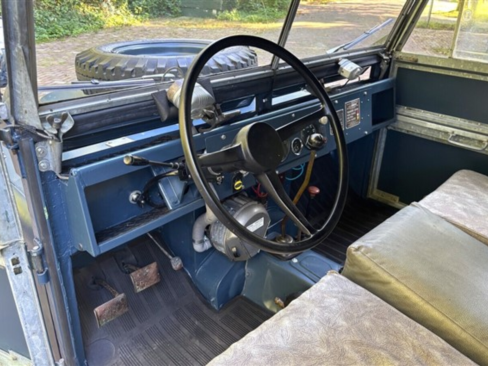 The exterior is in very good condition; it’s clear the 88 has been mostly kept indoors and cared for by true enthusiasts. Don’t expect a shiny showroom car — this is not a car for polishers. The chassis has been restored, so the underside looks very neat. The new wheels are fitted with new 4x4 tires. The doors close properly, and there are authentic accessories, such as an extra spotlight near the windshield and a new Lucas reverse lamp. Additionally, there’s a new tow hitch with new mounts on the rear bumper and a new front bumper. The lighting has recently been renewed, and everything looks well maintained. Thanks to the beautiful blue paint and aluminum finishes, it’s a tough yet appealing vehicle.