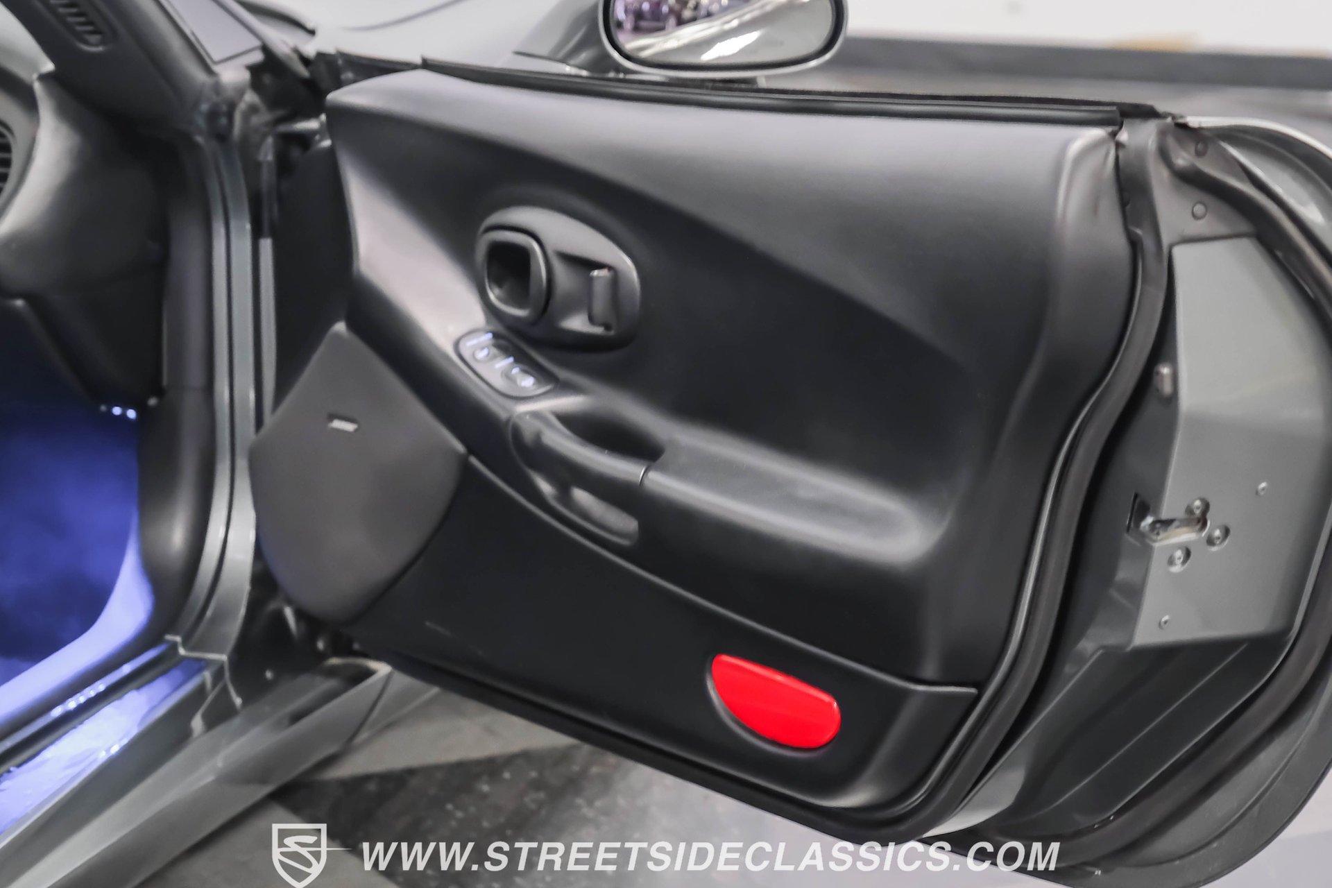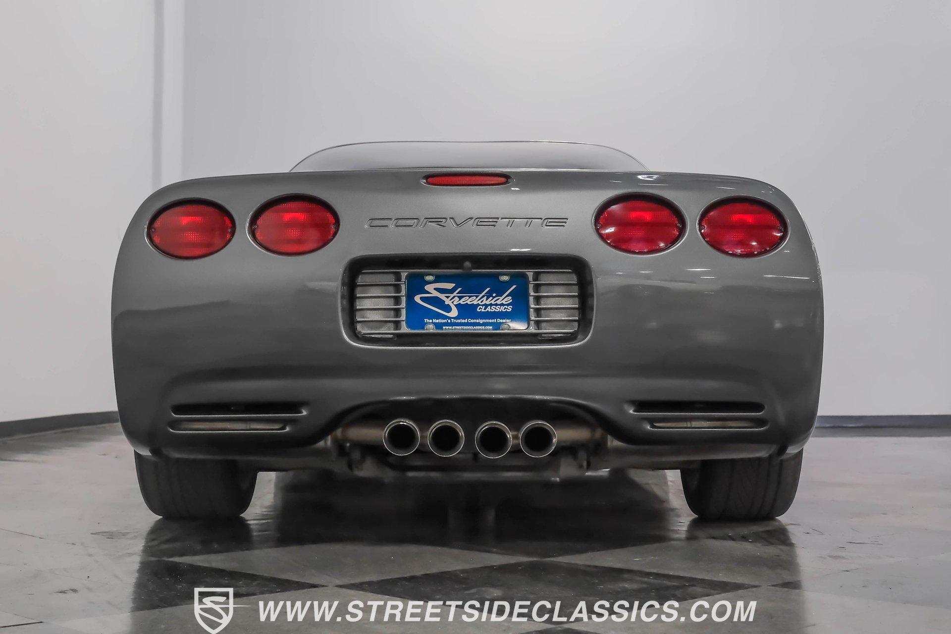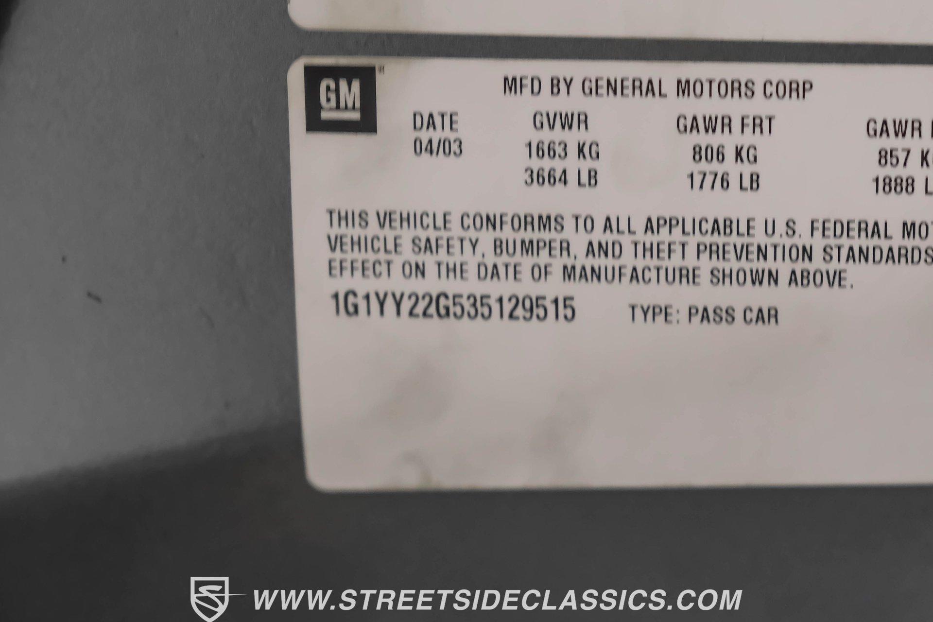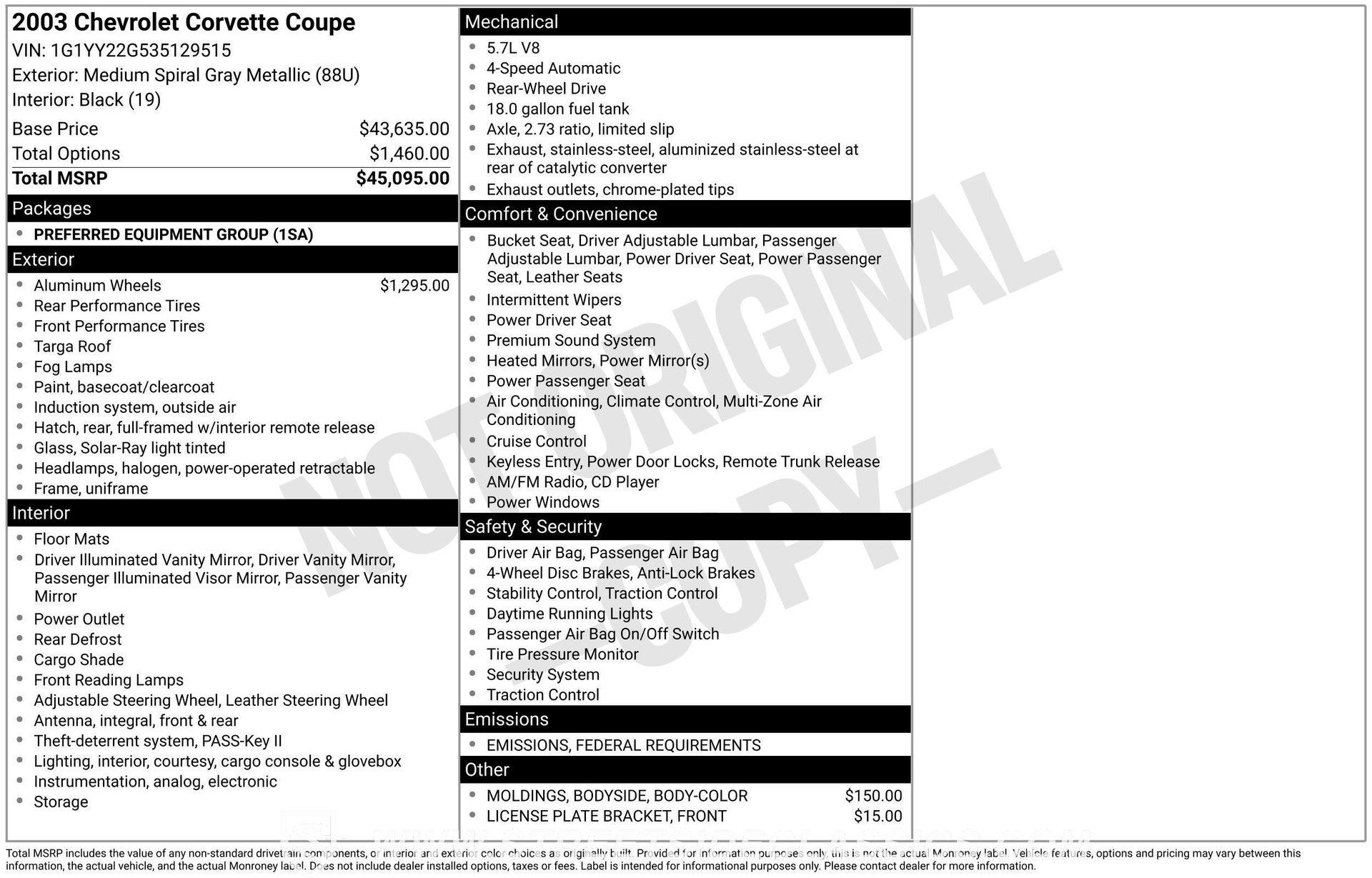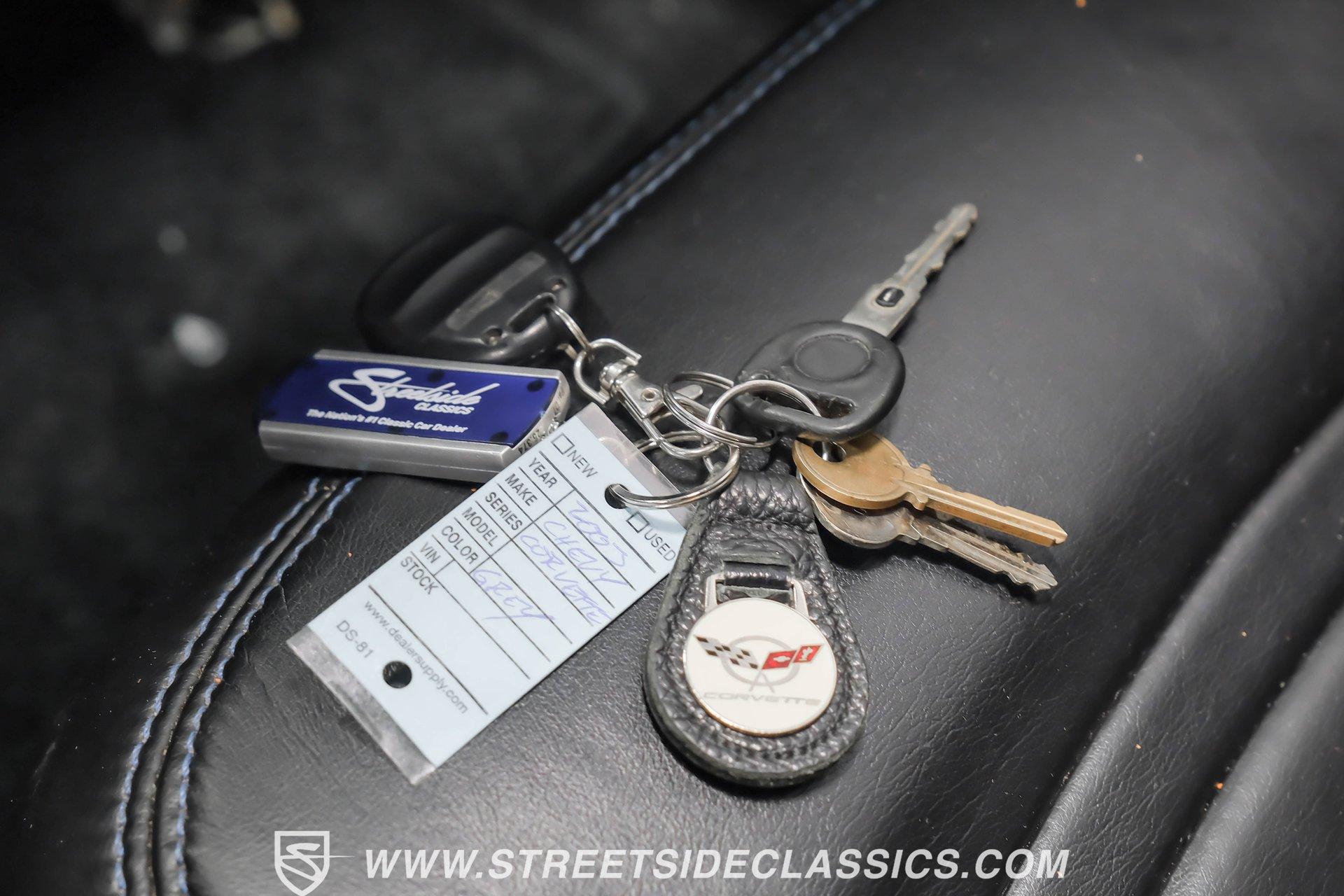 When it debuted in 1997, the fifth generation of Chevy's Corvette was considered by many as the beginning of the modern era of the General's halo car. Lasting almost a decade, this 2003 Chevrolet Corvette represents the 50th model year of the venerable C5. With a mere 60,332 actual miles on its odometer and fully repainted in Medium Spiral Gray Metallic, it appears as though this car has just come off its first lease. With its swoopy lines and color-keyed removable targa top, this Corvette is perfect for anyone who wasn't able to buy one of these gems the first time around. Inside, we find a beautifully redone black leather interior. A locking center console separates a pair of supportive power bucket seats sporting custom embroidery on the headrests. A power-assisted, four-spoke, padded steering wheel featuring the Crossed Flags emblem sits just ahead of the six-pod analog gauge cluster featuring a 7,000 RPM tachometer and 200 mph speedometer. An upgraded Kenwood AM/FM/CD/AUX touchscreen also offers satellite, navigation, and Bluetooth connectivity, while power mirrors, locks, and windows, dual-zone climate control, cruise control, along with air conditioning provide all the modern amenities required for a comfortable drive. Under the signature front-hinged hood, we find an overhead valve 5.7-liter LS1 V-8 engine. With its beautiful Corvette valve covers, aluminum blocks and heads, and composite intake manifold, this modern small block has been upgraded with a performance camshaft, Dynatech long tube headers, and Corsa dual exhaust. Those upgrades have allowed this C5 to produce a dyno-proven 376 horsepower and 337 pound-feet of torque to the rear wheels. Power is routed through a rear-mounted four-speed automatic transmission before heading out to the rear end that transfers that muscle to the tarmac via a set of staggered C6 Grand Sport-style wheels measuring 17 inches up front and 18 inches in the rear. HIGHLIGHTS: Full Medium Spiral Gray Metallic Repaint Color Keyed Targa Top 60,332 Actual Miles LS1 V8 Performance Cam Dynatech Long Tube Headers Corsa Dual Exhaust 376 RWHP 337 RWTQ Four Speed Auto Four Wheel Power Discs Cross Drilled and Slotted Rotors C6 Grand Sport Style Wheels ABS Power Steering Redone Leather Custom Embroidery Power Windows Power Locks Power Seats Power Mirrors Kenwood Touchscreen Satellite Bluetooth Navigation Dyno Sheet Reproduction Window Sticker Receipts This 2003 Chevrolet Corvette is equipped with a fully independent suspension, while four-wheel power disc brakes featuring large cross-drilled and slotted rotors are ready to scrub off speed at a moment's notice. If you missed out on the C5 the first time around, then this low-mileage beauty is your second chance to finally get behind the wheel. Don't wait, call today!