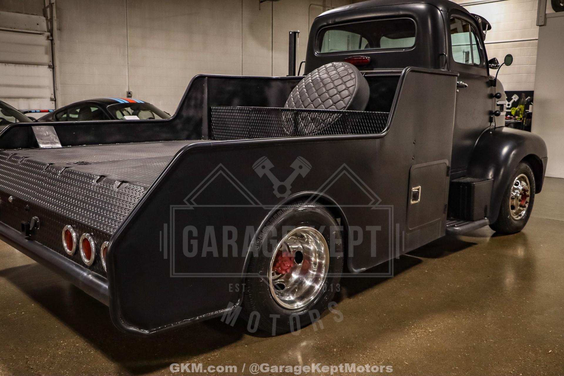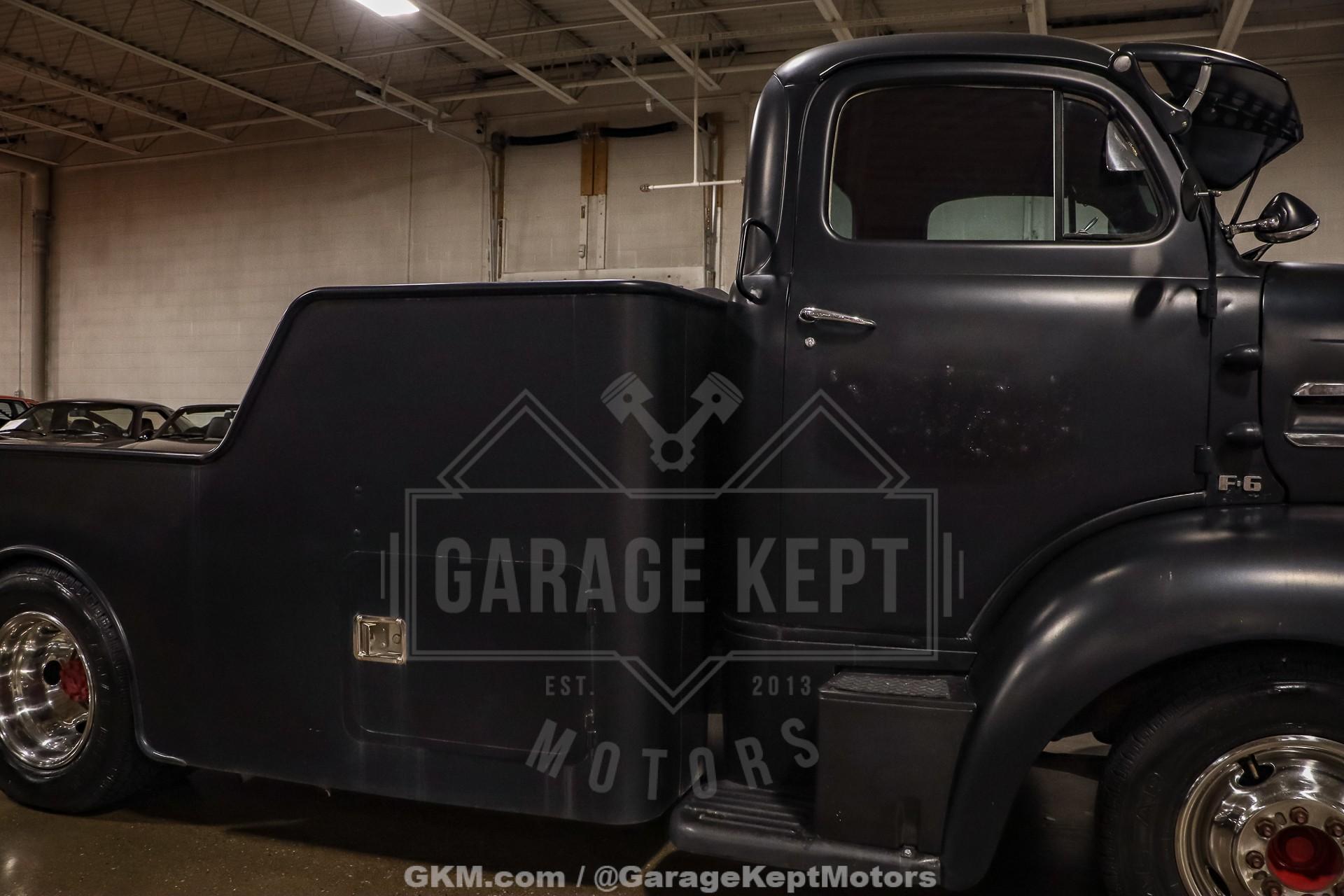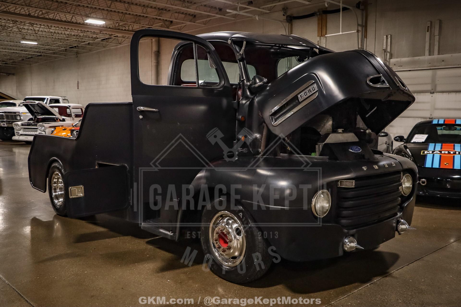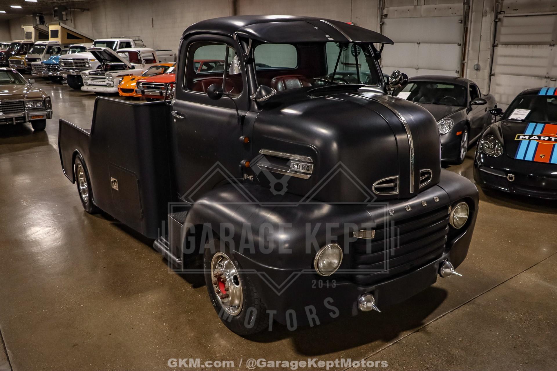 1952 Ford F9 COEDually Pickup Truck- Same owner since 2015- Acquired from Colorado- Flat Black over Red Interior- 460ci V8- Automatic Transmission- Holley Sniper EFI- Power Steering- 5k Miles Shown The 1952 Ford F9 COE Dually Pickup Truck is a bold and distinctive take on one of Ford's most iconic postwar designs. This particular example, acquired from Colorado and owned by the same enthusiast since 2015, has been meticulously crafted into a head-turning custom hauler. Finished in flat black with a vivid red interior, the truck's stance and proportions immediately command attention. Its cab-over-engine (COE) design gives it a commanding view of the road and an unmistakable vintage profile, blending 1950s industrial charm with modern drivability.Professionally mounted on a 1978 Winnebago chassis, this F9 benefits from significant performance and comfort upgrades while retaining its classic looks. Power comes from a 460 cubic-inch V8 fitted with FiTech Go-EFI fuel injection, paired to an automatic transmission. This combination delivers both strong torque and reliable cruising power, making it a surprisingly smooth and capable rig on modern roads. Power steering and power brakes enhance the driving experience, while the addition of a tow package underscores the truck's practical side; ready to haul, tow, or simply cruise.Step inside, and the attention to detail continues. The red leather interior provides a vivid contrast to the subdued exterior, offering a mix of vintage styling and modern refinement. Dolphin gauges line the dashboard, providing accurate readouts while adding a custom touch. A diamond-plate flat deck sits behind the cab, giving the truck a rugged utility look that?s balanced by finer touches like spotlights and clean metalwork. The overall result is a well-sorted build that feels as durable as it looks distinctive.With only 5,000 miles shown since its conversion, this truck remains in excellent driving condition. It starts easily thanks to the EFI system, idles smoothly, and offers a commanding yet comfortable ride. The truck?s dual rear wheels and solid chassis give it impressive stability, making it equally at home cruising highways or parked proudly at a car show. Its combination of power, stance, and usability makes it a standout among COE conversion and an ideal blend of classic design and modern mechanical reliability.Rooted in the first-generation Ford F-Series lineage, this 1952 Ford F9 COE represents both history and innovation. The original F-Series, introduced in 1947, marked Ford's first postwar truck platform and set the tone for decades of durable, hardworking designs. This particular example honors that legacy while adding custom craftsmanship and mechanical upgrades that transform it into a unique and highly drivable classic. Whether admired for its imposing looks, engineering creativity, or sheer presence on the road, this COE is a remarkable tribute to the enduring spirit of American truck culture.