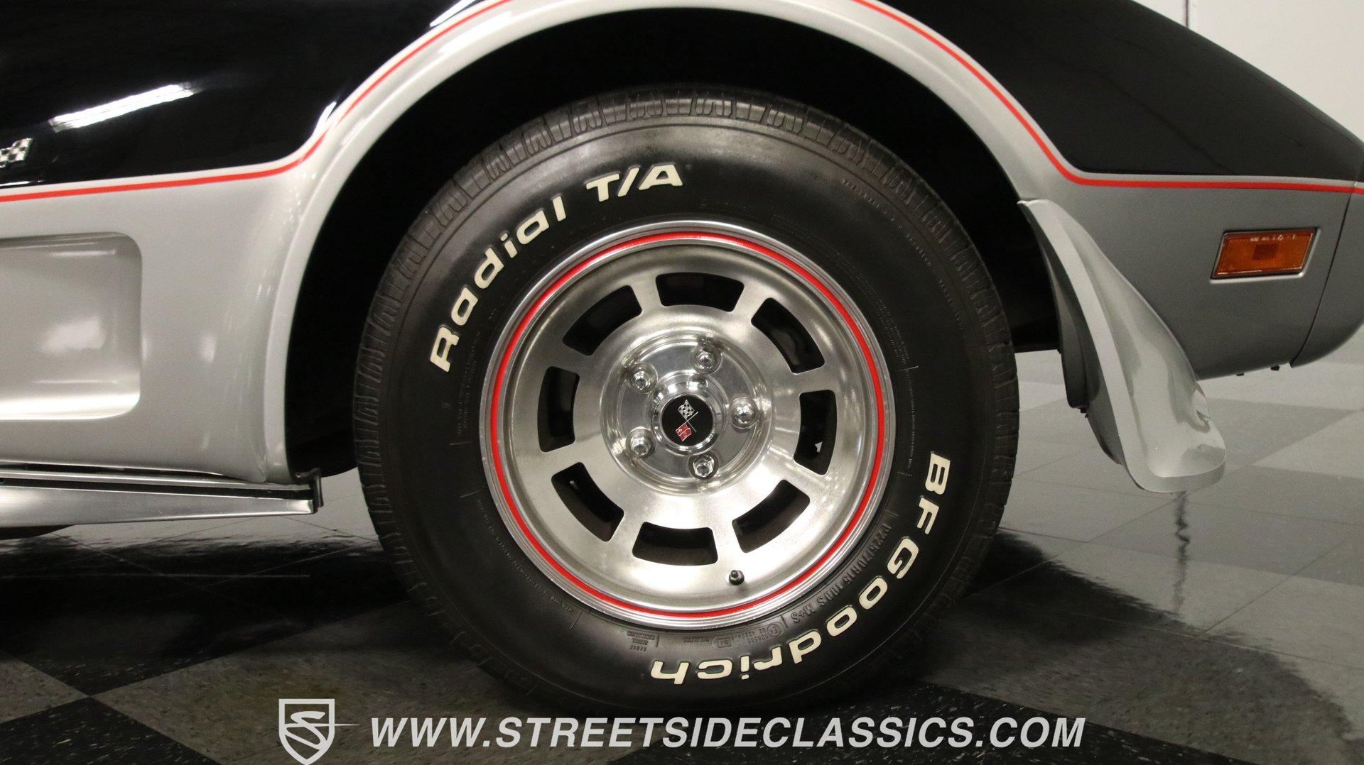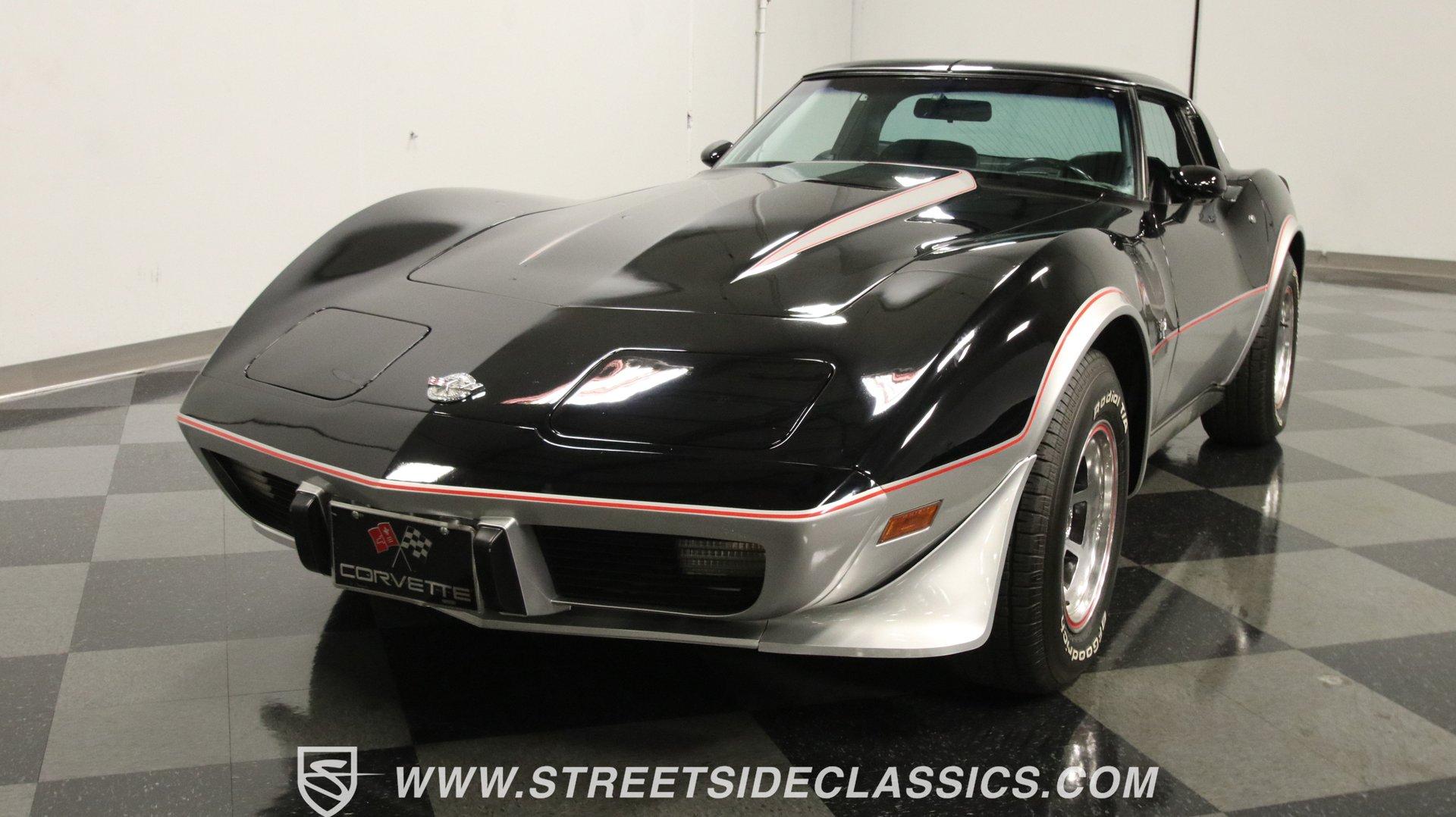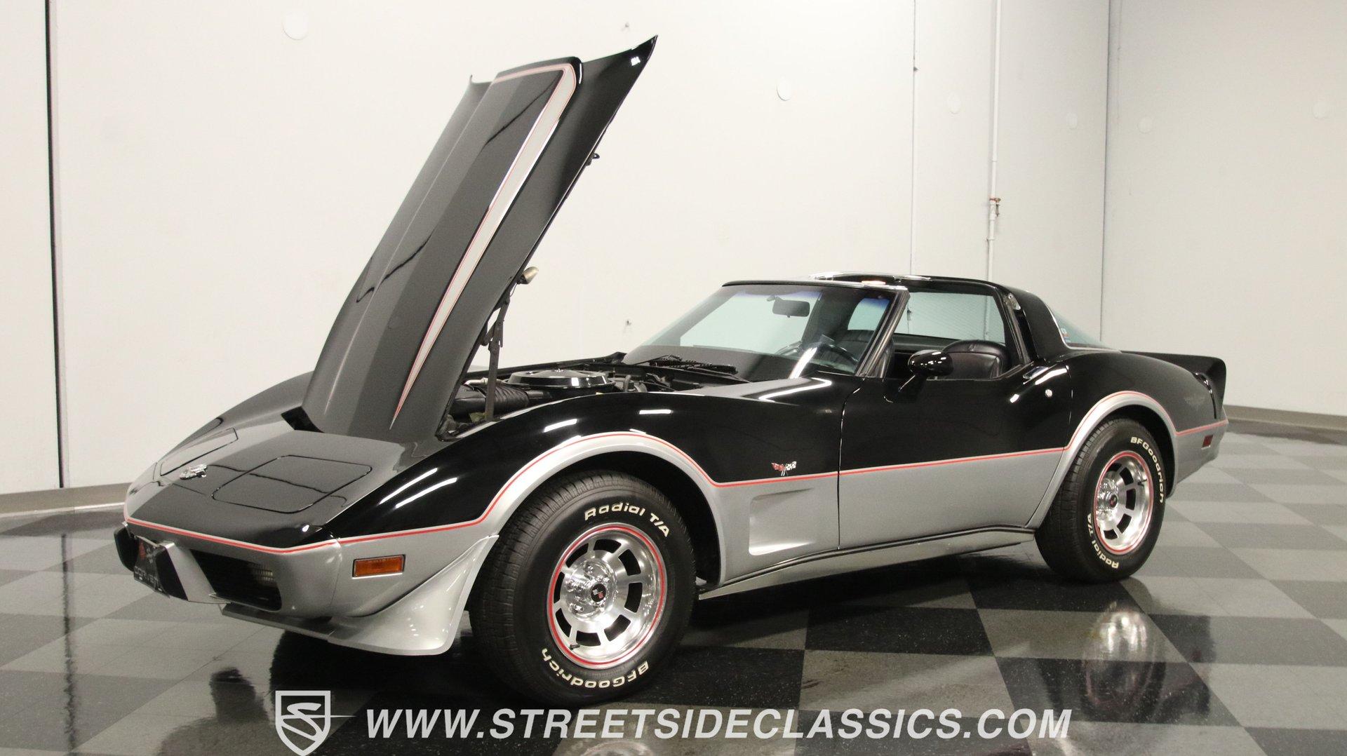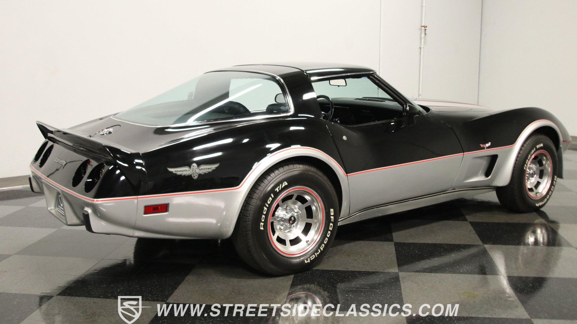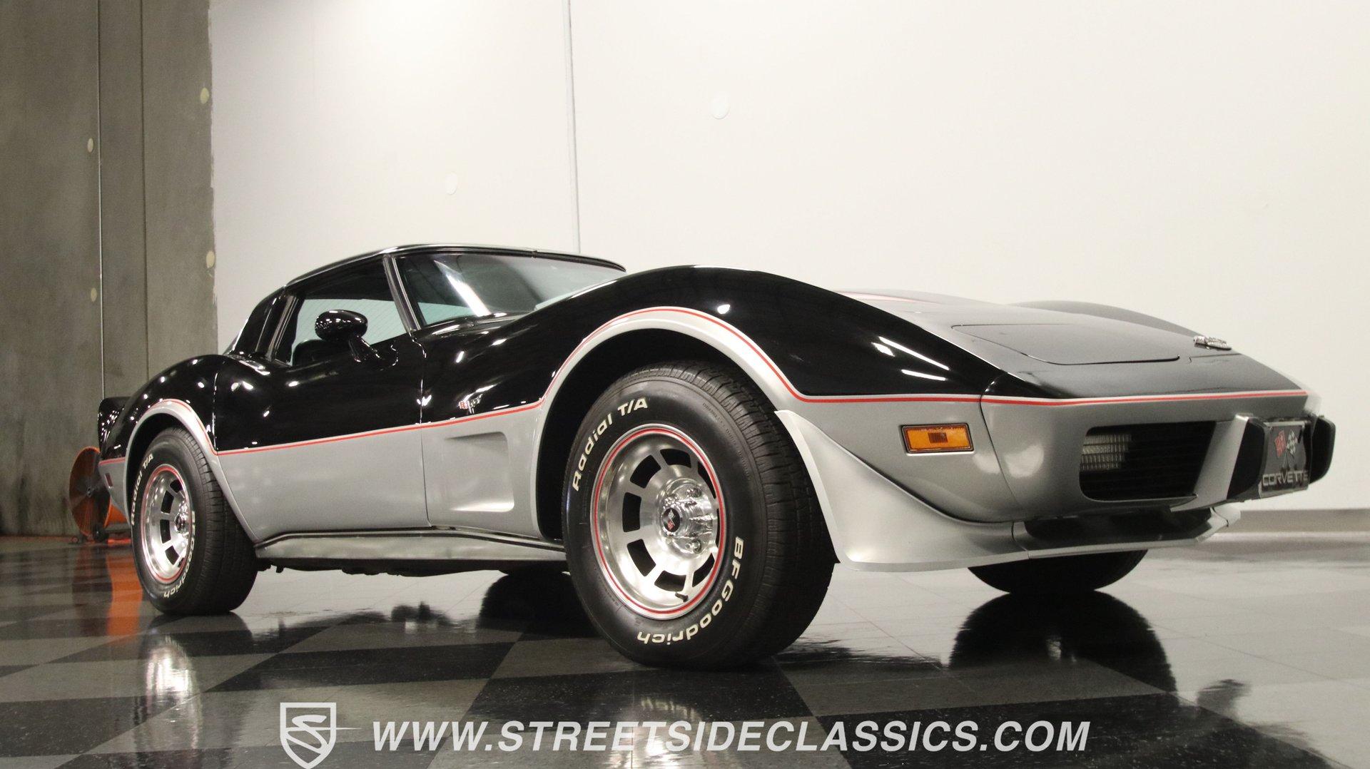With its two-tone appearance, loaded interior, and a numbers-matching V8, you're going to have to act quickly if you want this 1978 Chevrolet Corvette in your garage. This C3 has led an interesting life thus far. The buildsheet tells us it was born a desirable full black package inside and out. And the only way to be even more desirable is if your 1978 coupe is an Indy 500 pace car replica. So that's exactly how they upgraded the paint theme. It's a comprehensive two-tone where the silver lower section also helps highlight the flared fenders and cowl hood. And when it comes to upgraded cars, the whole idea is to have something fun that you can also drive. So we're glad to see nothing here gets taken too seriously. It's an attractive driver-quality finish, which makes it a nice driver-ready coupe. And you have especially attractive details, like the full-width rear spoiler, a chin spoiler, Indy 500 decals, and special redline alloys that go with the pinstriping. Plus, 1978 was also the Corvette's 25th anniversary, and the special bright badging doesn't let anyone forget it. While the exterior was upgraded later in life, the interior remains quite original. That's a good thing when you have a car that was originally optioned with a black leather interior. This upholstery as well as the door panels, carpeting, and dash all look good for their age, and that makes for a nice cruiser. And you'll appreciate the little things, like the working dome light, privacy screen for the cargo area, and the AM/FM stereo with 8-track. It also likes to be comfortable with features like power windows, a rear defogger, cruise control, and provisions for R134a air conditioning (it will need servicing to blow cold again.) You'll love the driver's seat feeling with the high back bucket seats, a grippy steering wheel on a tilt column, and C3's desirable full gauge package. It makes for the ideal package to just take out the T-tops whenever you feel like it and go for a drive. The engine is the numbers-matching L48 350 cubic-inch V8. Everything from the bold blue motor to the black air cleaner has a clean and stock style. The four-barrel carburetor allows the V8 to inhale deeply, and the dual exhaust allows it to exhale with a nice rumble. Plus, you have a three-speed automatic transmission, power steering, fully independent suspension, and four-wheel power disc brakes. So you can now see how this unique classic is the one you'll love to take out any time. The sale comes complete with the factory buildsheet, owner's manual, and maintenance records. This is the classic Corvette with a distinct style and the right comfort. It makes for the kind of great total package you've been looking for. Call today!!!