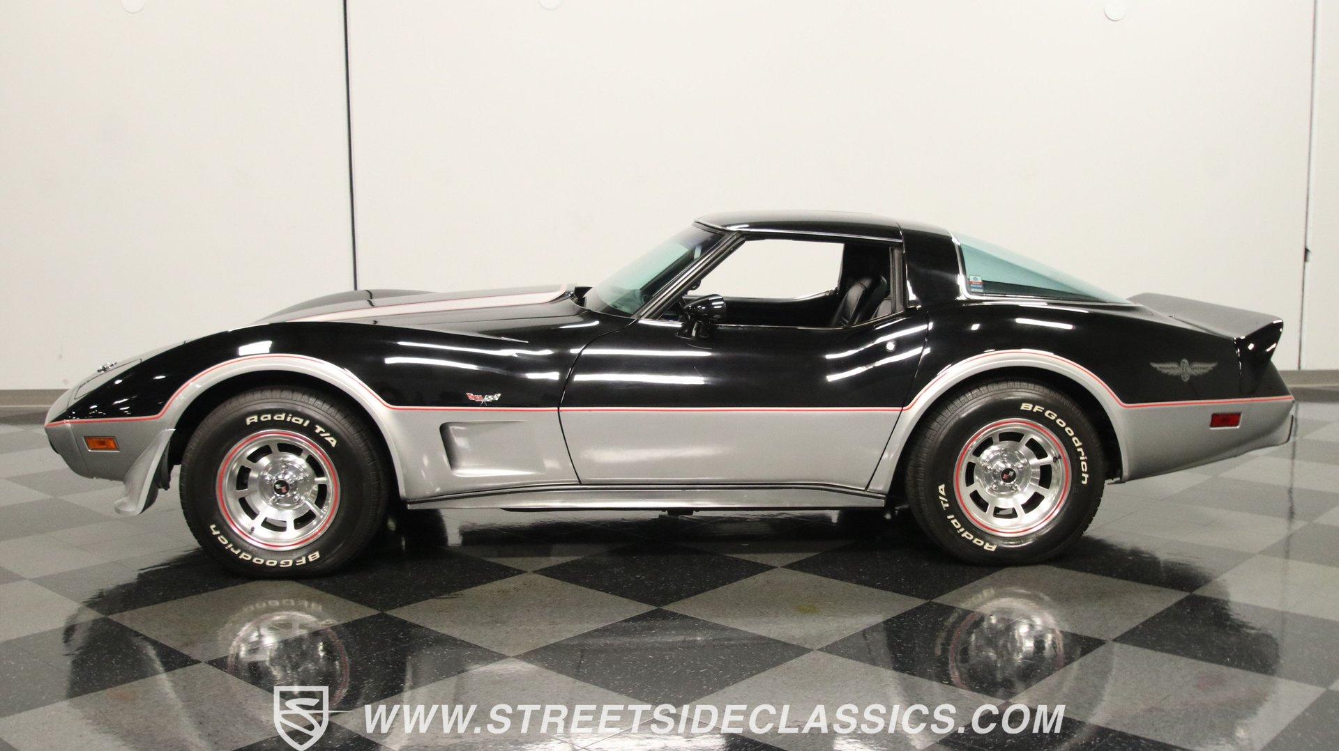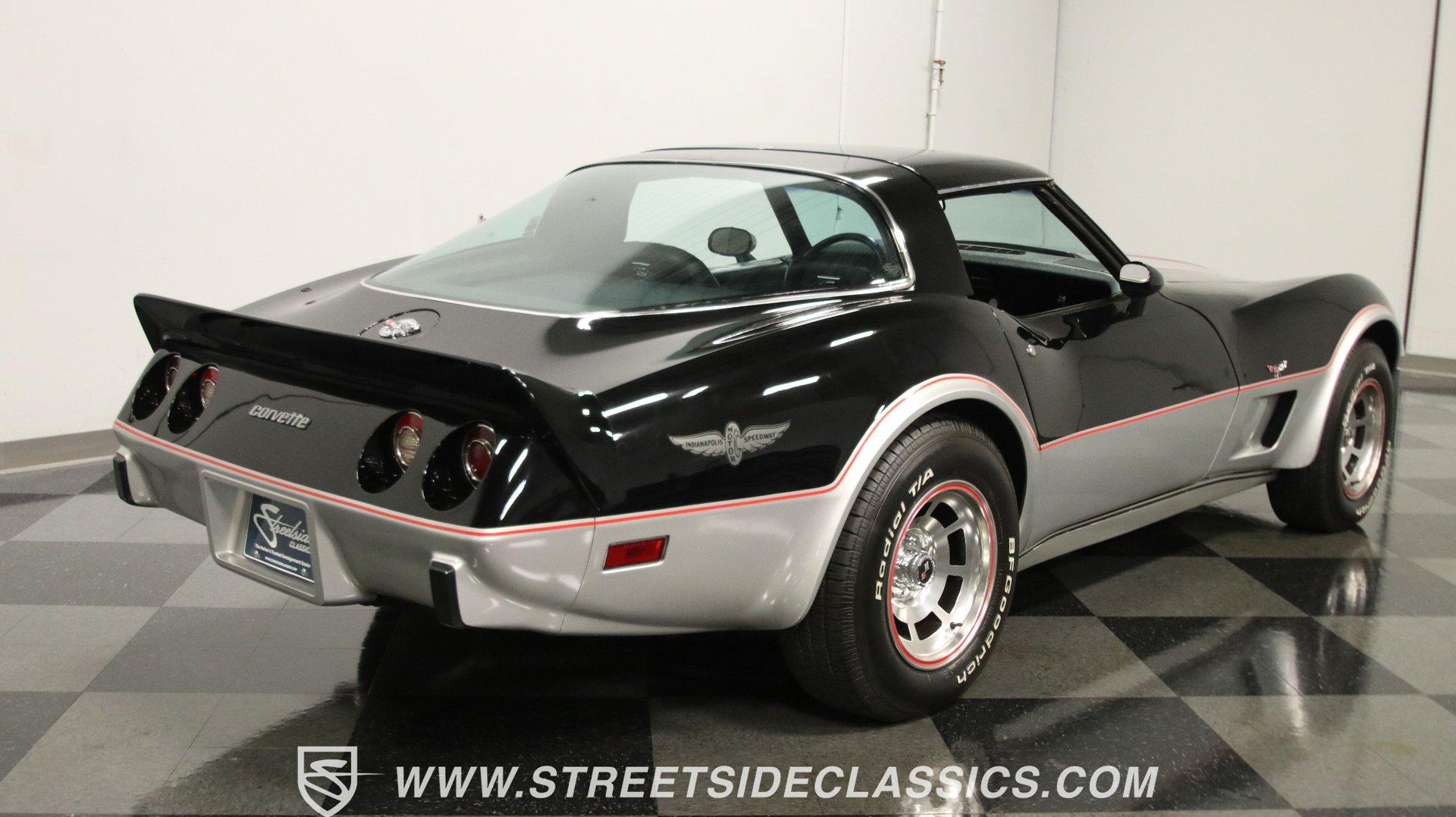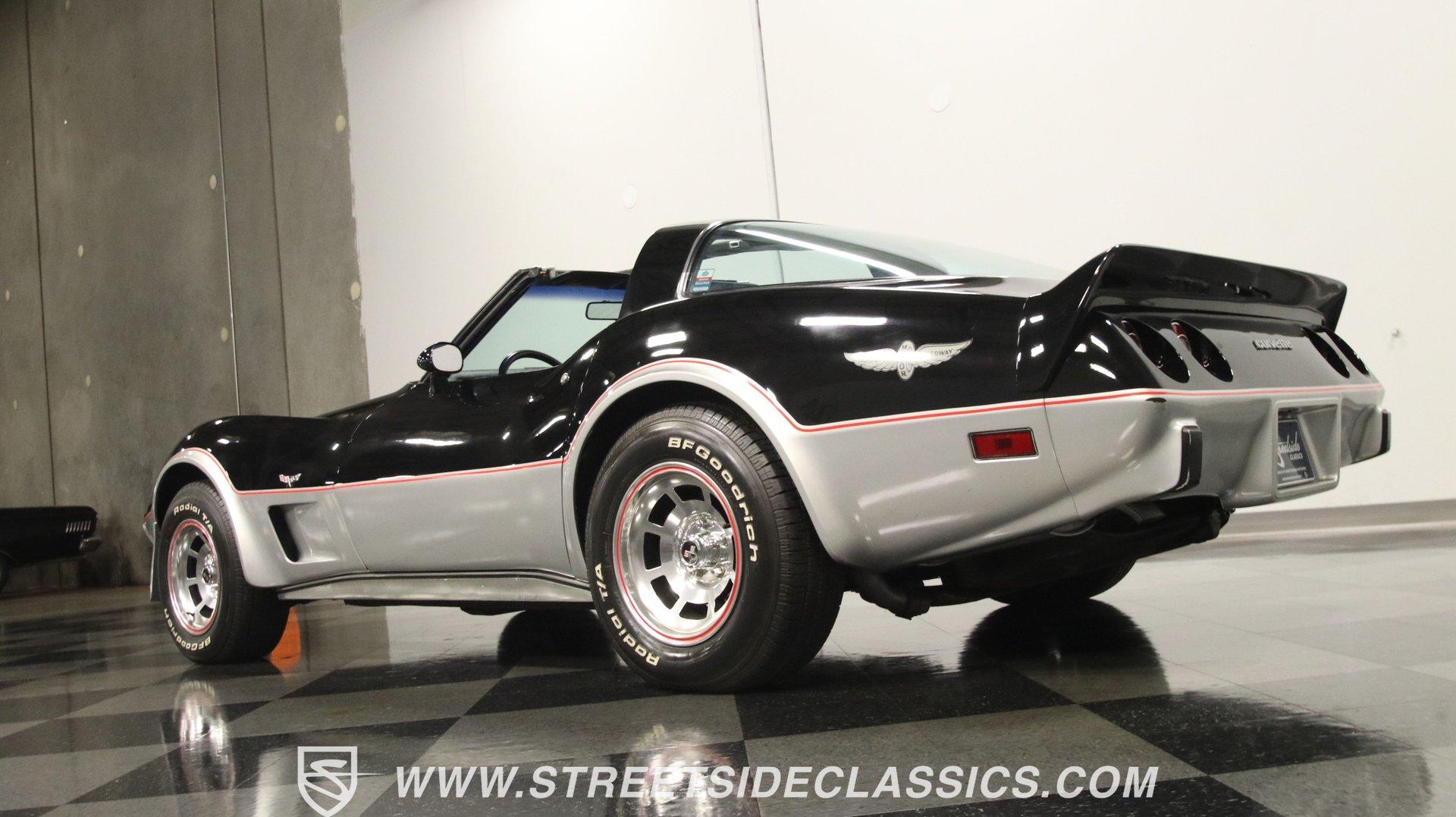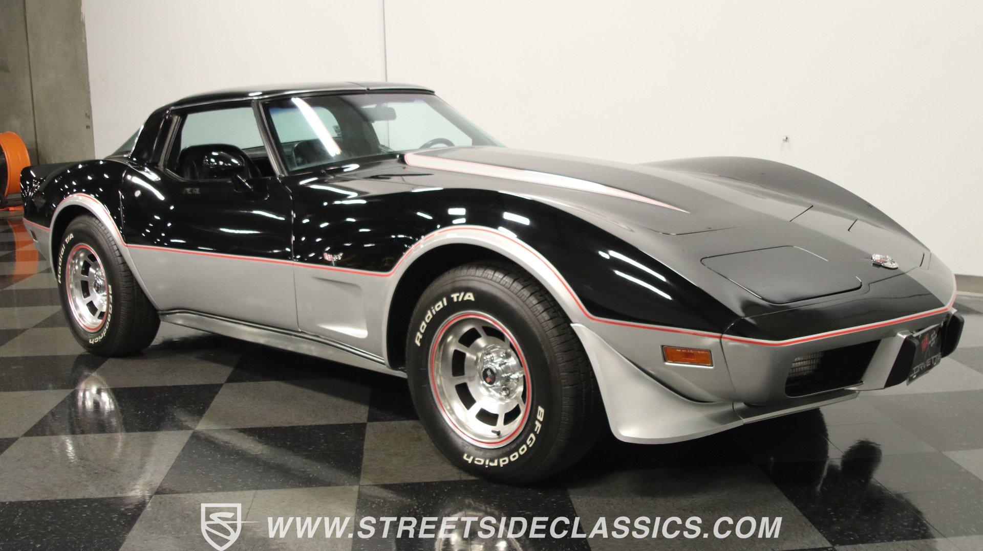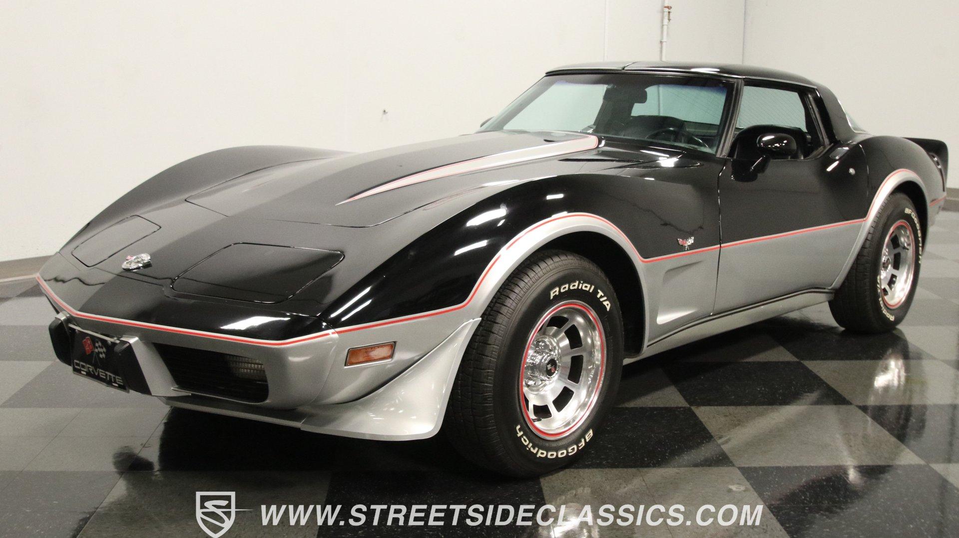 With its two-tone appearance, loaded interior, and a numbers-matching V8, you're going to have to act quickly if you want this 1978 Chevrolet Corvette in your garage. This C3 has led an interesting life thus far. The buildsheet tells us it was born a desirable full black package inside and out. And the only way to be even more desirable is if your 1978 coupe is an Indy 500 pace car replica. So that's exactly how they upgraded the paint theme. It's a comprehensive two-tone where the silver lower section also helps highlight the flared fenders and cowl hood. And when it comes to upgraded cars, the whole idea is to have something fun that you can also drive. So we're glad to see nothing here gets taken too seriously. It's an attractive driver-quality finish, which makes it a nice driver-ready coupe. And you have especially attractive details, like the full-width rear spoiler, a chin spoiler, Indy 500 decals, and special redline alloys that go with the pinstriping. Plus, 1978 was also the Corvette's 25th anniversary, and the special bright badging doesn't let anyone forget it. While the exterior was upgraded later in life, the interior remains quite original. That's a good thing when you have a car that was originally optioned with a black leather interior. This upholstery as well as the door panels, carpeting, and dash all look good for their age, and that makes for a nice cruiser. And you'll appreciate the little things, like the working dome light, privacy screen for the cargo area, and the AM/FM stereo with 8-track. It also likes to be comfortable with features like power windows, a rear defogger, cruise control, and provisions for R134a air conditioning (it will need servicing to blow cold again.) You'll love the driver's seat feeling with the high back bucket seats, a grippy steering wheel on a tilt column, and C3's desirable full gauge package. It makes for the ideal package to just take out the T-tops whenever you feel like it and go for a drive. The engine is the numbers-matching L48 350 cubic-inch V8. Everything from the bold blue motor to the black air cleaner has a clean and stock style. The four-barrel carburetor allows the V8 to inhale deeply, and the dual exhaust allows it to exhale with a nice rumble. Plus, you have a three-speed automatic transmission, power steering, fully independent suspension, and four-wheel power disc brakes. So you can now see how this unique classic is the one you'll love to take out any time. The sale comes complete with the factory buildsheet, owner's manual, and maintenance records. This is the classic Corvette with a distinct style and the right comfort. It makes for the kind of great total package you've been looking for. Call today!!!