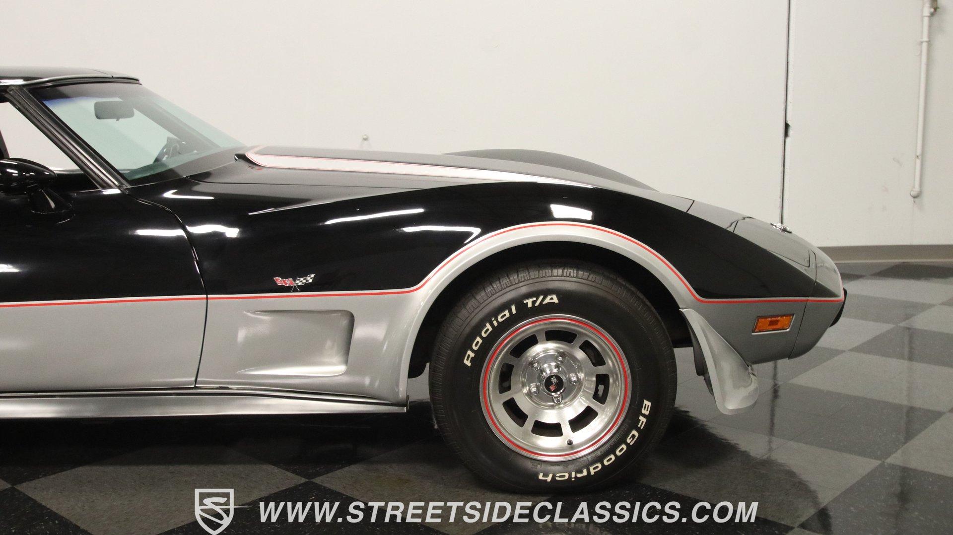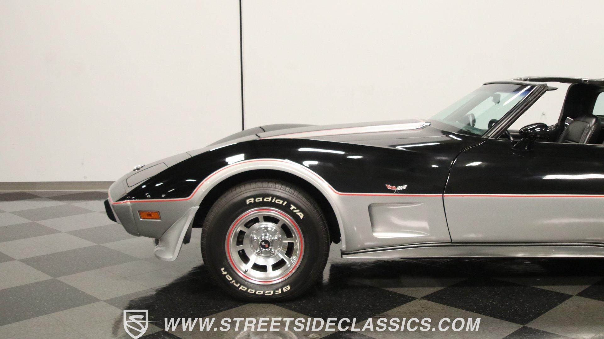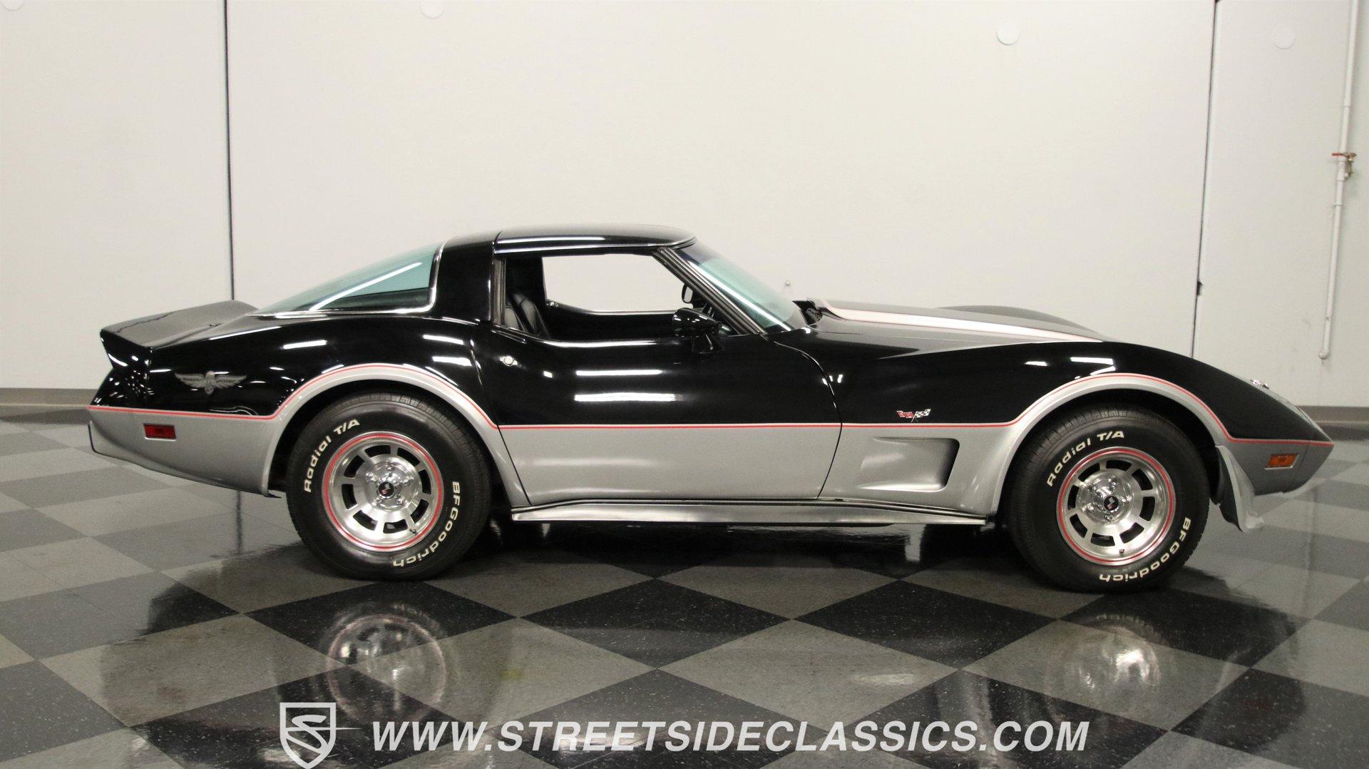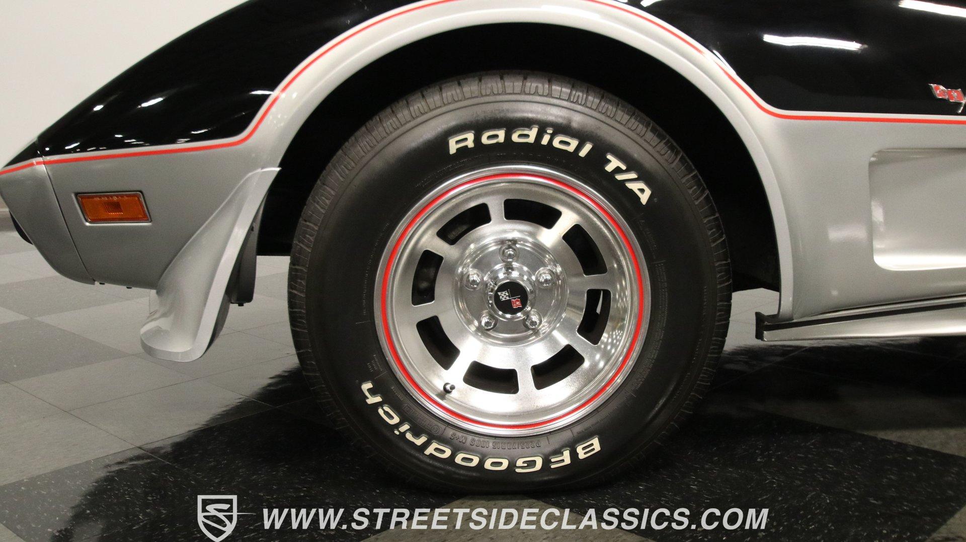With its two-tone appearance, loaded interior, and a numbers-matching V8, you're going to have to act quickly if you want this 1978 Chevrolet Corvette in your garage. This C3 has led an interesting life thus far. The buildsheet tells us it was born a desirable full black package inside and out. And the only way to be even more desirable is if your 1978 coupe is an Indy 500 pace car replica. So that's exactly how they upgraded the paint theme. It's a comprehensive two-tone where the silver lower section also helps highlight the flared fenders and cowl hood. And when it comes to upgraded cars, the whole idea is to have something fun that you can also drive. So we're glad to see nothing here gets taken too seriously. It's an attractive driver-quality finish, which makes it a nice driver-ready coupe. And you have especially attractive details, like the full-width rear spoiler, a chin spoiler, Indy 500 decals, and special redline alloys that go with the pinstriping. Plus, 1978 was also the Corvette's 25th anniversary, and the special bright badging doesn't let anyone forget it. While the exterior was upgraded later in life, the interior remains quite original. That's a good thing when you have a car that was originally optioned with a black leather interior. This upholstery as well as the door panels, carpeting, and dash all look good for their age, and that makes for a nice cruiser. And you'll appreciate the little things, like the working dome light, privacy screen for the cargo area, and the AM/FM stereo with 8-track. It also likes to be comfortable with features like power windows, a rear defogger, cruise control, and provisions for R134a air conditioning (it will need servicing to blow cold again.) You'll love the driver's seat feeling with the high back bucket seats, a grippy steering wheel on a tilt column, and C3's desirable full gauge package. It makes for the ideal package to just take out the T-tops whenever you feel like it and go for a drive. The engine is the numbers-matching L48 350 cubic-inch V8. Everything from the bold blue motor to the black air cleaner has a clean and stock style. The four-barrel carburetor allows the V8 to inhale deeply, and the dual exhaust allows it to exhale with a nice rumble. Plus, you have a three-speed automatic transmission, power steering, fully independent suspension, and four-wheel power disc brakes. So you can now see how this unique classic is the one you'll love to take out any time. The sale comes complete with the factory buildsheet, owner's manual, and maintenance records. This is the classic Corvette with a distinct style and the right comfort. It makes for the kind of great total package you've been looking for. Call today!!!