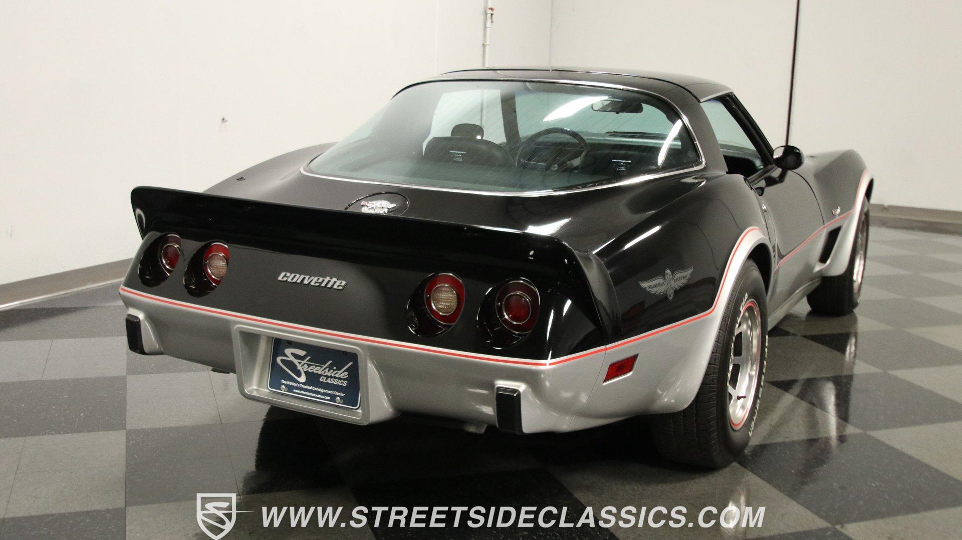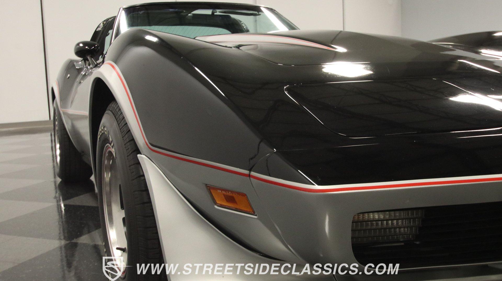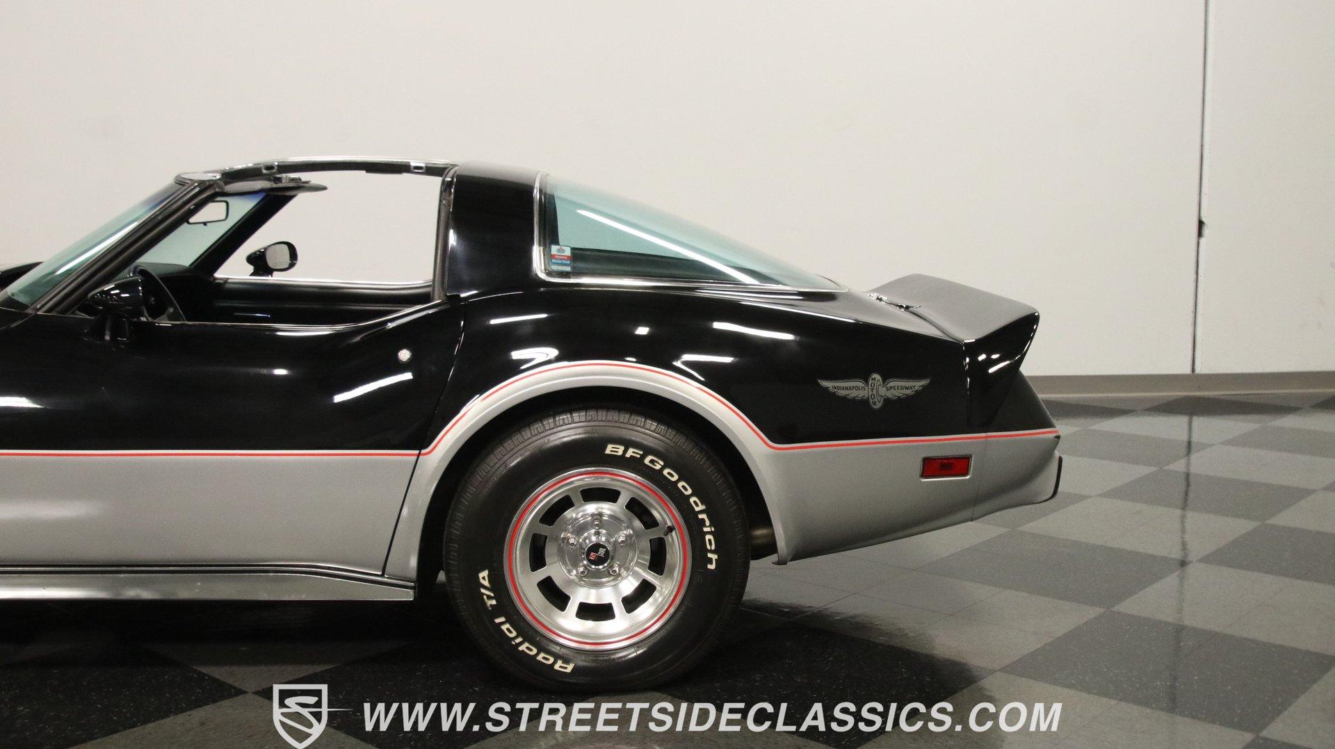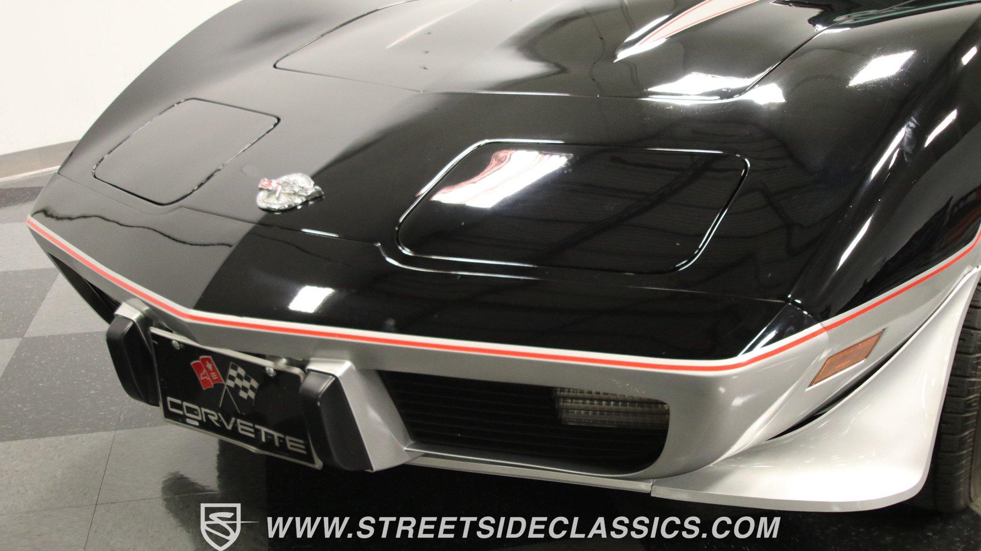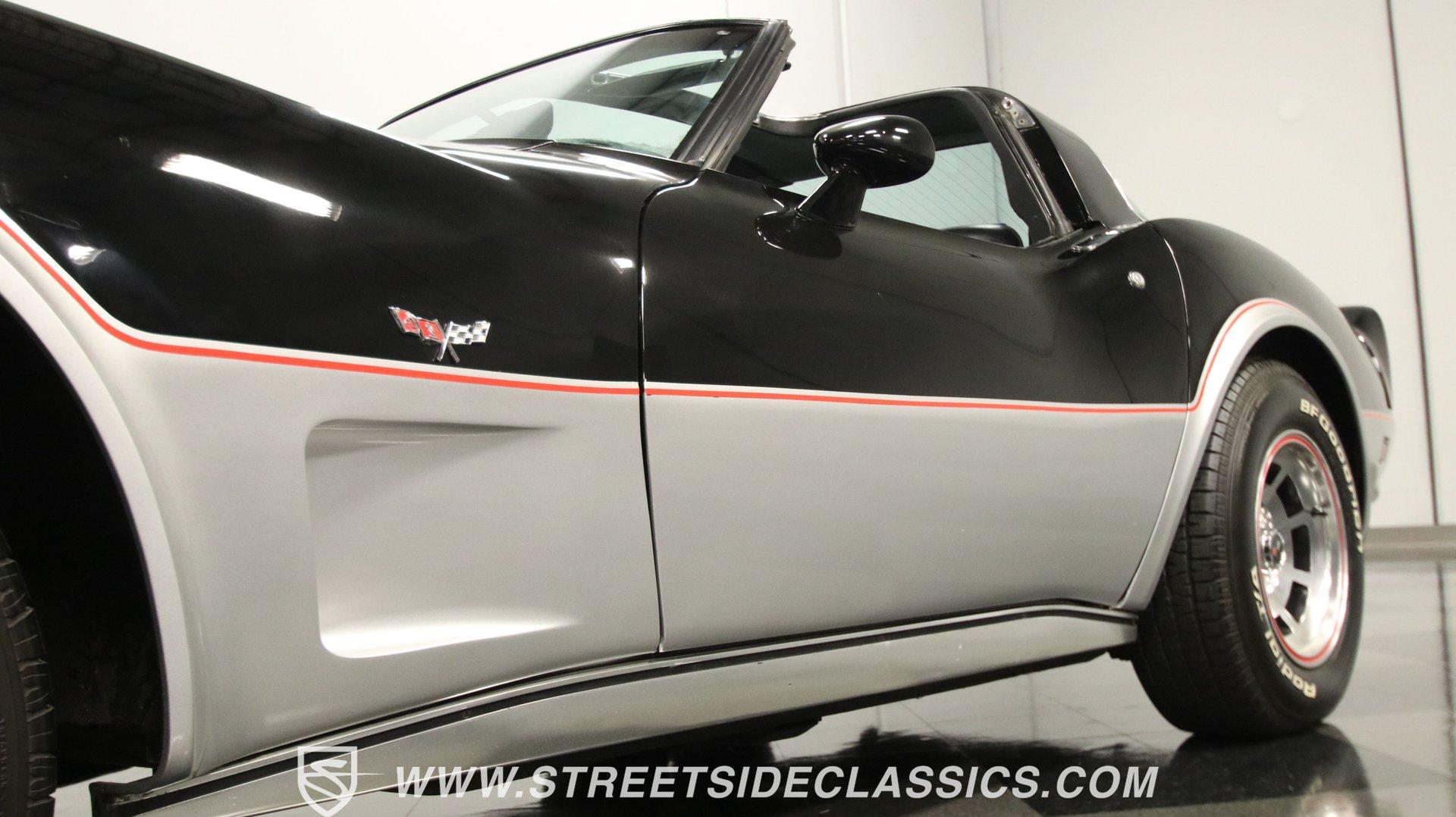 With its two-tone appearance, loaded interior, and a numbers-matching V8, you're going to have to act quickly if you want this 1978 Chevrolet Corvette in your garage. This C3 has led an interesting life thus far. The buildsheet tells us it was born a desirable full black package inside and out. And the only way to be even more desirable is if your 1978 coupe is an Indy 500 pace car replica. So that's exactly how they upgraded the paint theme. It's a comprehensive two-tone where the silver lower section also helps highlight the flared fenders and cowl hood. And when it comes to upgraded cars, the whole idea is to have something fun that you can also drive. So we're glad to see nothing here gets taken too seriously. It's an attractive driver-quality finish, which makes it a nice driver-ready coupe. And you have especially attractive details, like the full-width rear spoiler, a chin spoiler, Indy 500 decals, and special redline alloys that go with the pinstriping. Plus, 1978 was also the Corvette's 25th anniversary, and the special bright badging doesn't let anyone forget it. While the exterior was upgraded later in life, the interior remains quite original. That's a good thing when you have a car that was originally optioned with a black leather interior. This upholstery as well as the door panels, carpeting, and dash all look good for their age, and that makes for a nice cruiser. And you'll appreciate the little things, like the working dome light, privacy screen for the cargo area, and the AM/FM stereo with 8-track. It also likes to be comfortable with features like power windows, a rear defogger, cruise control, and provisions for R134a air conditioning (it will need servicing to blow cold again.) You'll love the driver's seat feeling with the high back bucket seats, a grippy steering wheel on a tilt column, and C3's desirable full gauge package. It makes for the ideal package to just take out the T-tops whenever you feel like it and go for a drive. The engine is the numbers-matching L48 350 cubic-inch V8. Everything from the bold blue motor to the black air cleaner has a clean and stock style. The four-barrel carburetor allows the V8 to inhale deeply, and the dual exhaust allows it to exhale with a nice rumble. Plus, you have a three-speed automatic transmission, power steering, fully independent suspension, and four-wheel power disc brakes. So you can now see how this unique classic is the one you'll love to take out any time. The sale comes complete with the factory buildsheet, owner's manual, and maintenance records. This is the classic Corvette with a distinct style and the right comfort. It makes for the kind of great total package you've been looking for. Call today!!!