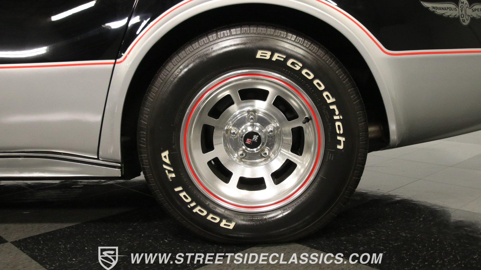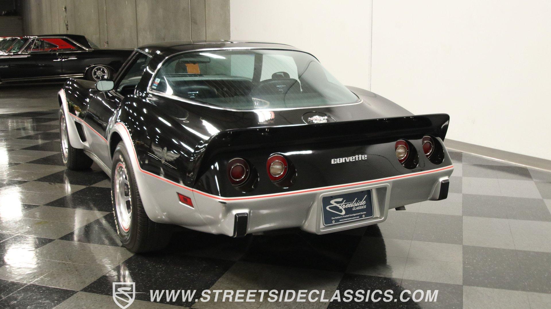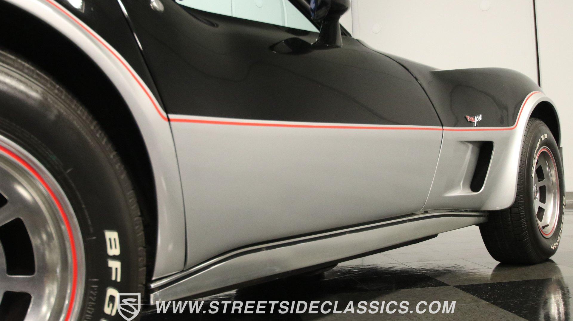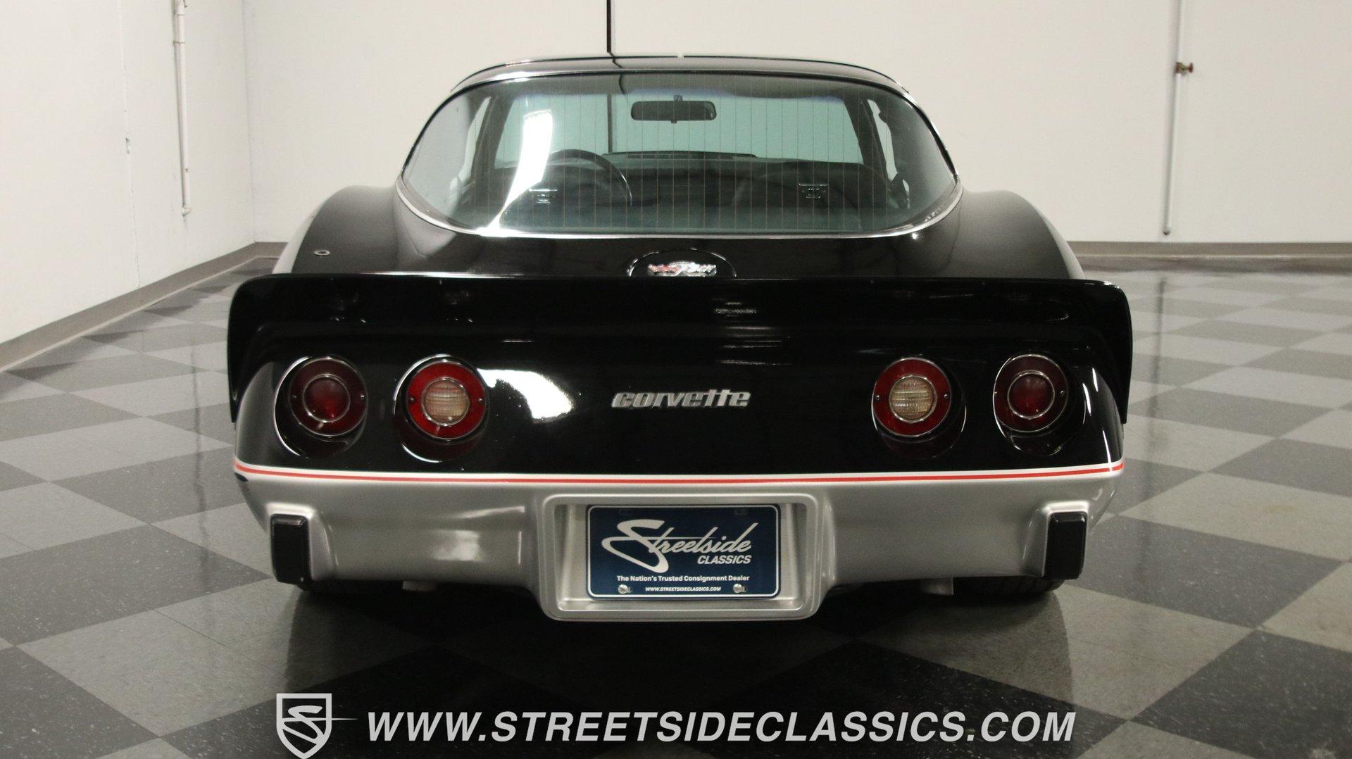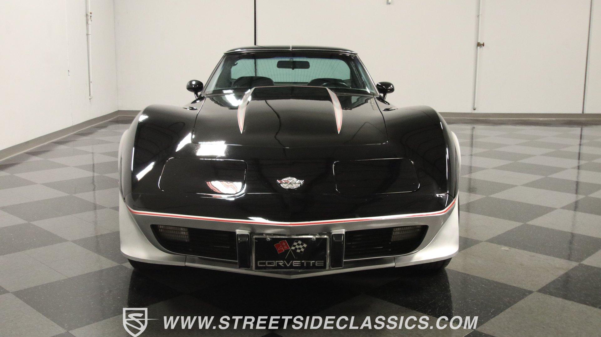 With its two-tone appearance, loaded interior, and a numbers-matching V8, you're going to have to act quickly if you want this 1978 Chevrolet Corvette in your garage. This C3 has led an interesting life thus far. The buildsheet tells us it was born a desirable full black package inside and out. And the only way to be even more desirable is if your 1978 coupe is an Indy 500 pace car replica. So that's exactly how they upgraded the paint theme. It's a comprehensive two-tone where the silver lower section also helps highlight the flared fenders and cowl hood. And when it comes to upgraded cars, the whole idea is to have something fun that you can also drive. So we're glad to see nothing here gets taken too seriously. It's an attractive driver-quality finish, which makes it a nice driver-ready coupe. And you have especially attractive details, like the full-width rear spoiler, a chin spoiler, Indy 500 decals, and special redline alloys that go with the pinstriping. Plus, 1978 was also the Corvette's 25th anniversary, and the special bright badging doesn't let anyone forget it. While the exterior was upgraded later in life, the interior remains quite original. That's a good thing when you have a car that was originally optioned with a black leather interior. This upholstery as well as the door panels, carpeting, and dash all look good for their age, and that makes for a nice cruiser. And you'll appreciate the little things, like the working dome light, privacy screen for the cargo area, and the AM/FM stereo with 8-track. It also likes to be comfortable with features like power windows, a rear defogger, cruise control, and provisions for R134a air conditioning (it will need servicing to blow cold again.) You'll love the driver's seat feeling with the high back bucket seats, a grippy steering wheel on a tilt column, and C3's desirable full gauge package. It makes for the ideal package to just take out the T-tops whenever you feel like it and go for a drive. The engine is the numbers-matching L48 350 cubic-inch V8. Everything from the bold blue motor to the black air cleaner has a clean and stock style. The four-barrel carburetor allows the V8 to inhale deeply, and the dual exhaust allows it to exhale with a nice rumble. Plus, you have a three-speed automatic transmission, power steering, fully independent suspension, and four-wheel power disc brakes. So you can now see how this unique classic is the one you'll love to take out any time. The sale comes complete with the factory buildsheet, owner's manual, and maintenance records. This is the classic Corvette with a distinct style and the right comfort. It makes for the kind of great total package you've been looking for. Call today!!!