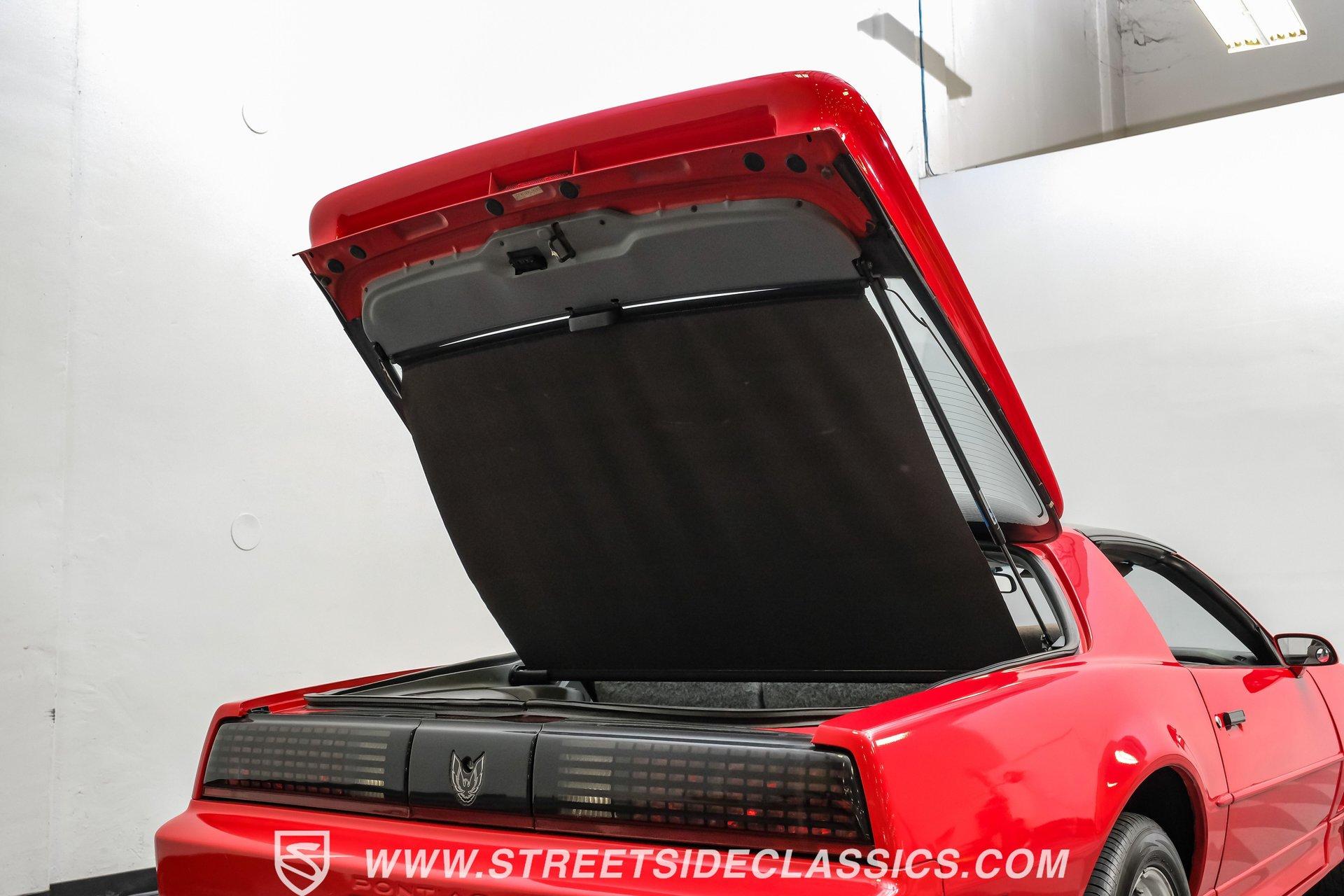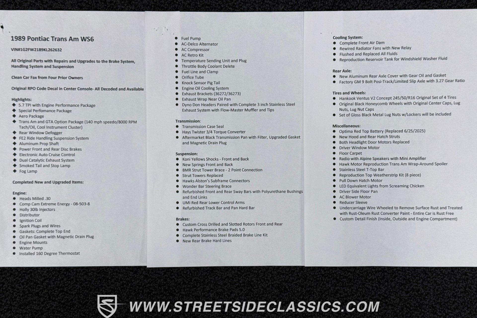 Experience the thrill and nostalgia of owning a true American muscle icon with this 1989 Pontiac Firebird Trans Am WS6. Representing the pinnacle of late-80s performance and style, this Firebird is more than just a car – it's a statement of power, precision, and passion. With its special WS6 performance package, this Trans Am captures the essence of an era when muscle met modern engineering. Whether you're a dedicated collector or a spirited driver, this Firebird offers a unique blend of classic appeal and upgraded performance that commands attention. Dive into the details of this exceptional 1989 Pontiac Firebird Trans Am WS6 and discover why it could be your next prized possession. Step inside to find a well-preserved interior that combines comfort and functionality. The gray cloth bucket seats provide supportive seating, complemented by a clean, straight dash free of cracks and filled with factory gauges that still illuminate. Modern convenience meets classic style with power windows, locks, mirrors, cruise control, and a tilt steering column. The centerpiece is a Jensen touchscreen head unit with Bluetooth, satellite radio, Apple CarPlay, and Android Auto, paired with Alpine speakers for an enhanced audio experience. Despite minor wear for its age, the interior maintains an authentic, driver-focused atmosphere. Under the hood, this Firebird boasts a built 5.7-liter TPI V8 engine featuring tuned port injection, Comp Cams cam, milled heads, and 30lb Holly injectors, delivering robust power and performance. Paired with a 4-speed automatic transmission and a Hays Twister 3/4 torque converter, the drivetrain ensures smooth shifts and responsive acceleration. The factory GM 9-bolt posi/limited-slip rear end with 3.27 gears enhances traction, while upgraded Flowmaster mufflers and Dyno Don headers add an aggressive exhaust note. Suspension upgrades include Koni Yellow shocks, new springs, BMR strut tower brace, and reinforced sway bars, making this Firebird a confident and thrilling drive. Highlights Special Performance WS6 Package 5.7L TPI V8 Engine 4-Speed Automatic Transmission Hays Twister 3/4 Torque Converter Factory GM 9-Bolt Posi Rear End 3.27 Gear Ratio Cross Drilled & Slotted Rotors Hawk Performance Brake Pads Power Disc Brakes Front & Rear Koni Yellow Shocks & New Springs Original Black GTA-Style Wheels Dual Exhaust with Flowmaster Tips T-Tops with Covers Jensen Touchscreen Radio with Bluetooth Power Windows, Locks, Mirrors Cruise Control & Tilt Steering Air Conditioning Service Manuals Included Financing Available Vehicle Protection Plans Available Worldwide Shipping This 1989 Pontiac Firebird Trans Am WS6 offers a compelling combination of classic muscle car style, upgraded performance, and modern amenities, making it a fantastic choice for enthusiasts and collectors alike. Ready to ignite your passion for driving? Call, email, or come visit our showroom today!