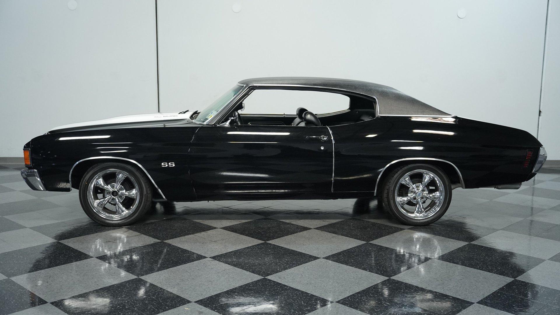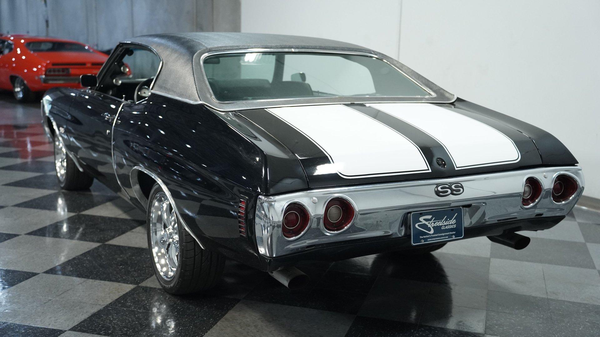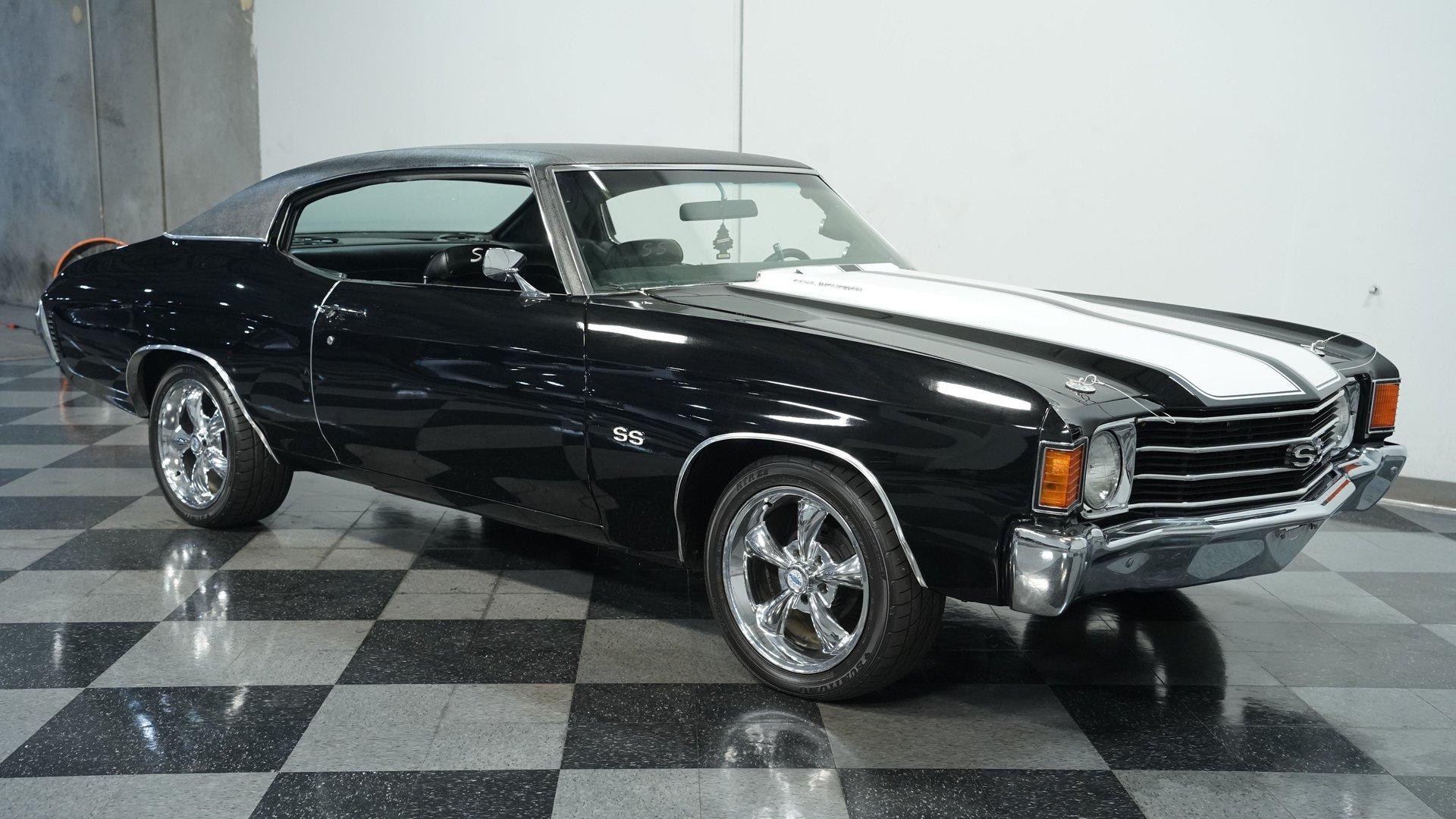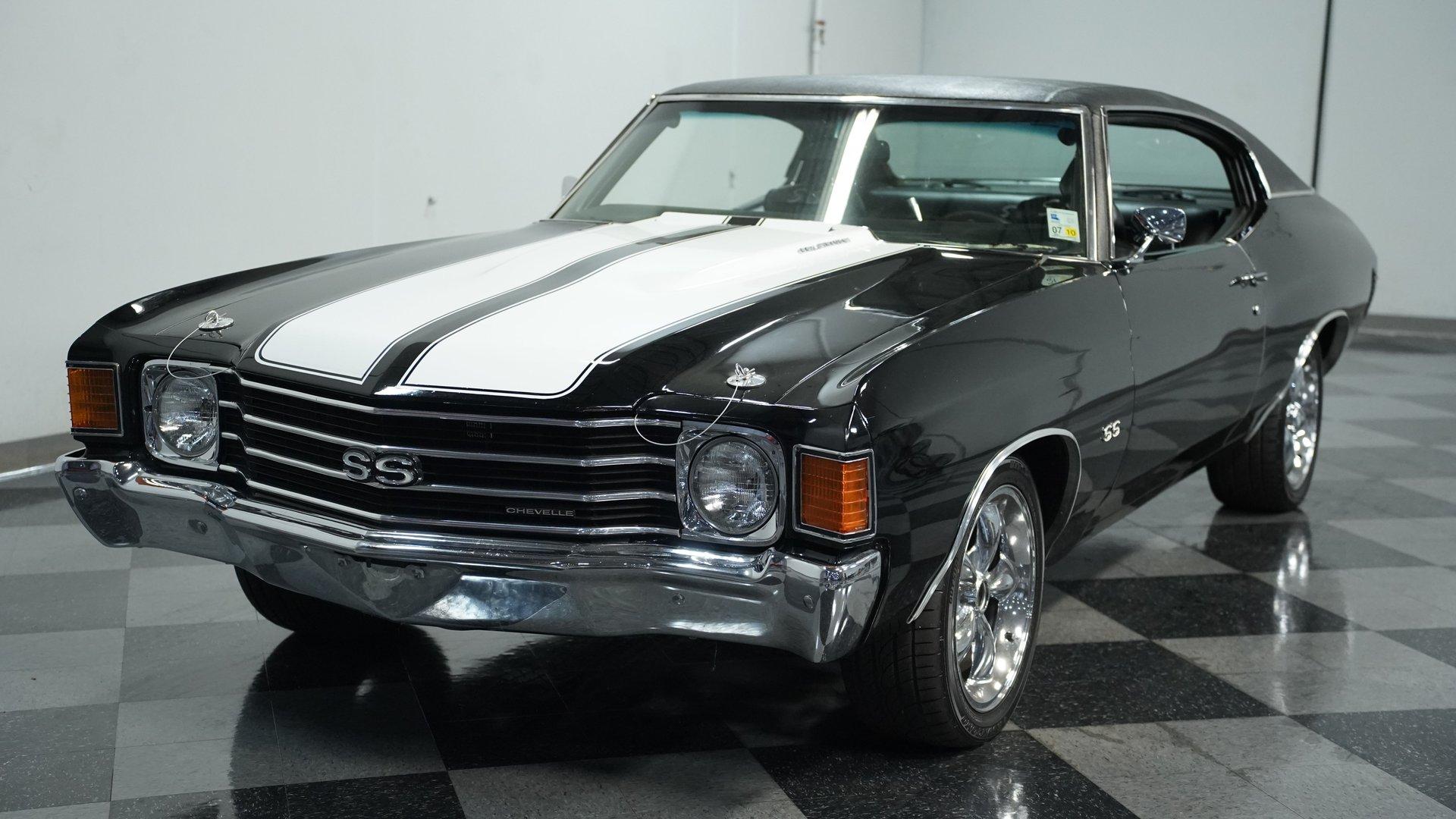 During the Golden Age of muscle cars, there were so many options to choose from that you really couldn't go wrong with almost any of the Big Three's offerings. One of those high-powered choices was a car like this 1972 Chevrolet Chevelle SS Tribute. From the outset, its fully repainted black body, complemented by a set of full-length white-painted SS stripes, along with its pinned cowl-induction hood, showcases the aggressive lines of the Chevelle from any angle. Inside, we find a clean black vinyl and cloth interior. A redone split bench seat offers plenty of room for both the driver and front passenger, while a power-assisted, aftermarket steering wheel sits just ahead of a column-mounted 8,000 rpm Sunpro tachometer. A VRVD630 head unit comes with a built-in three-inch LCD monitor, and offers AM/FM/CD/DVD/AUX capabilities as it pumps out tunes via Sony Xplode 6x9 speakers in the back deck. SS badges on the door panels and embroidered on the headrests make this Chevelle feel as racy on the inside as it looks on the outside. Under the hood, we find a clean engine bay with a 350 cubic-inch V-8 crate engine, on display in all its glory. A single Edelbrock four-barrel carburetor feeds a Bowtie intake manifold mounted on lightweight aluminum heads. Long tube headers expel spent gases through a sweet-sounding FlowMaster dual exhaust. That power is routed through a TH350 three-speed automatic transmission before being sent to a twelve-bolt rear end, which transfers those ponies to the pavement via a set of 17-inch Cragar SS wheels shod in modern 245/45ZR-17 Sumitomo tires. HIGHLIGHTS: Full Black Repaint White Racing Stripes Cowl Hood Hood Pins 350 CID Crate V8 Edelbrock Four Barrel Carb Bowtie Intake Longtube Headers FlowMasters TH350 Three Speed Auto 10 Bolt Rear Cragar SS Wheels Z-Rated Tires Power Brakes Front Disc Brakes Black Vinyl Interior SS Embroidered Headrests Column Mounted Tach AM/FM/CD/DVD/AUX Head Unit Three Inch LCD Screen Sony Xplode Speakers This 1972 Chevrolet Chevelle SS Tribute is equipped with a power brake setup highlighted by a set of discs up front, which are ready to scrub off speed at a moment's notice. If you have been looking for a true icon from the Golden Age of muscle cars, then look no further because this is the car that is as good a choice as it was when it rolled off the assembly line. Don't wait, call today!