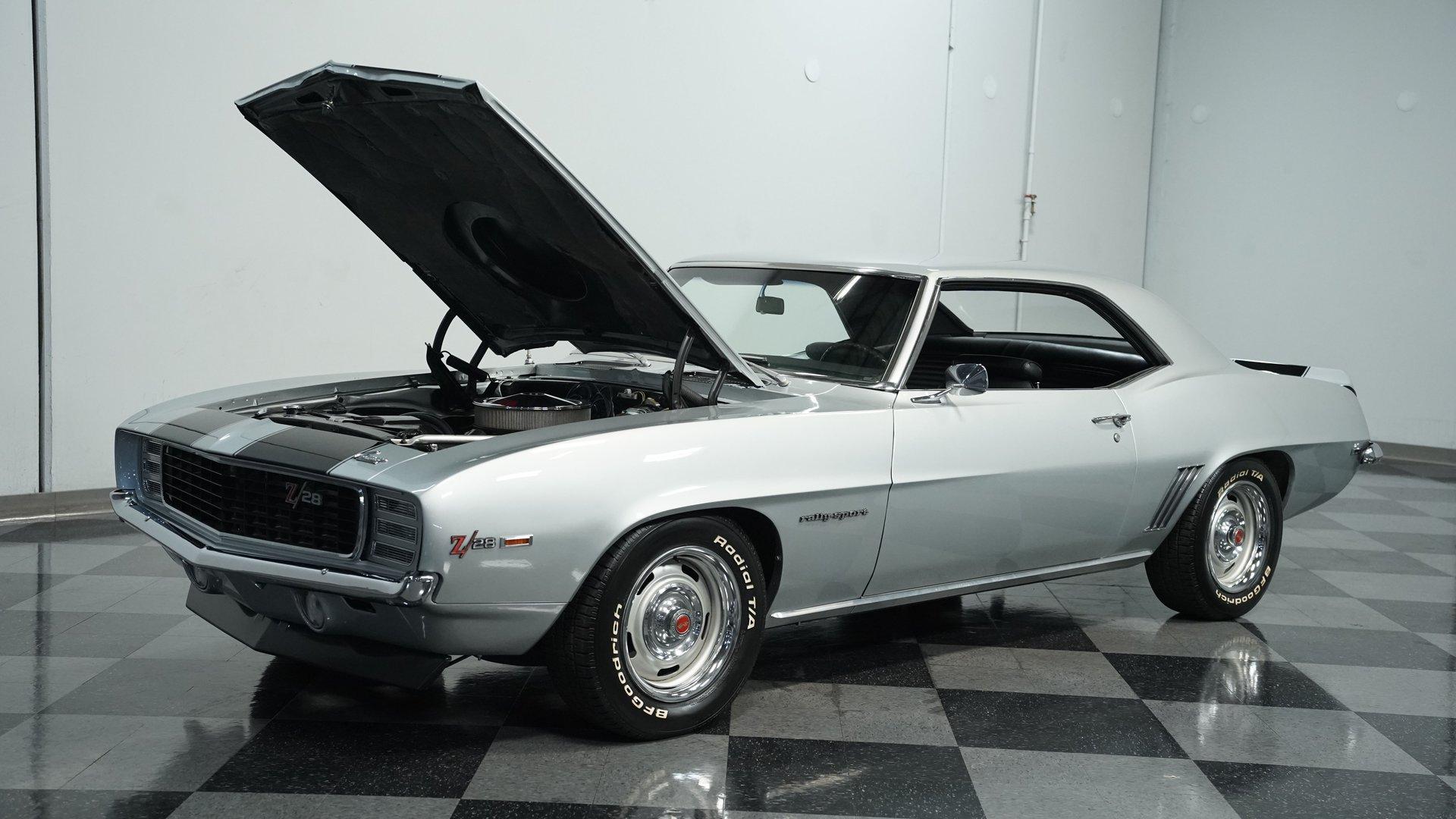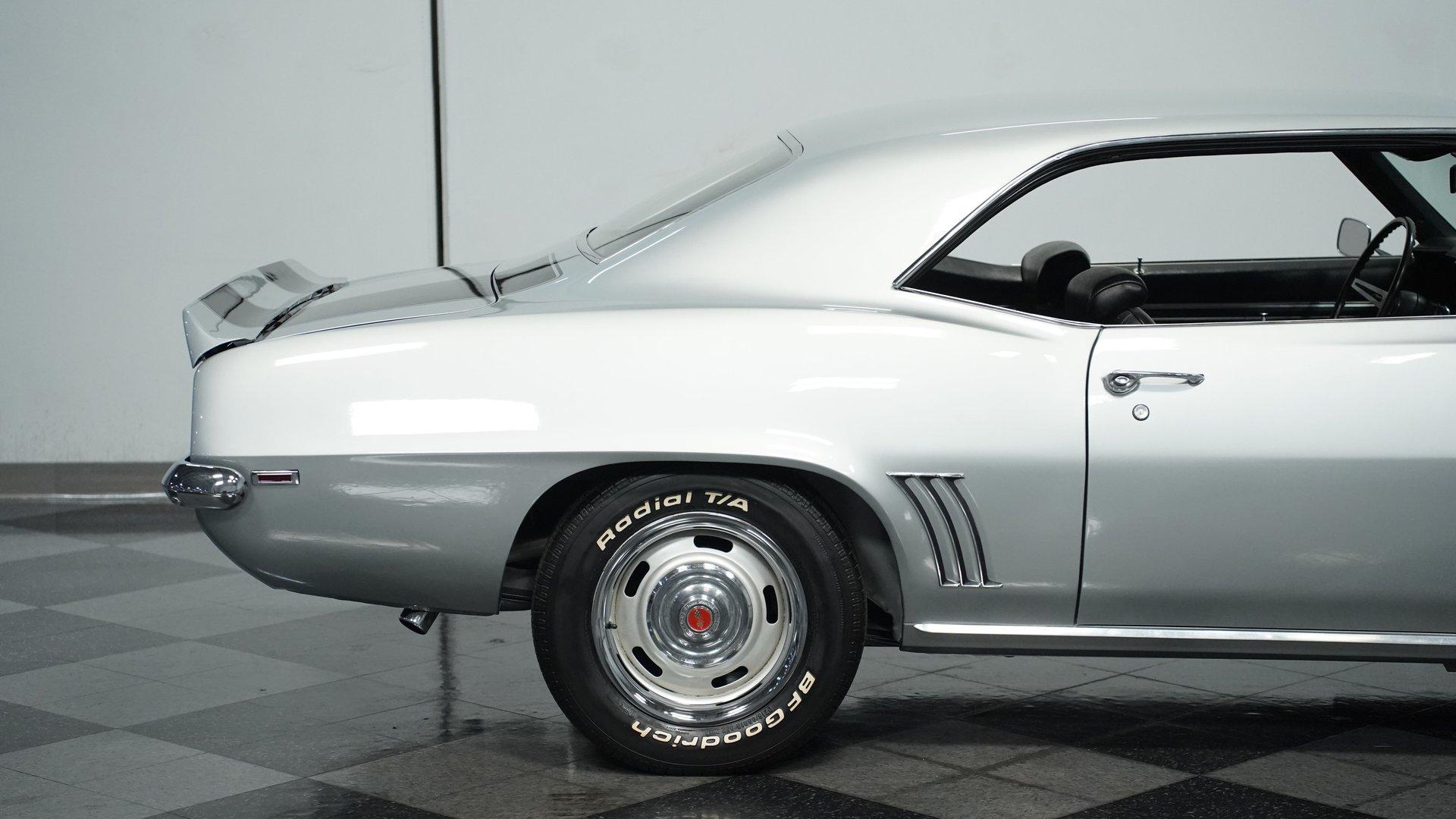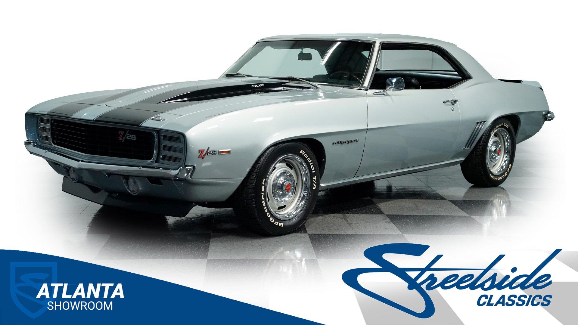 Combining the aesthetic upgrades that came via the Camaro's late '60s RS appearance package with the enhancements offered via the similarly upscale Z28 package, this 1969 Chevrolet Camaro RS Z28 is one highly pedigreed muscle car. Its level of originality is also certainly hard to come by, and the overall clean condition of this classic is seriously impressive. Wearing factory-correct Cortez Silver paint that's highlighted by black painted stripes, it's an outstanding specimen of its model. Its broad, low-slung stance is accentuated by signature RS vacuum-operated hidden headlights, as well as a special edition rear deck spoiler and exterior trim that's in great shape. Displaying a proper blend of RS and Z28 badging, this Chevy has a "special edition" aura that's sure to attract plenty of attention. The factory-correct black vinyl interior retains its authentic factory appearance, with a pair of front bucket seats straddling a wood-accented center console that displays its quartet of stock gauges, all of which are fully functional. In back, the bench seat shows only slight wear, and the black carpeting lining the floor is still snug and well-fitted. Because of the color's UV sensitivity, dash pads in black-upholstered cars are more prone to cracking and warping, but the one lining this Camaro's dash is a notable exception, as it still looks very clean. Appropriately, this rare Camaro is powered by a numbers-matching 302 cubic-inch DZ V8 engine that sits at the center of a well-maintained engine bay. Fed by a Holley 4-barrel carburetor and still in possession of its factory-style intake and exhaust manifolds, it's running in top form, idling smoothly and accelerating promptly as it pairs with a 4-speed Muncie M21 manual transmission that shifts with no issues. The power steering on this classic is nice and responsive, while power brakes that feature discs up front bring its set of 15" Rally wheels wrapped with BF Goodrich T/A radials to dependable, fade-resistant stops when called upon. HIGHLIGHTS A RARE SPECIMEN OF THE MODEL THAT COMBINES THE RS AND Z28 PACKAGES NUMBERS-MATCHING 302 CUBIC-INCH DZ V8 ENGINE 4-SPEED MUNCIE M21 MANUAL TRANSMISSION 4-BARREL HOLLEY CARBURETOR DUAL EXHAUST POWER STEERING POWER BRAKES, WITH DISCS IN FRONT FACTORY-CORRECT CORTEZ SILVER PAINT WITH BLACK PAINTED STRIPES 15" RALLY WHEELS FACTORY-CORRECT BLACK VINYL INTERIOR CENTER CONSOLE POWER STEERING AM/FM RADIO ORIGINAL HUBCAPS INCLUDED The opportunity to pull a clean Camaro into your garage is plenty appealing in itself, but when that muscle car features the rare, top-tier status and strong running condition of this 1969 Chevrolet Camaro RS Z28, that opportunity becomes downright irresistible. Call today!