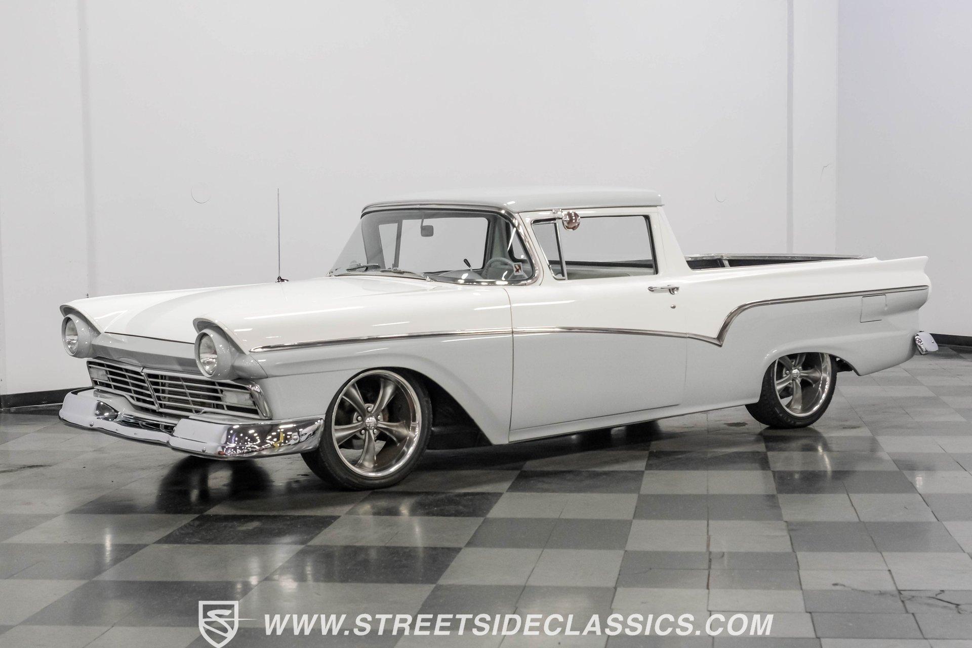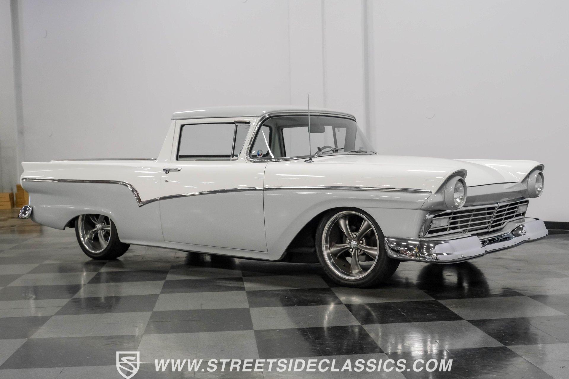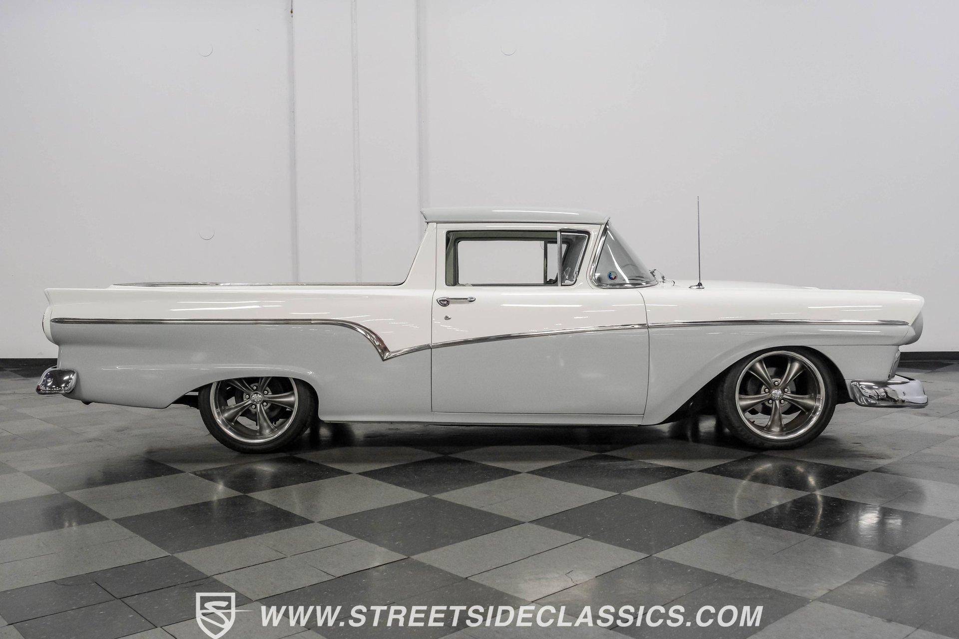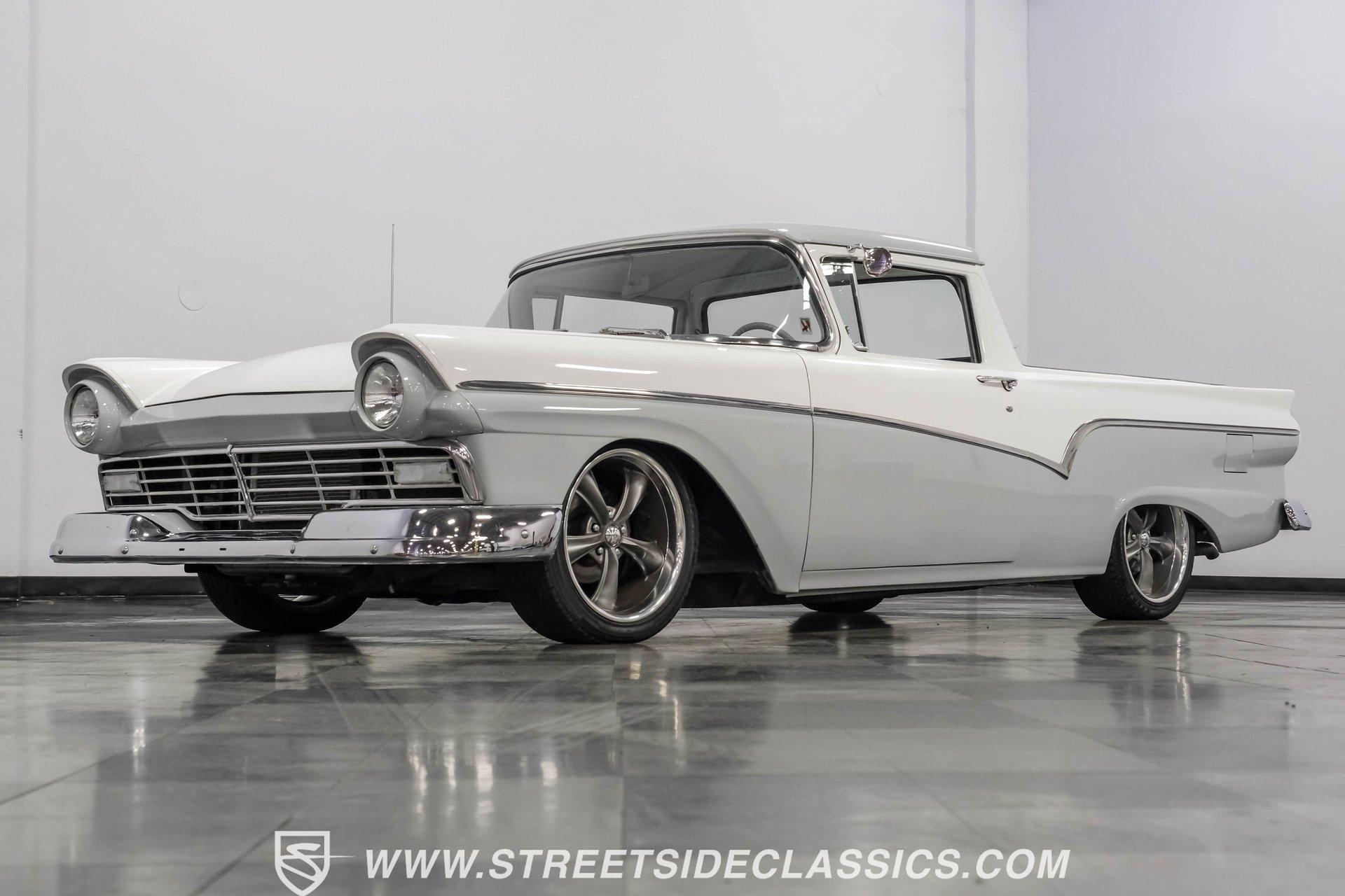 When this 1957 Ford Ranchero first rolled off the assembly line to herald the arrival of a truly revolutionary vehicle pairing the utility of a pickup truck with the easy drivability of a passenger car, no one could have imagined that it would emerge nearly 70 years later looking this good. Dressed in a very effective pairing of white and gray, this is a classic that demands attention. The tasteful paint job is in fine shape and is complemented by a collection of chrome that's in uniformly clean condition. This vintage Ford's aggressive stance strikes a nice balance, resulting in it being low enough to confirm that some aftermarket workmanship was involved, but without going so overboard as to leave it unable to contend with everyday driving conditions. The matching interior makes for an inspiring driving environment, featuring clean painted surfaces paired with vinyl upholstery showing only the slightest of wear. The broad bench seat is especially comfortable and offers an added console offering a pair of cupholders and some welcome interior storage space. You'll find a collection of Dakota Digital gauges in the instrument cluster to help you monitor driving functions, and the aftermarket under dash air conditioning unit is running in top form to keep you and your passengers comfortable, year-round. There's also a retro look AM/FM stereo with an auxiliary port now on board in the dash, and while it's currently disconnected, it's otherwise ready for duty. Beneath the hood, a 5.0-liter high-output V8 engine stands ready to provide plenty of reliable power. Fed by electronic fuel injection, it pairs with a 4-speed automatic transmission that's operating in good form, sending a deep but subtle note out of the pair of Glasspack-style mufflers in back. Electric power steering has been added to the mix to make this classic truck easy to handle, while power brakes that position discs up front give it the stopping ability to deal with modern driving conditions. An upgraded aluminum radiator now sits up front to help keep operating temperatures under control. HIGHLIGHTS: 5.0 Liter High-Output V8 Electronic Fuel Injection AOD 4-Speed Automatic Transmission Power Brakes with Front Discs Power Steering Dual Exhaust w/ Glasspack Style Mufflers Aluminum Radiator 18" BOSS Wheels Aggressive, Lowered Stance White and Gray Interior Blends Vinyl and Tweed Dakota Digital Gauges Air Conditioning Financing Available Vehicle Protection Plans Available Worldwide Shipping A groundbreaking vehicle that redefined the automotive landscape of the '50s and created a category all its own, this 1957 Ford Ranchero cruises on a set of eye-catching 18" Boss wheels wrapped with low-profile Kenda tires, has a timeless appeal and would be a great match for the classic car enthusiast searching for a ride that stands out in a crowd. Call today!