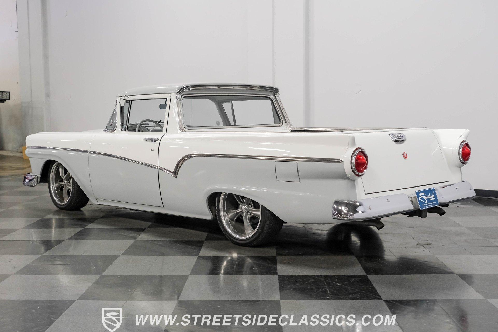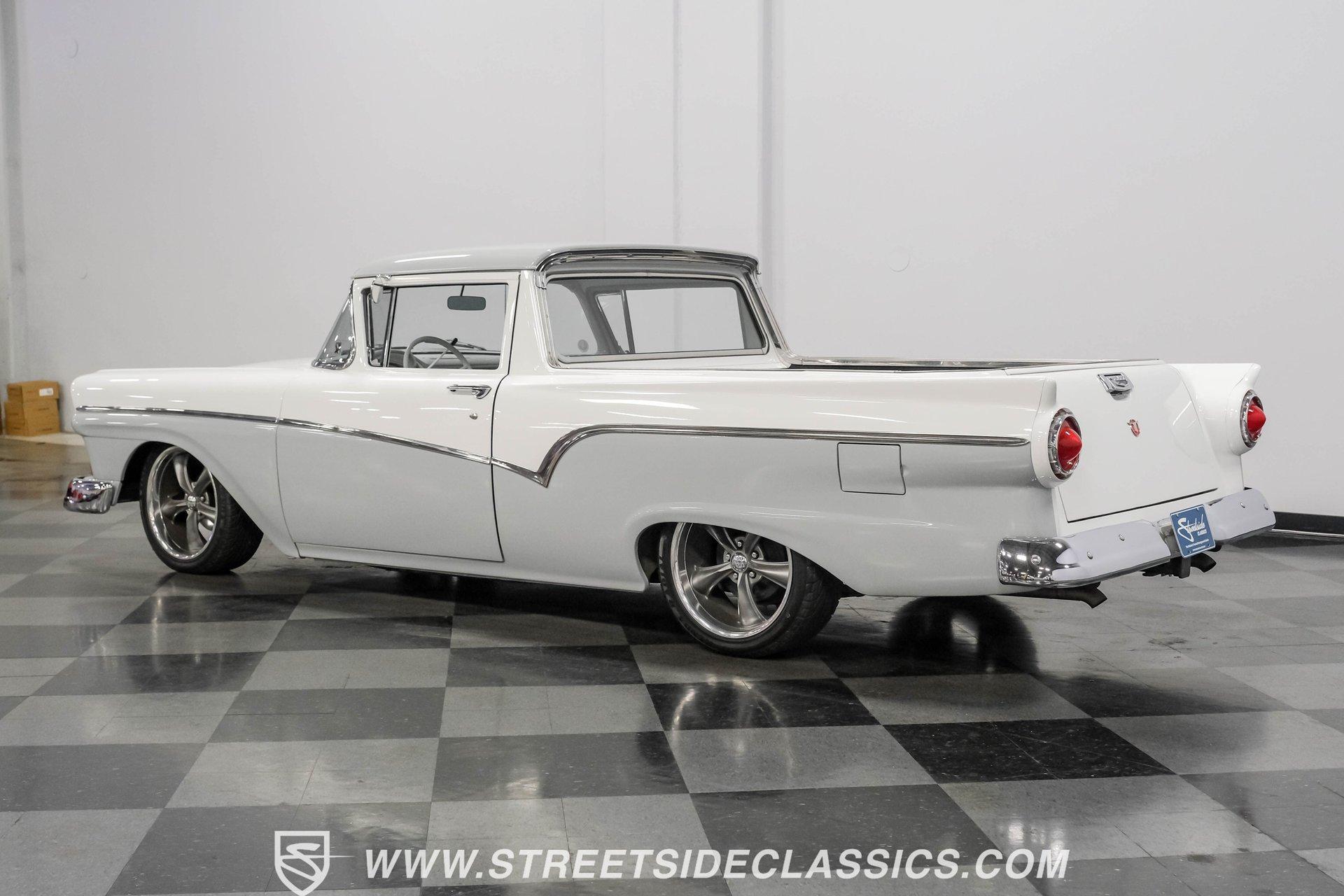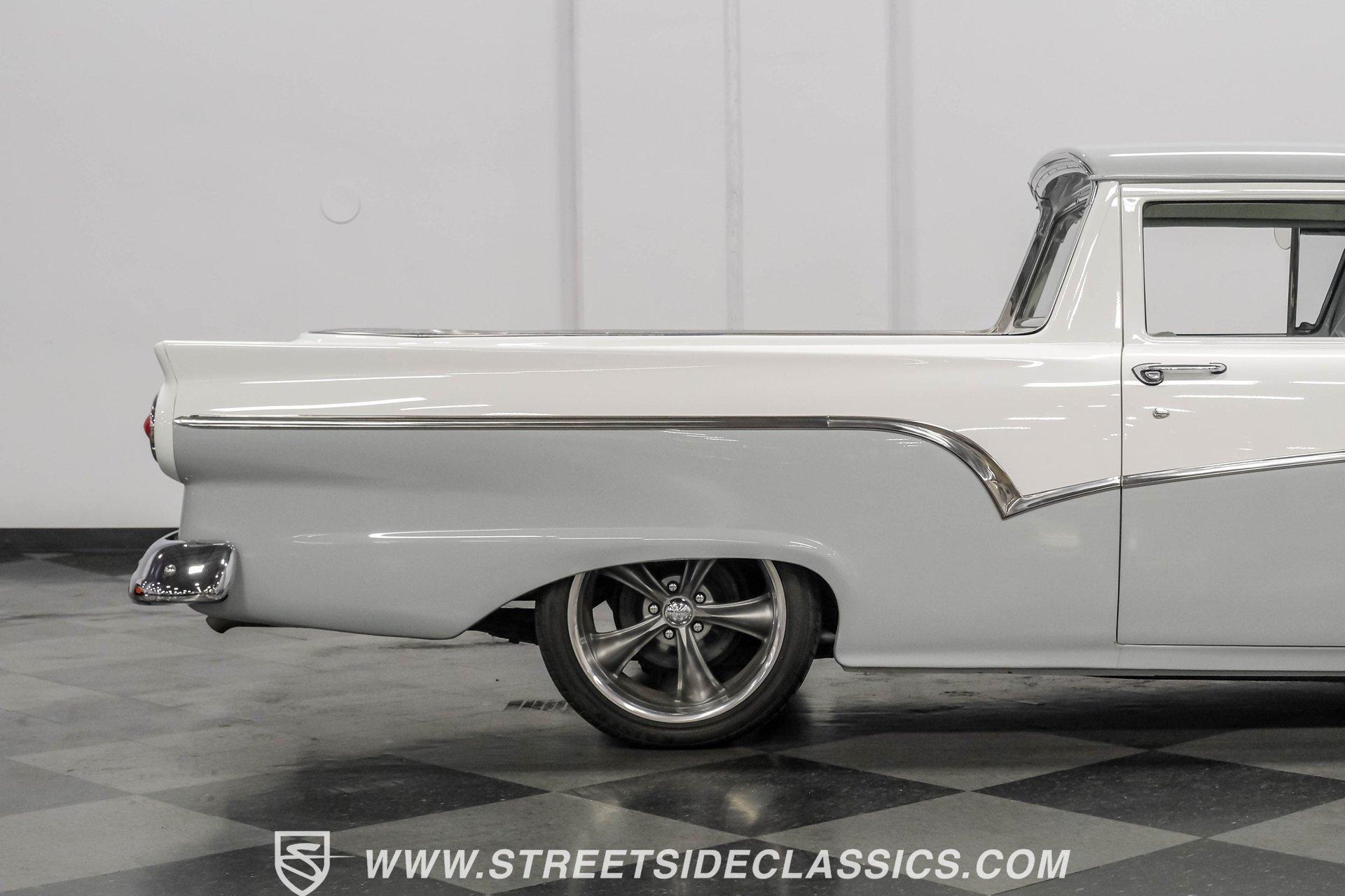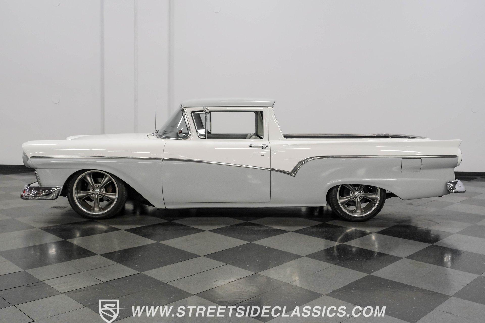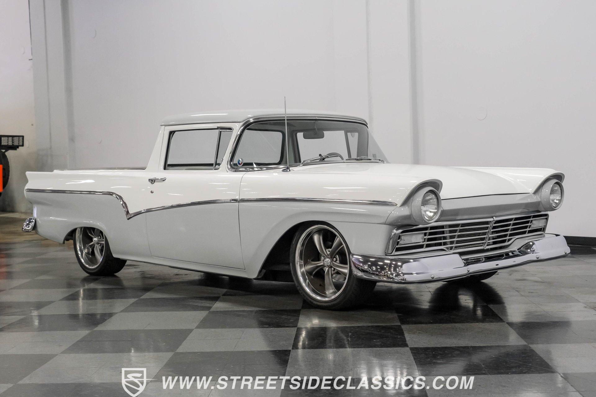 When this 1957 Ford Ranchero first rolled off the assembly line to herald the arrival of a truly revolutionary vehicle pairing the utility of a pickup truck with the easy drivability of a passenger car, no one could have imagined that it would emerge nearly 70 years later looking this good. Dressed in a very effective pairing of white and gray, this is a classic that demands attention. The tasteful paint job is in fine shape and is complemented by a collection of chrome that's in uniformly clean condition. This vintage Ford's aggressive stance strikes a nice balance, resulting in it being low enough to confirm that some aftermarket workmanship was involved, but without going so overboard as to leave it unable to contend with everyday driving conditions. The matching interior makes for an inspiring driving environment, featuring clean painted surfaces paired with vinyl upholstery showing only the slightest of wear. The broad bench seat is especially comfortable and offers an added console offering a pair of cupholders and some welcome interior storage space. You'll find a collection of Dakota Digital gauges in the instrument cluster to help you monitor driving functions, and the aftermarket under dash air conditioning unit is running in top form to keep you and your passengers comfortable, year-round. There's also a retro look AM/FM stereo with an auxiliary port now on board in the dash, and while it's currently disconnected, it's otherwise ready for duty. Beneath the hood, a 5.0-liter high-output V8 engine stands ready to provide plenty of reliable power. Fed by electronic fuel injection, it pairs with a 4-speed automatic transmission that's operating in good form, sending a deep but subtle note out of the pair of Glasspack-style mufflers in back. Electric power steering has been added to the mix to make this classic truck easy to handle, while power brakes that position discs up front give it the stopping ability to deal with modern driving conditions. An upgraded aluminum radiator now sits up front to help keep operating temperatures under control. HIGHLIGHTS: 5.0 Liter High-Output V8 Electronic Fuel Injection AOD 4-Speed Automatic Transmission Power Brakes with Front Discs Power Steering Dual Exhaust w/ Glasspack Style Mufflers Aluminum Radiator 18" BOSS Wheels Aggressive, Lowered Stance White and Gray Interior Blends Vinyl and Tweed Dakota Digital Gauges Air Conditioning Financing Available Vehicle Protection Plans Available Worldwide Shipping A groundbreaking vehicle that redefined the automotive landscape of the '50s and created a category all its own, this 1957 Ford Ranchero cruises on a set of eye-catching 18" Boss wheels wrapped with low-profile Kenda tires, has a timeless appeal and would be a great match for the classic car enthusiast searching for a ride that stands out in a crowd. Call today!