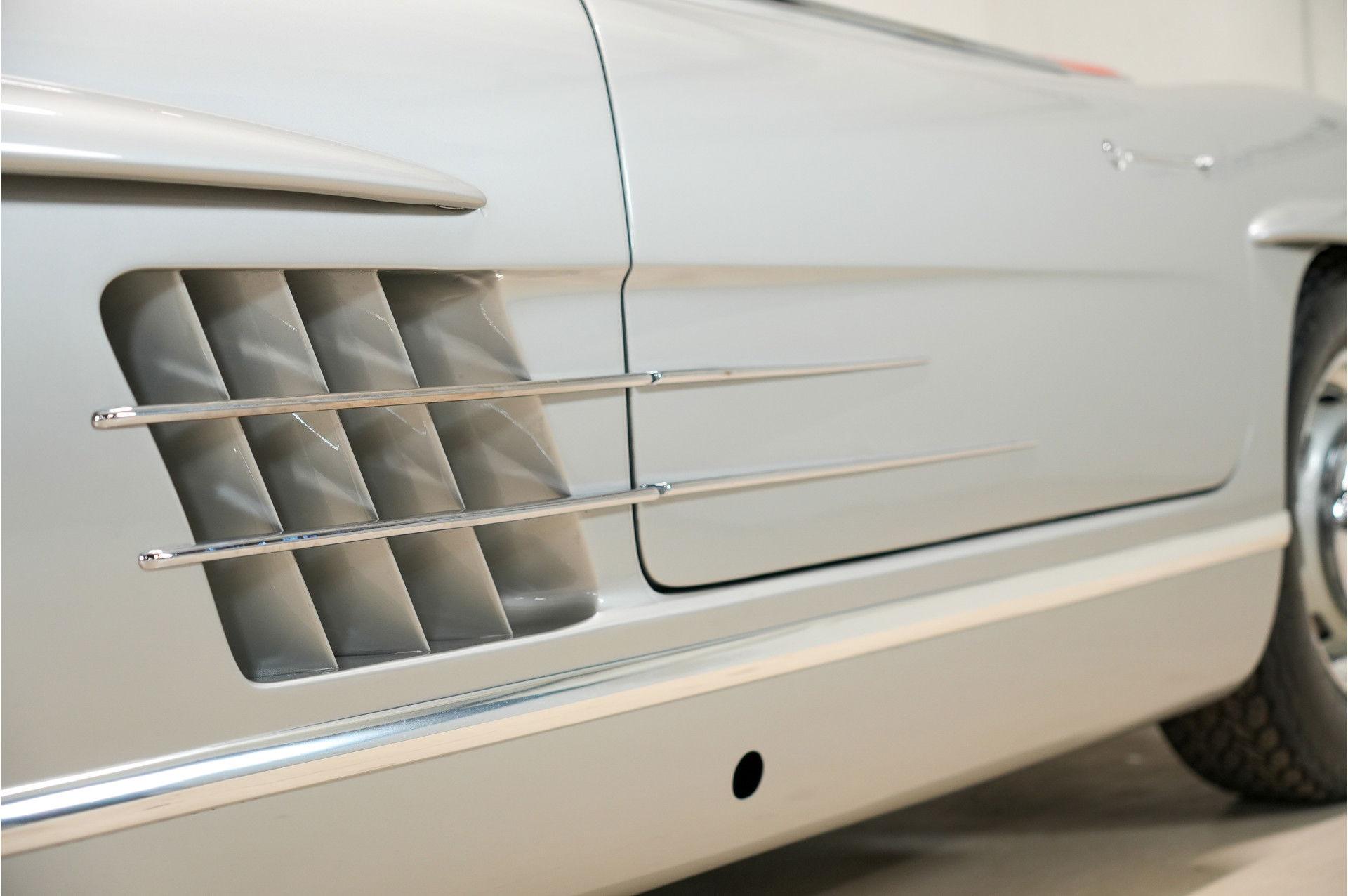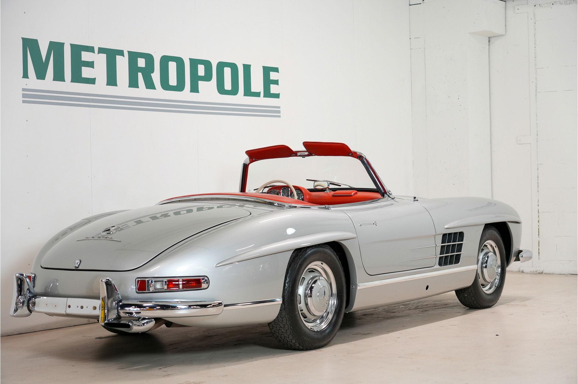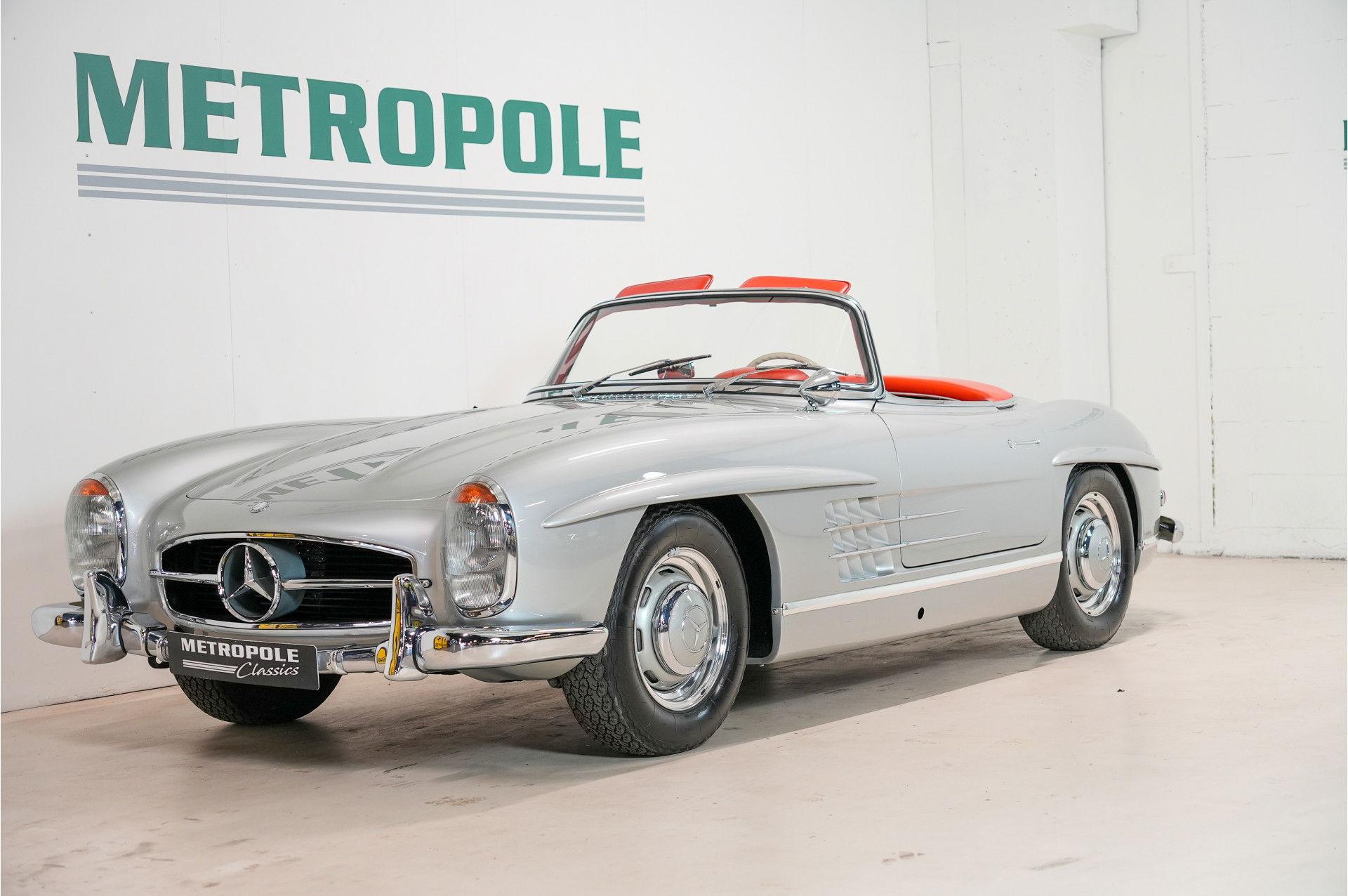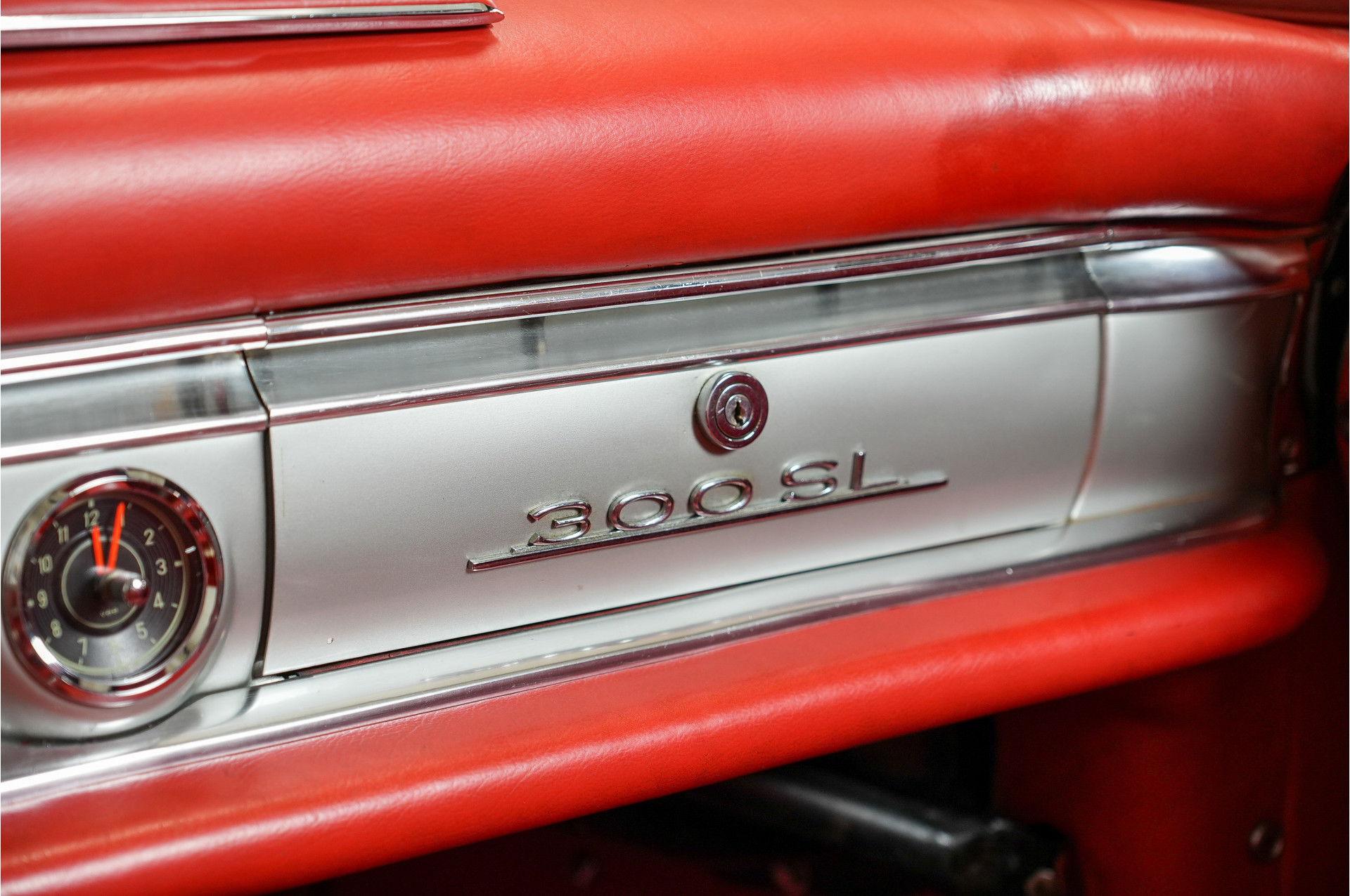 This 1958 Mercedes-Benz 300 SL Roadster is an original, matching numbers example, finished in metallic silver with red leather upholstery.